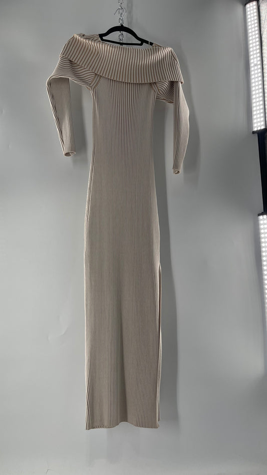 Anthropologie Beige Knit BodyCon Full Length Dress with Thick Off the Shoulder Band (Large)