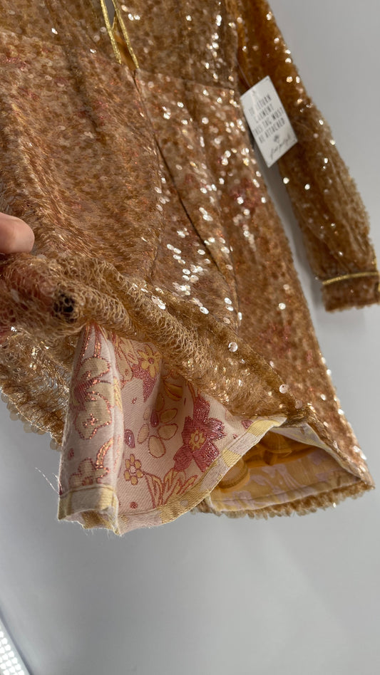 Free People Tapestry Underlay and Gold Sequin Overlay A-Line Mini Dress with Bubble Sleeves (0)