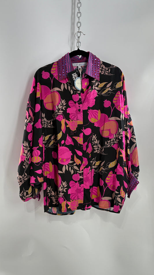 JUST BELLINA Black Oversized Blouse with Exaggerated Sleeves, Embroidered Collar and Tags Attached (XS)