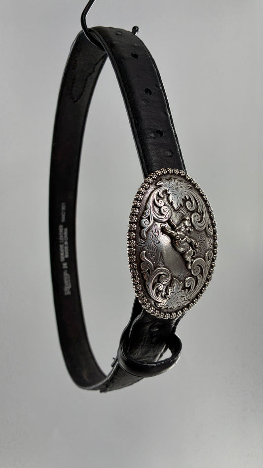 Vintage NOCONA Black Leather Western Style Belt with Oversized Engraved Cowboy Buckle (26)