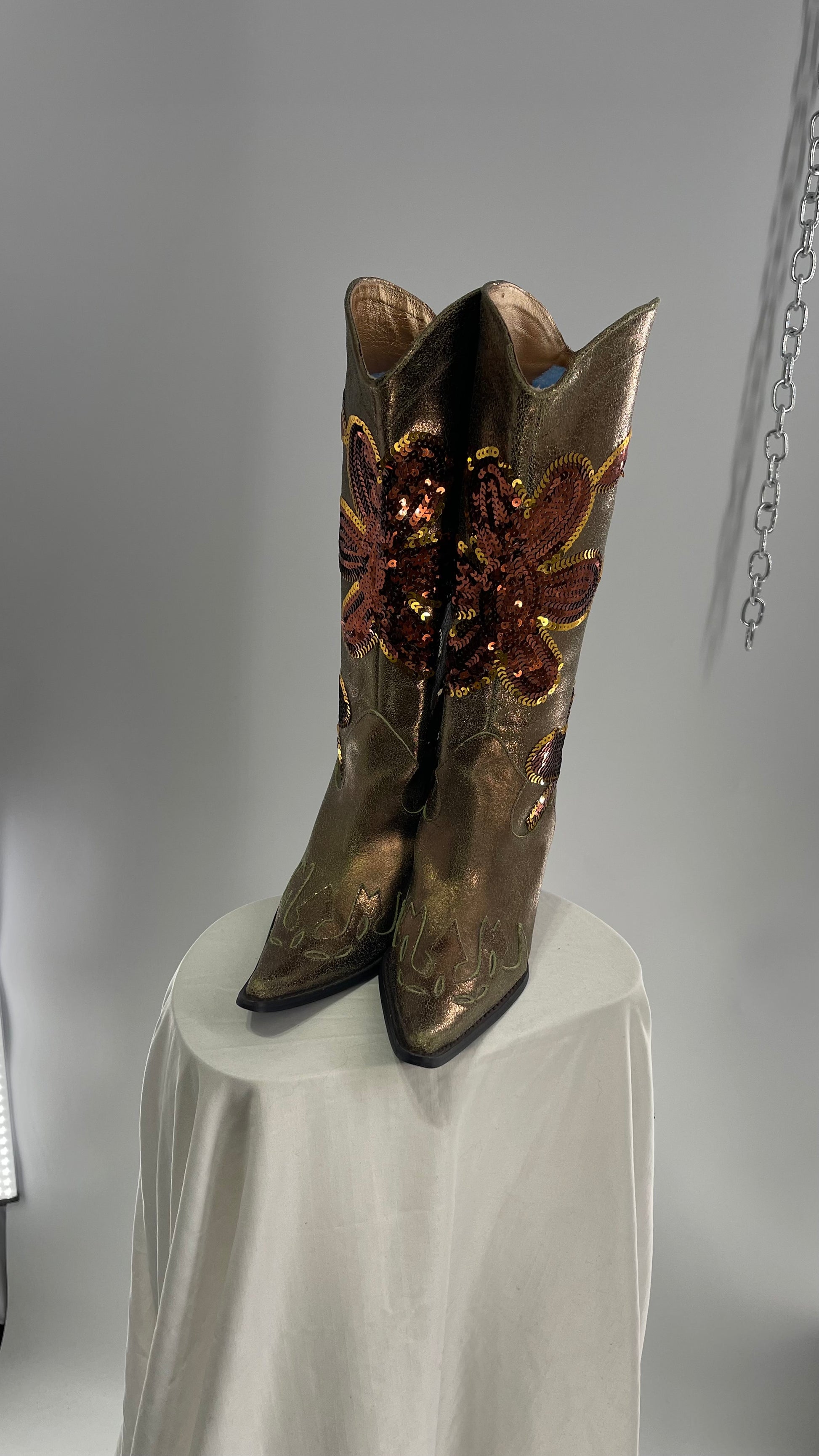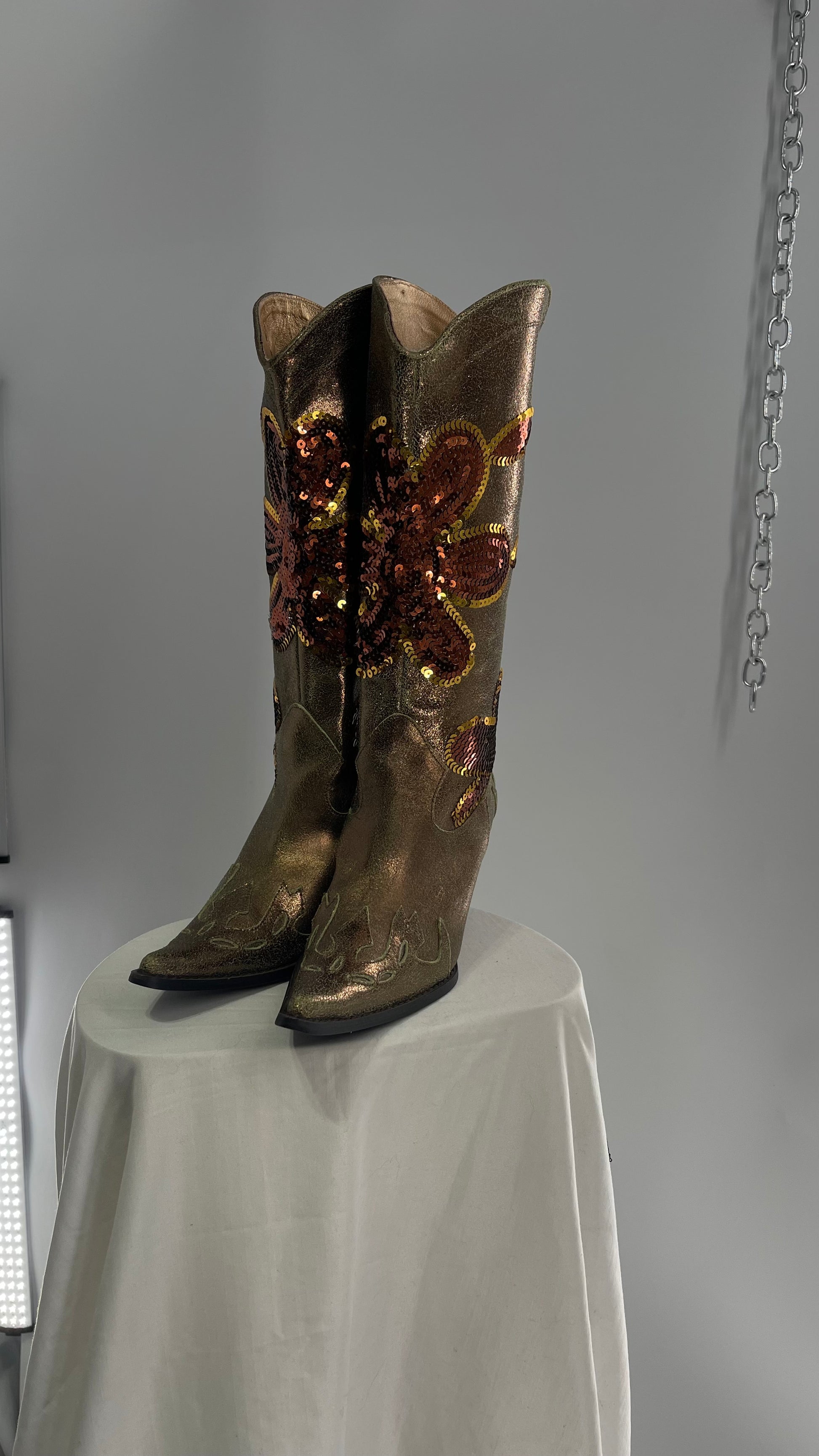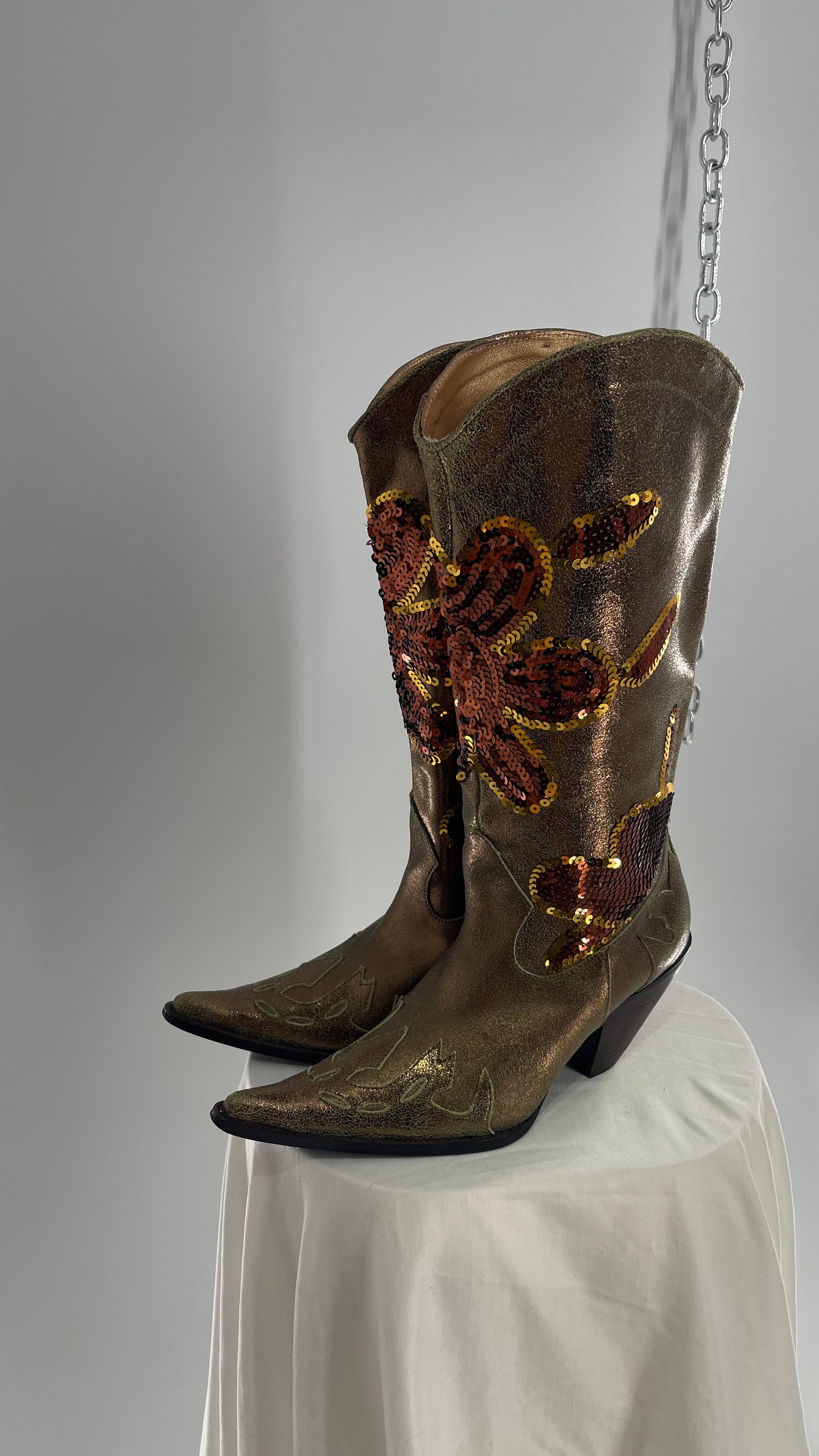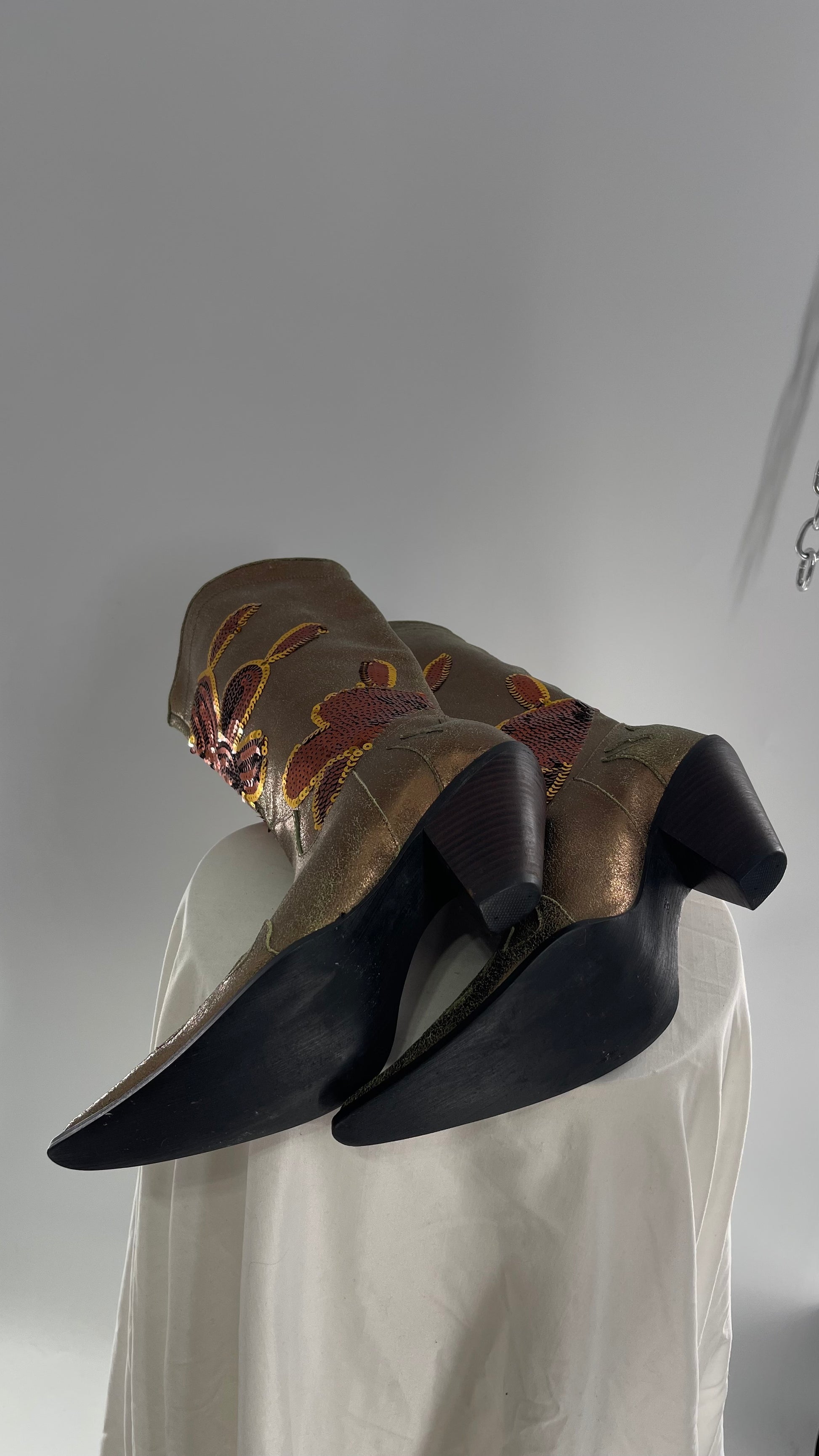 RARE Vintage Foot Candy Sage Green/Bronze Leather Cowboy Boots with Sequin Flowers and Flame Details (6.5)