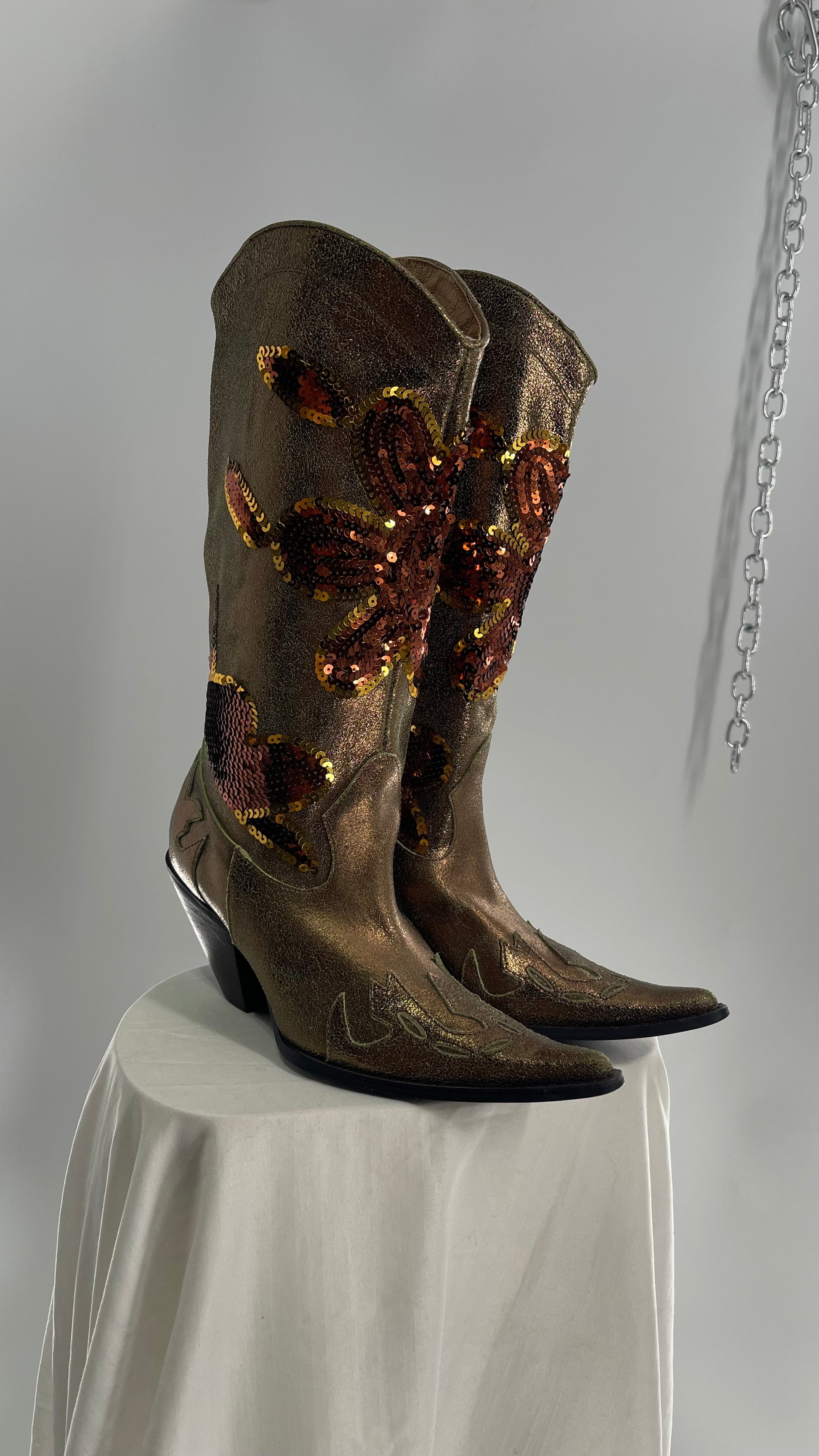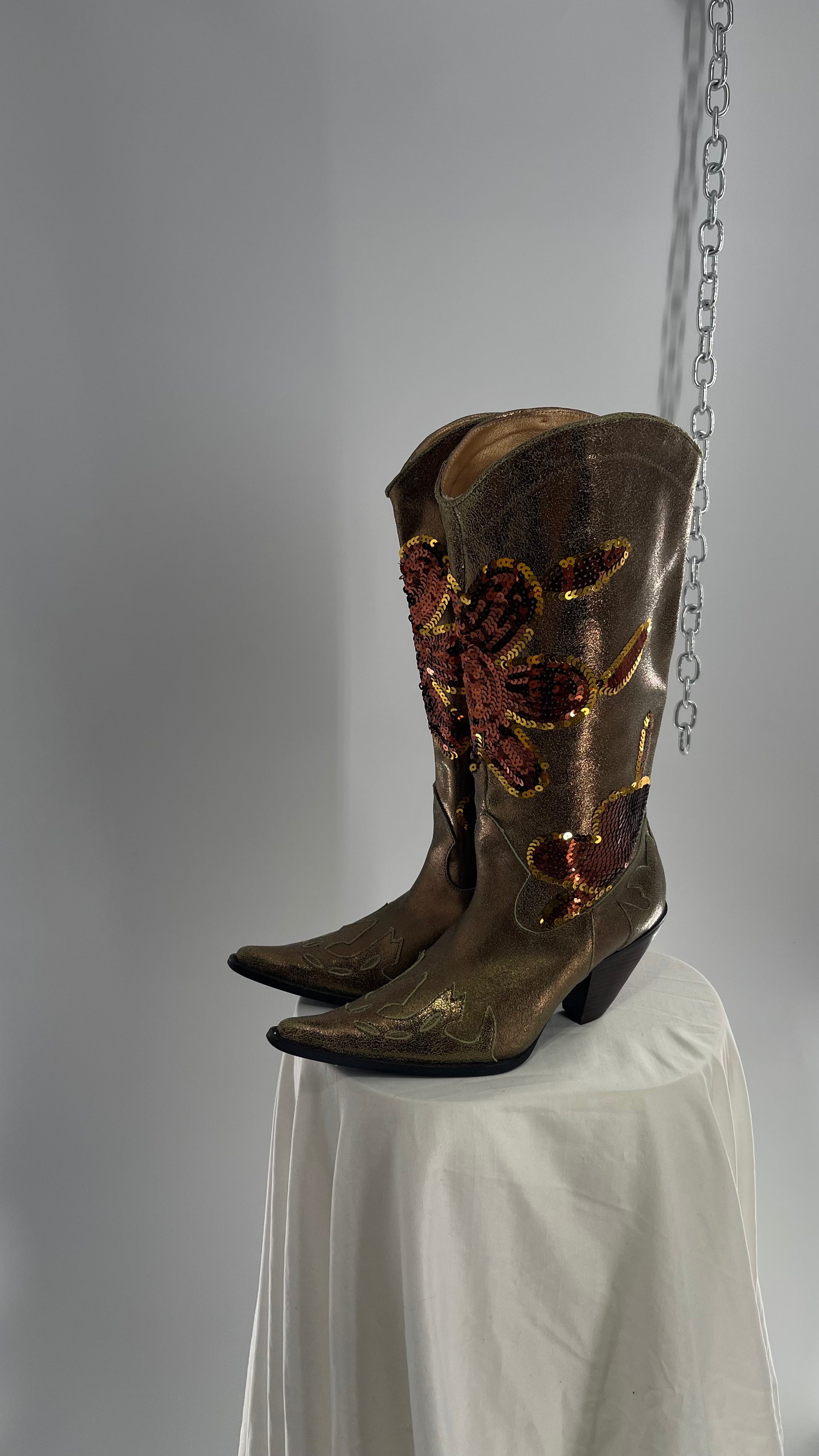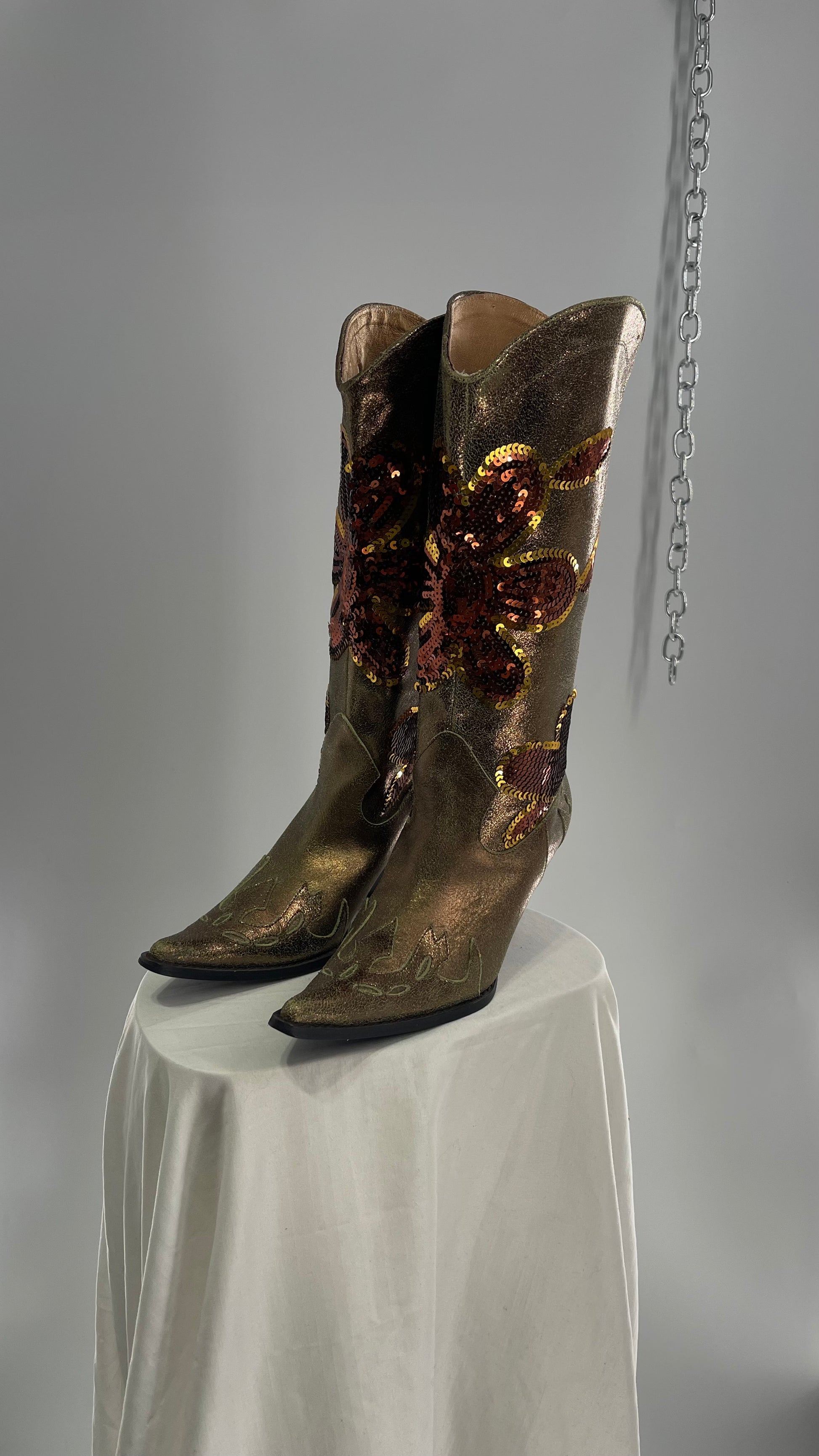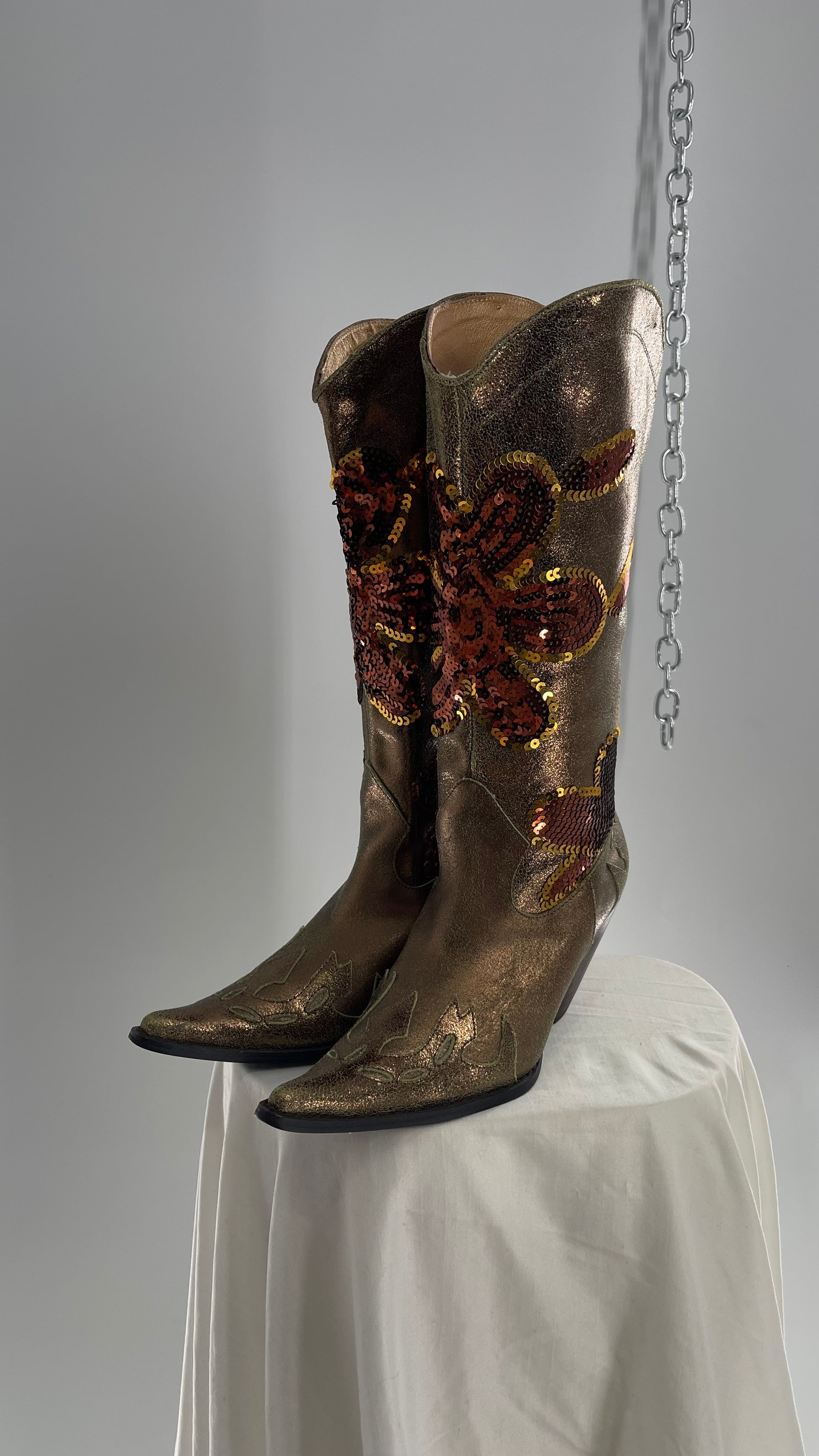 RARE Vintage Foot Candy Sage Green/Bronze Leather Cowboy Boots with Sequin Flowers and Flame Details (6.5)