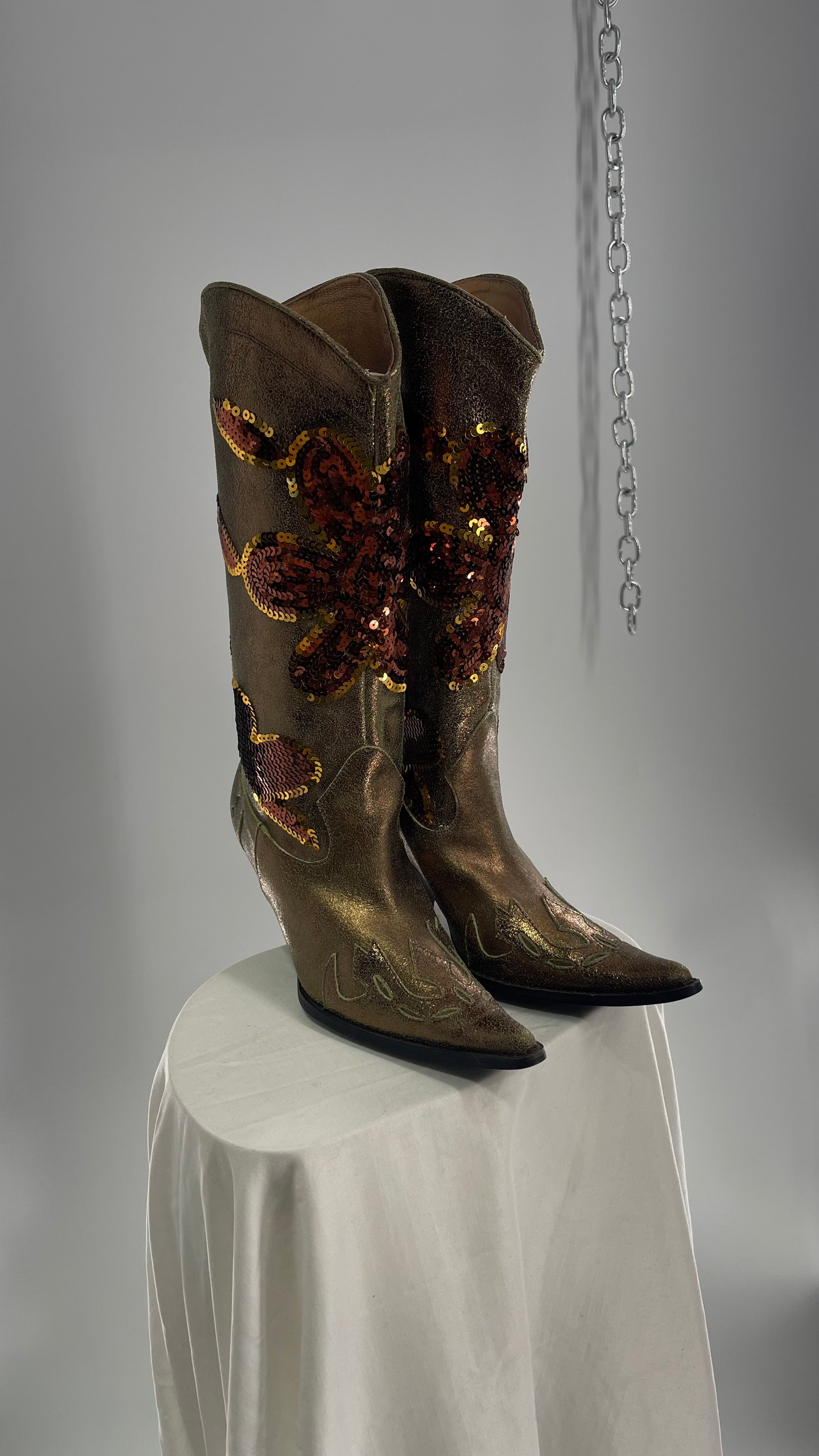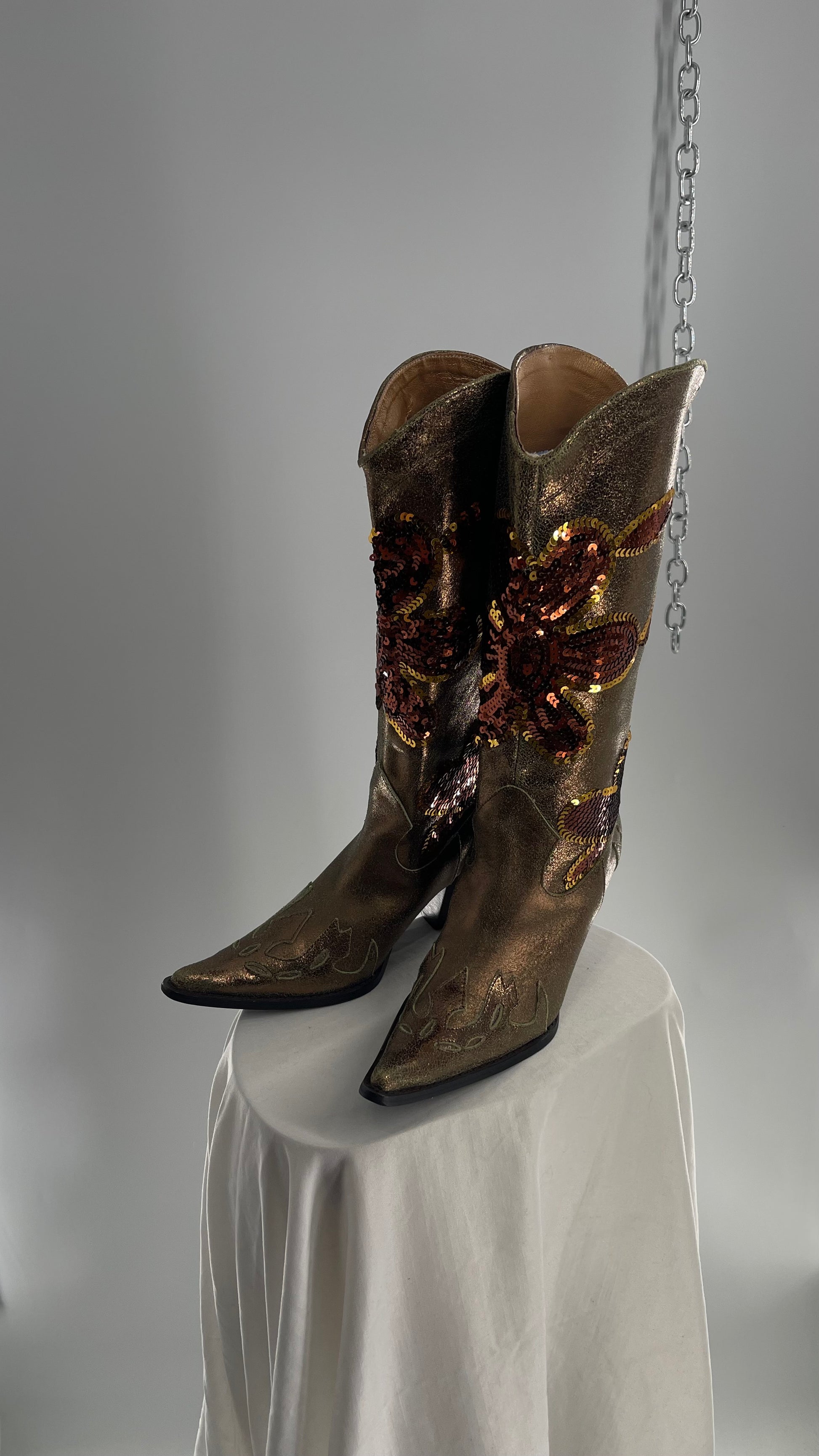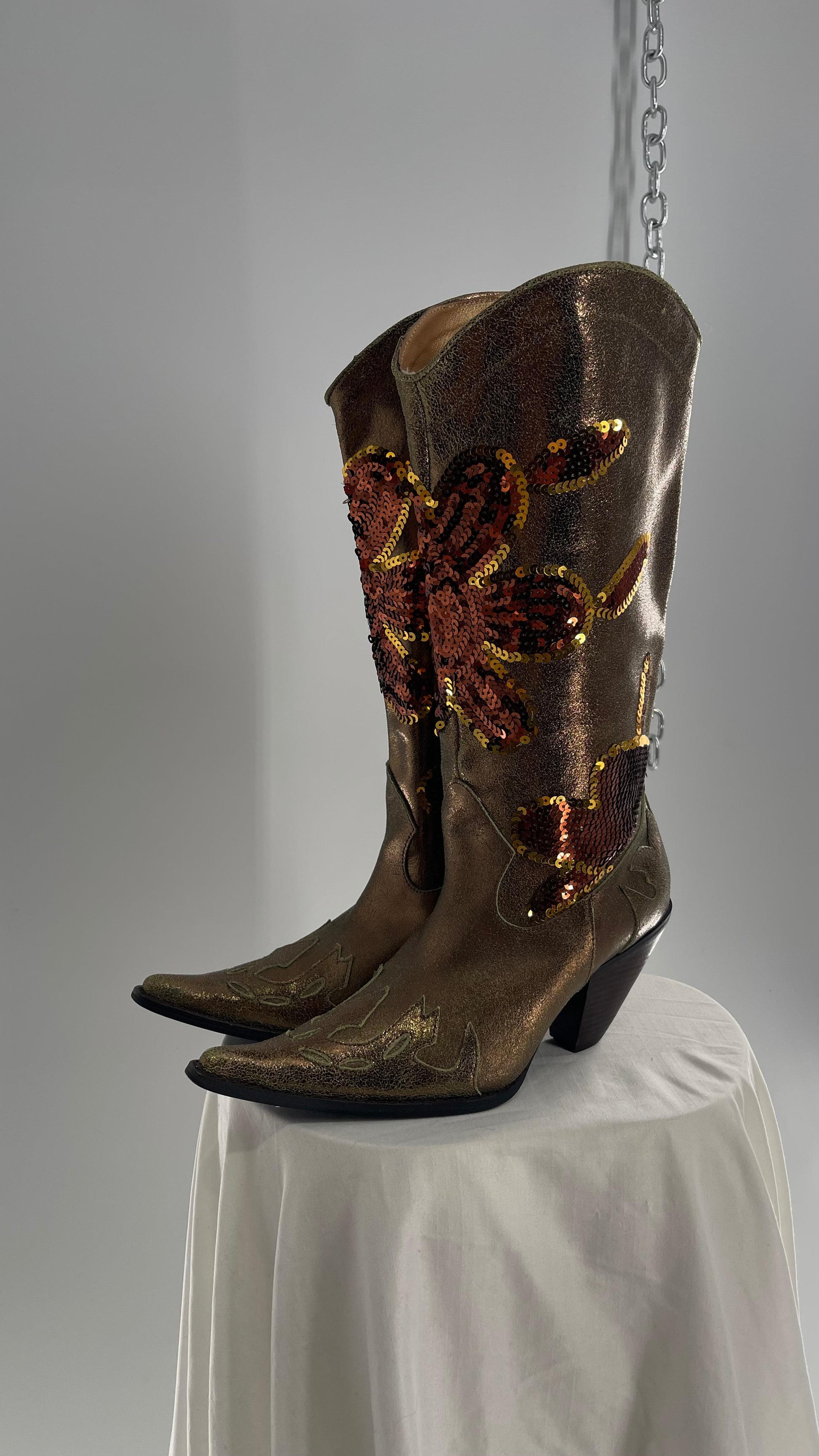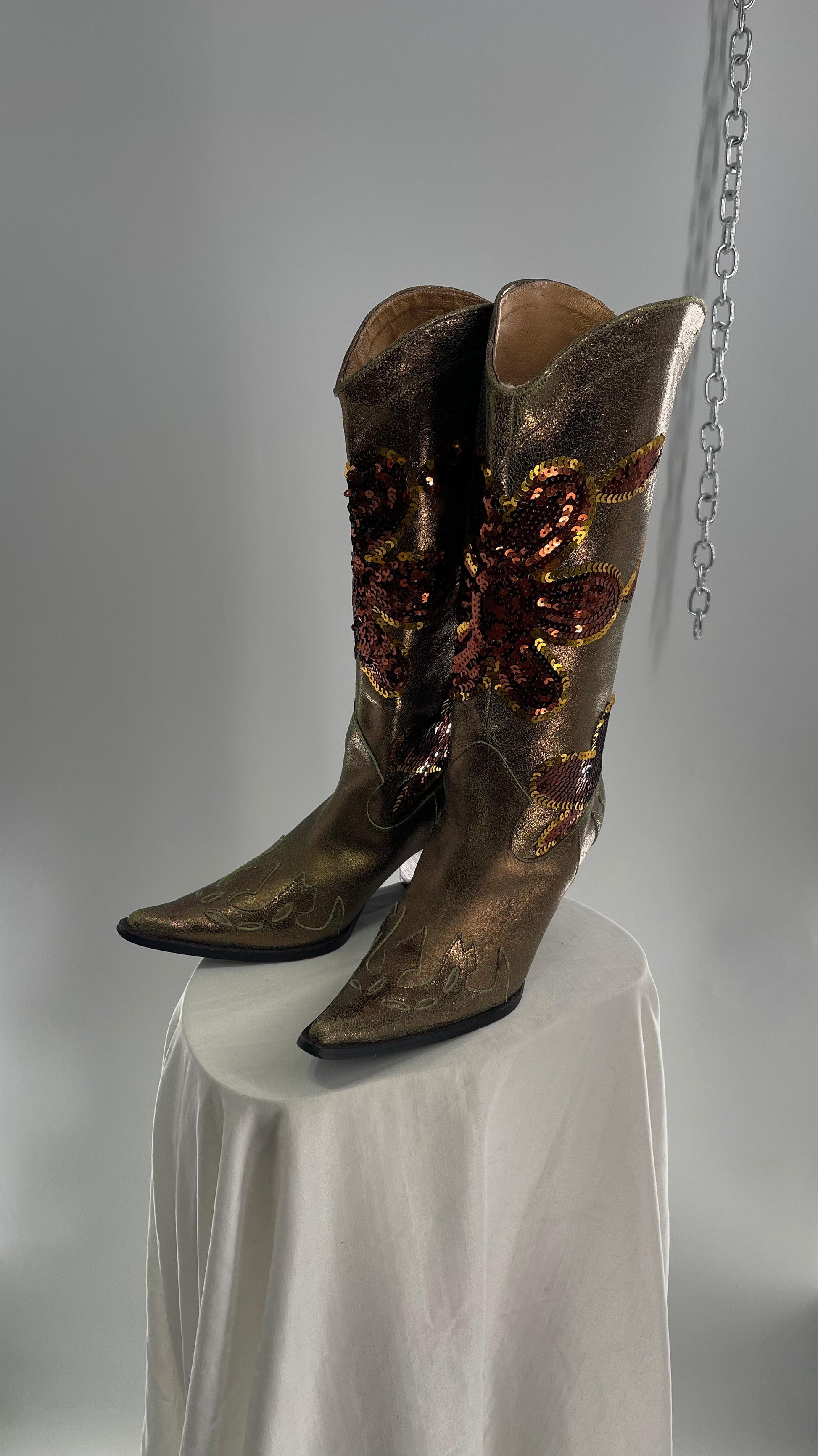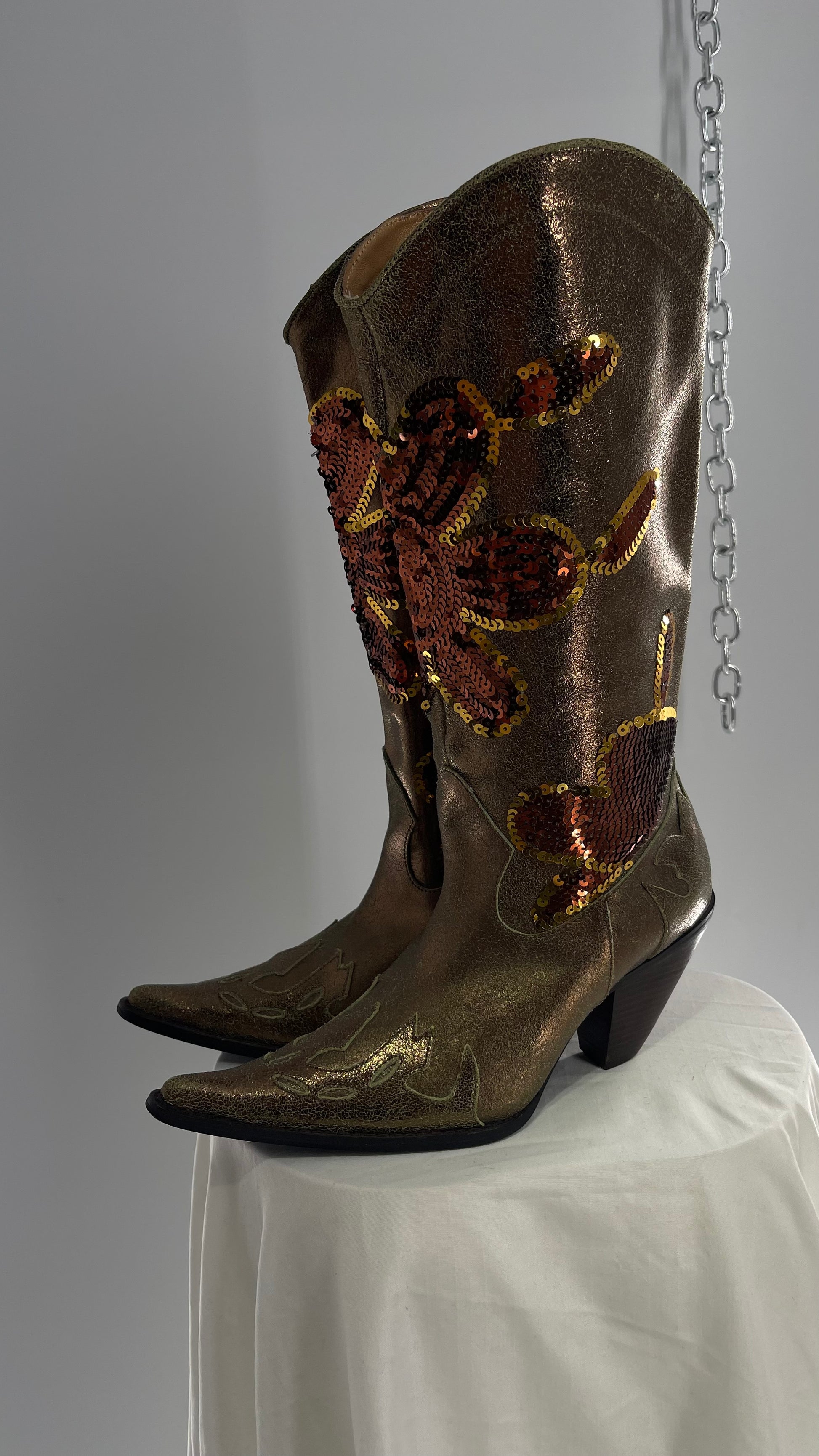RARE Vintage Foot Candy Sage Green/Bronze Leather Cowboy Boots with Sequin Flowers and Flame Details (6.5)