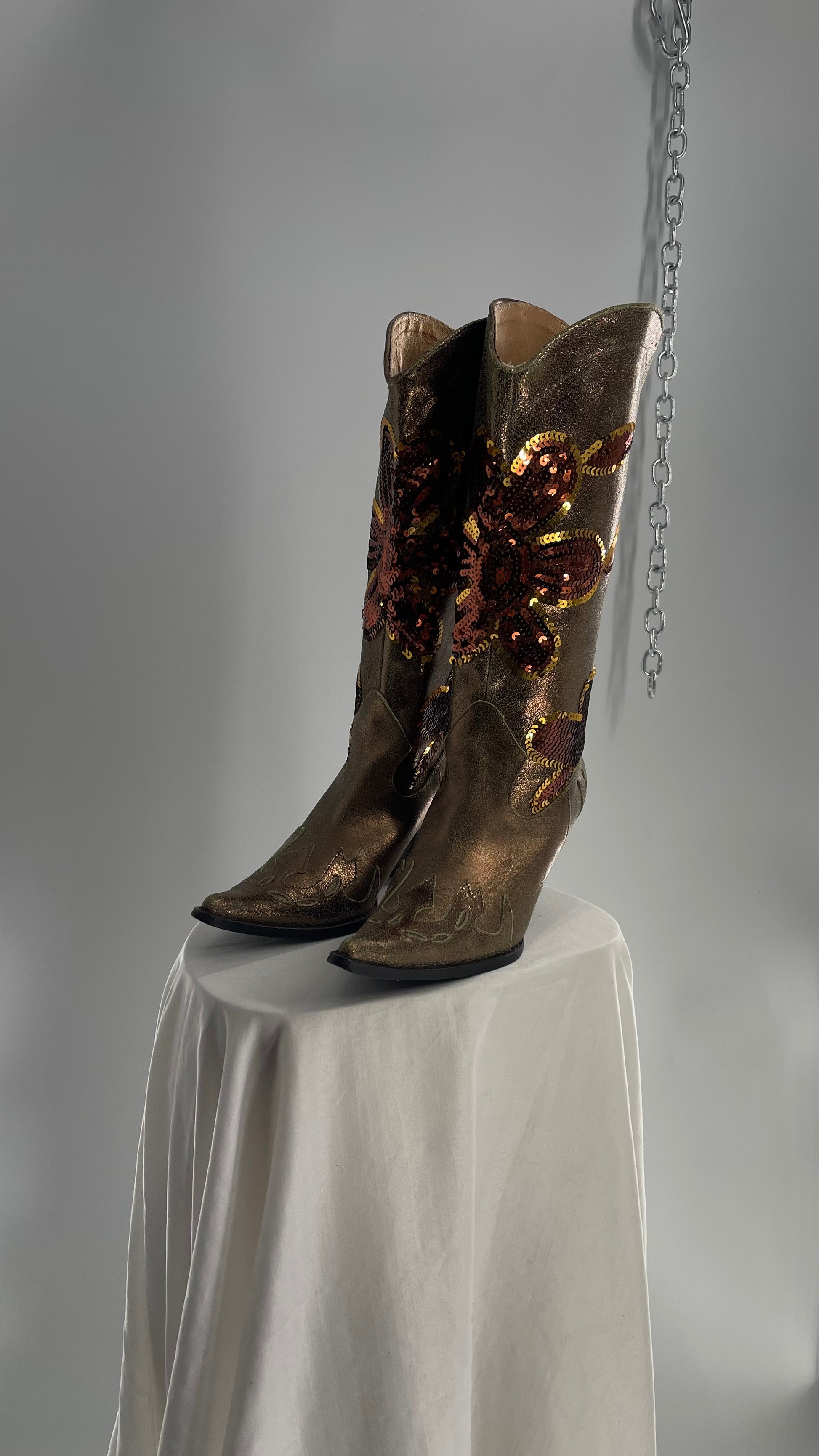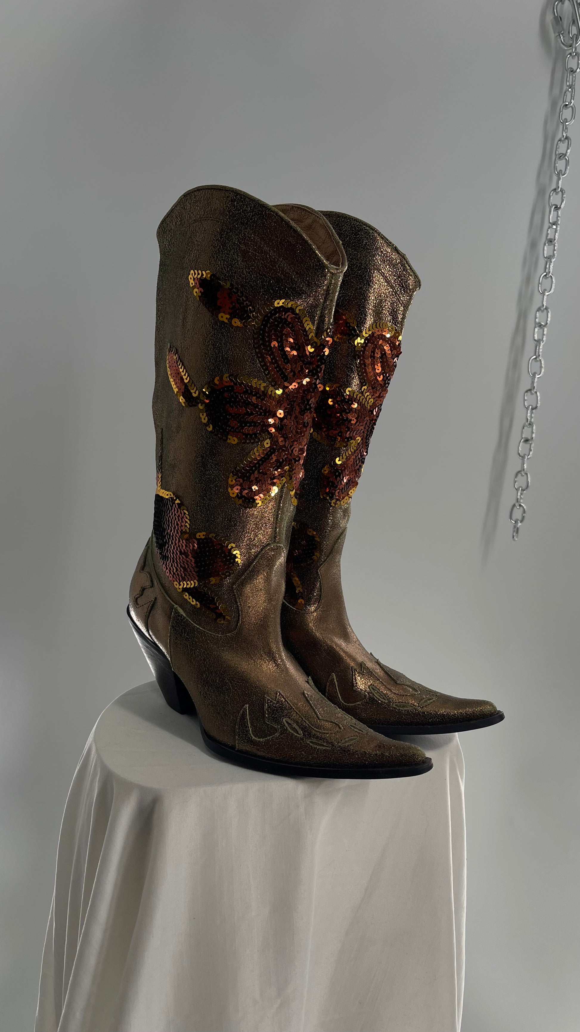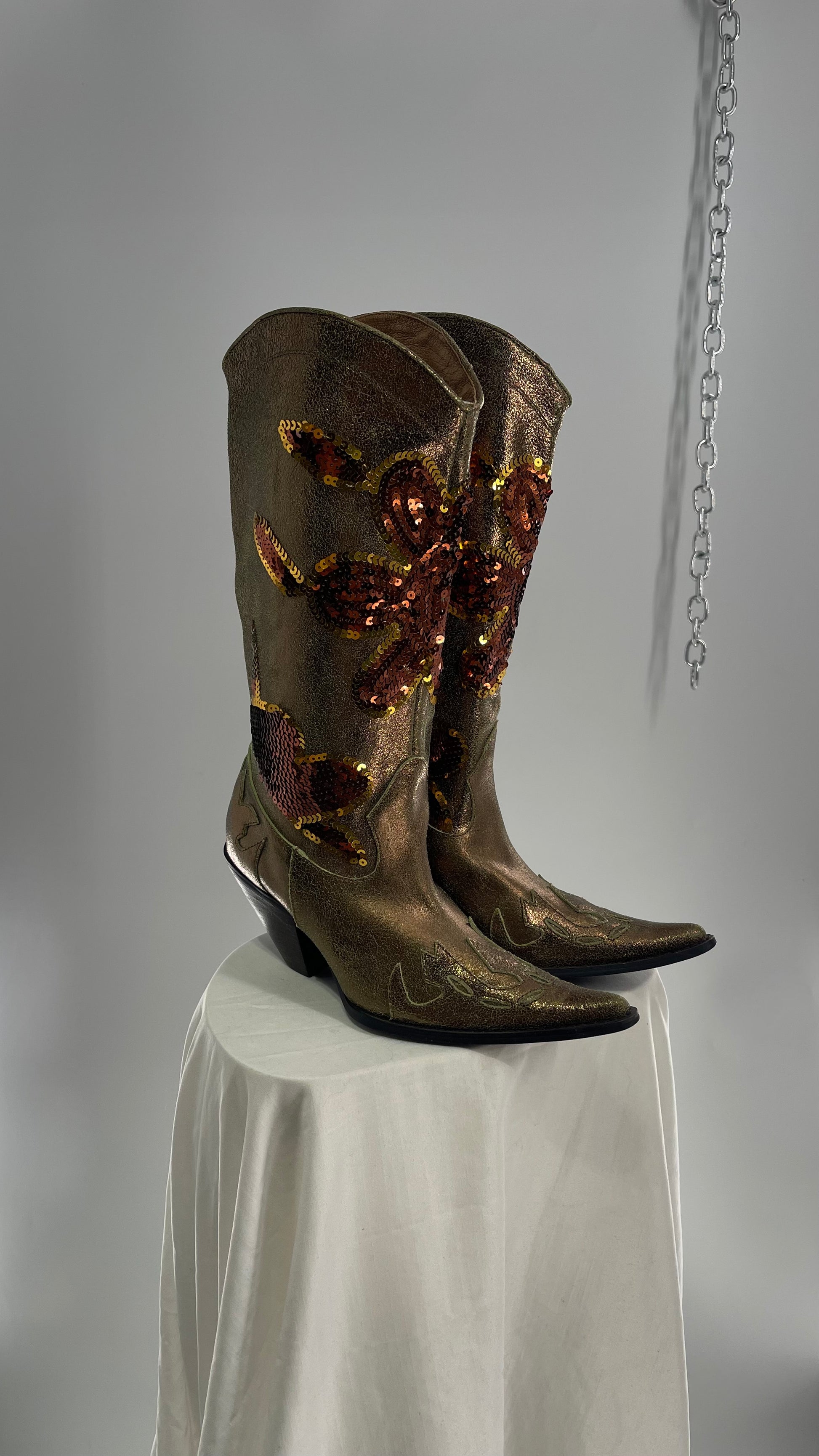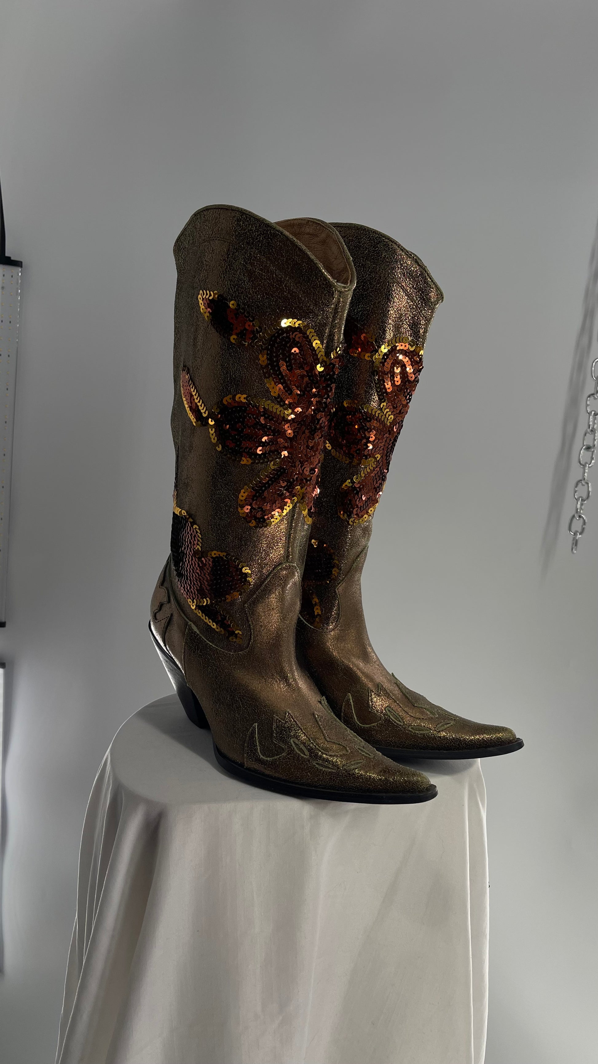RARE Vintage Foot Candy Sage Green/Bronze Leather Cowboy Boots with Sequin Flowers and Flame Details (6.5)