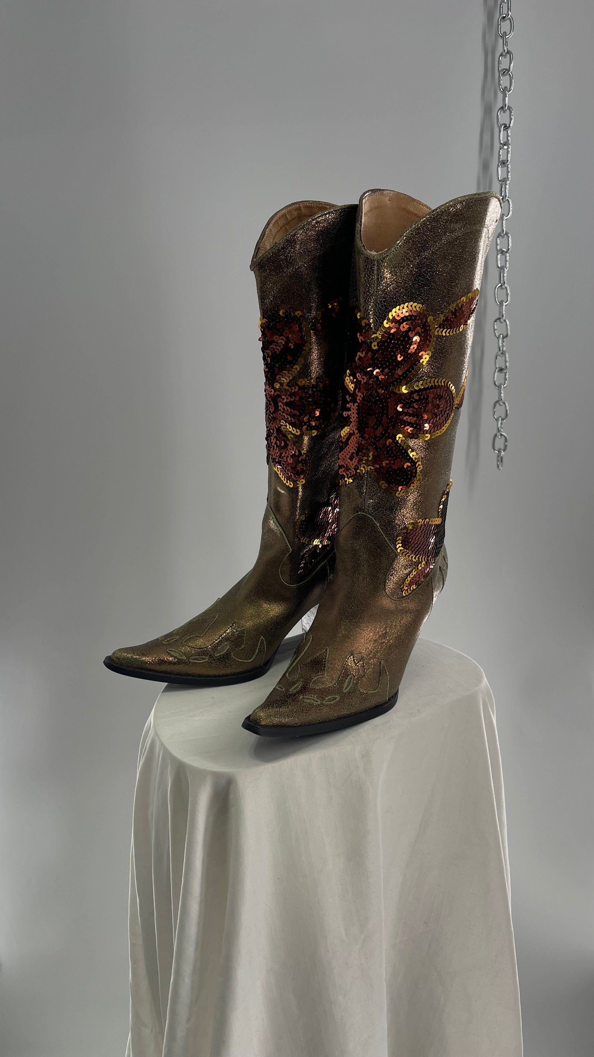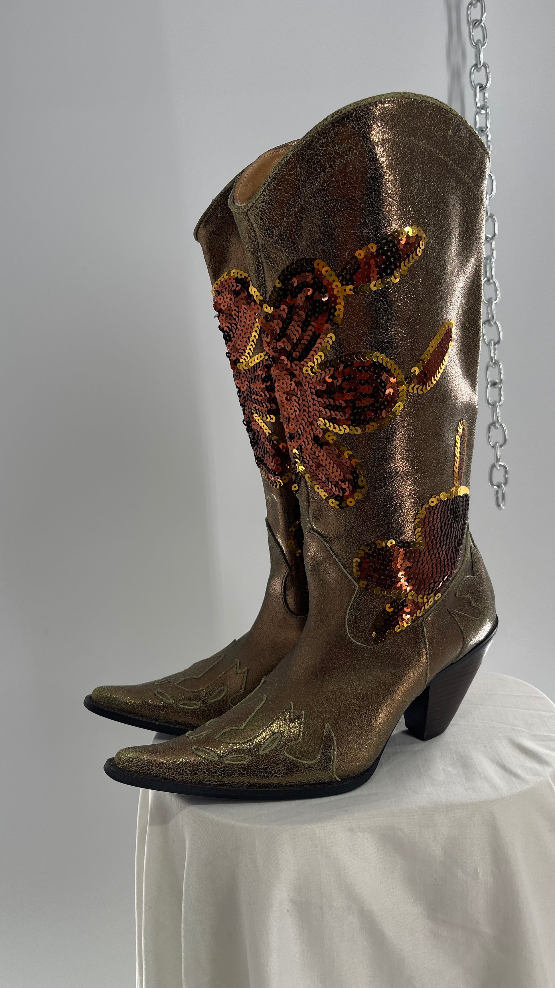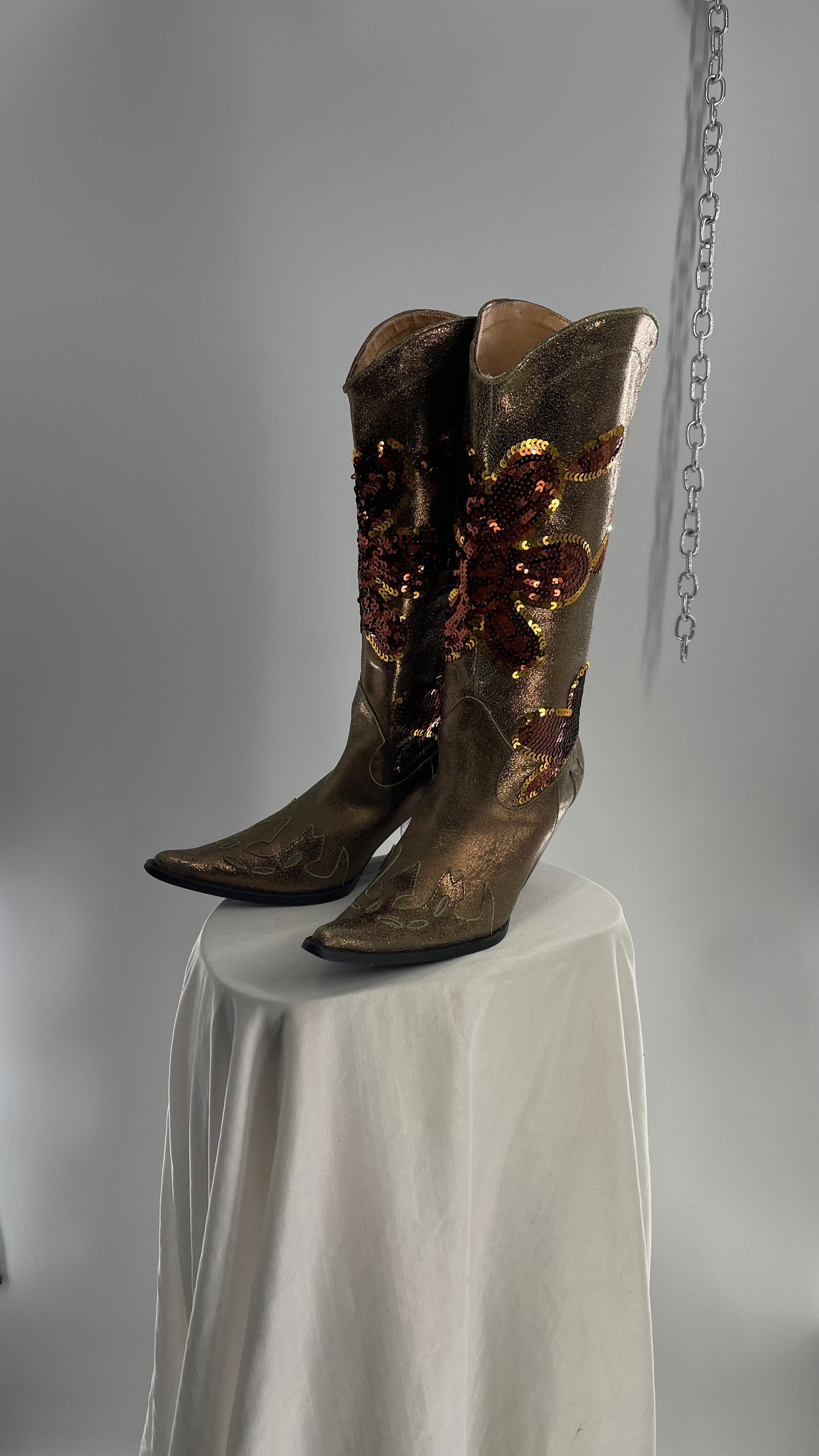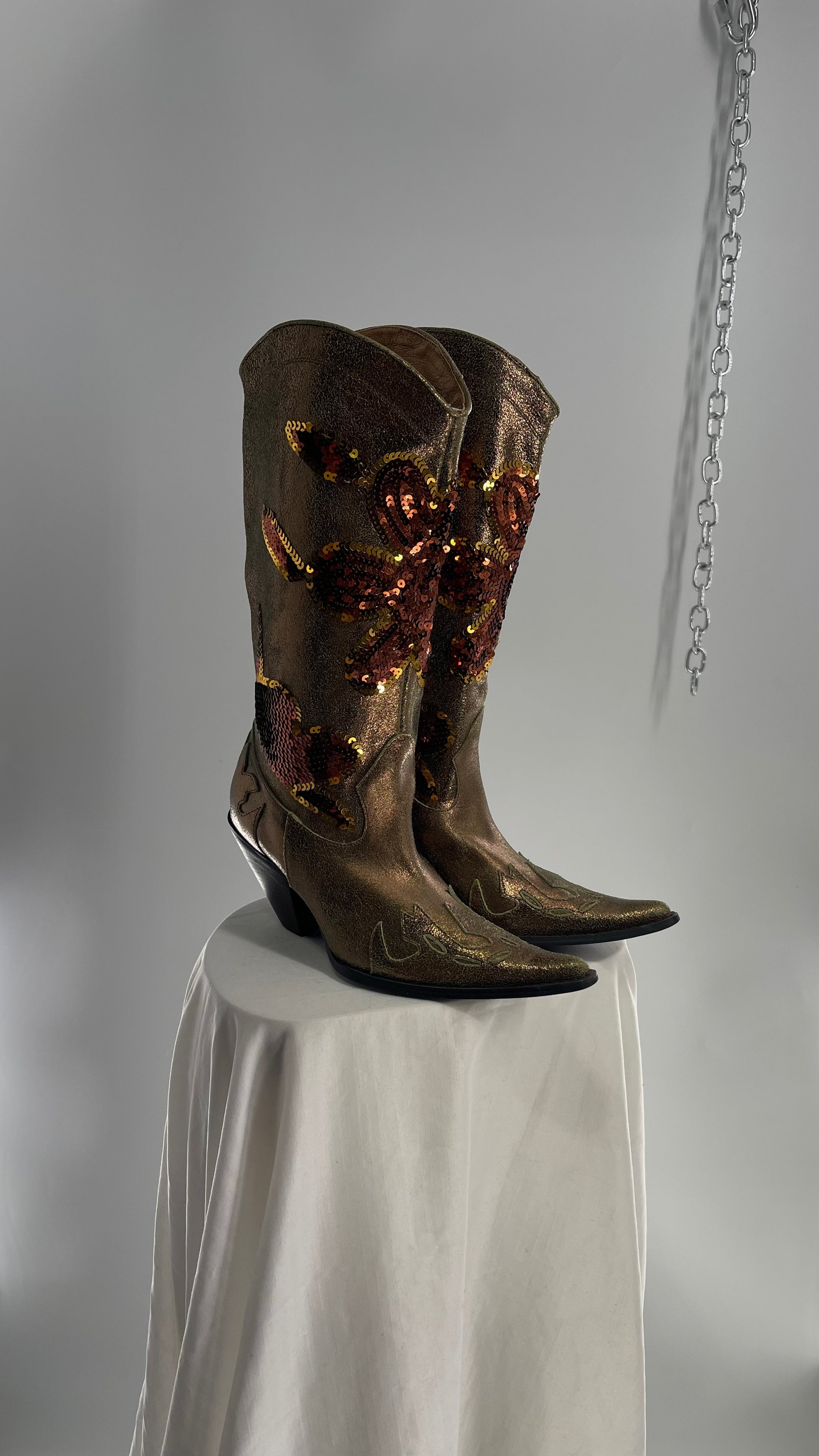 RARE Vintage Foot Candy Sage Green/Bronze Leather Cowboy Boots with Sequin Flowers and Flame Details (6.5)