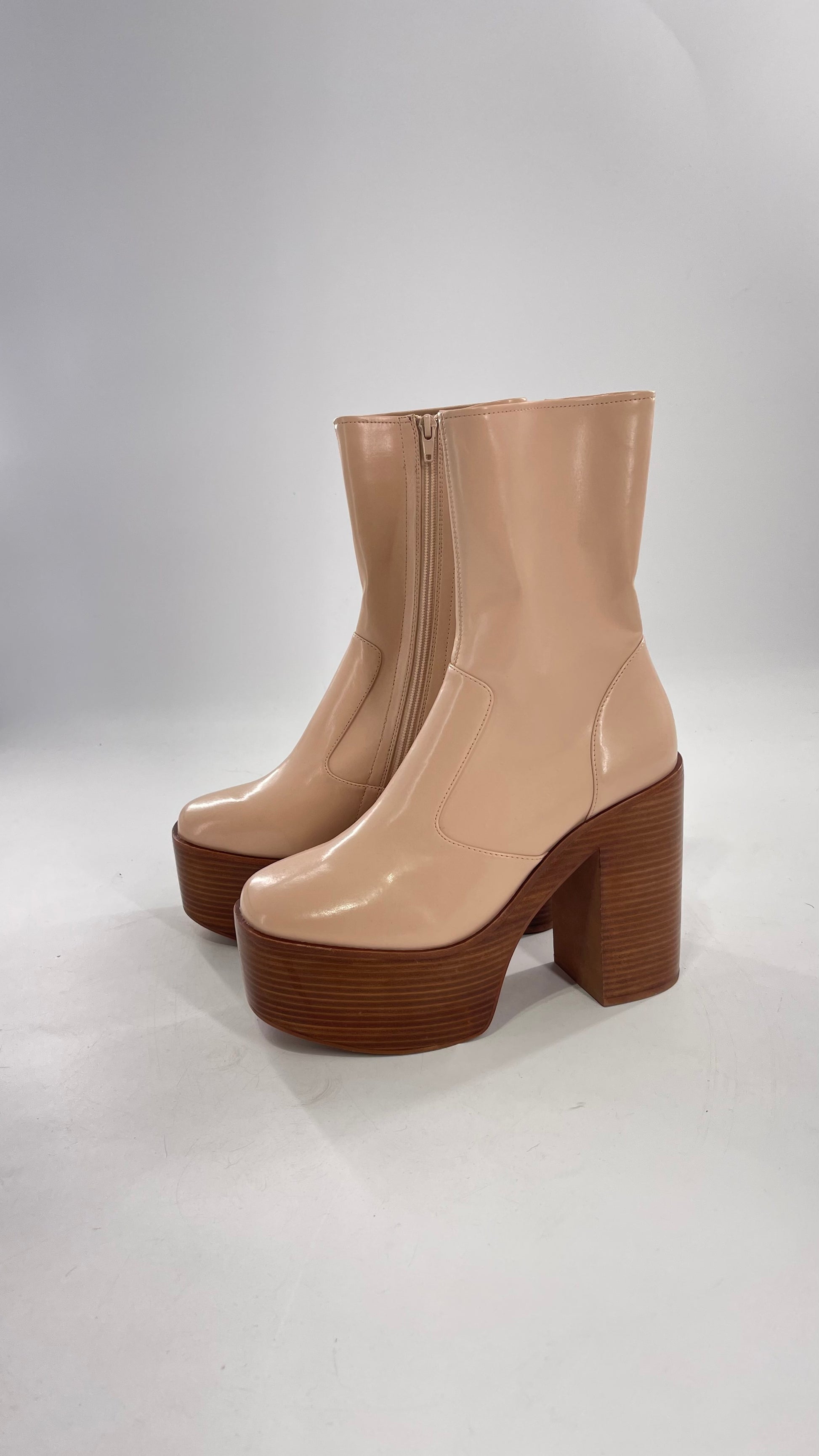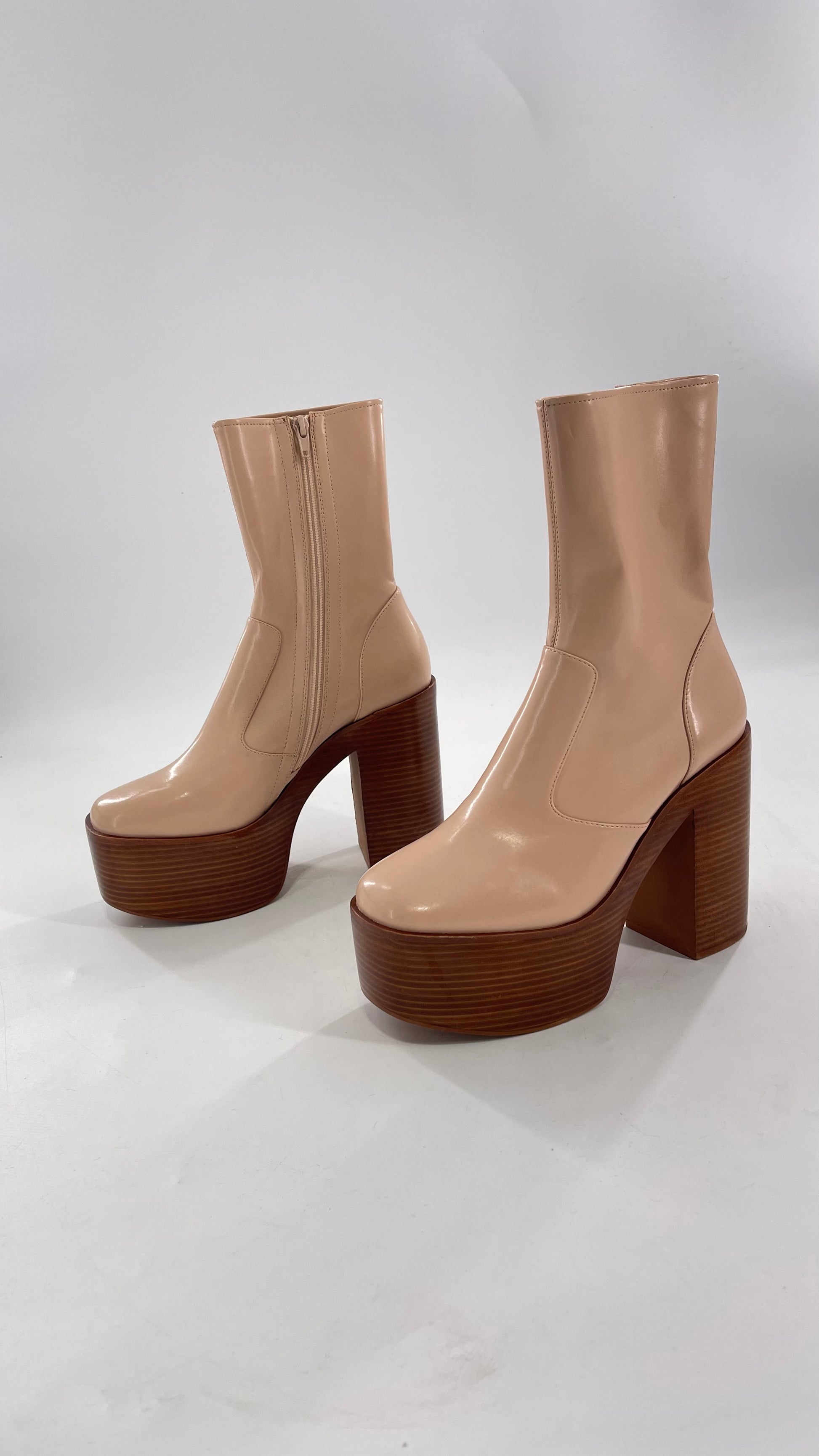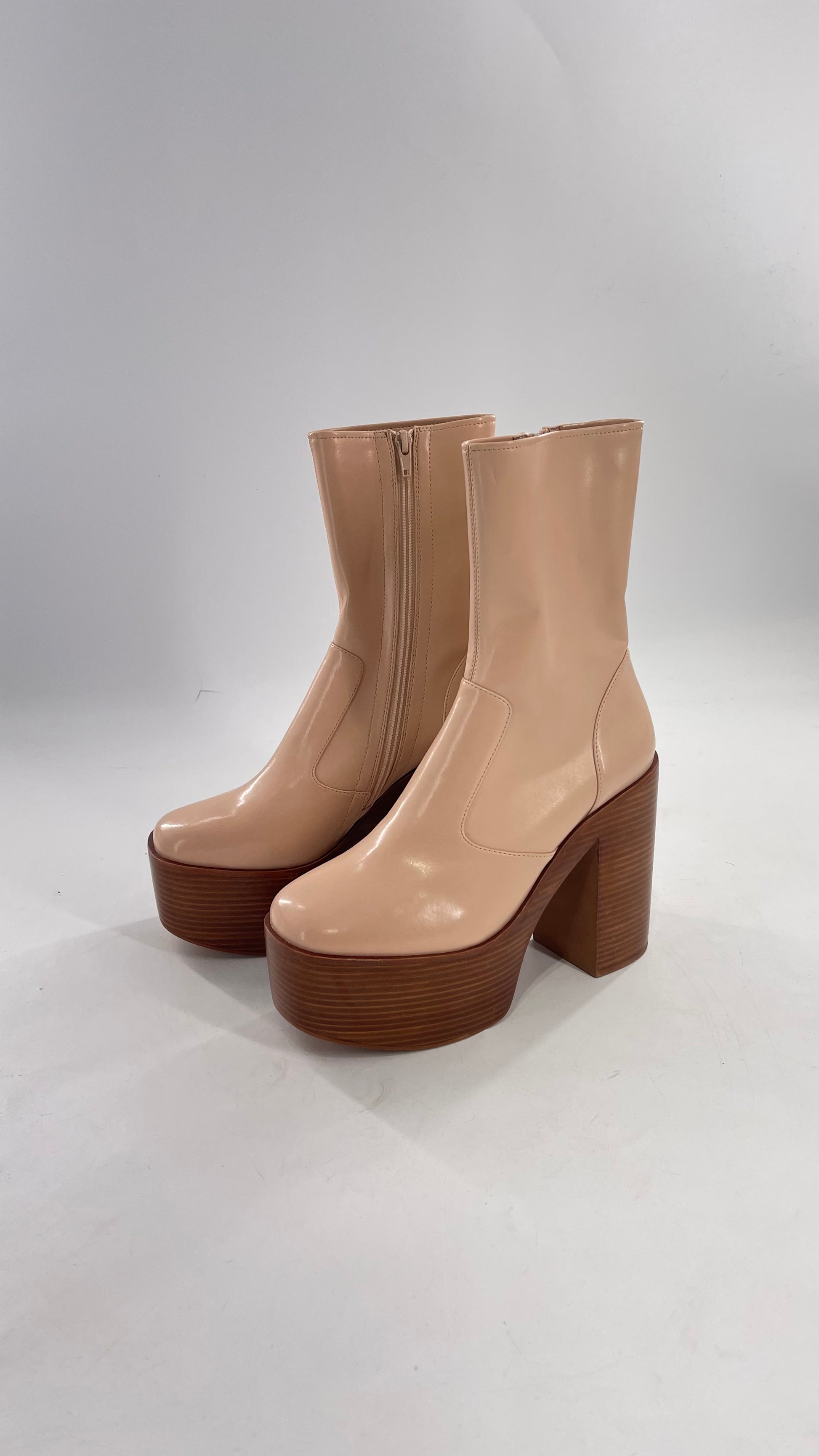 Free People X Jeffrey Campbell Mexique GoGo Boots • Beige Patent Boot with Wood Grain Chunky Block Heel and Platform (9)