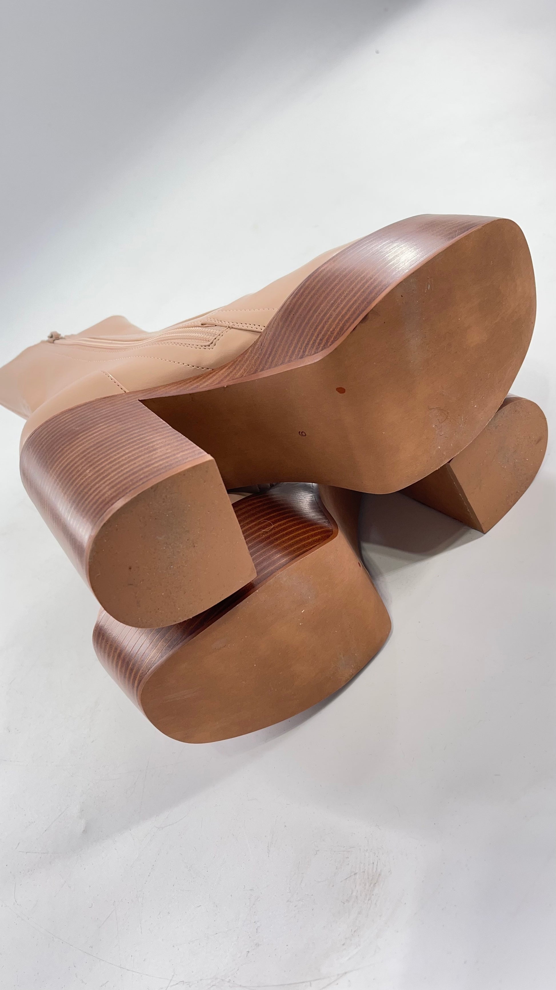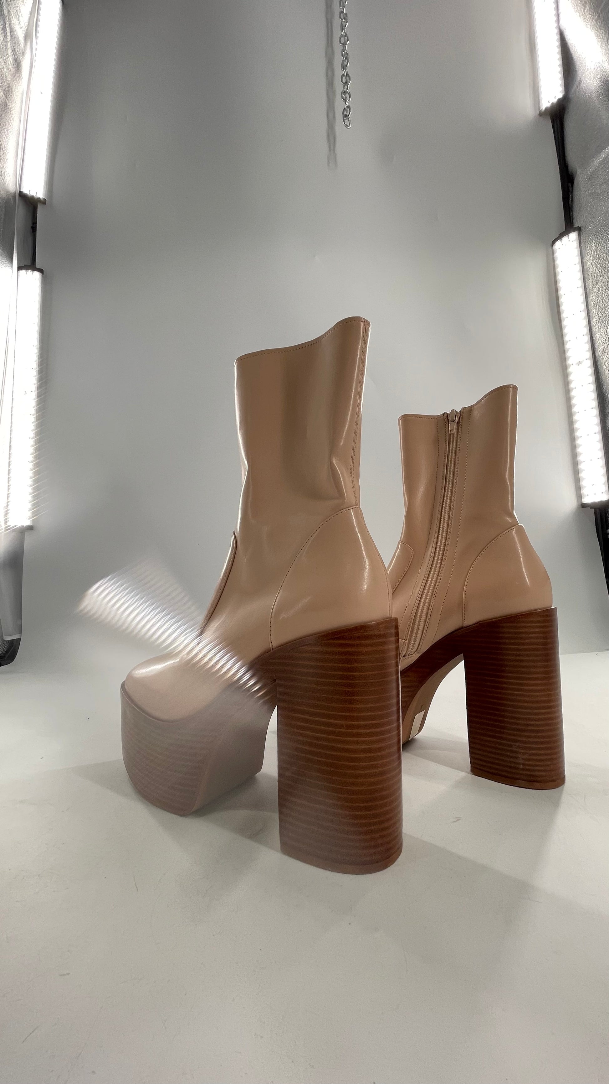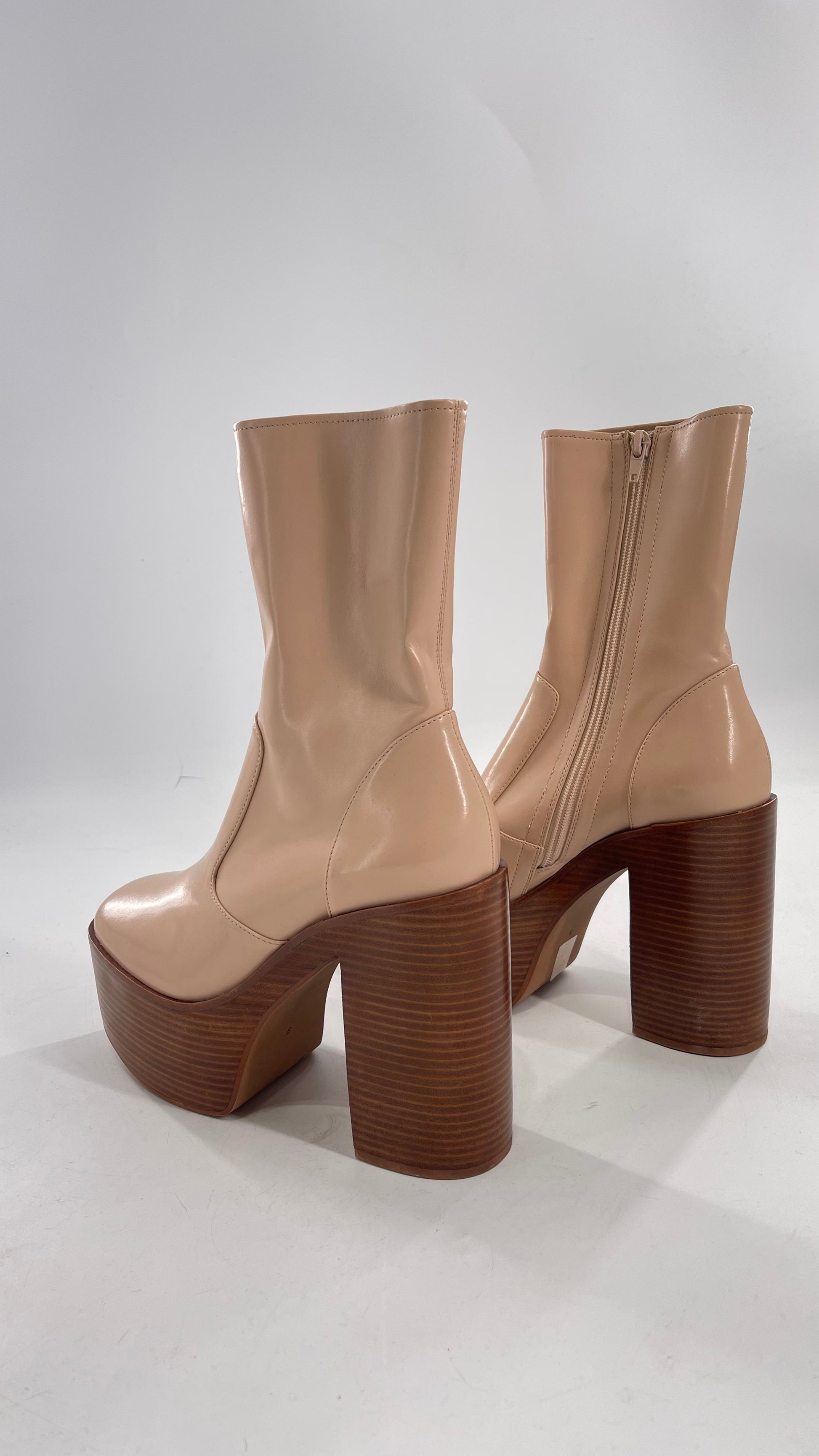Free People X Jeffrey Campbell Mexique GoGo Boots • Beige Patent Boot with Wood Grain Chunky Block Heel and Platform (9)