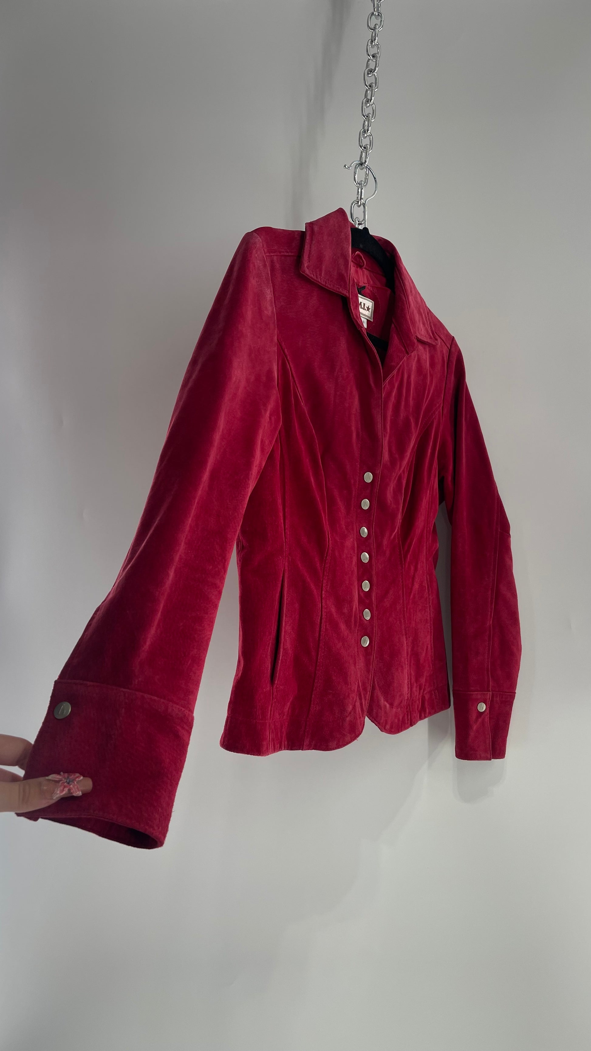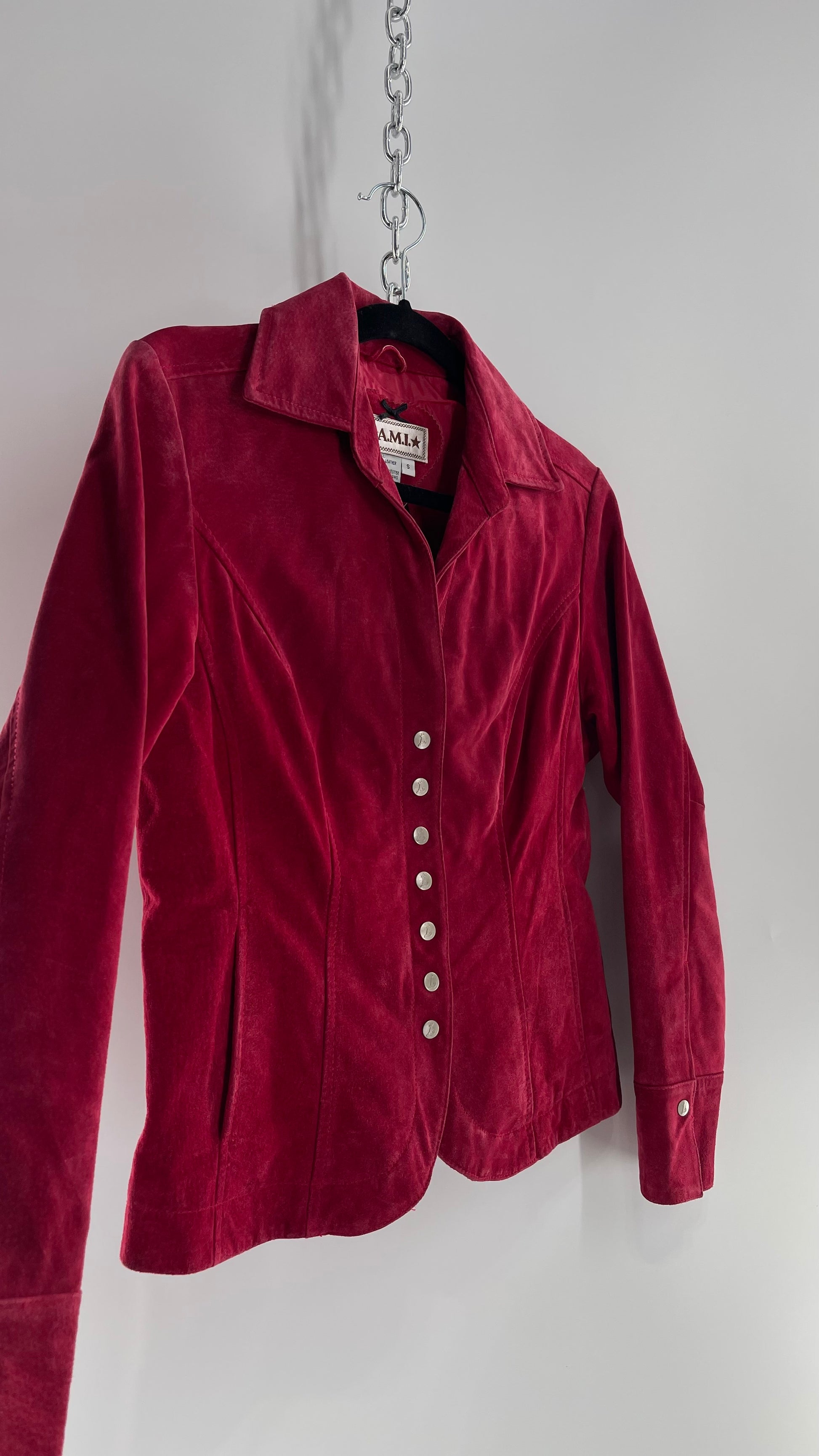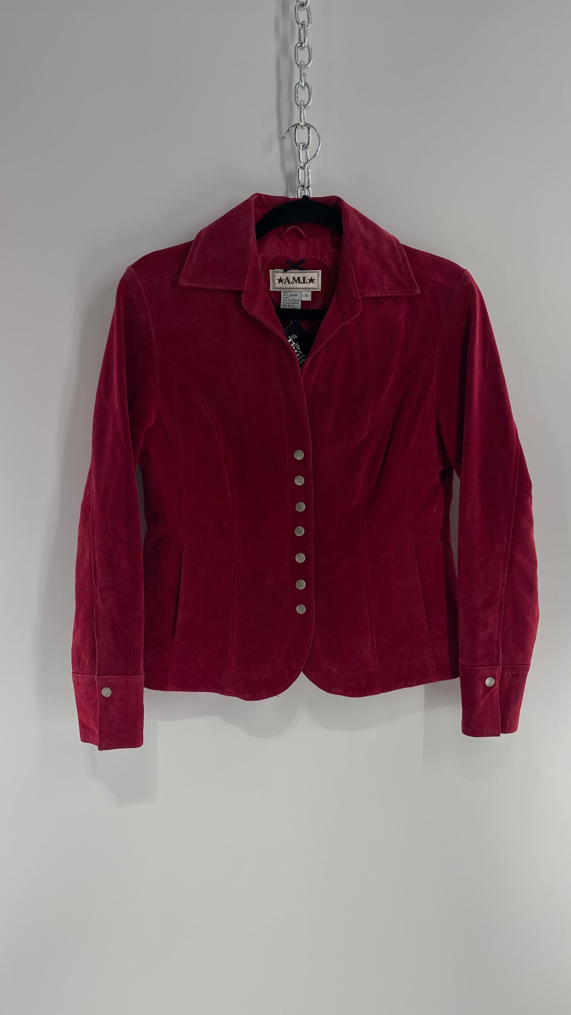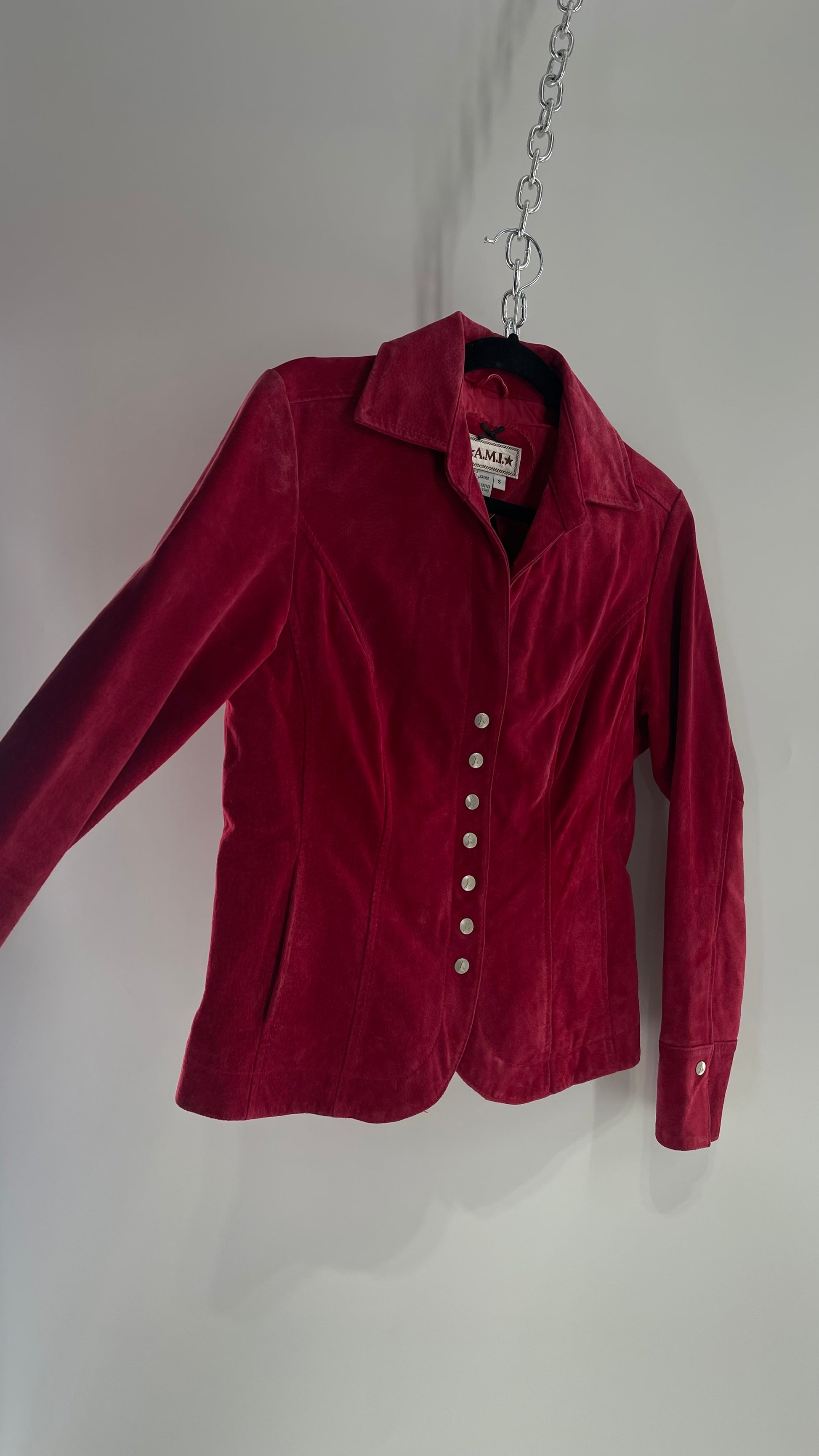 VINTAGE A.M.I Raspberry Red Suede Leather Slim Waist Metal Button Front Jacket