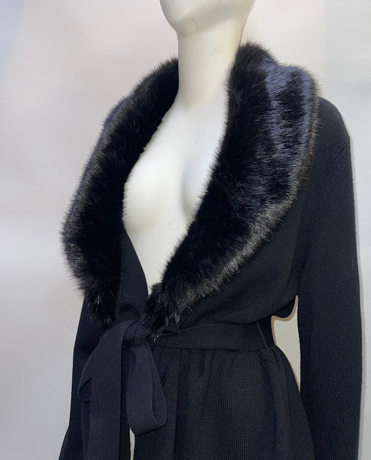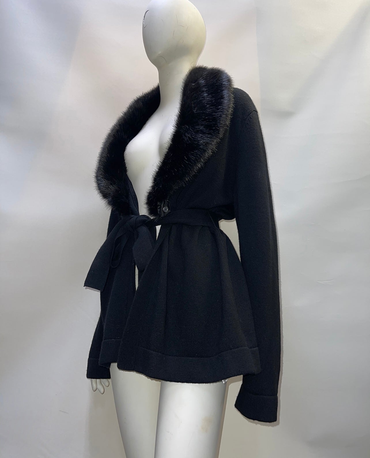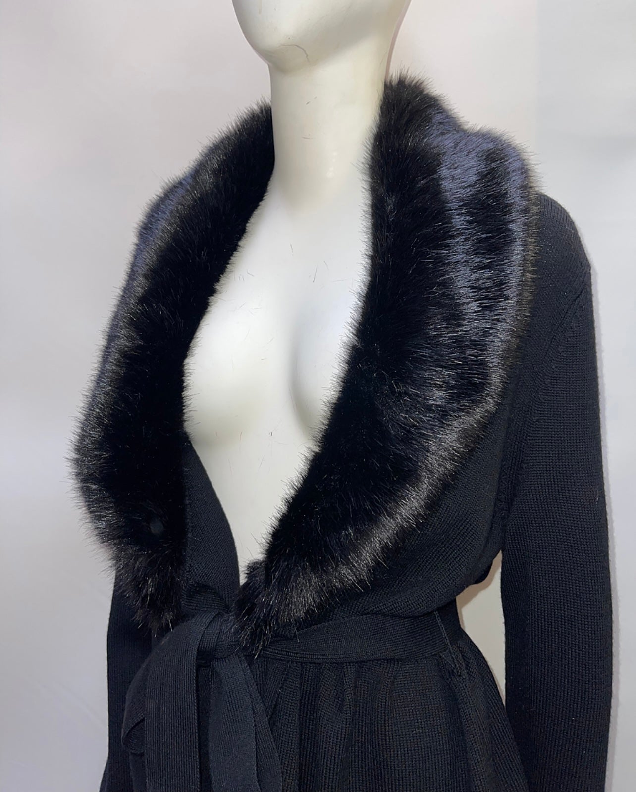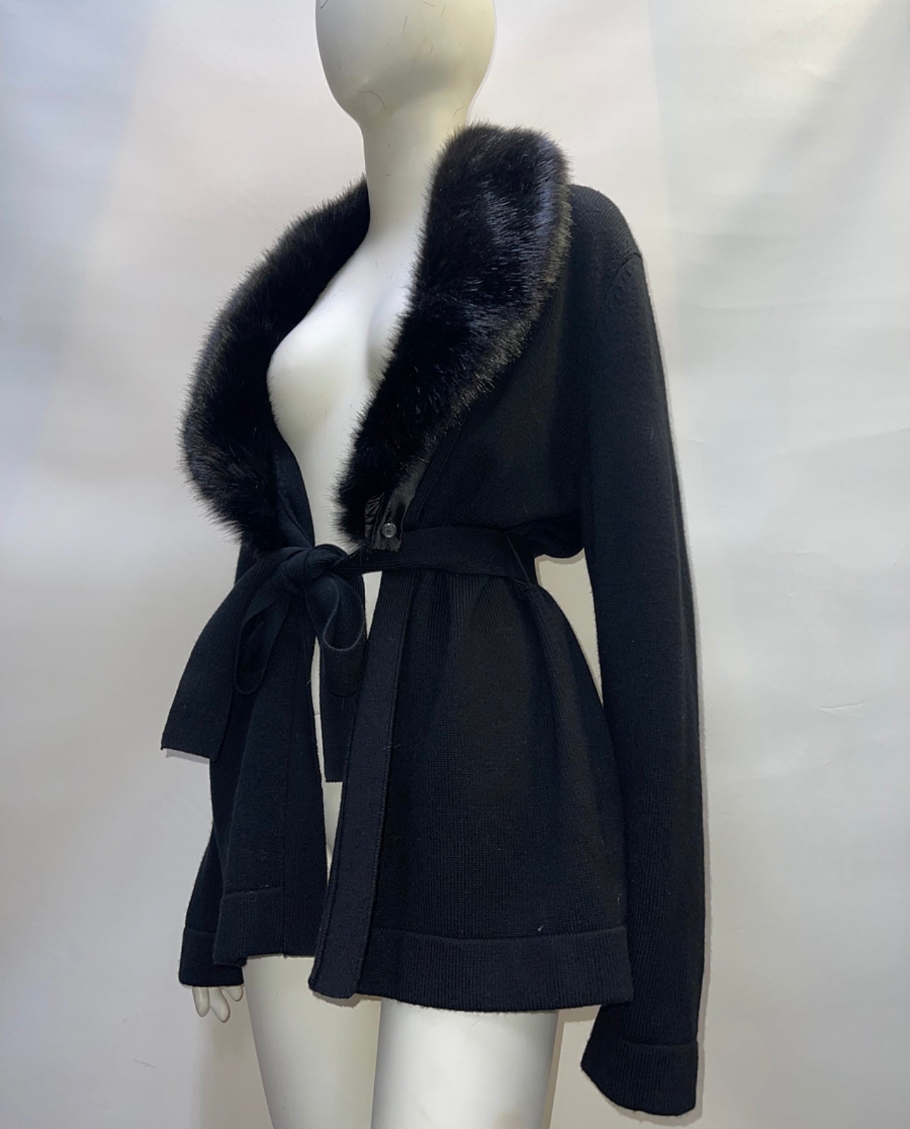 Talbots Black Jacket Cardigan with Fur Collar and Belt (Size L)