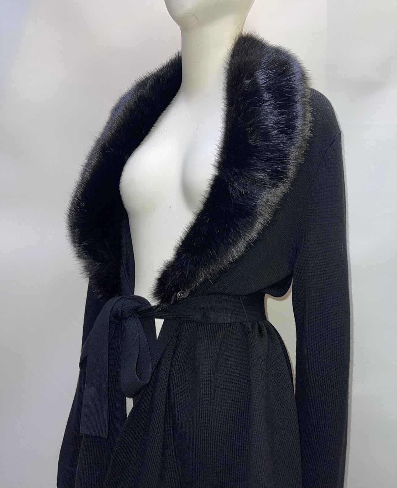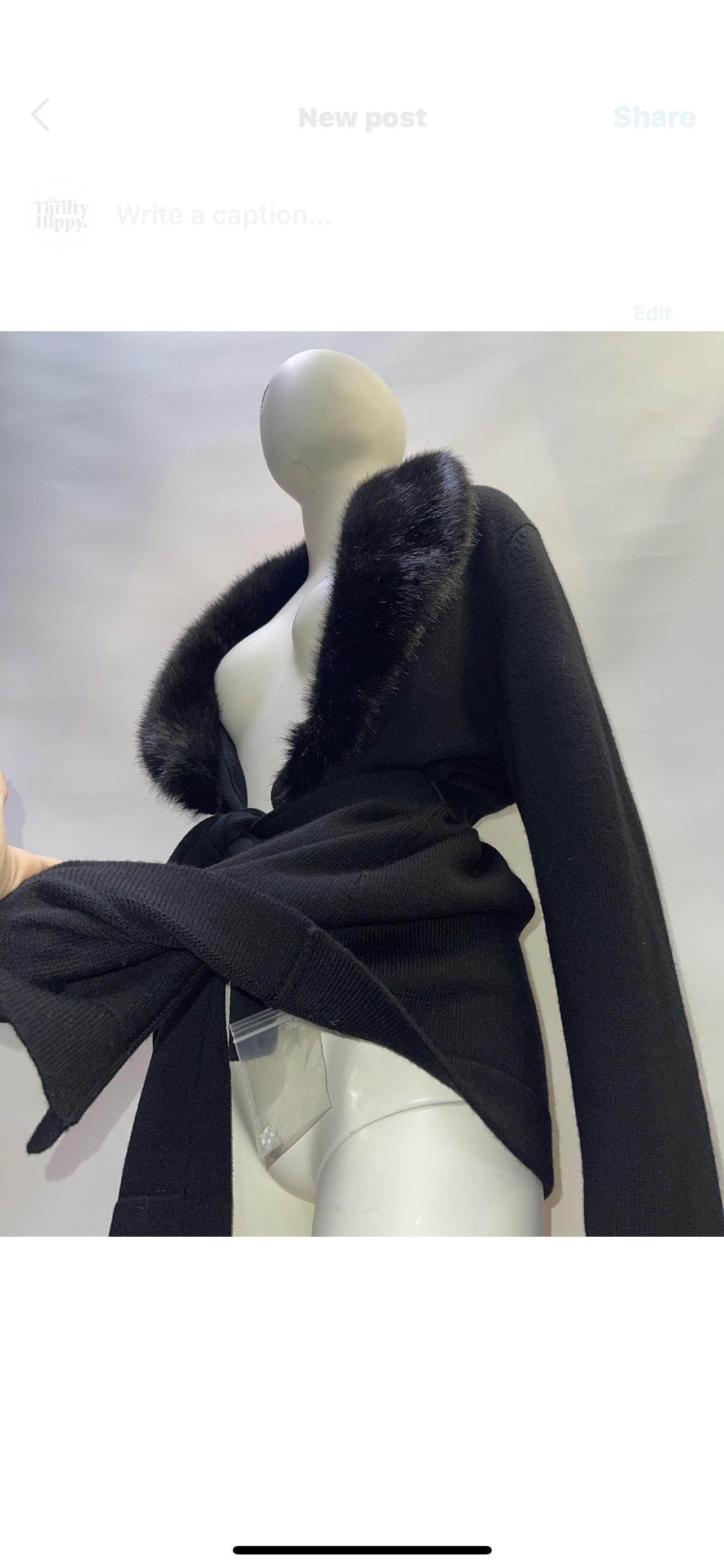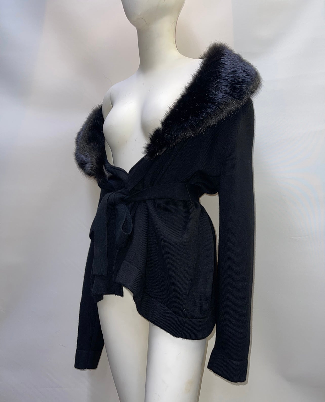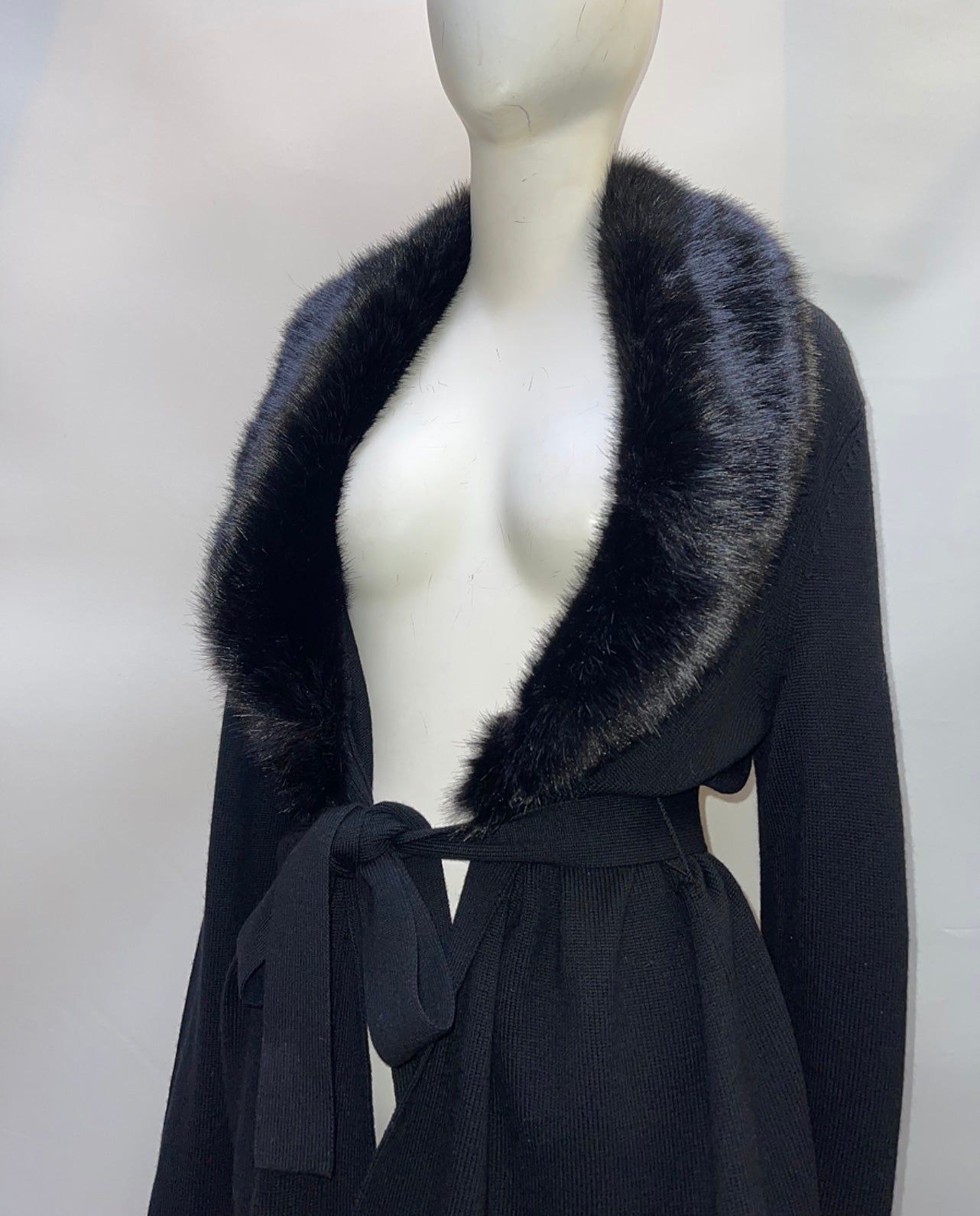 Talbots Black Jacket Cardigan with Fur Collar and Belt (Size L)