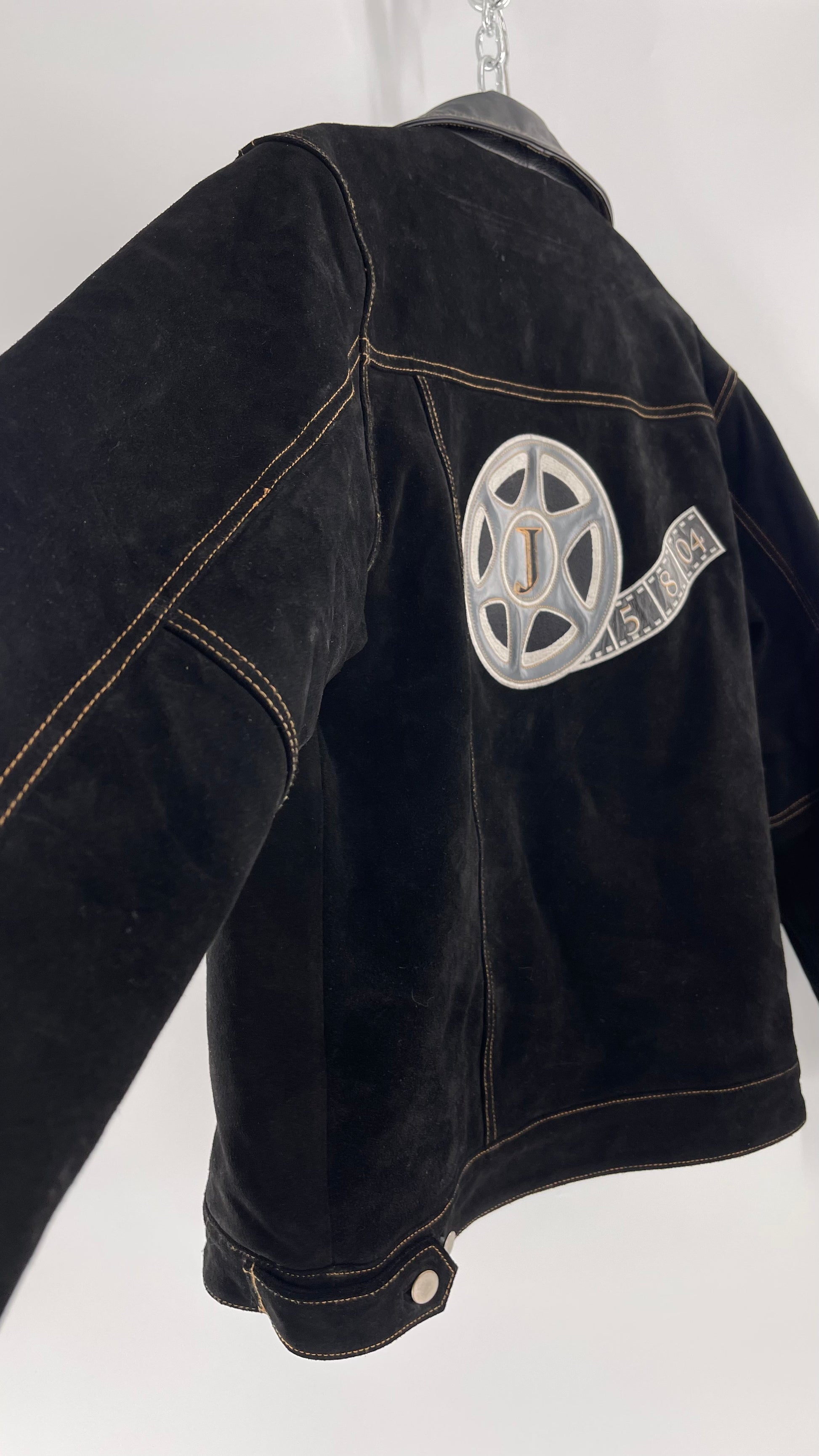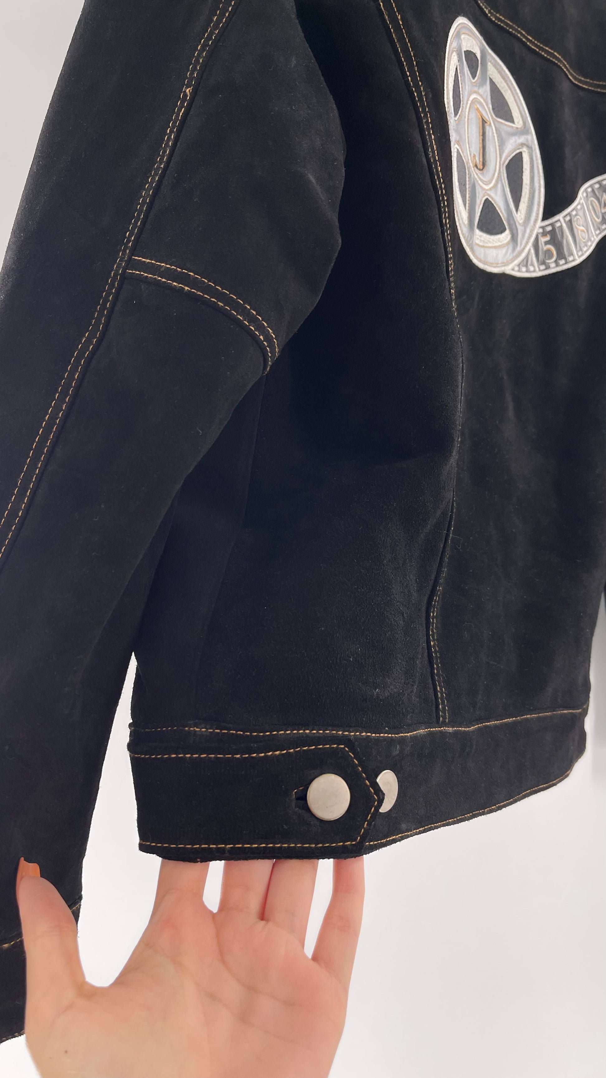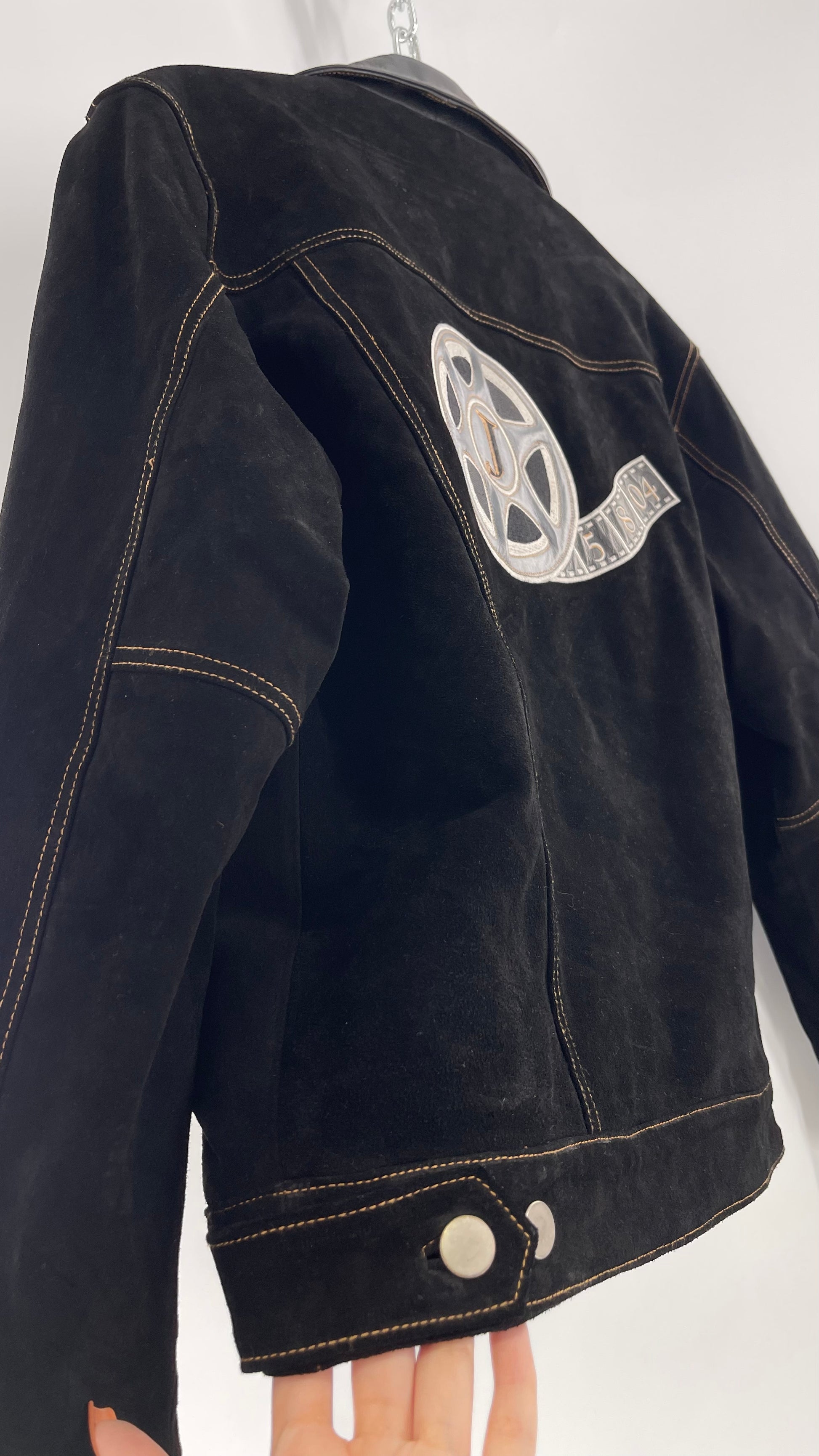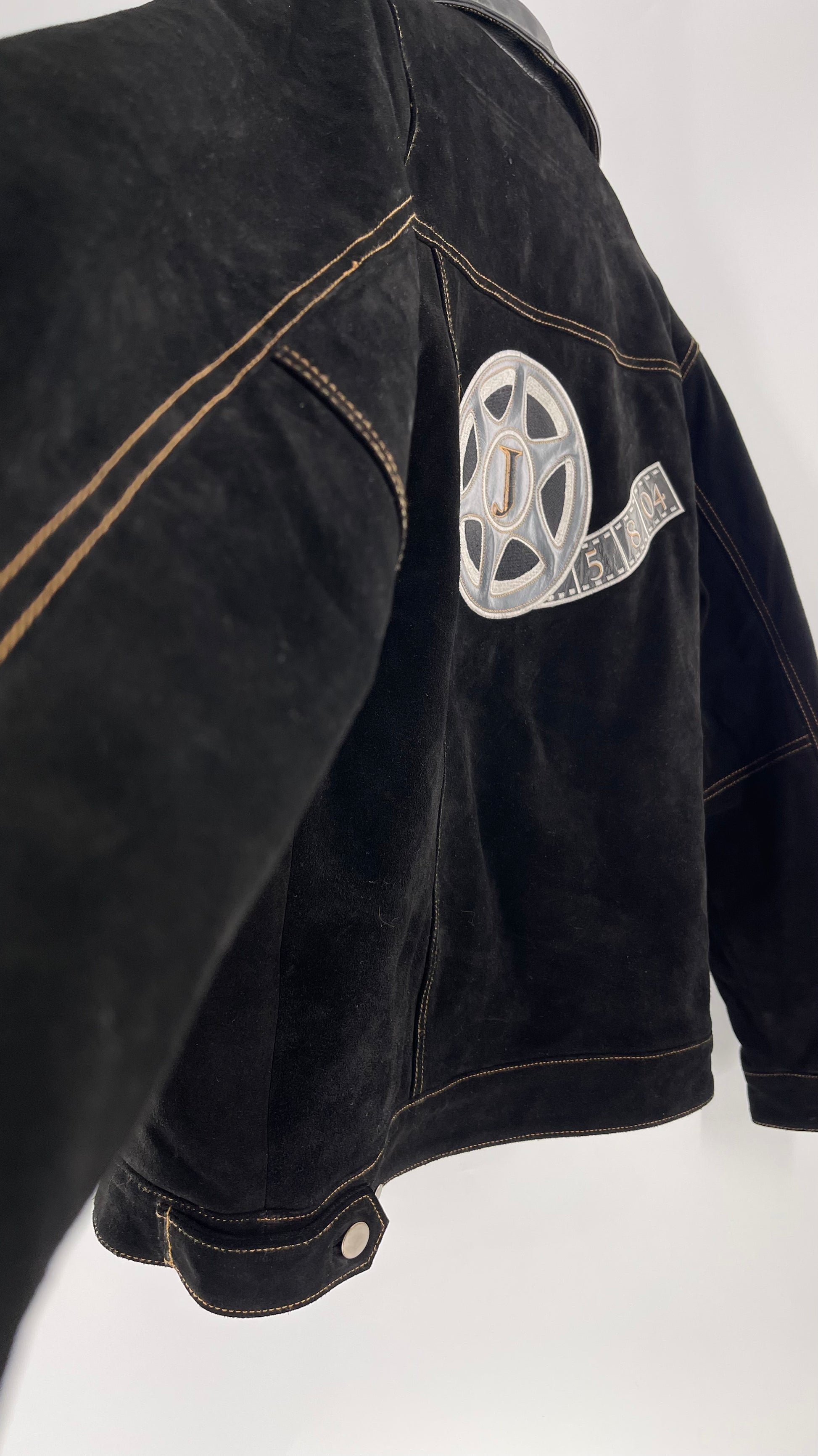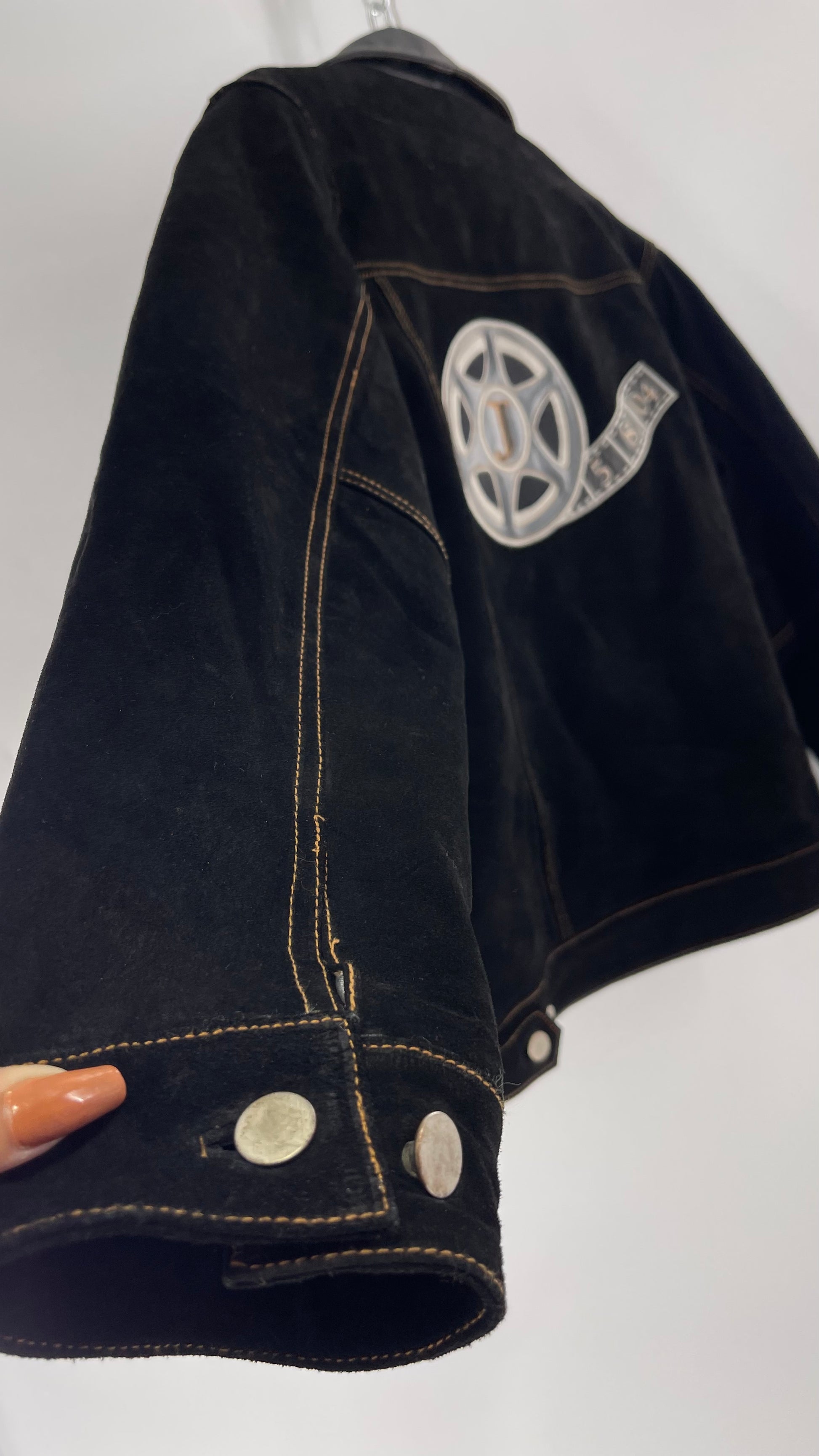 Vintage Extreme Black Suede Heavy Duty Jacket with leather collar, contrast yellow stitching, and cinematic embroidered back patch (Medium)