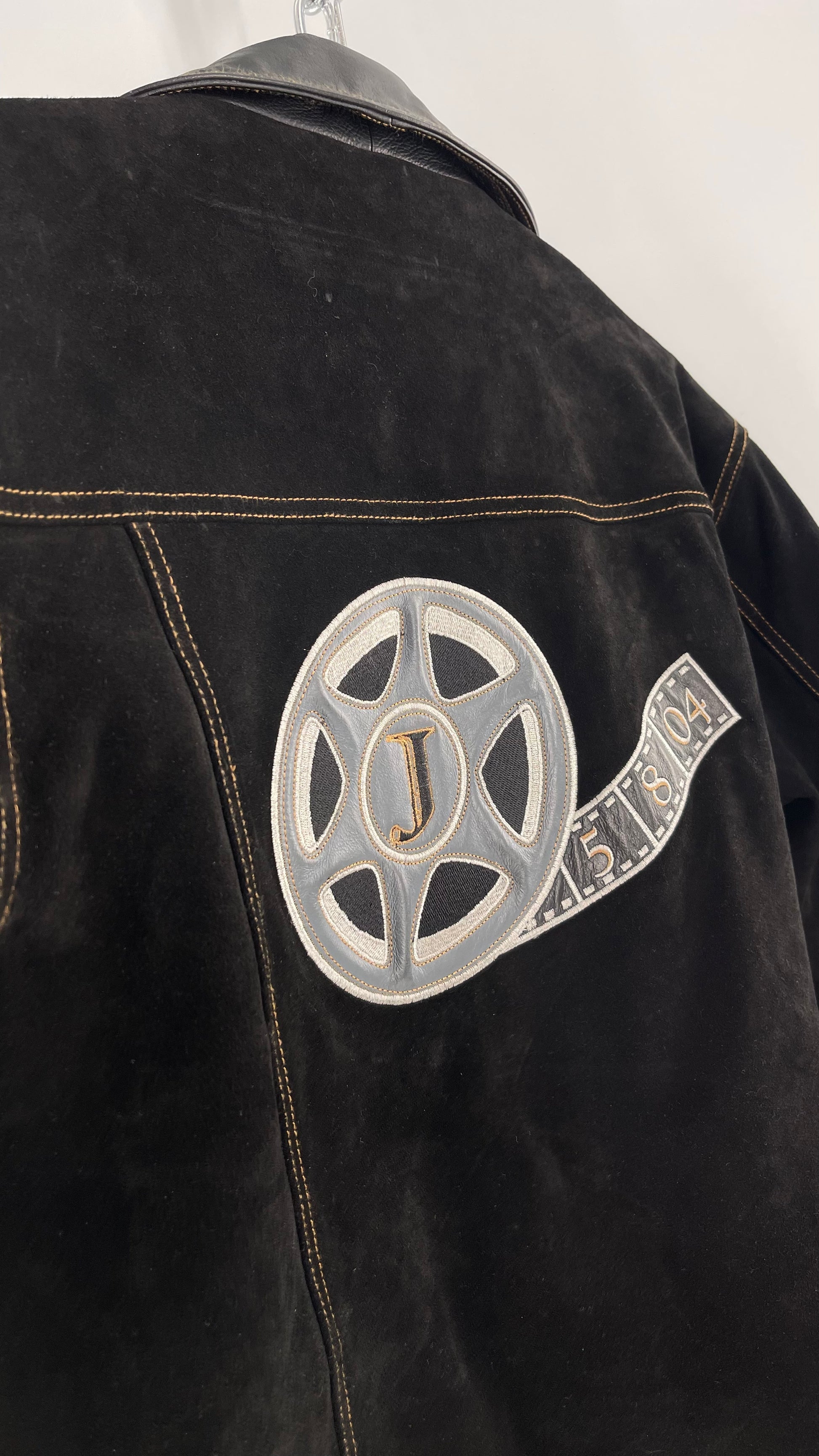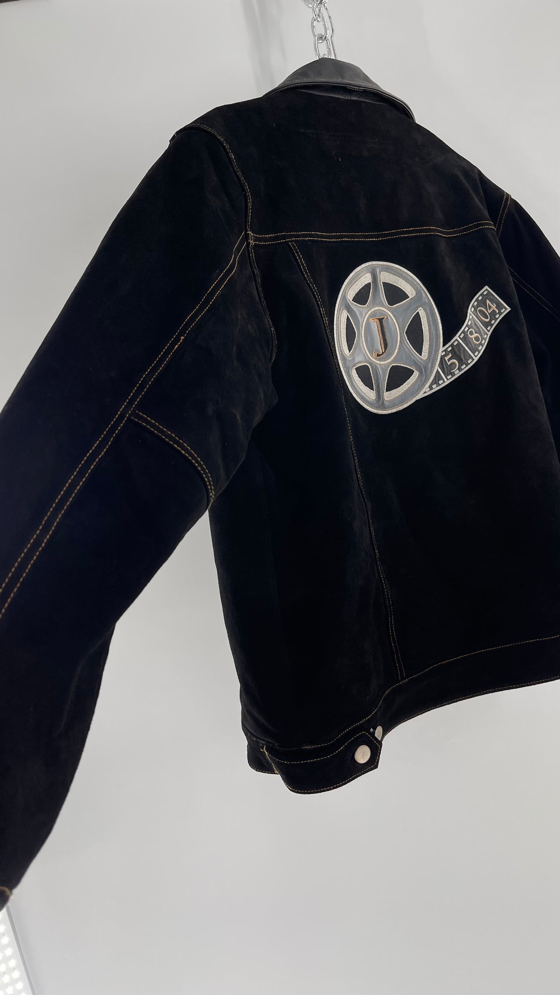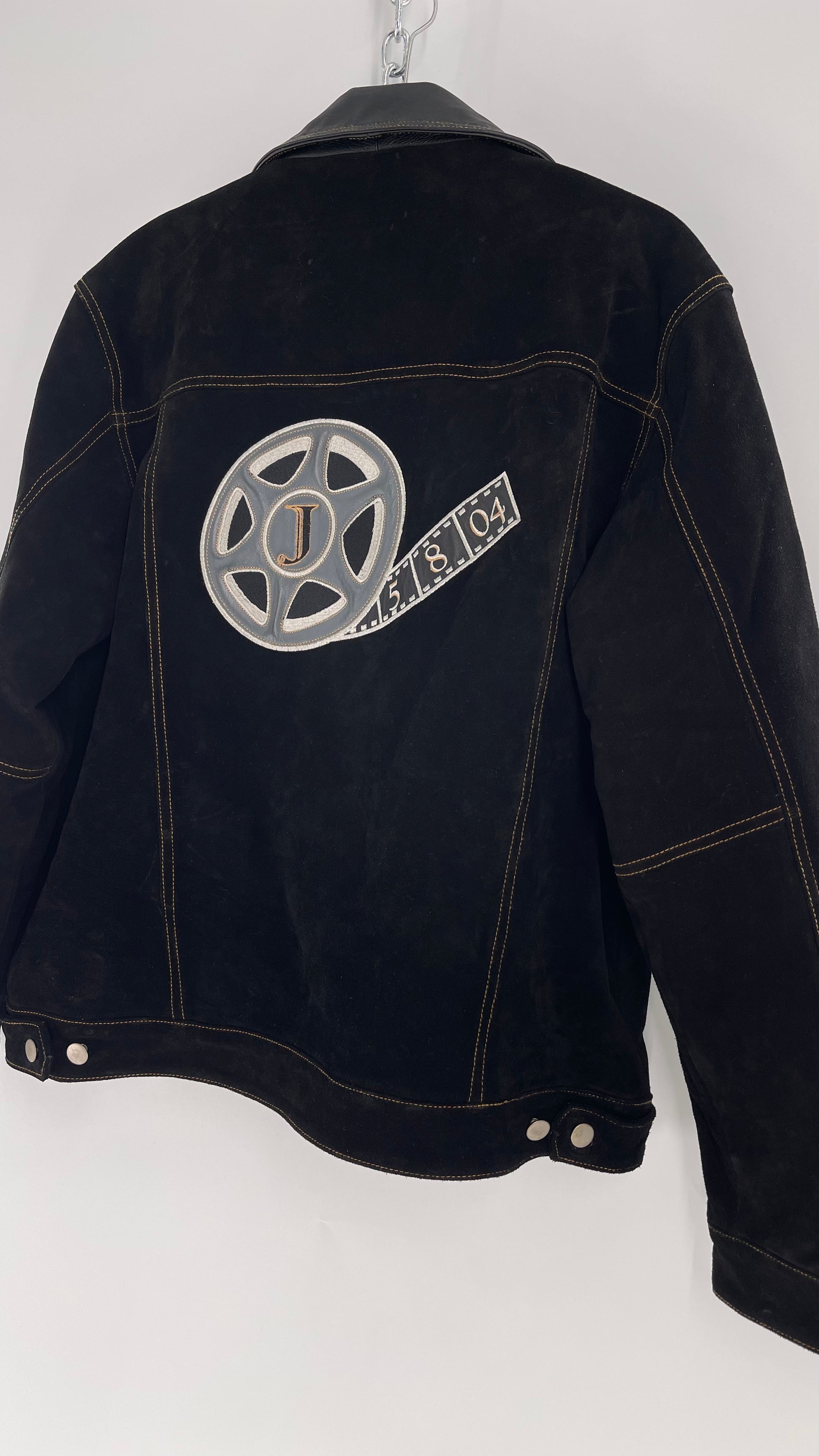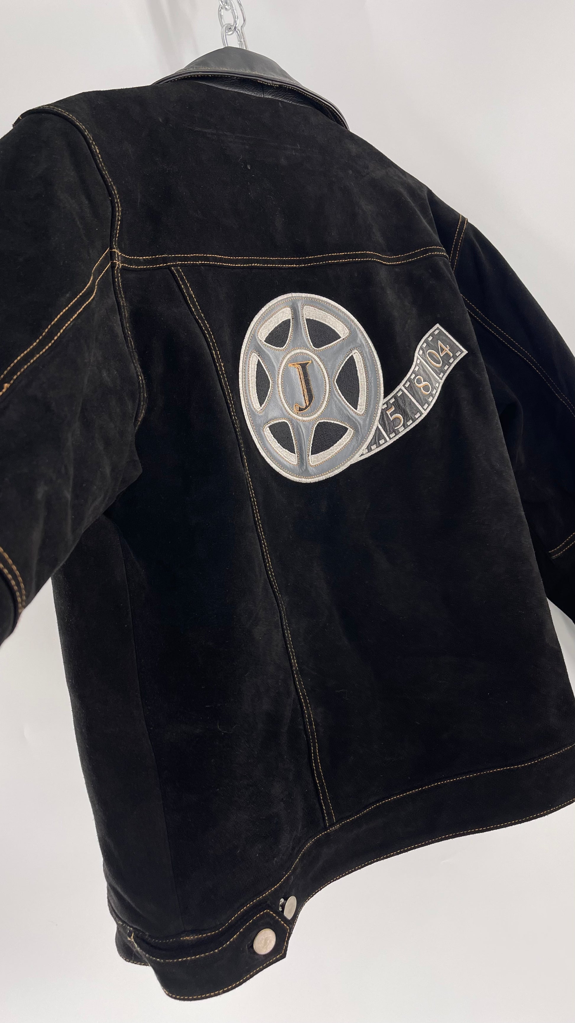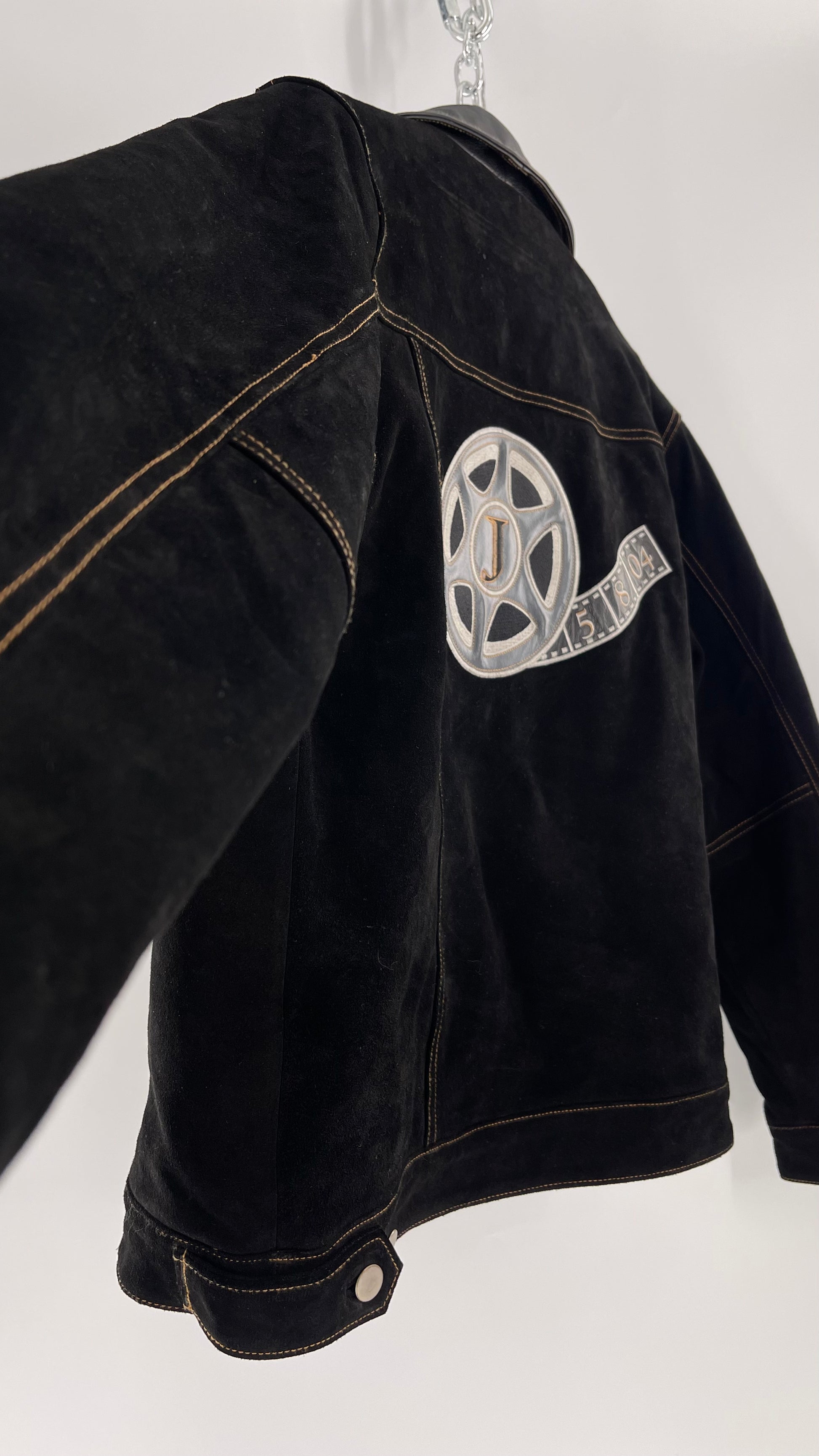 Vintage Extreme Black Suede Heavy Duty Jacket with leather collar, contrast yellow stitching, and cinematic embroidered back patch (Medium)