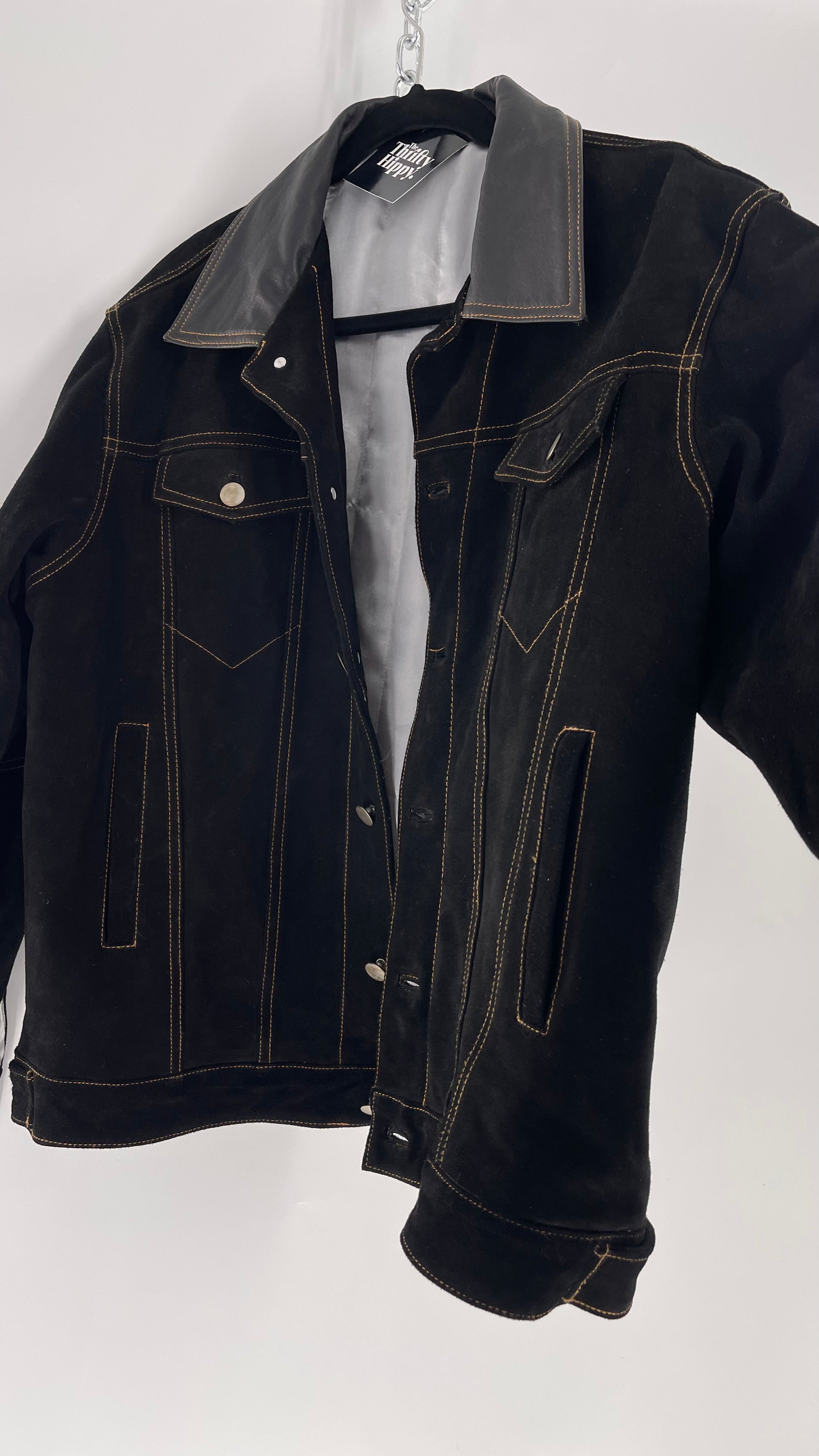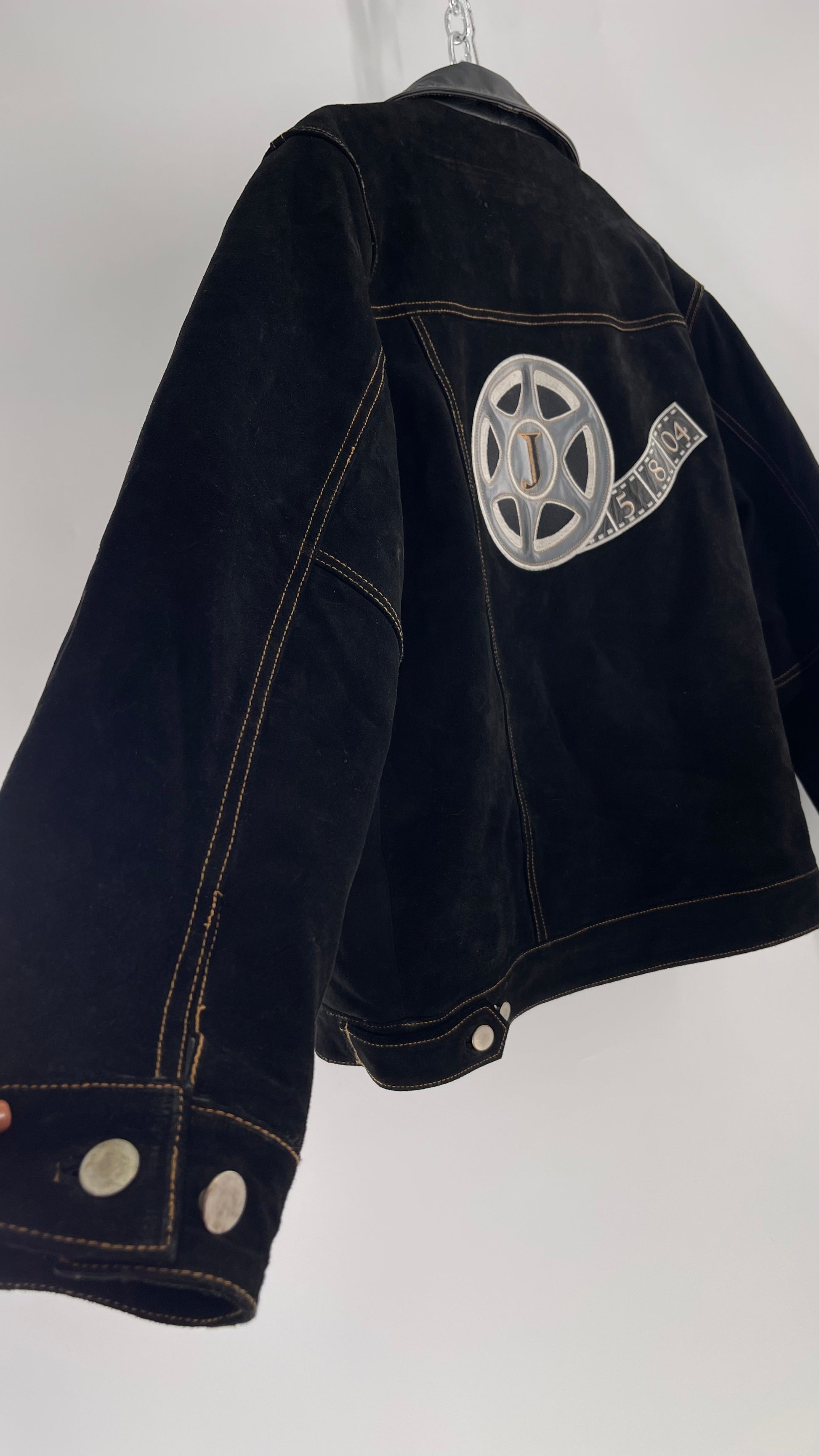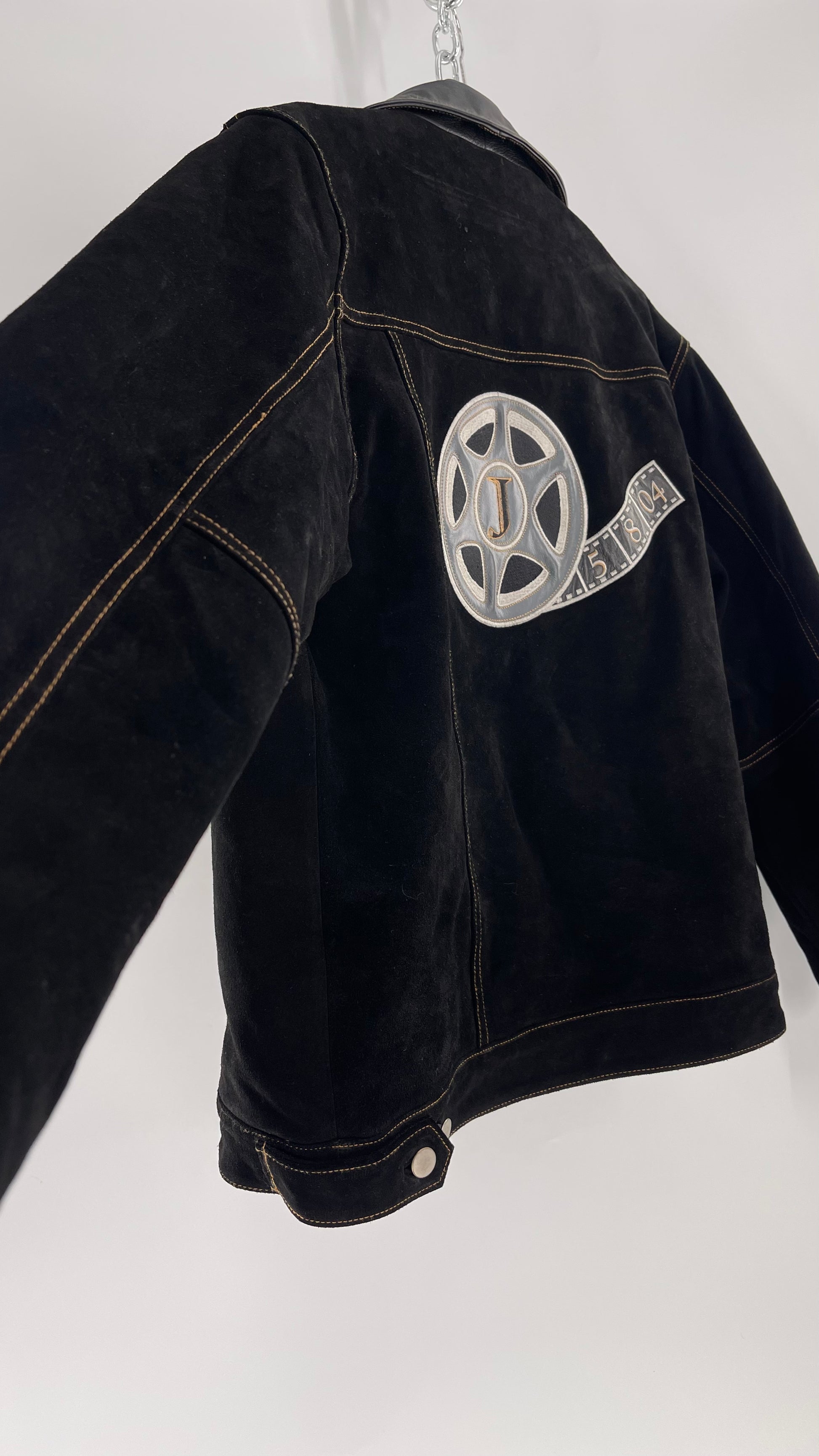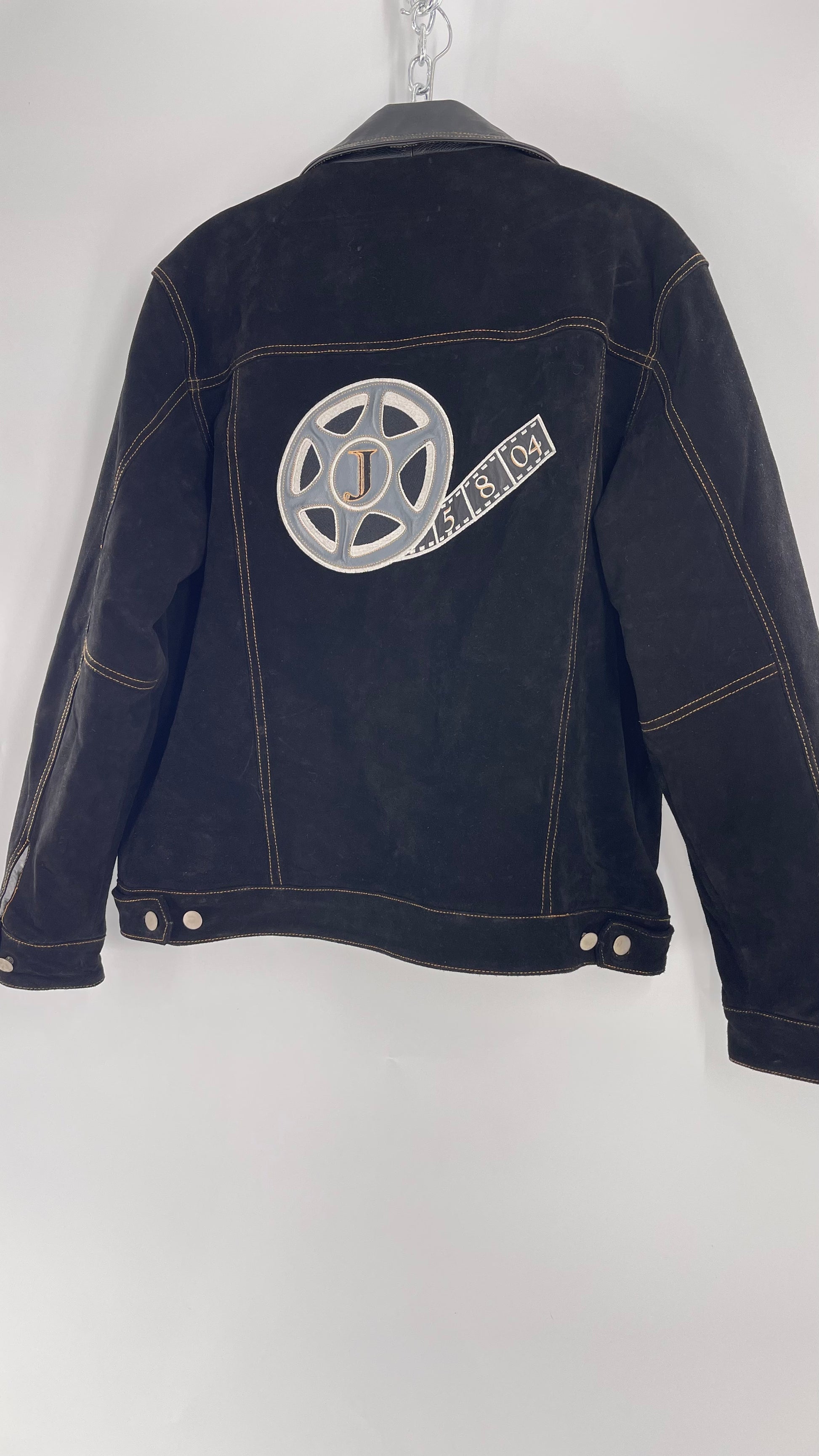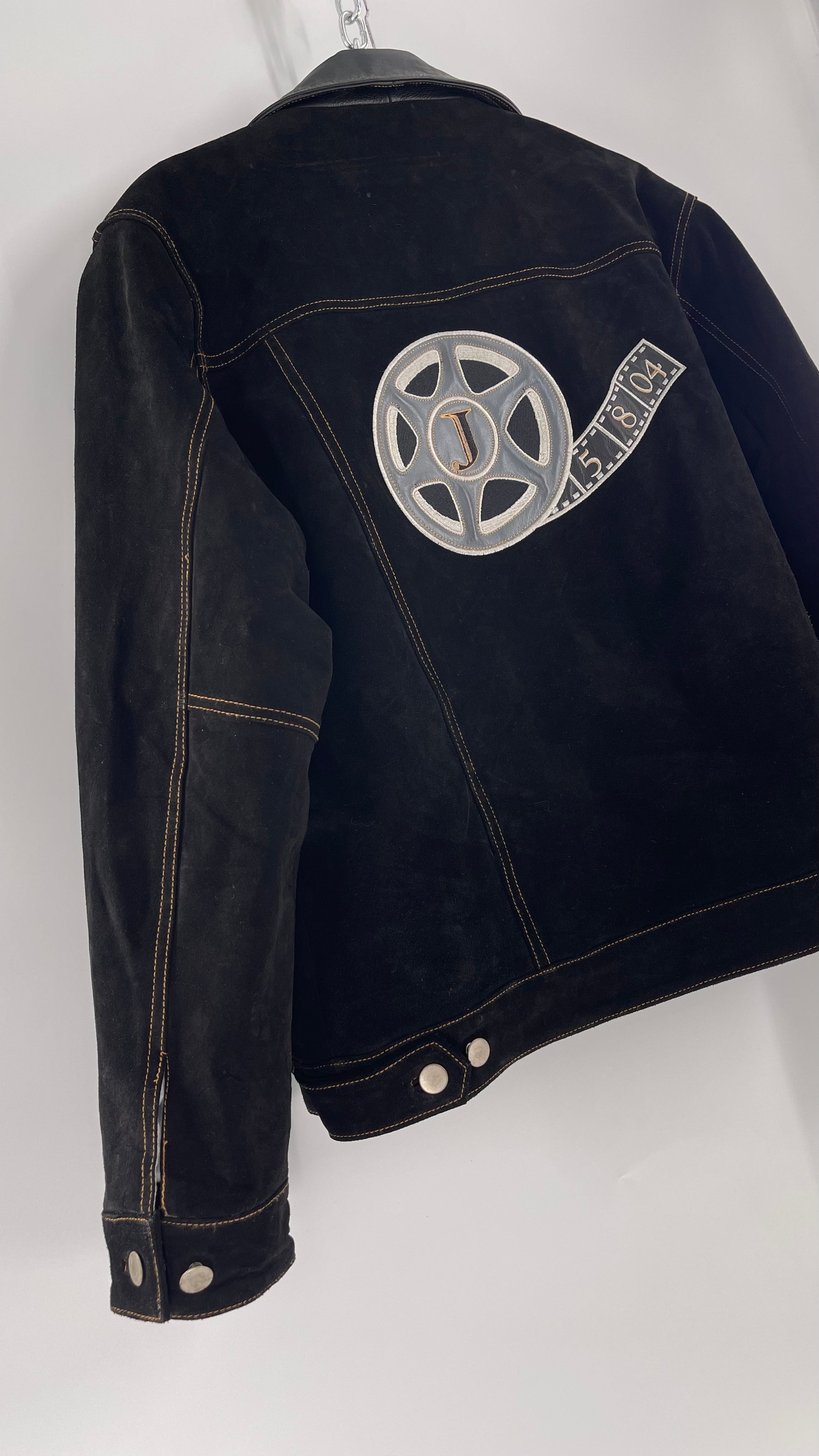 Vintage Extreme Black Suede Heavy Duty Jacket with leather collar, contrast yellow stitching, and cinematic embroidered back patch (Medium)