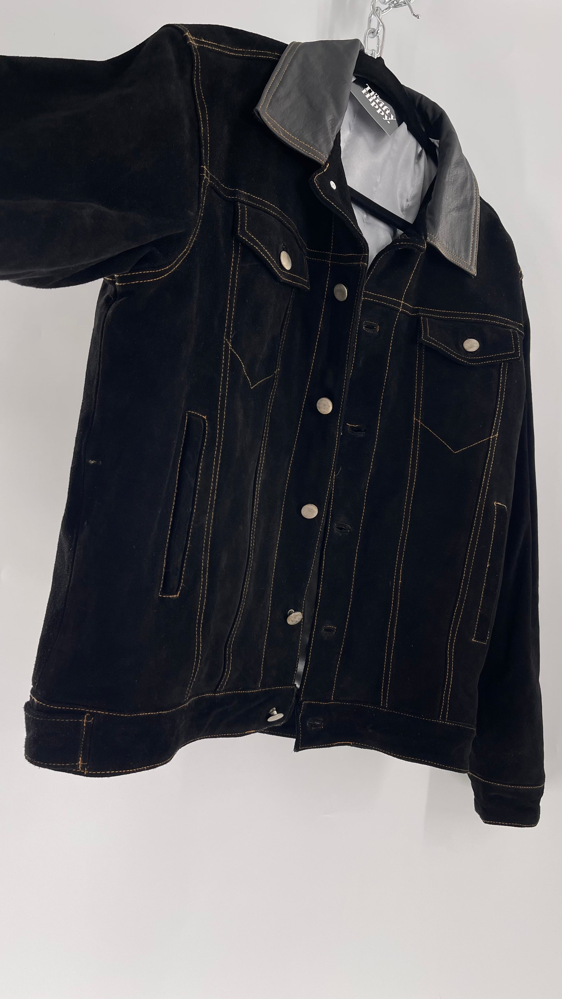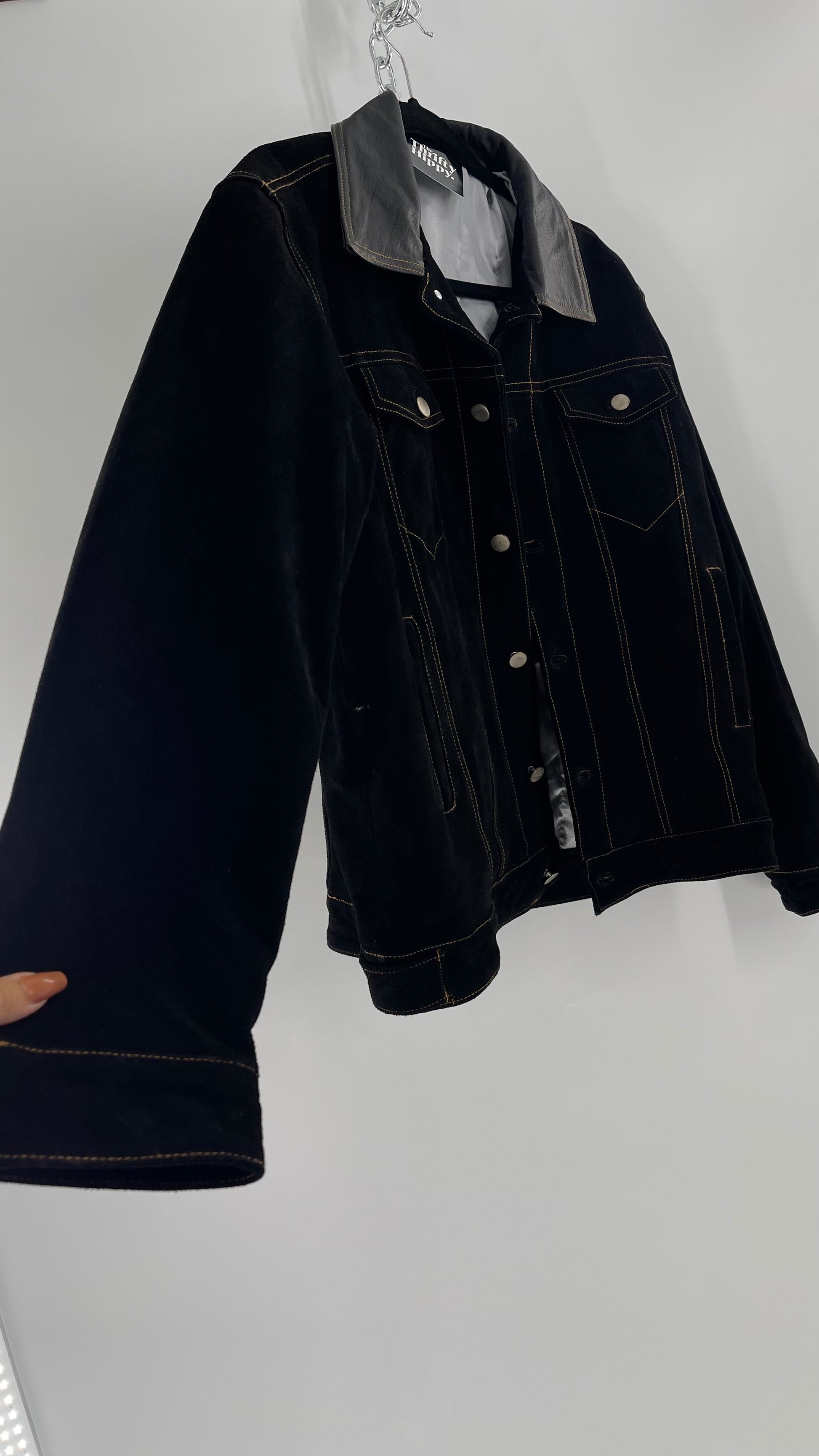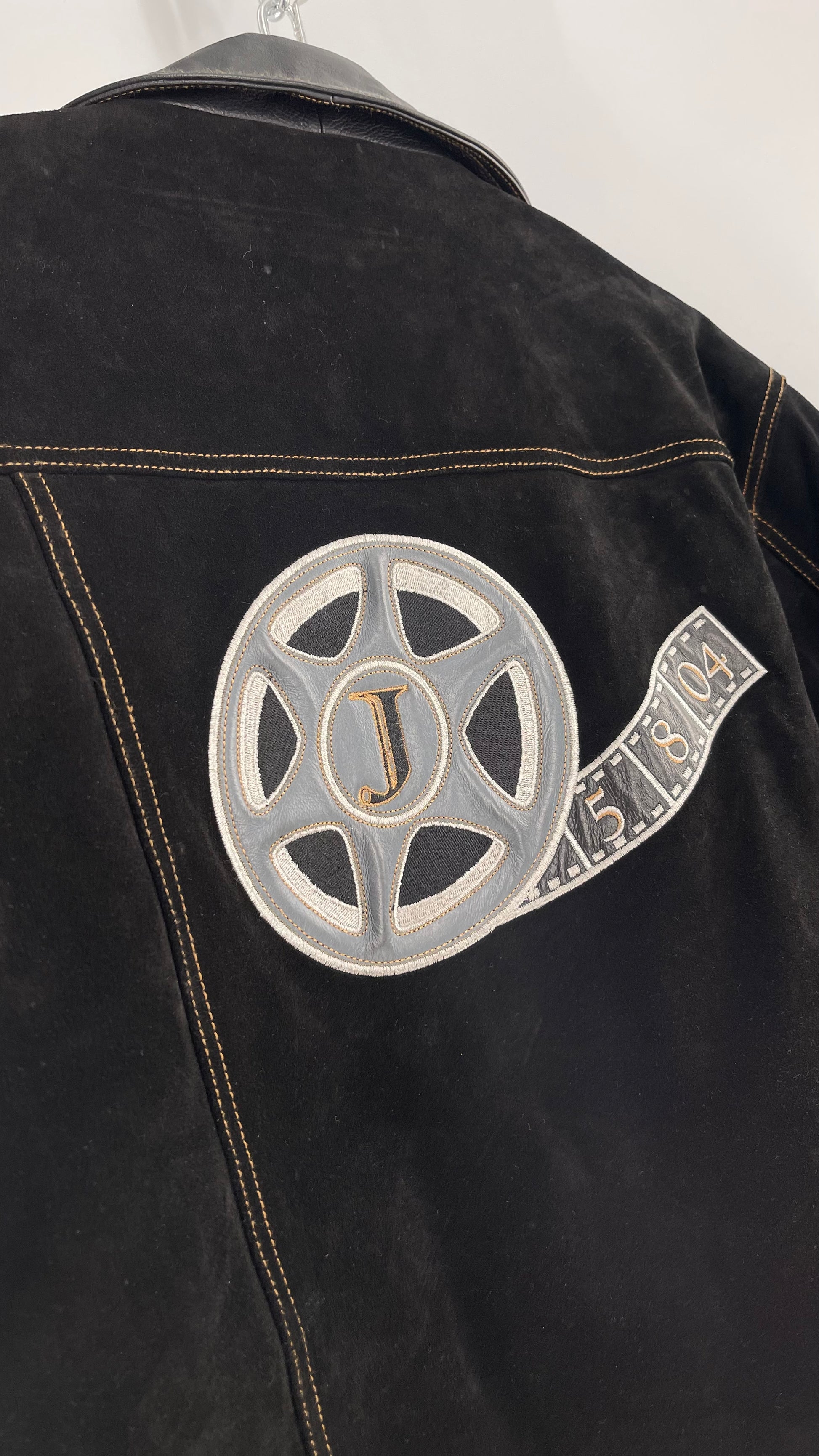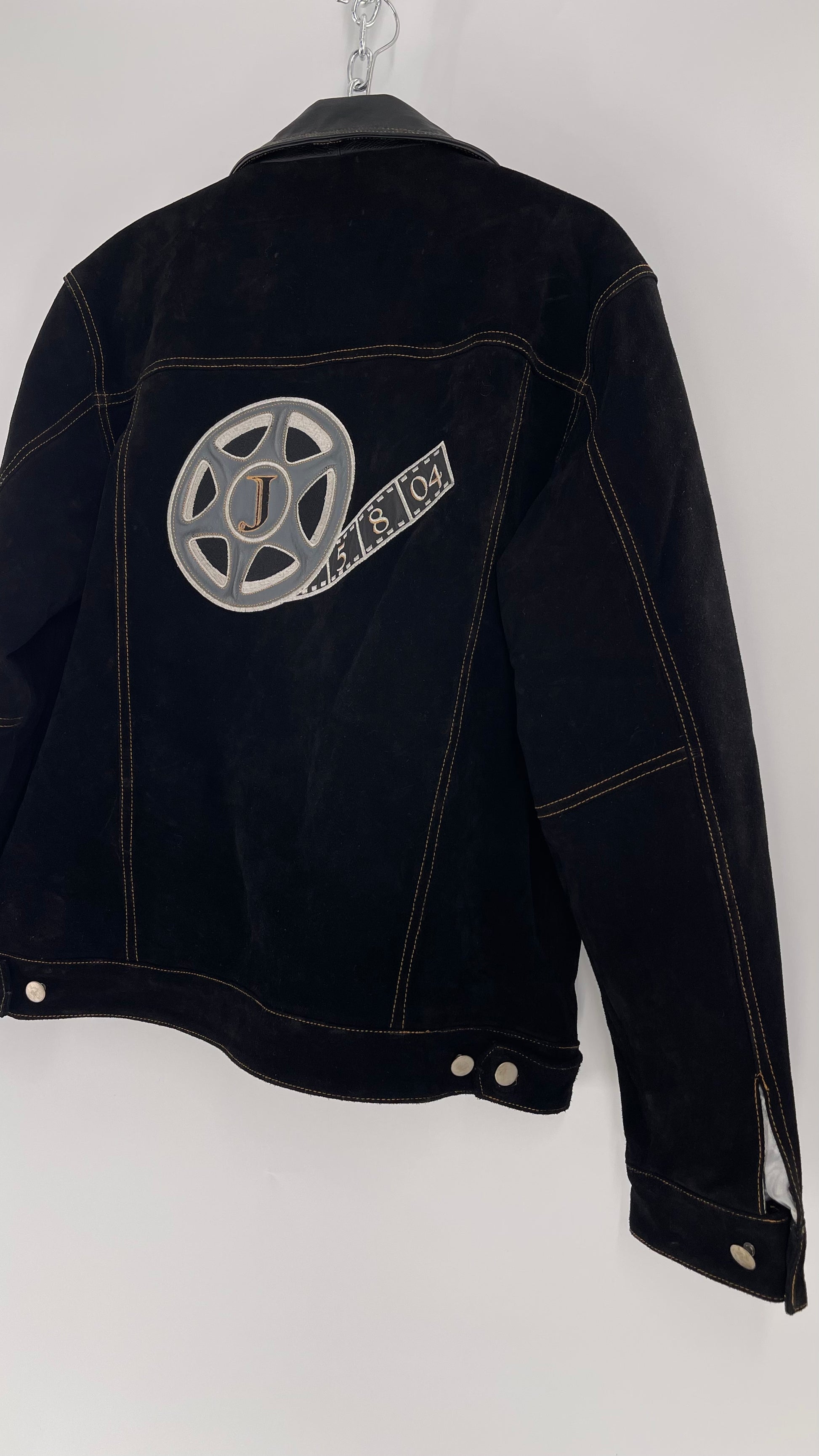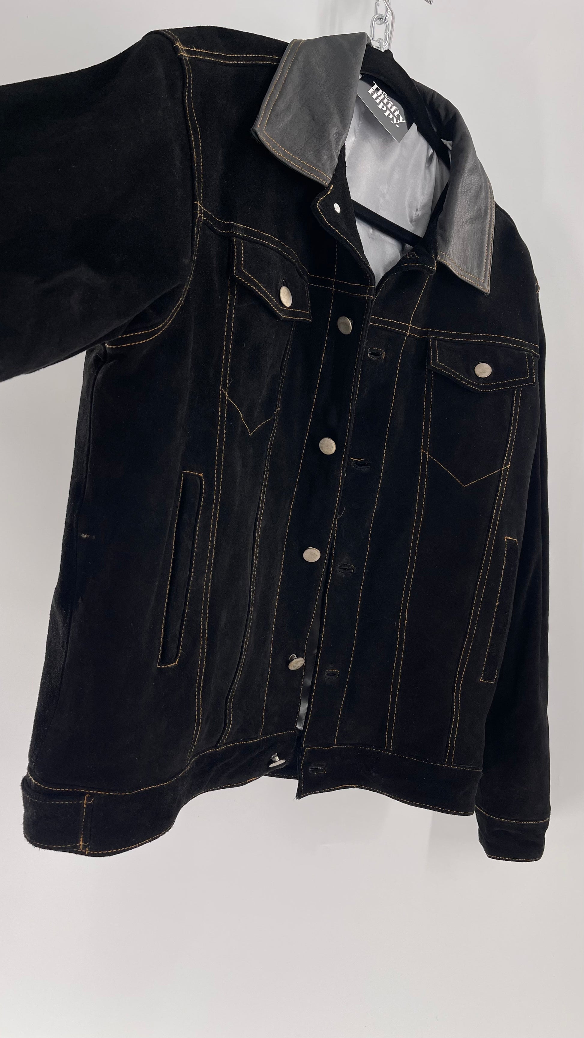 Vintage Extreme Black Suede Heavy Duty Jacket with leather collar, contrast yellow stitching, and cinematic embroidered back patch (Medium)