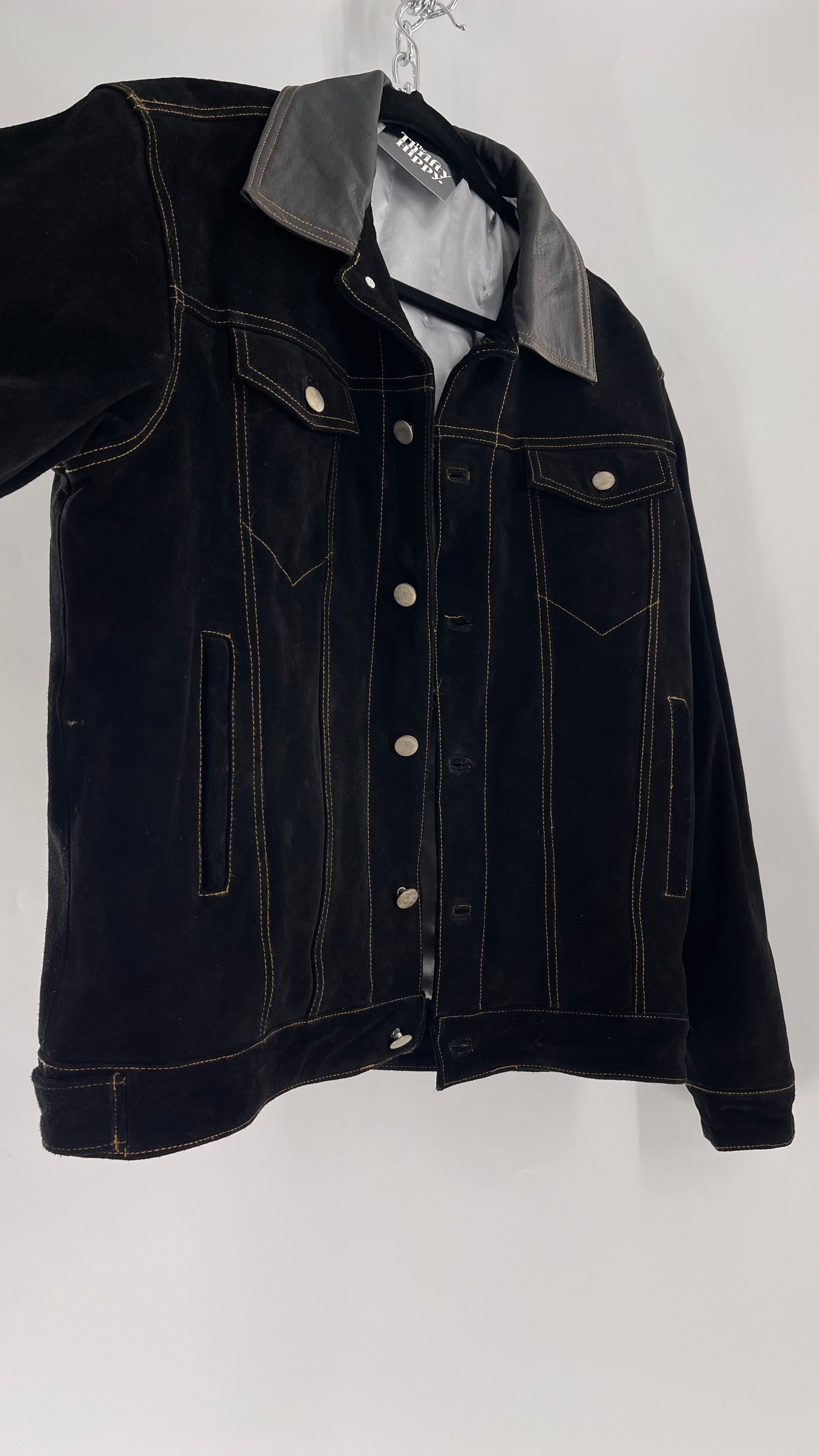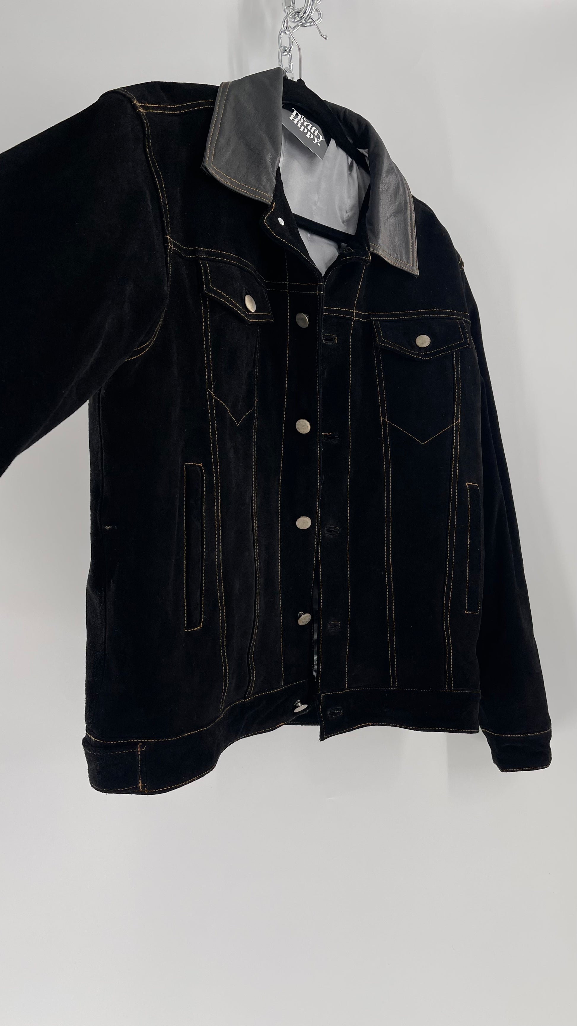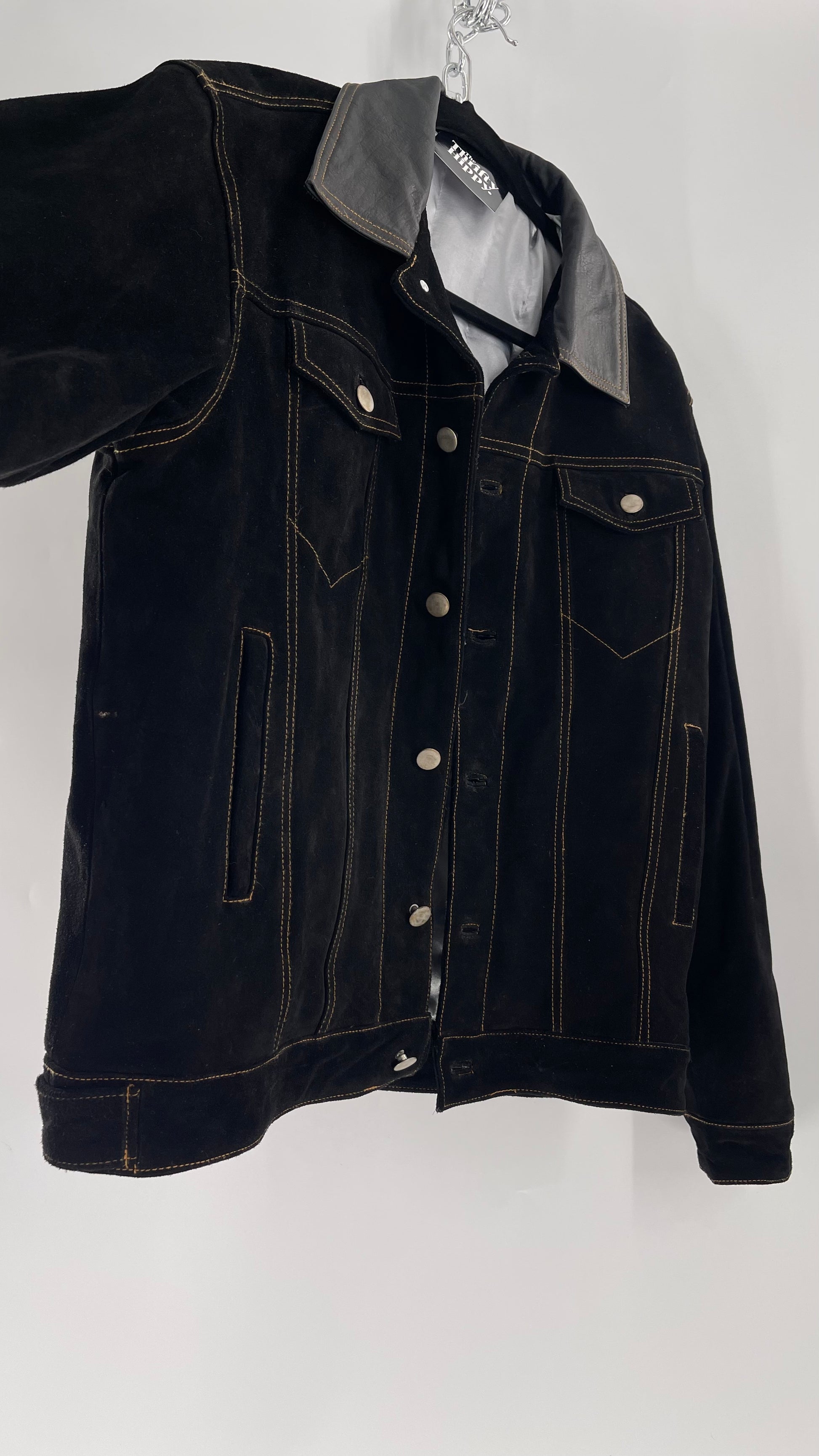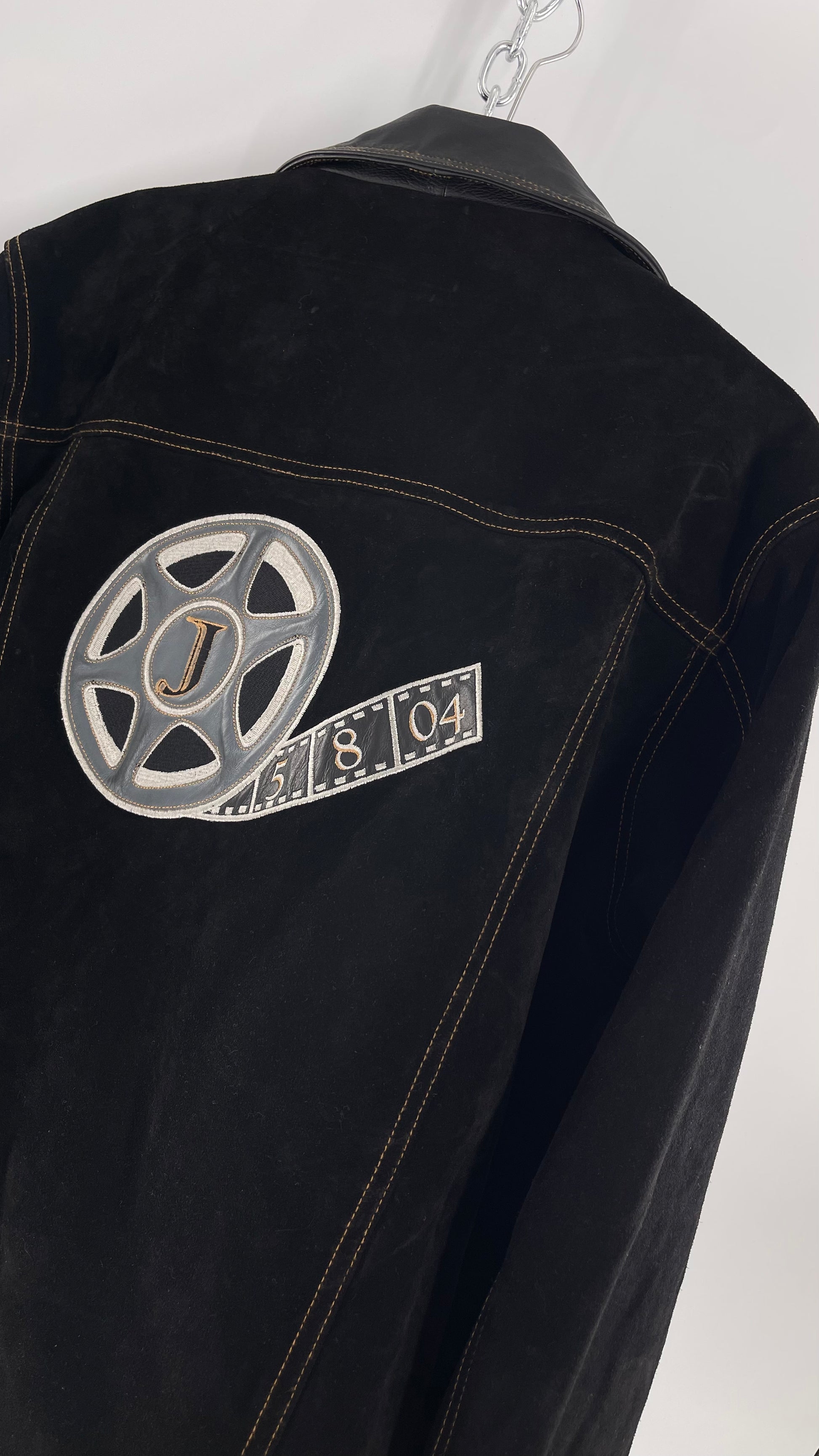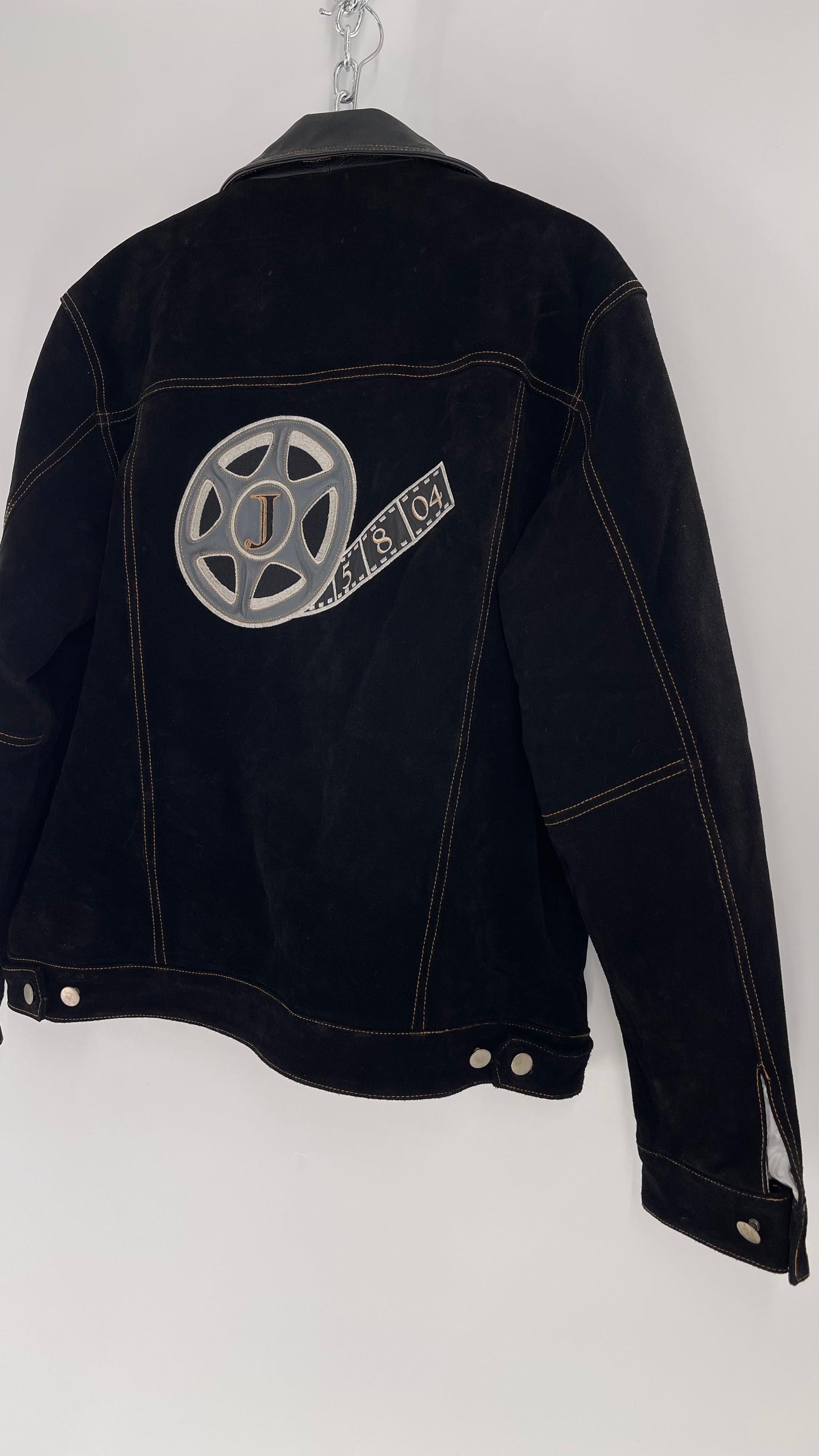 Vintage Extreme Black Suede Heavy Duty Jacket with leather collar, contrast yellow stitching, and cinematic embroidered back patch (Medium)