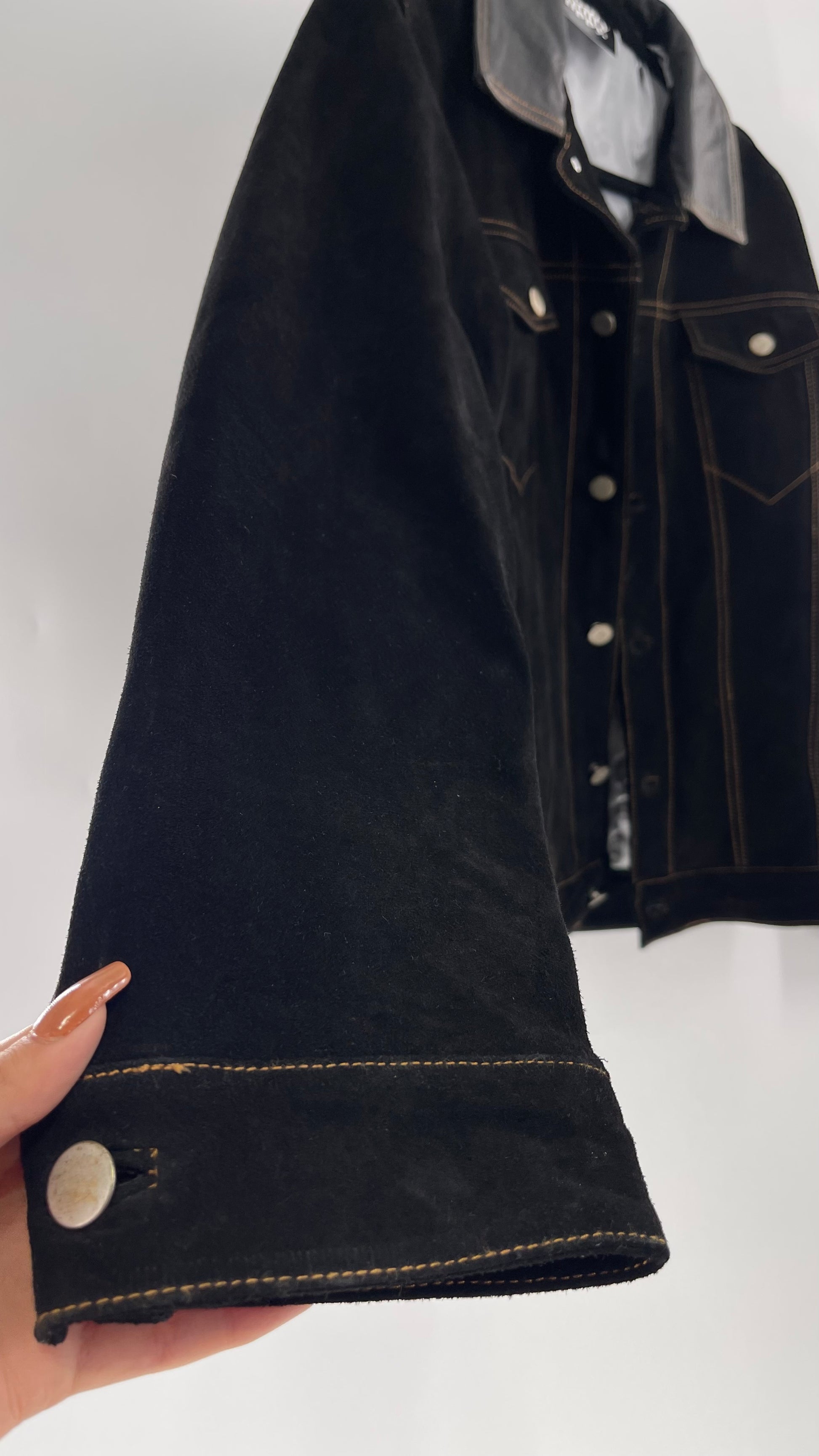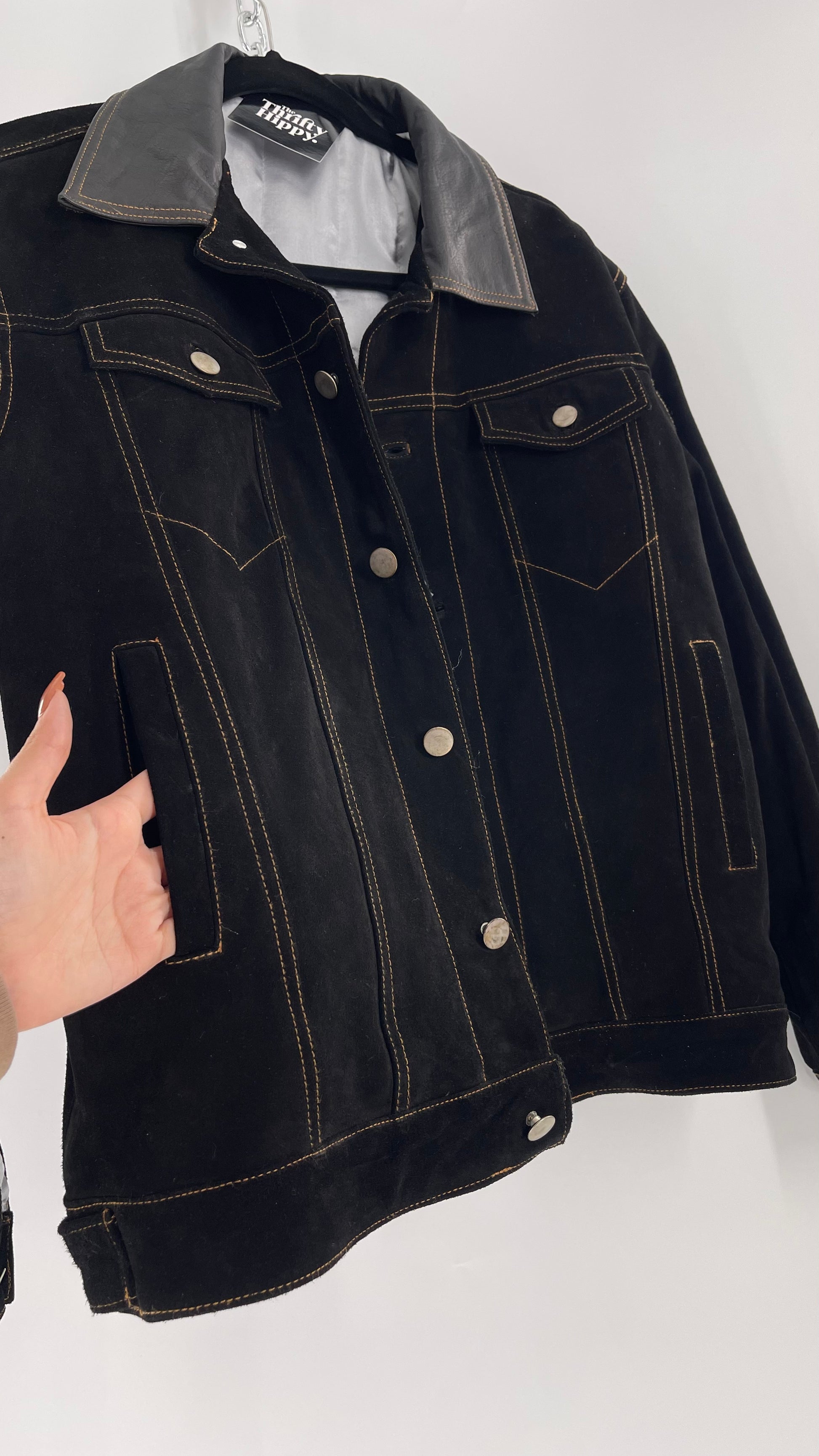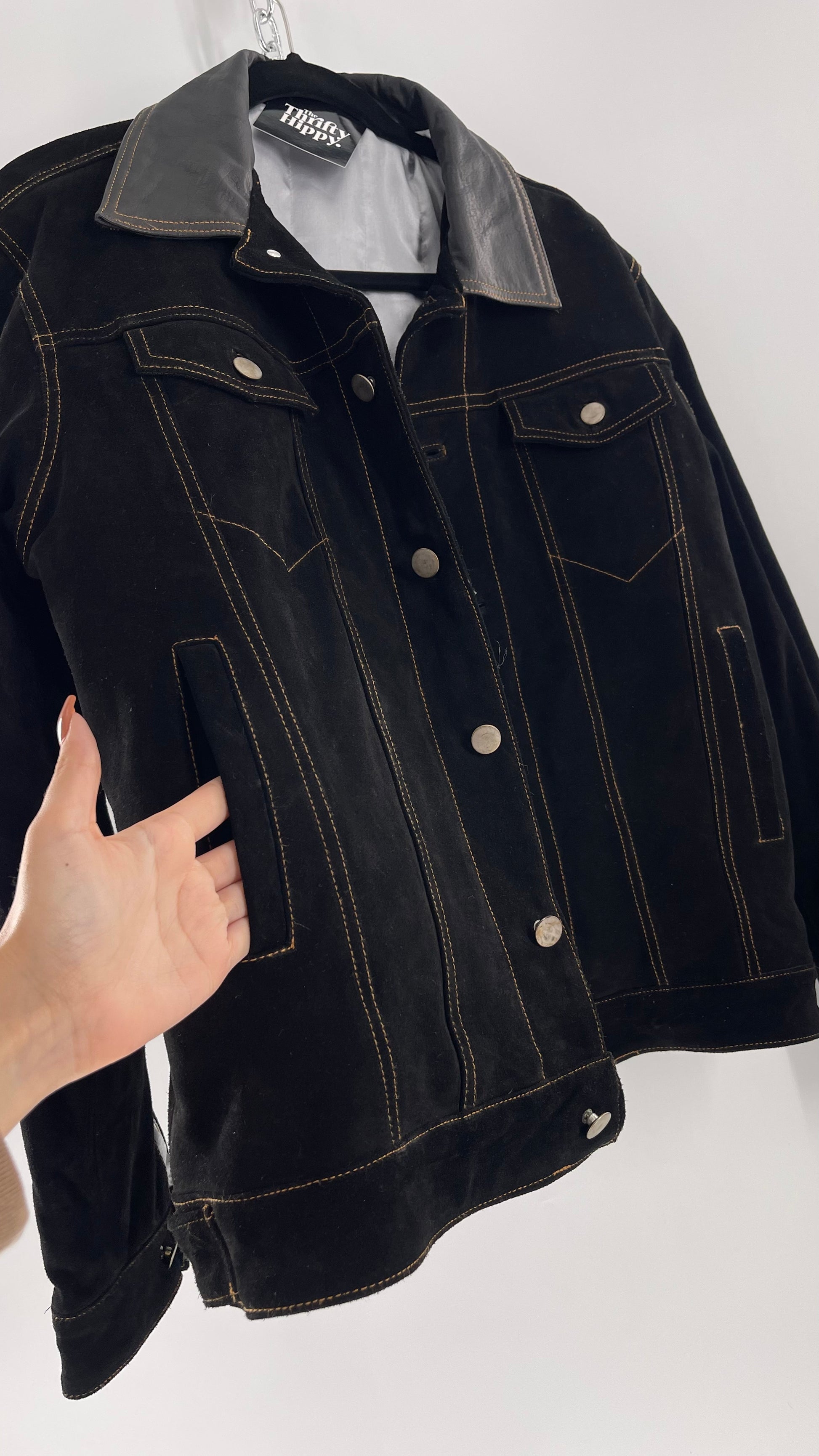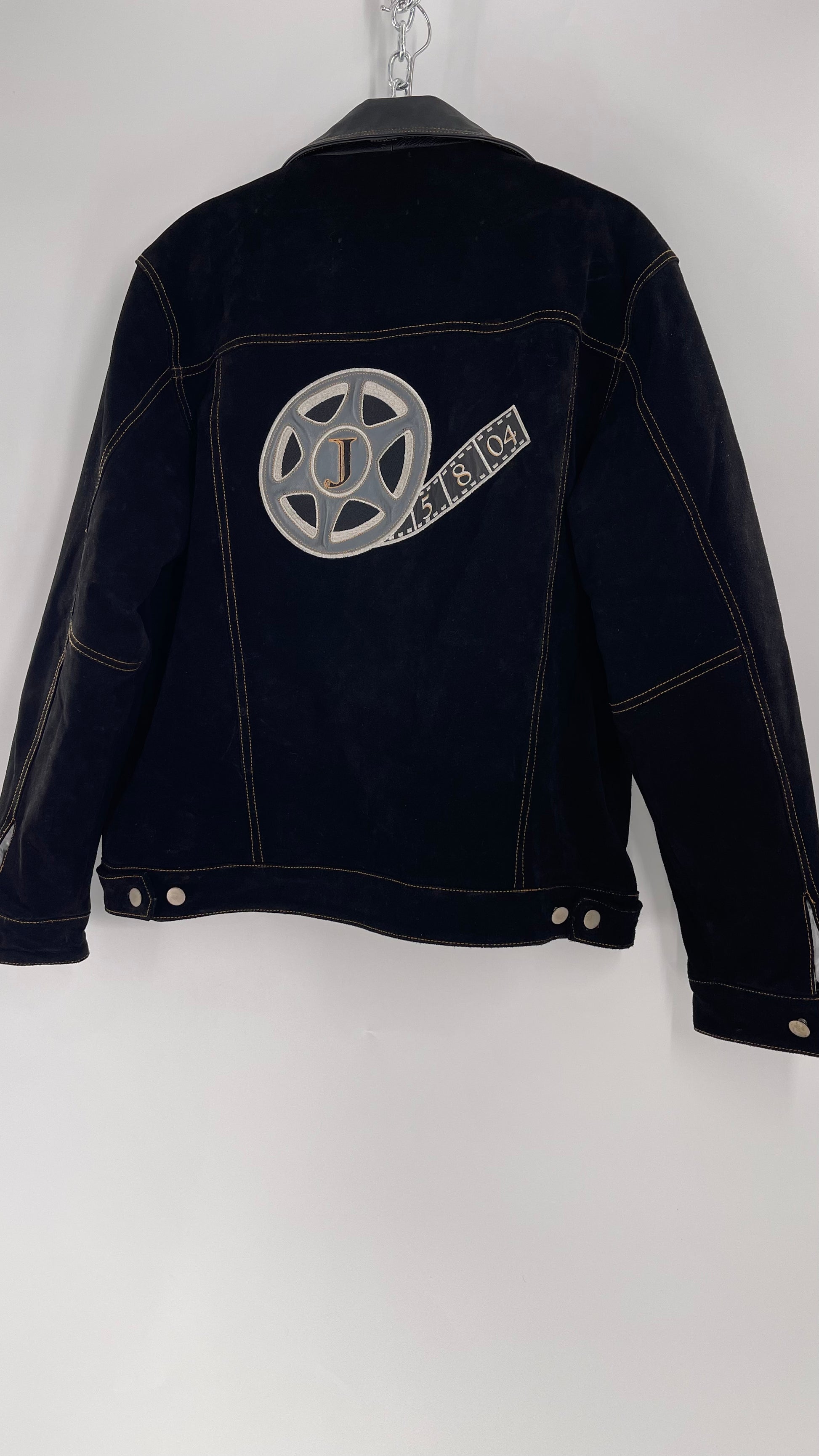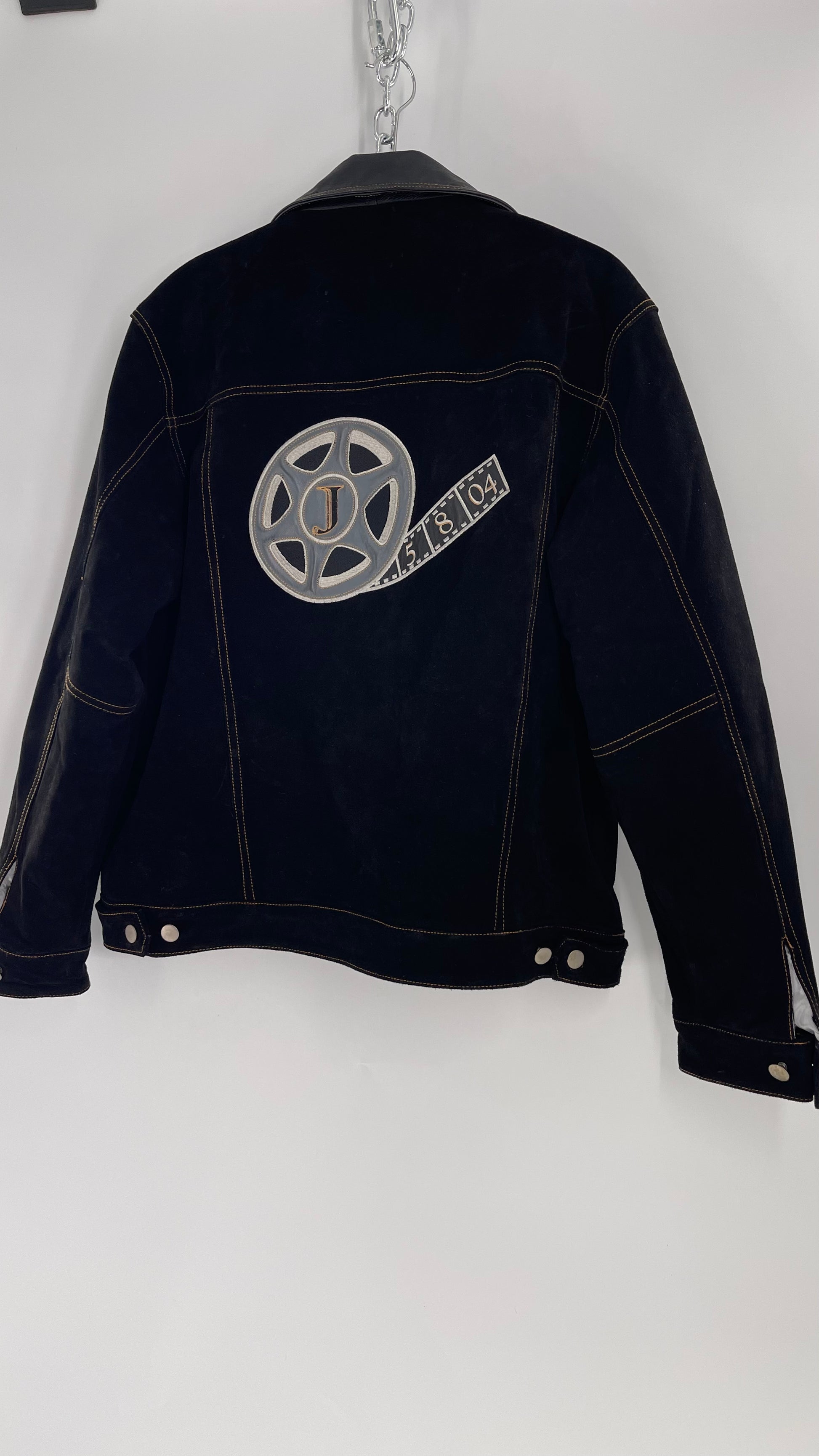 Vintage Extreme Black Suede Heavy Duty Jacket with leather collar, contrast yellow stitching, and cinematic embroidered back patch (Medium)