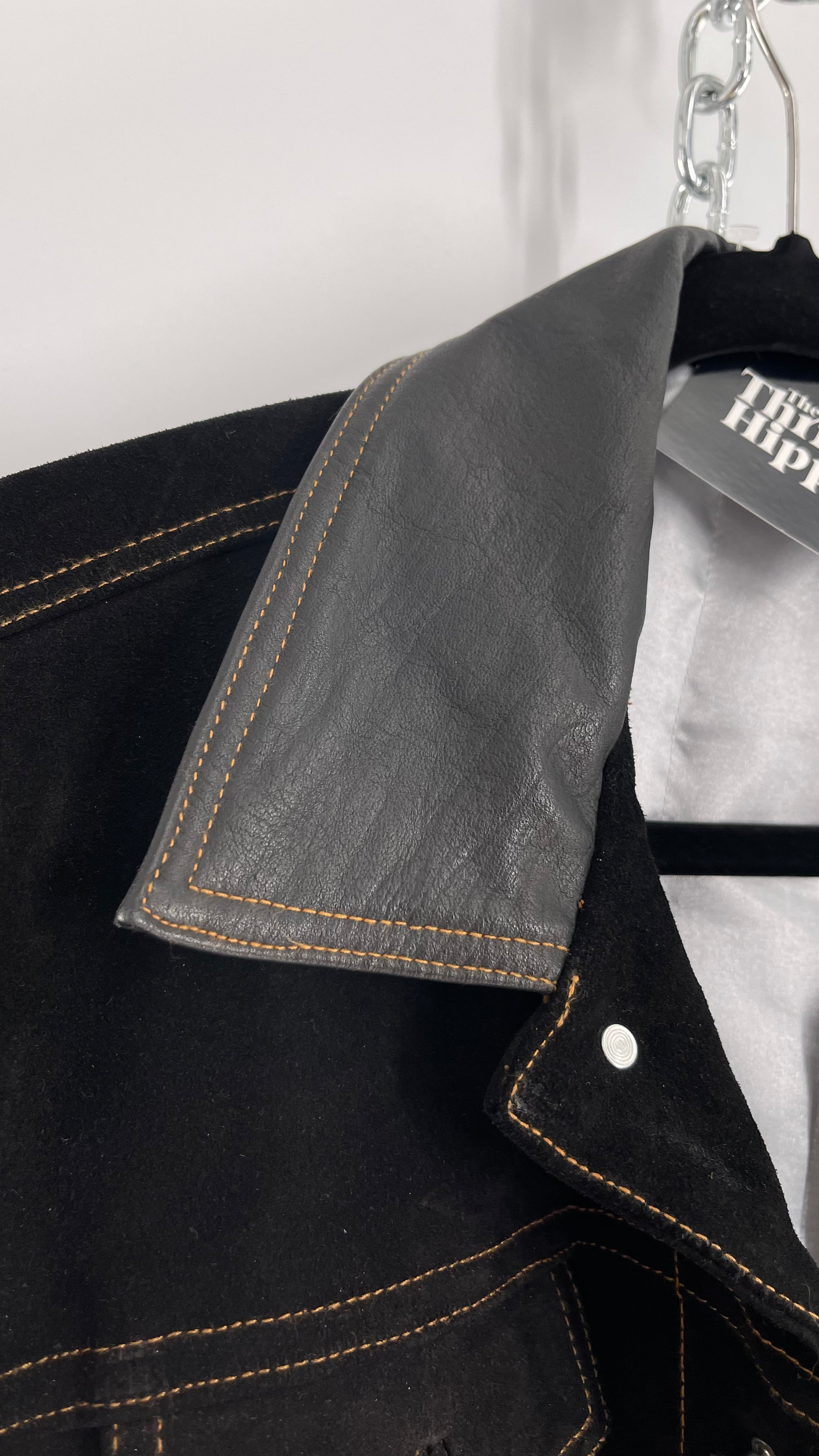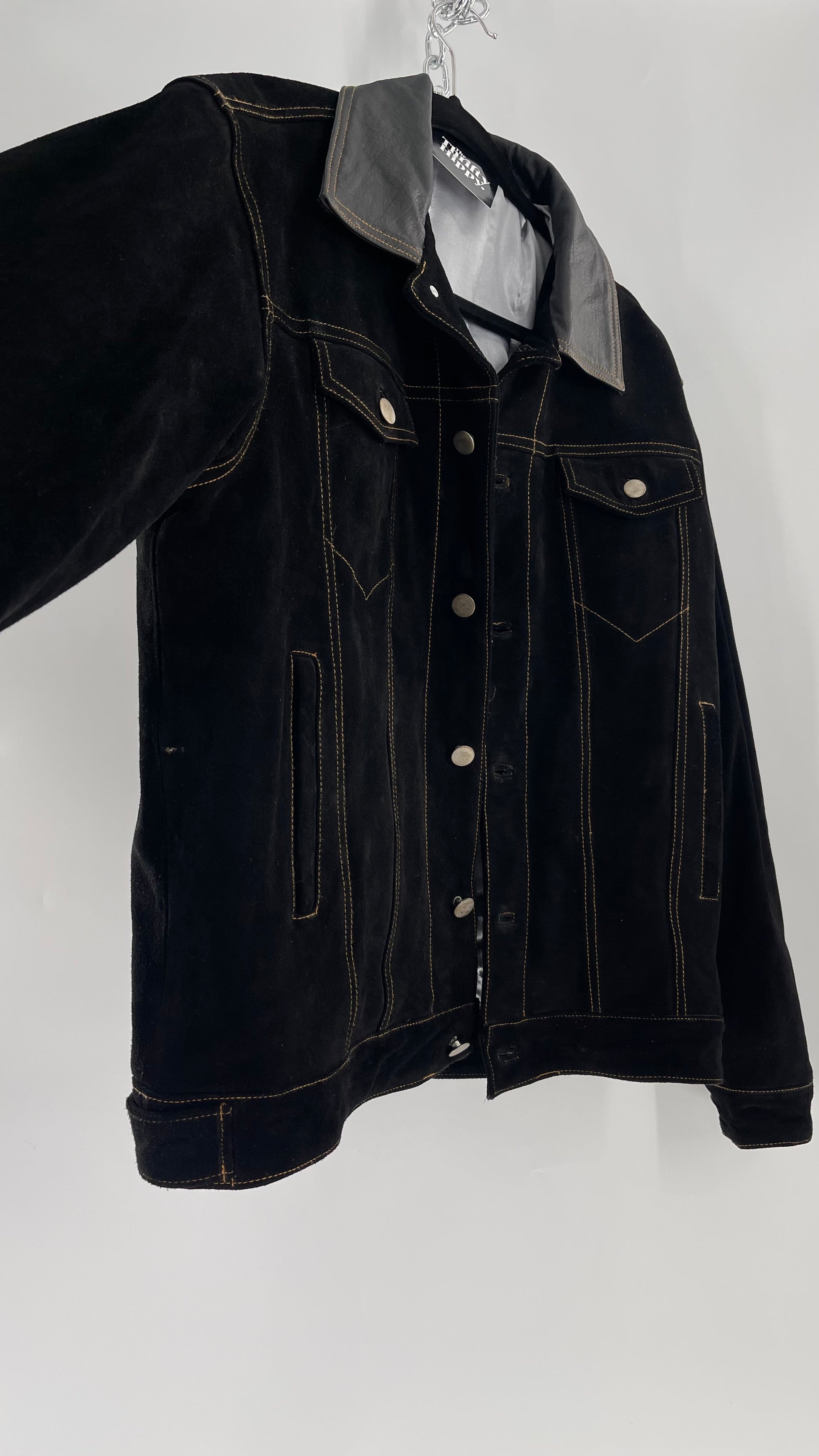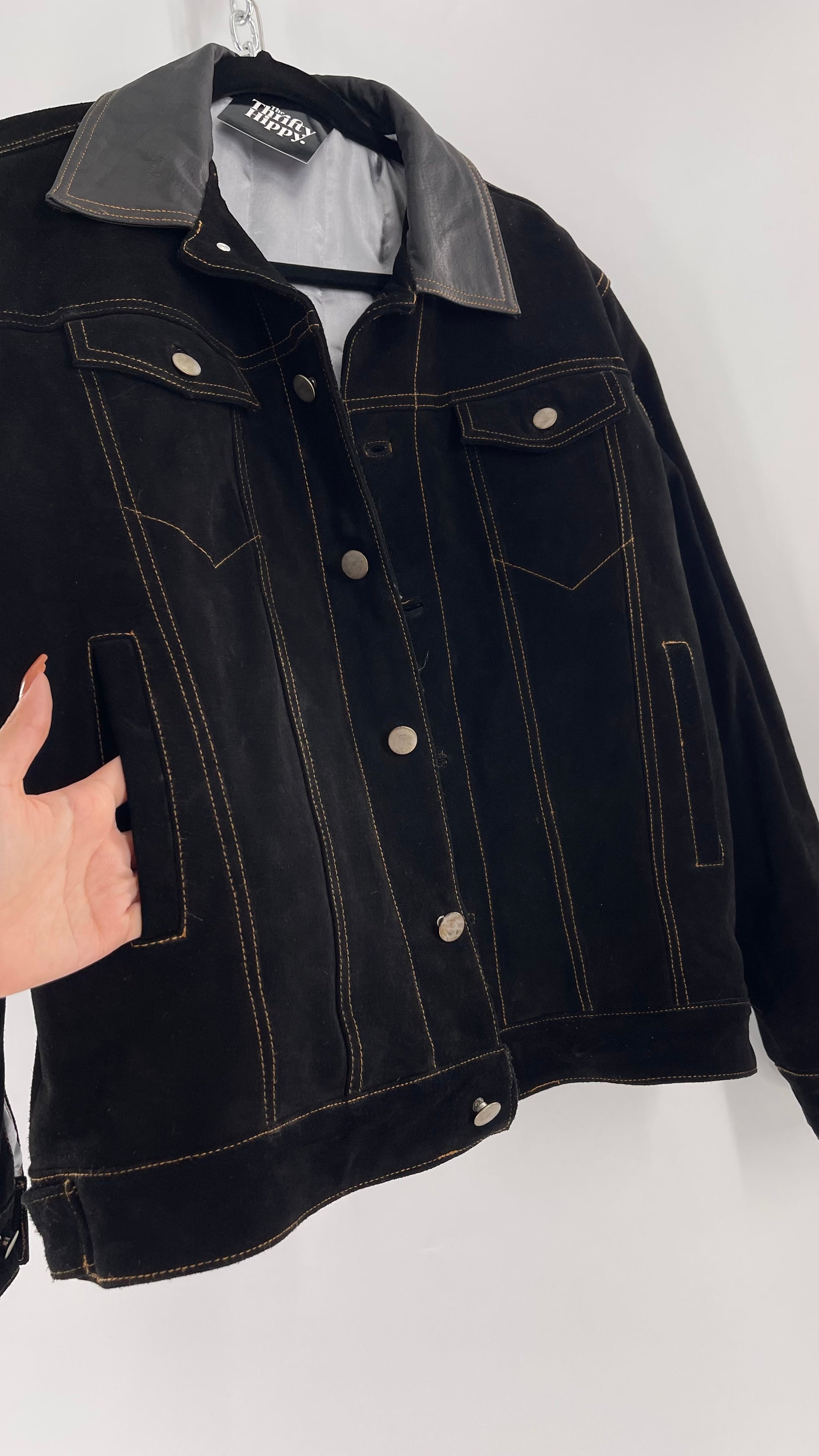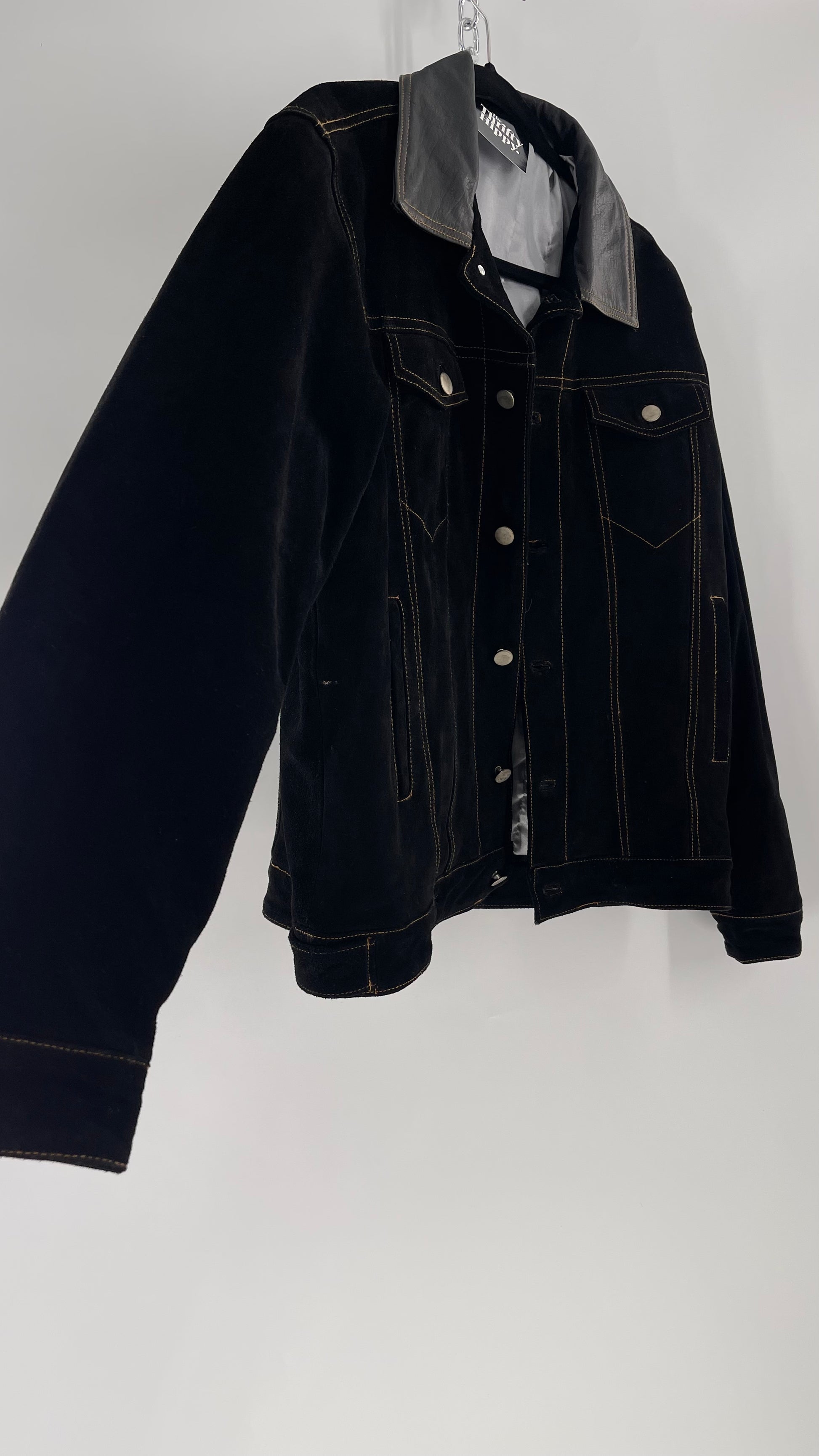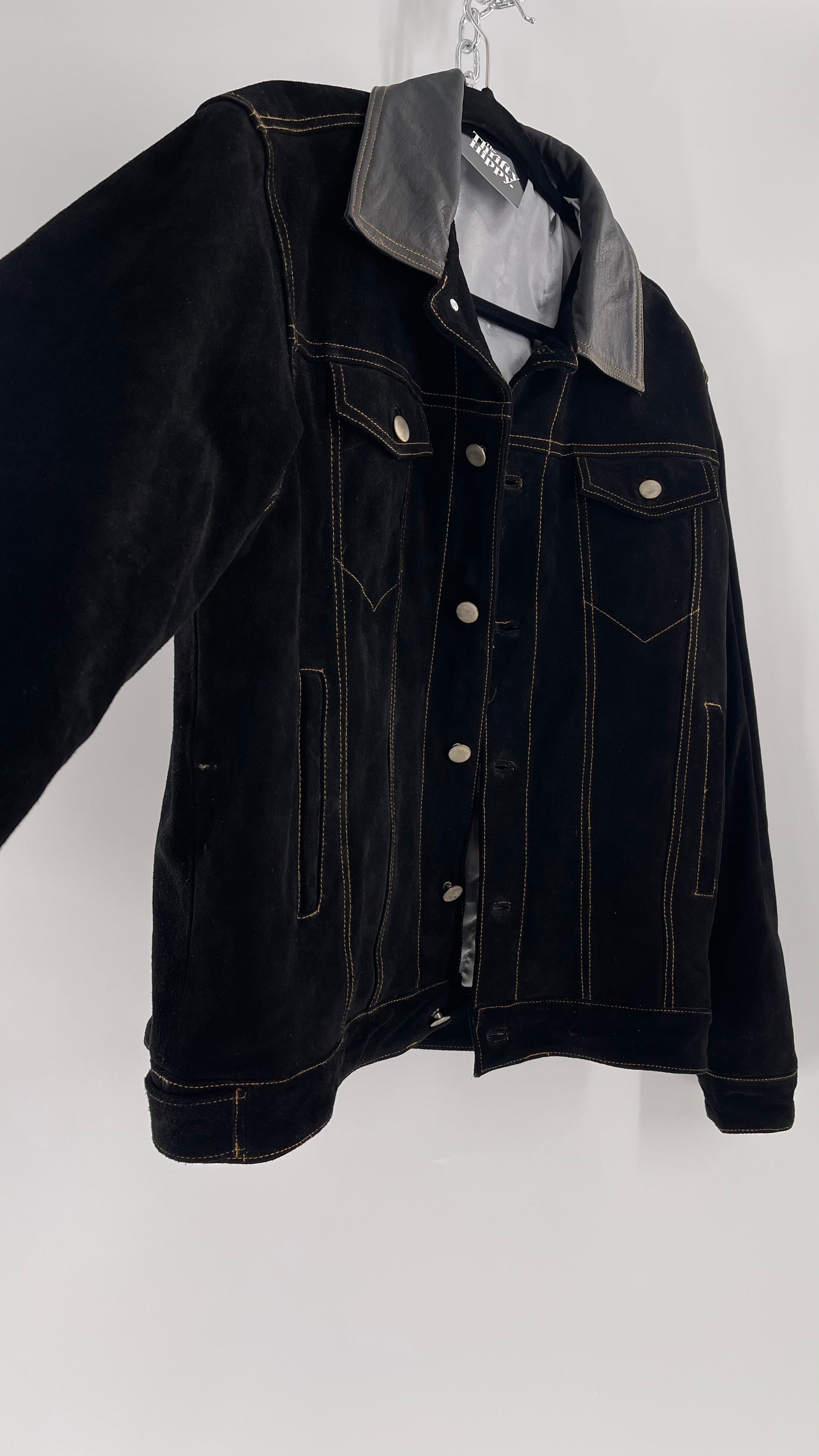 Vintage Extreme Black Suede Heavy Duty Jacket with leather collar, contrast yellow stitching, and cinematic embroidered back patch (Medium)