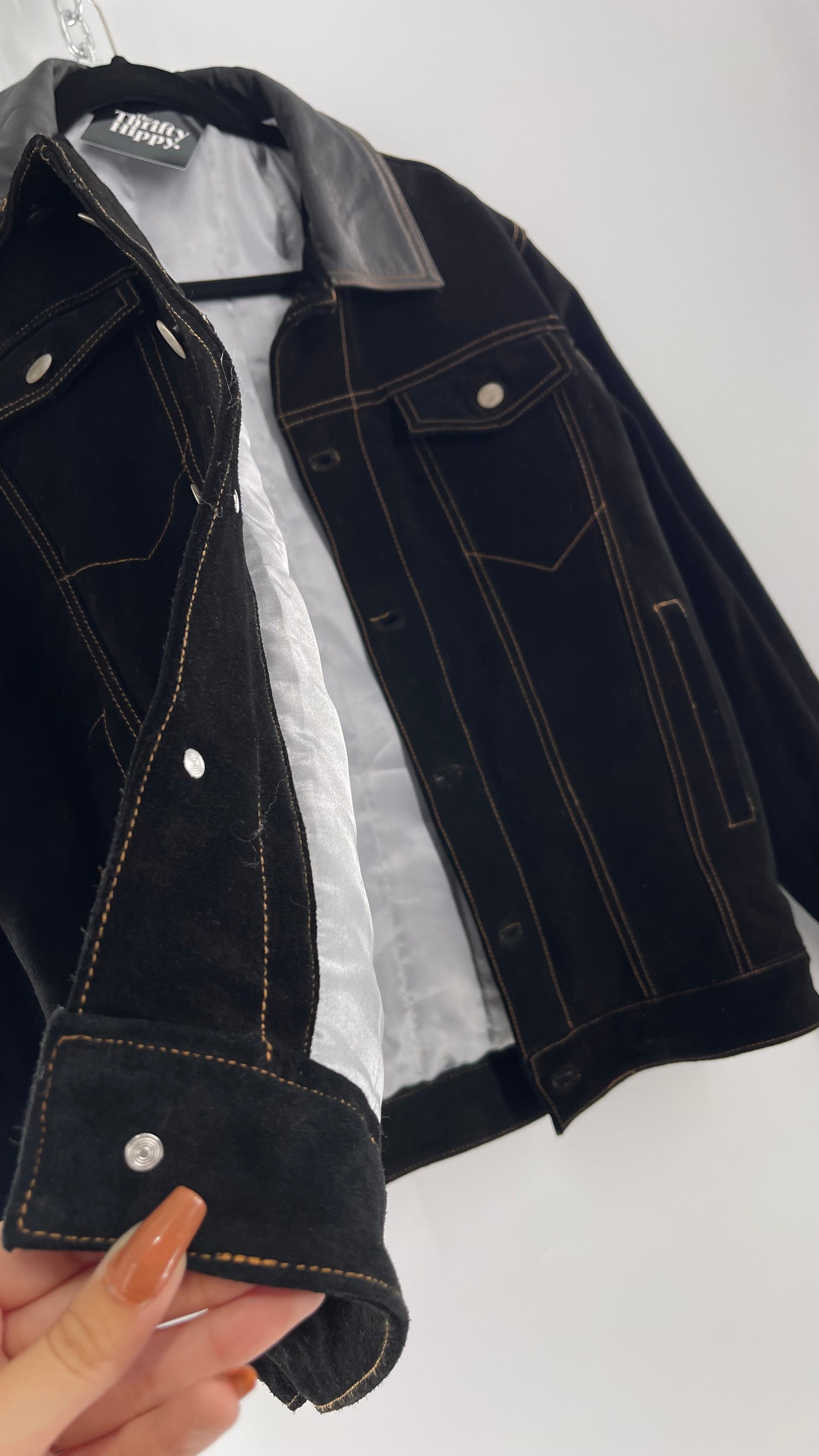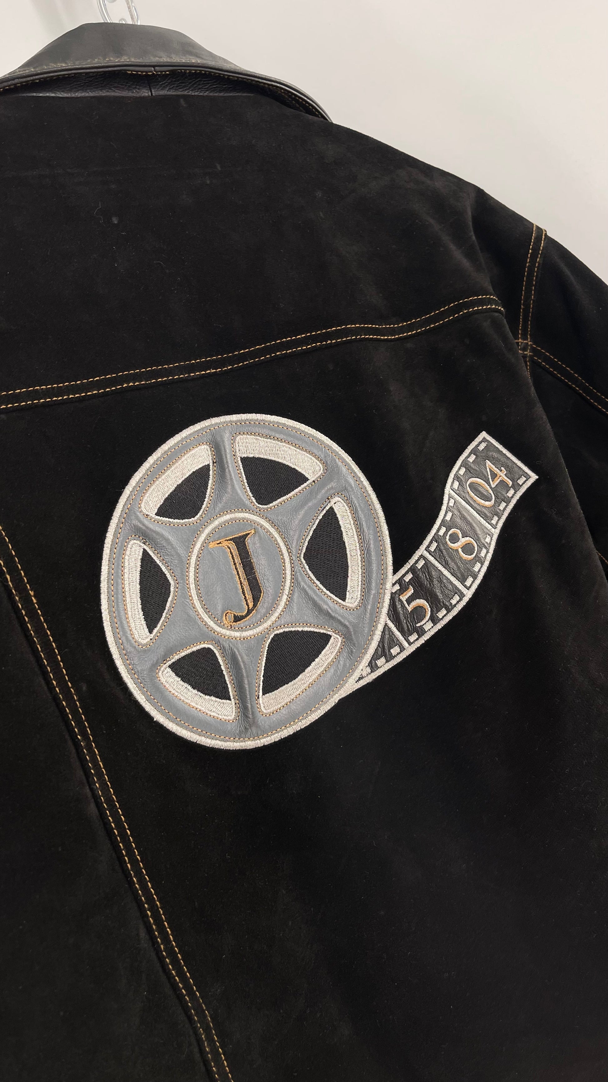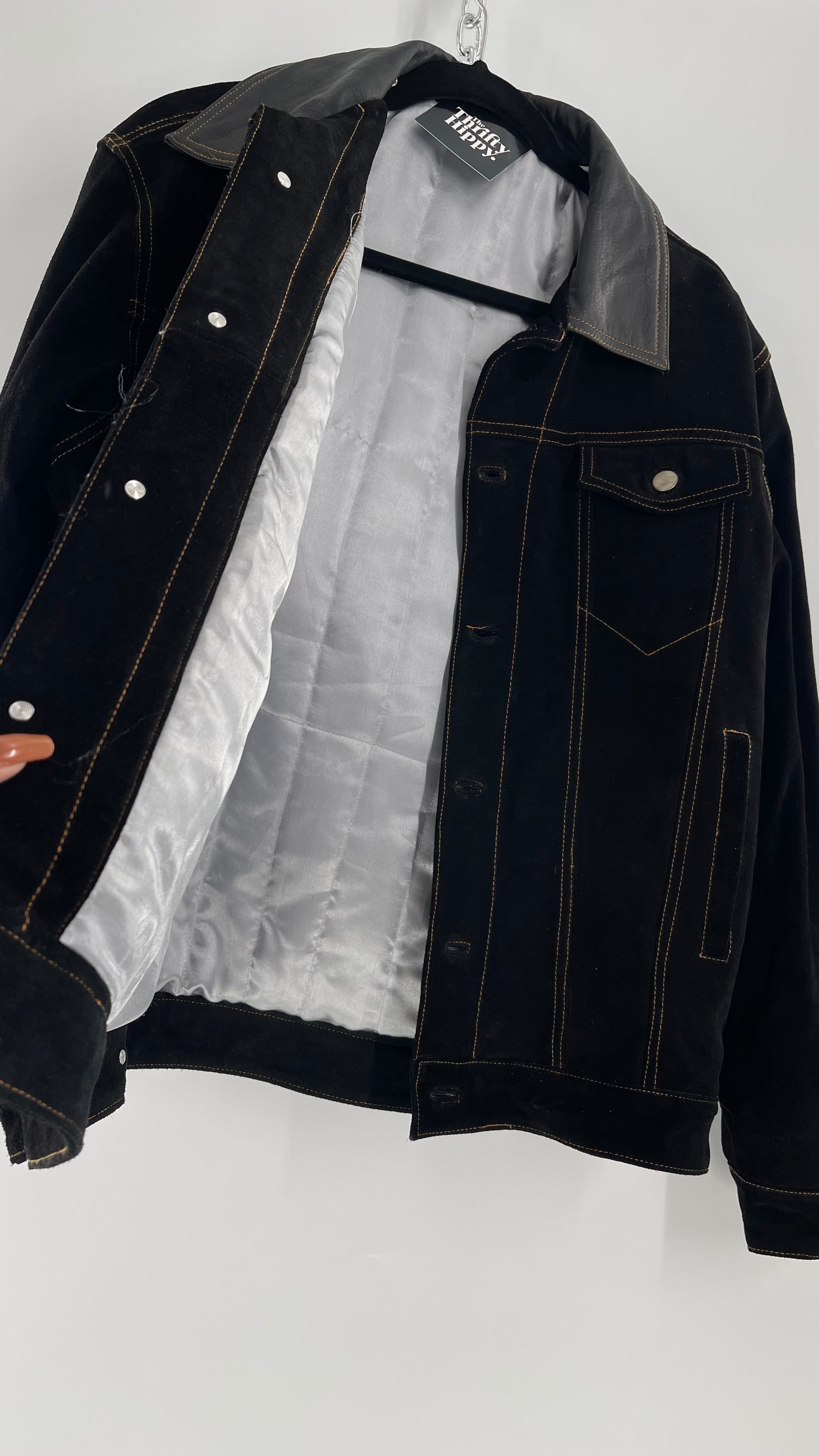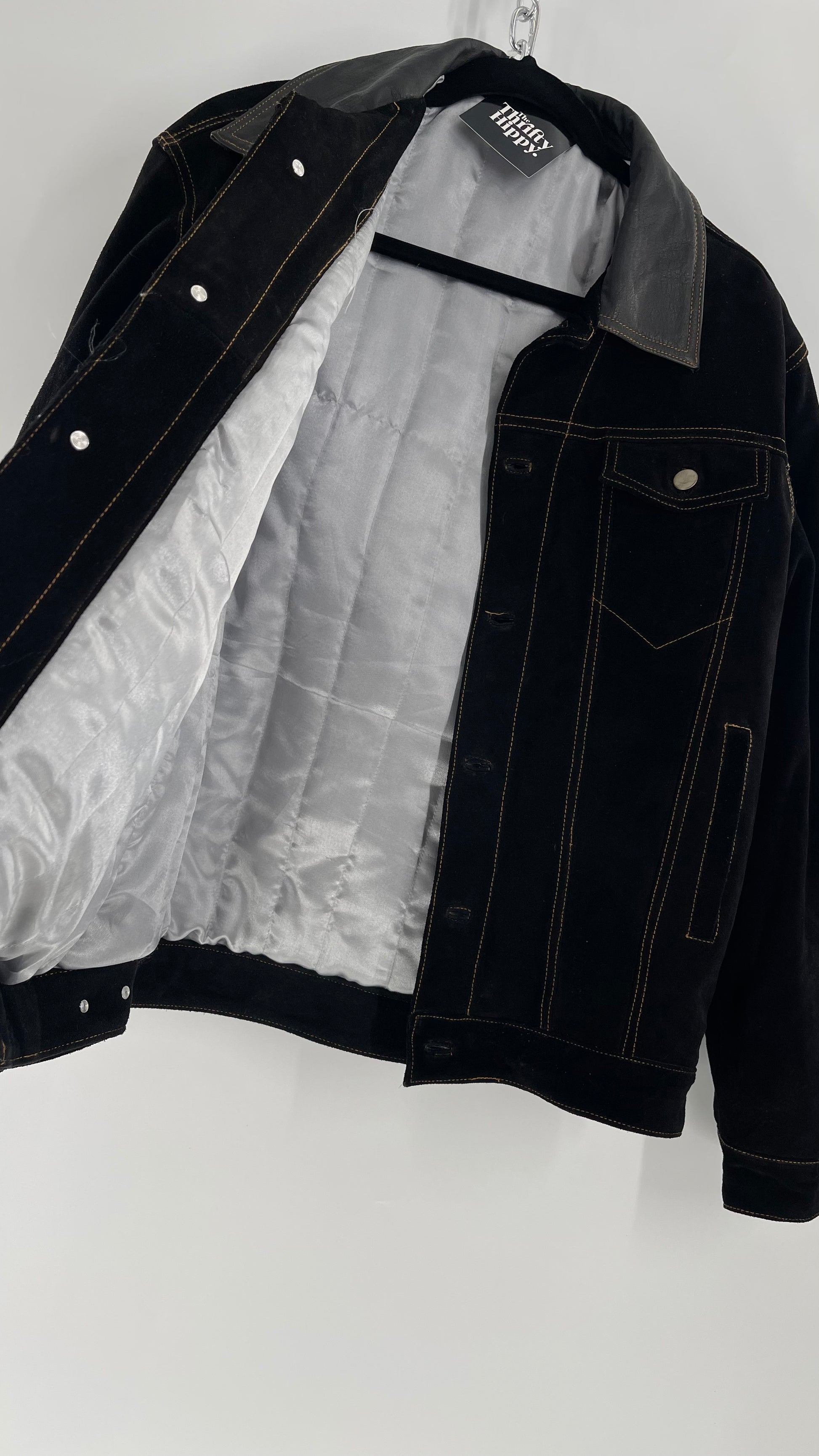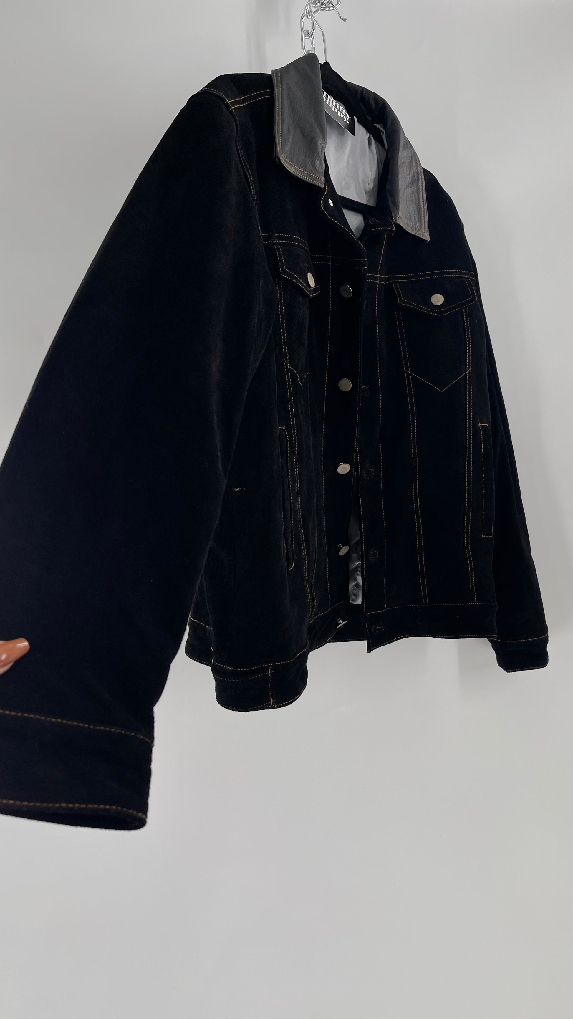 Vintage Extreme Black Suede Heavy Duty Jacket with leather collar, contrast yellow stitching, and cinematic embroidered back patch (Medium)