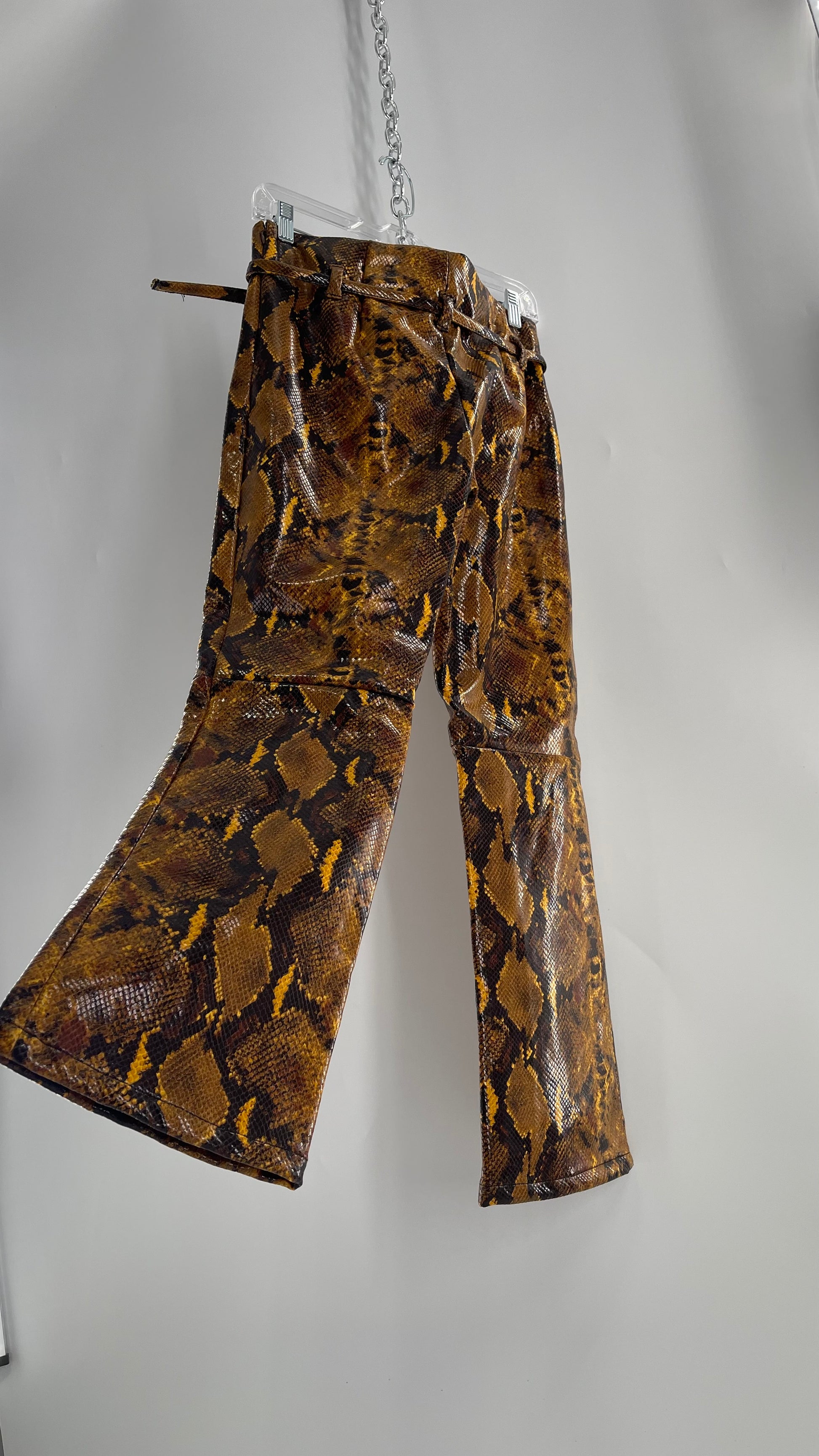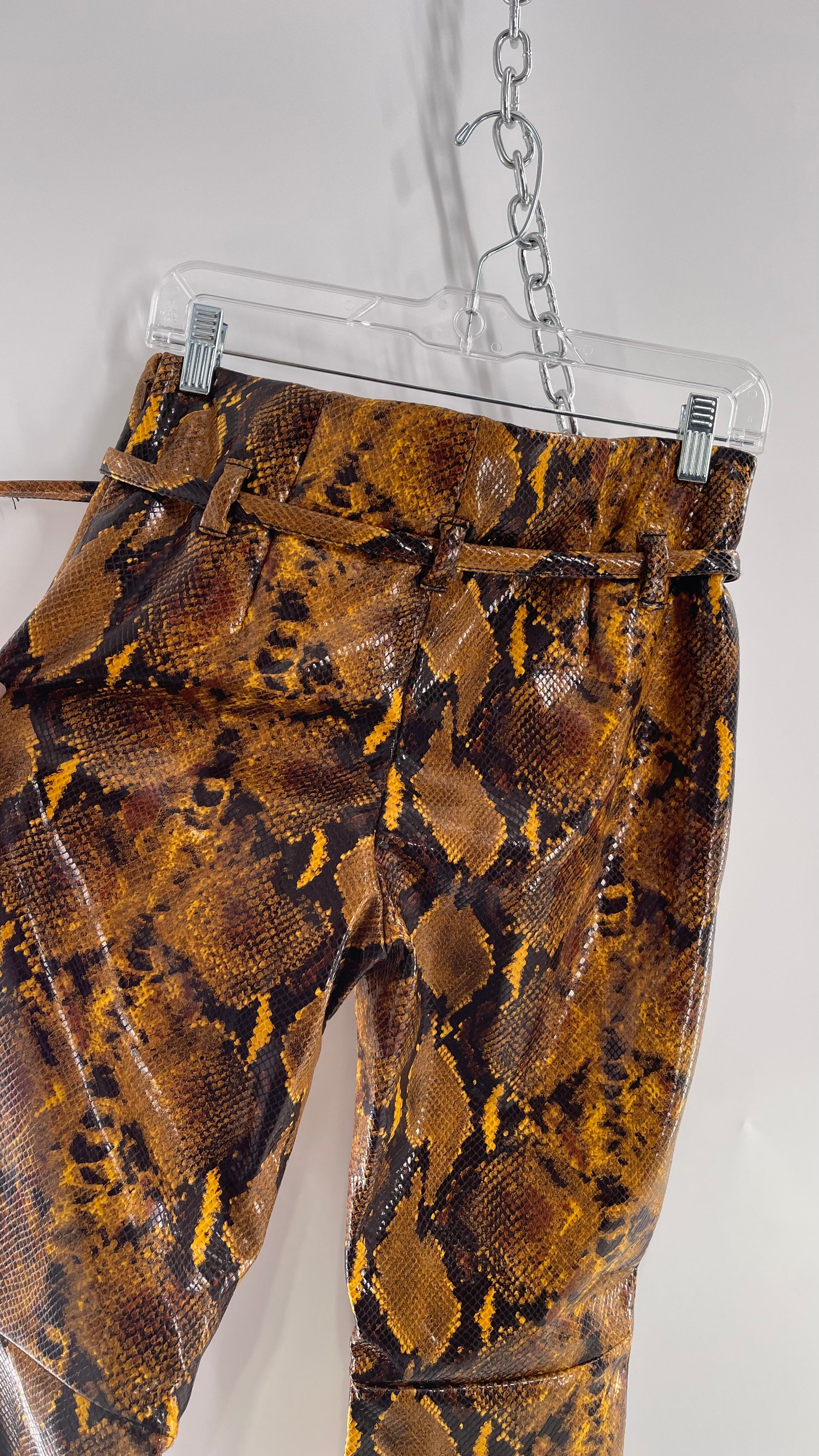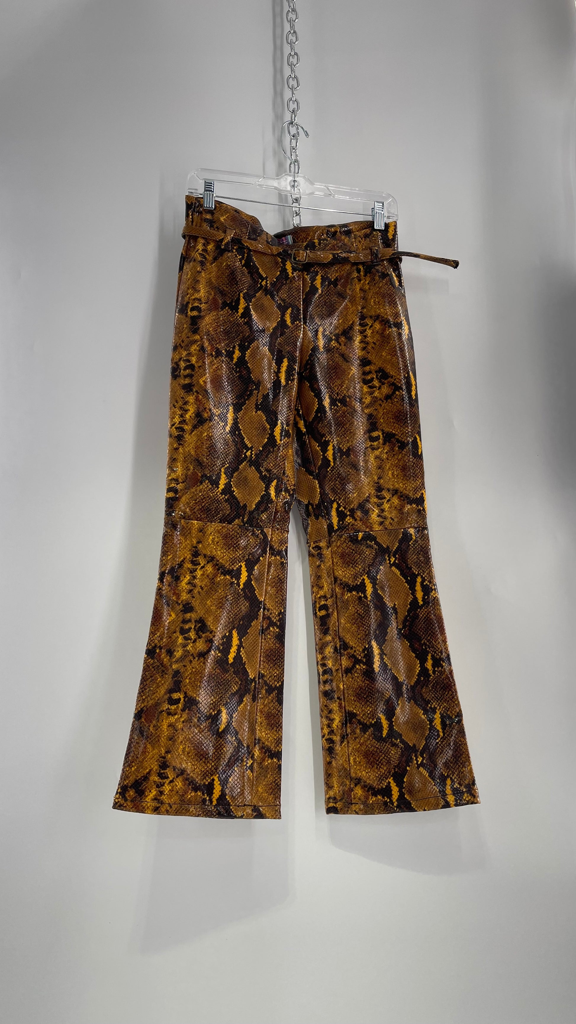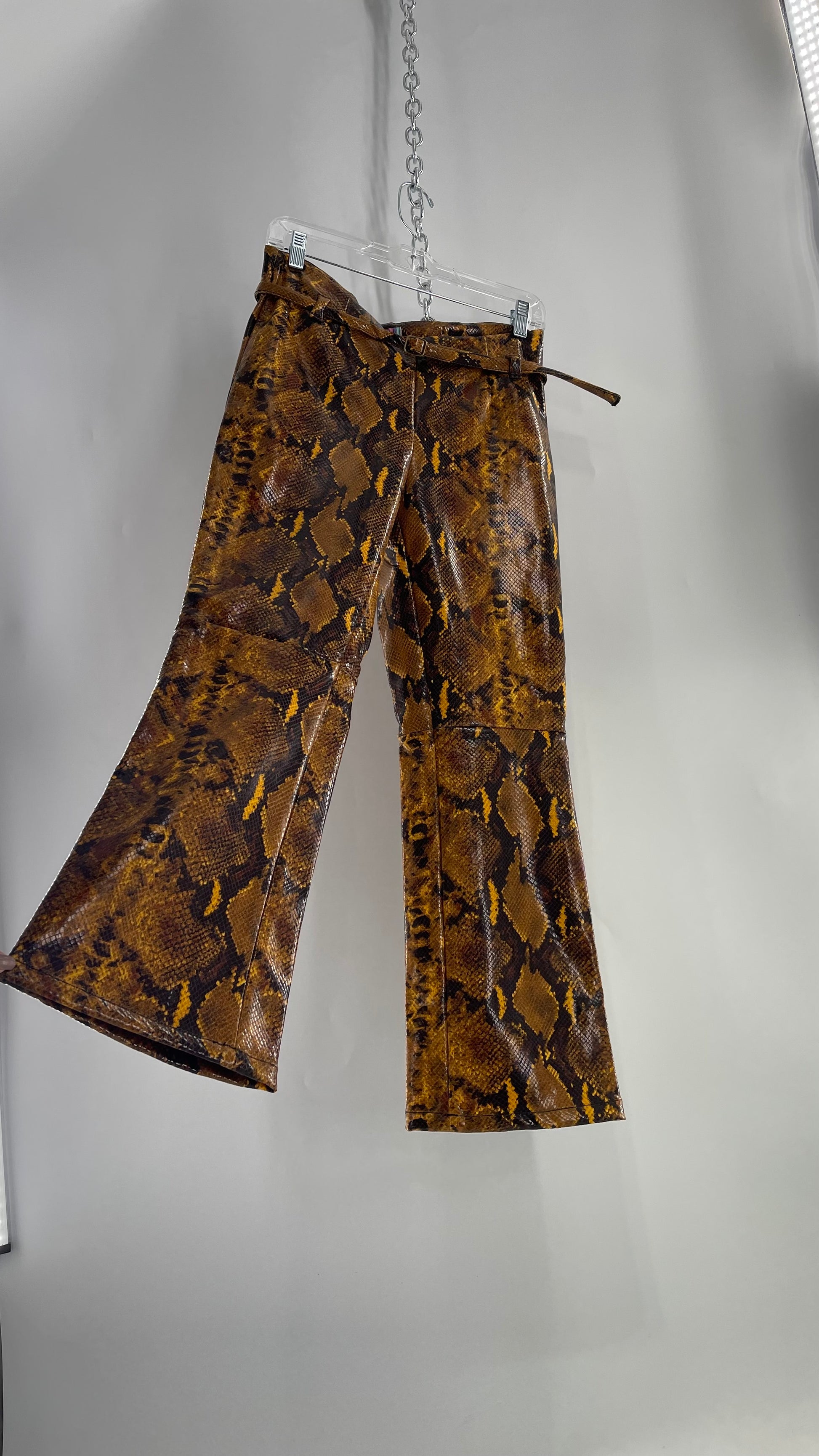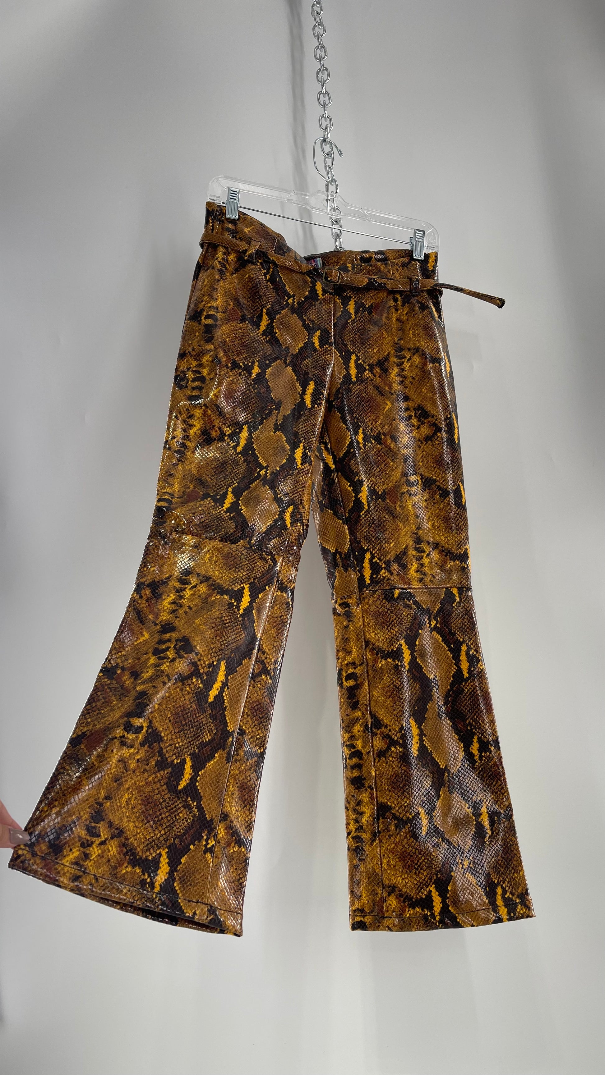 Urban Outfitters Yellow Snake/Python Pattern Faux Leather Low Rise Belted Kick Flare Trouser