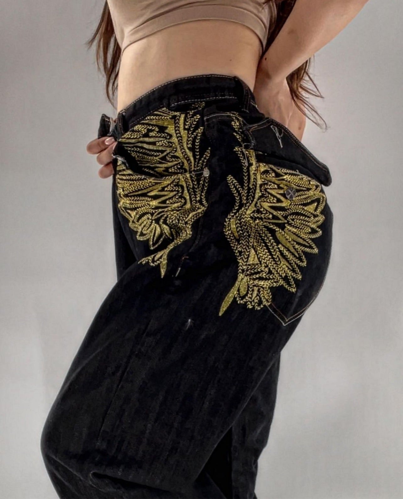 Vintage Raw Blue> showcasing these dark wash denims adorned in embroidered gold wings and red felt decal (Sz 40/34) $130 on GRAILED