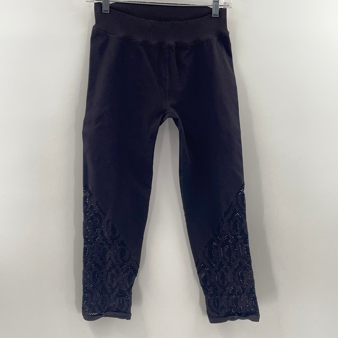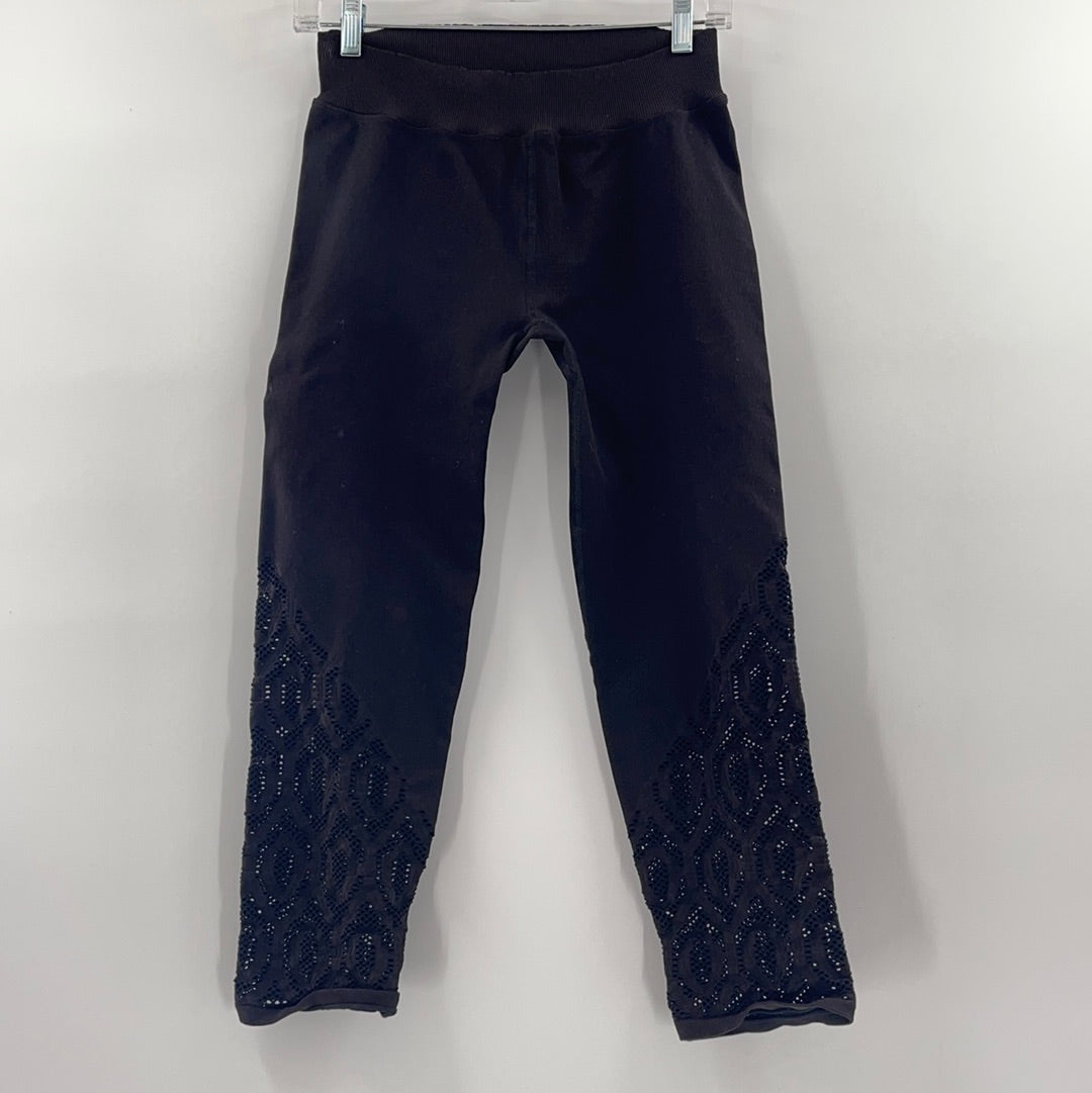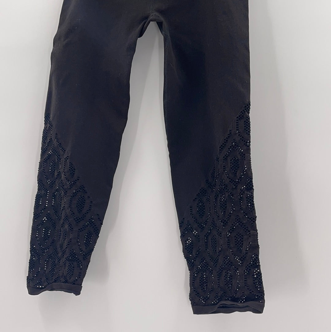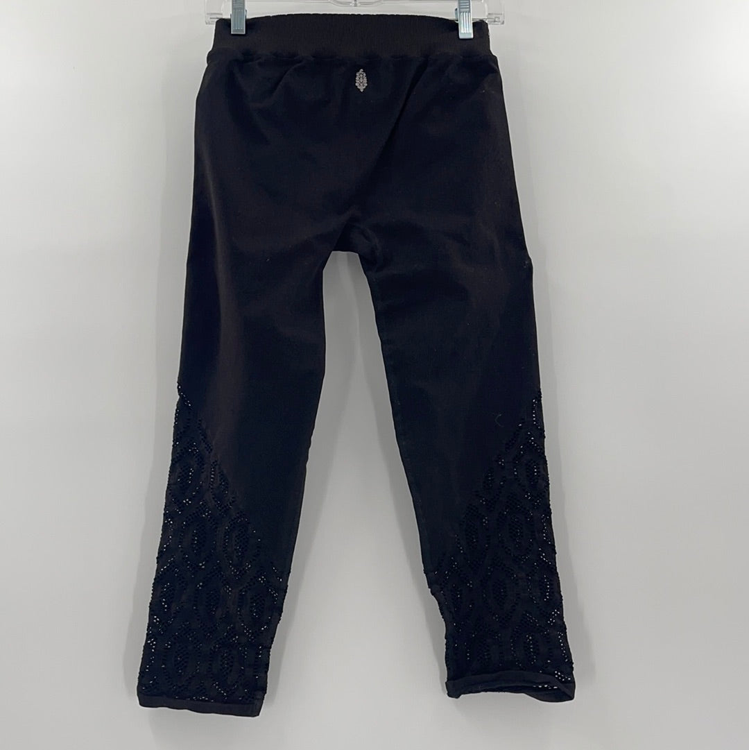 Free People Movement black Capri leggings with laser cut lace details on shins and calves (Sz M/L)