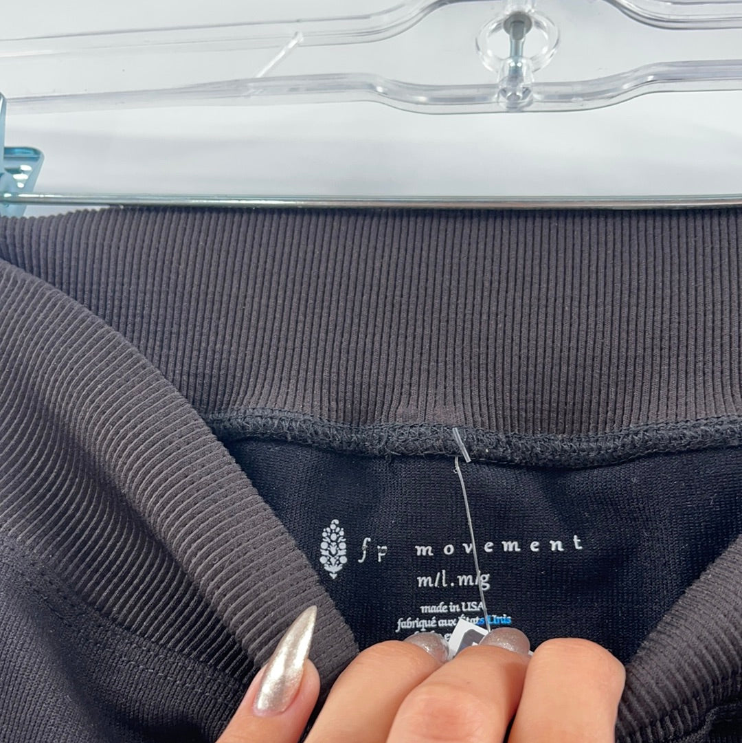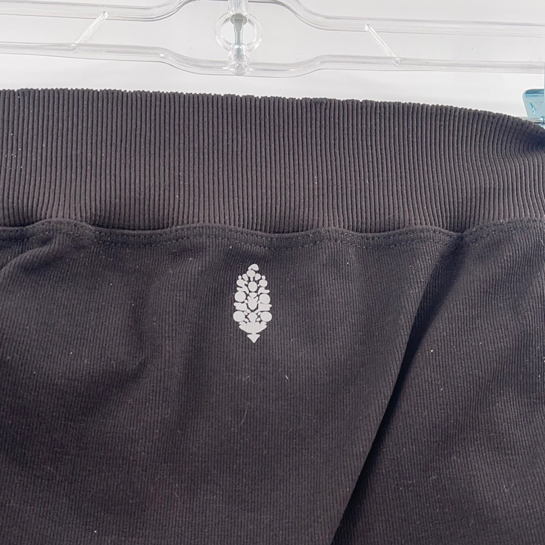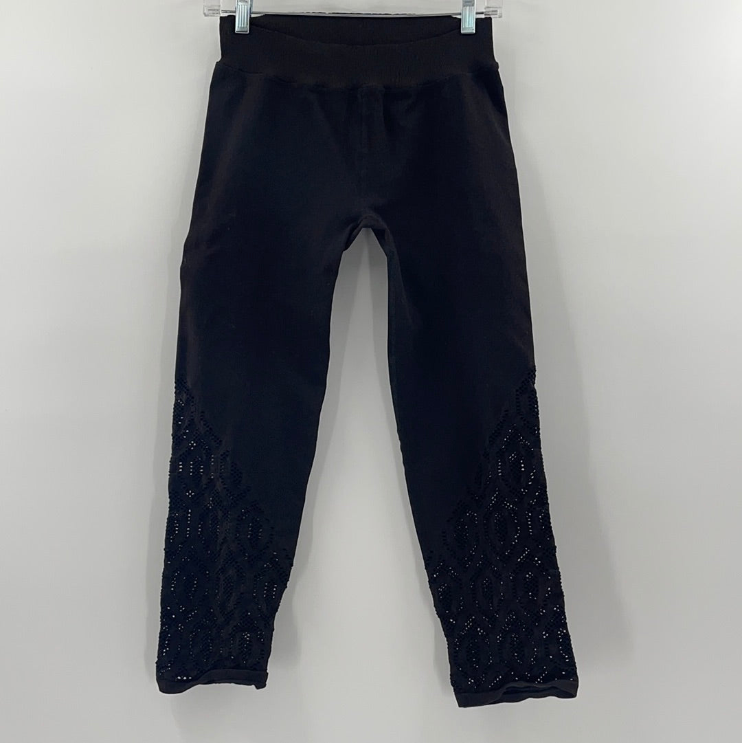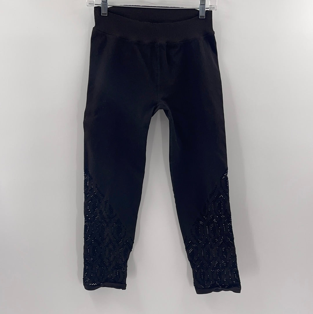 Free People Movement black Capri leggings with laser cut lace details on shins and calves (Sz M/L)
