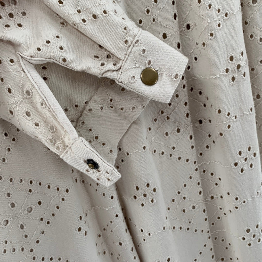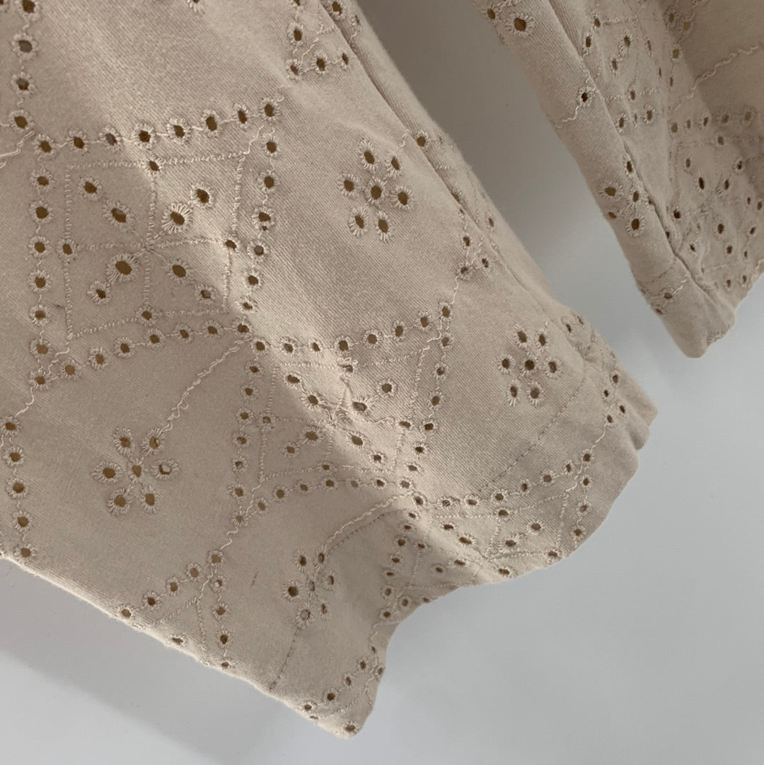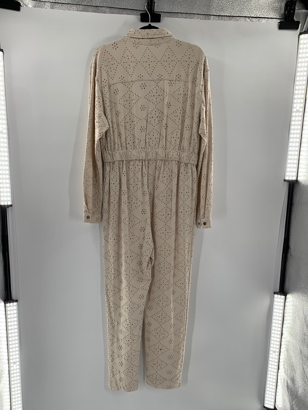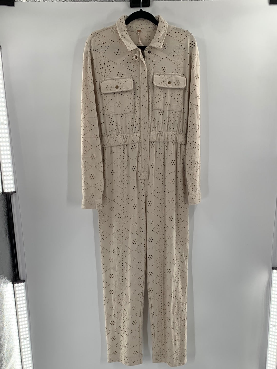 Free People beige jersey material with eyelet perforations, zip front closure, cinched waist, collar and front pockets