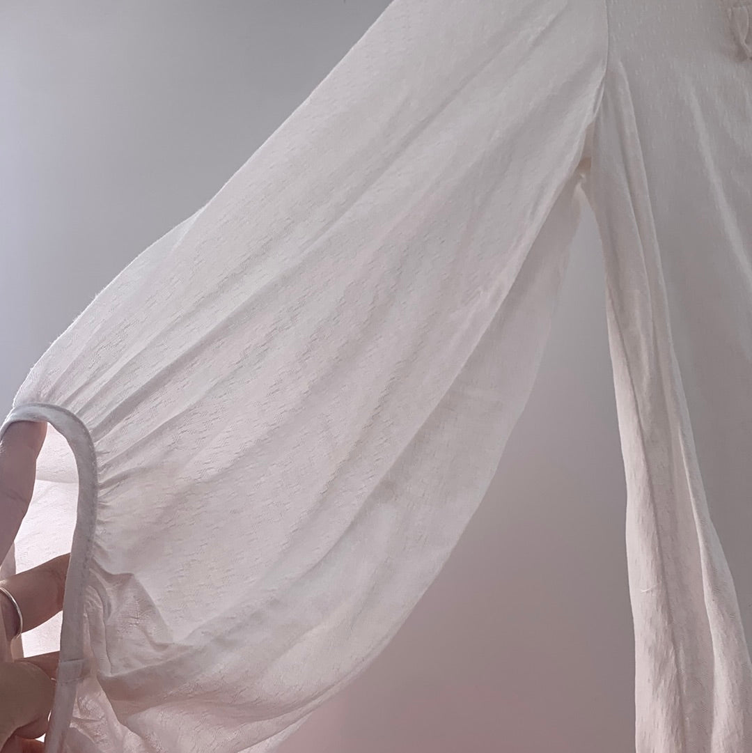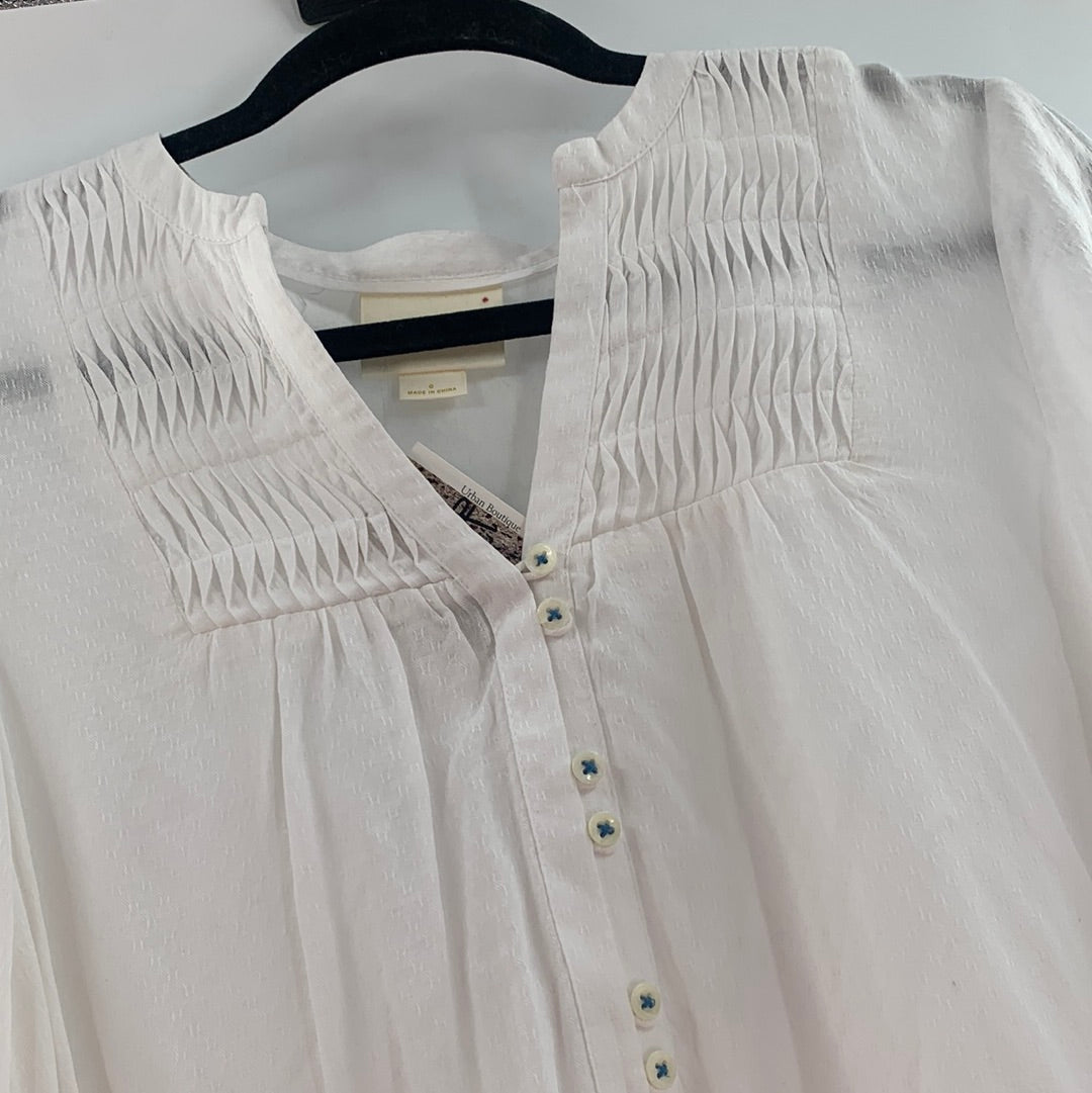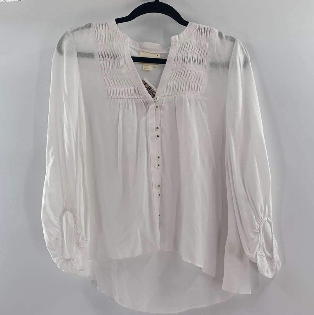 Anthropologie Maeve White Blouse with pleated neckline and Buttons Running down the front attached by blue string
