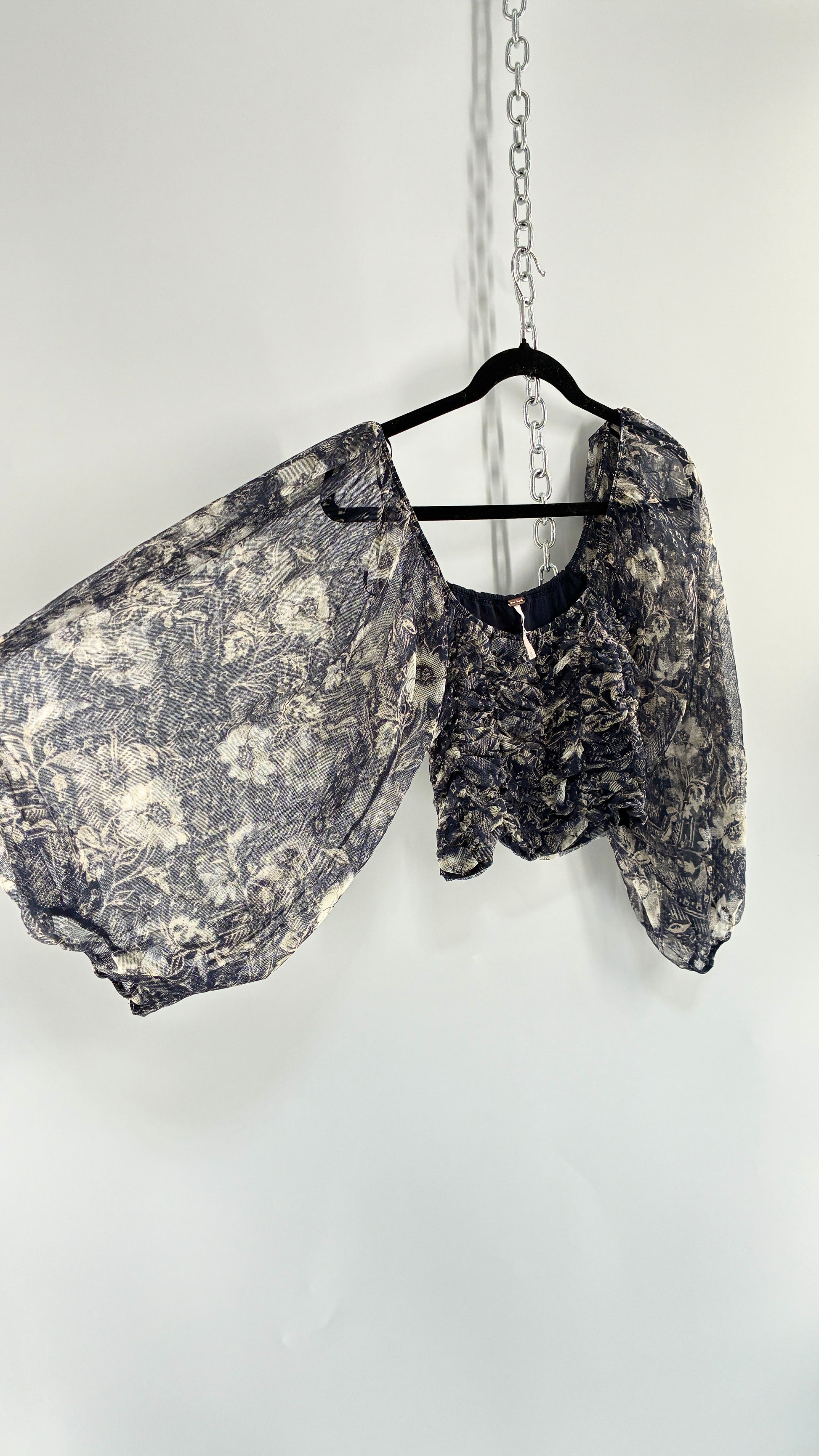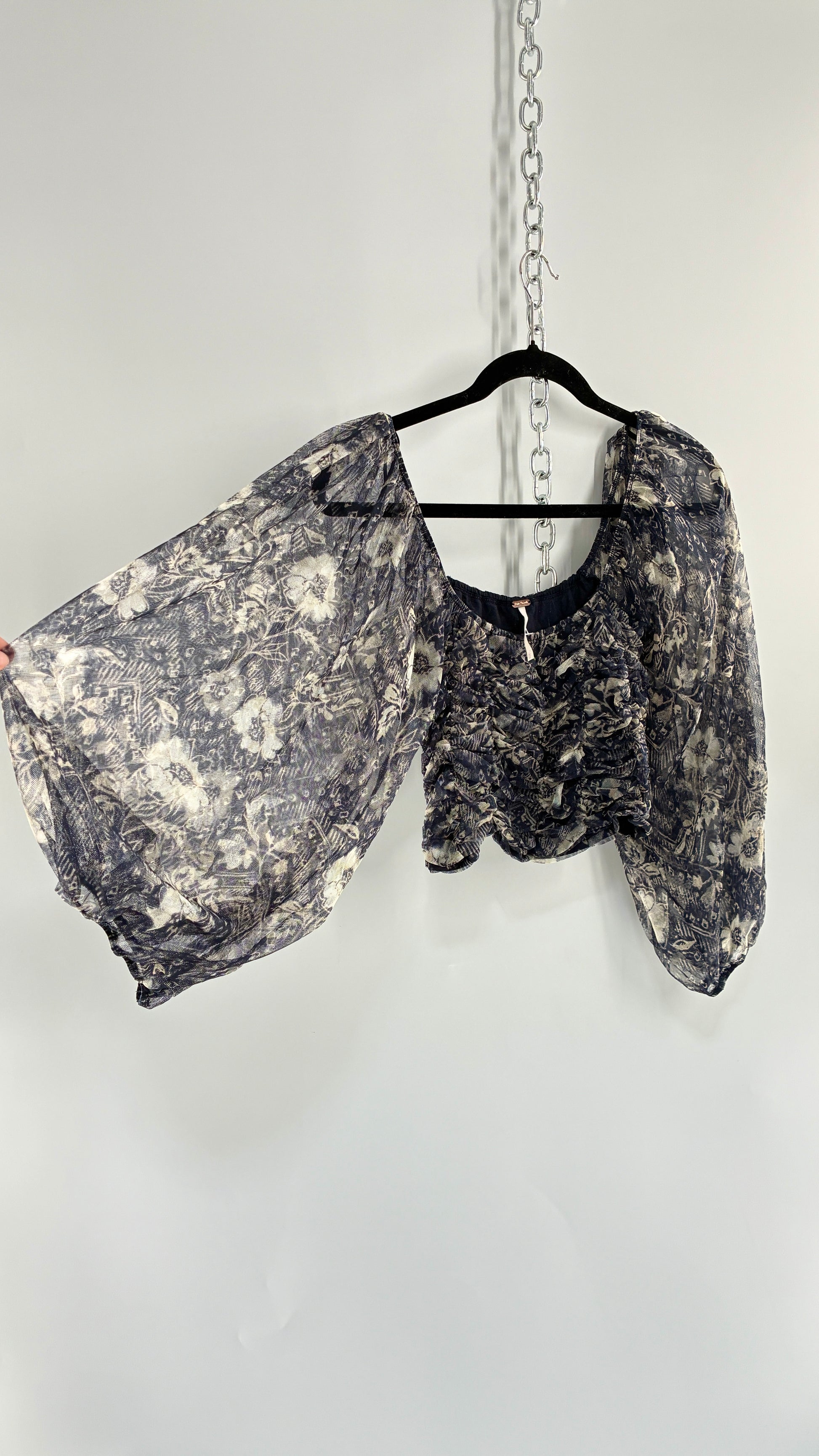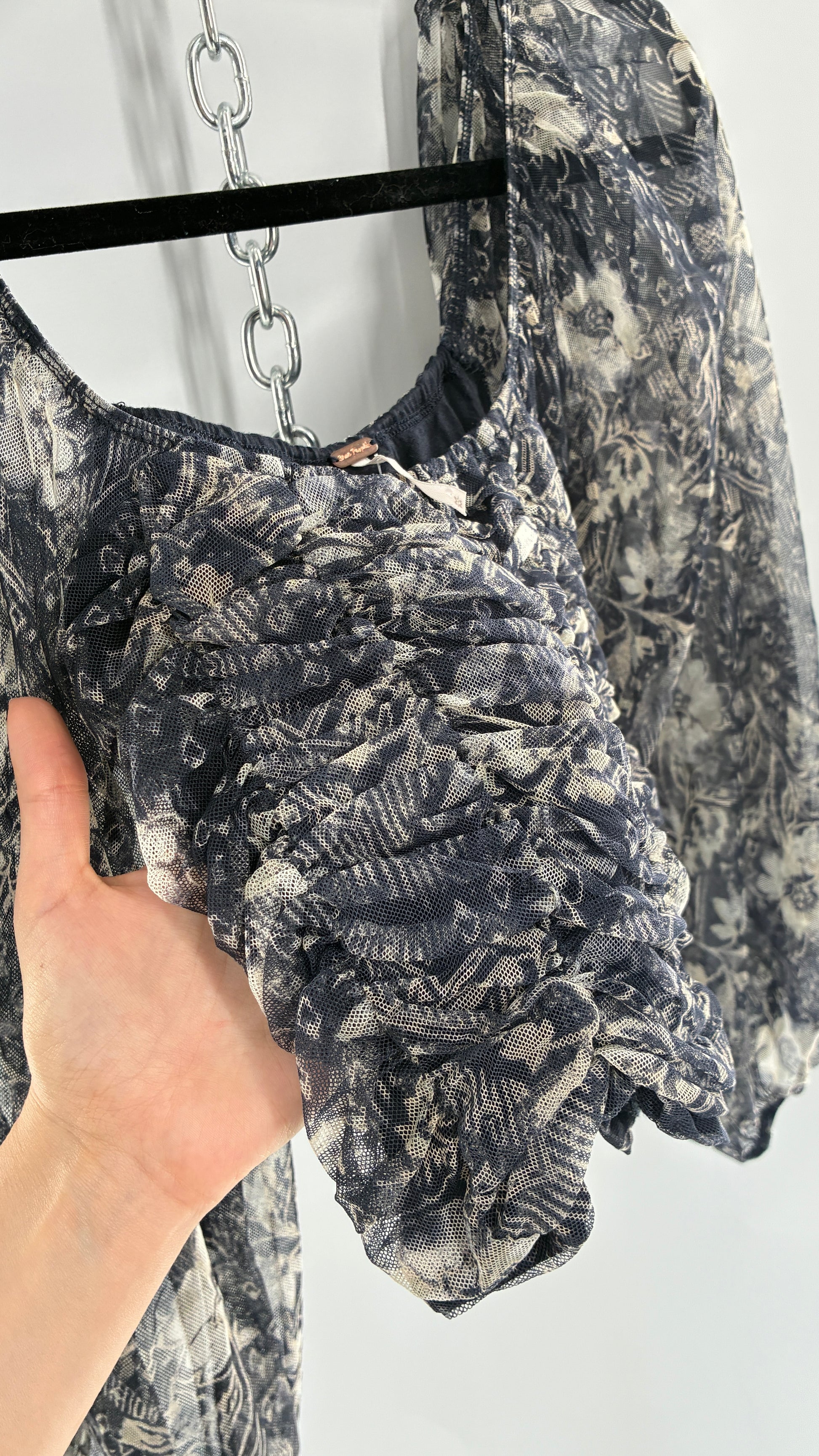Free People Denim Blue Balloon Sleeve Mesh Ruched Blouse (Medium)