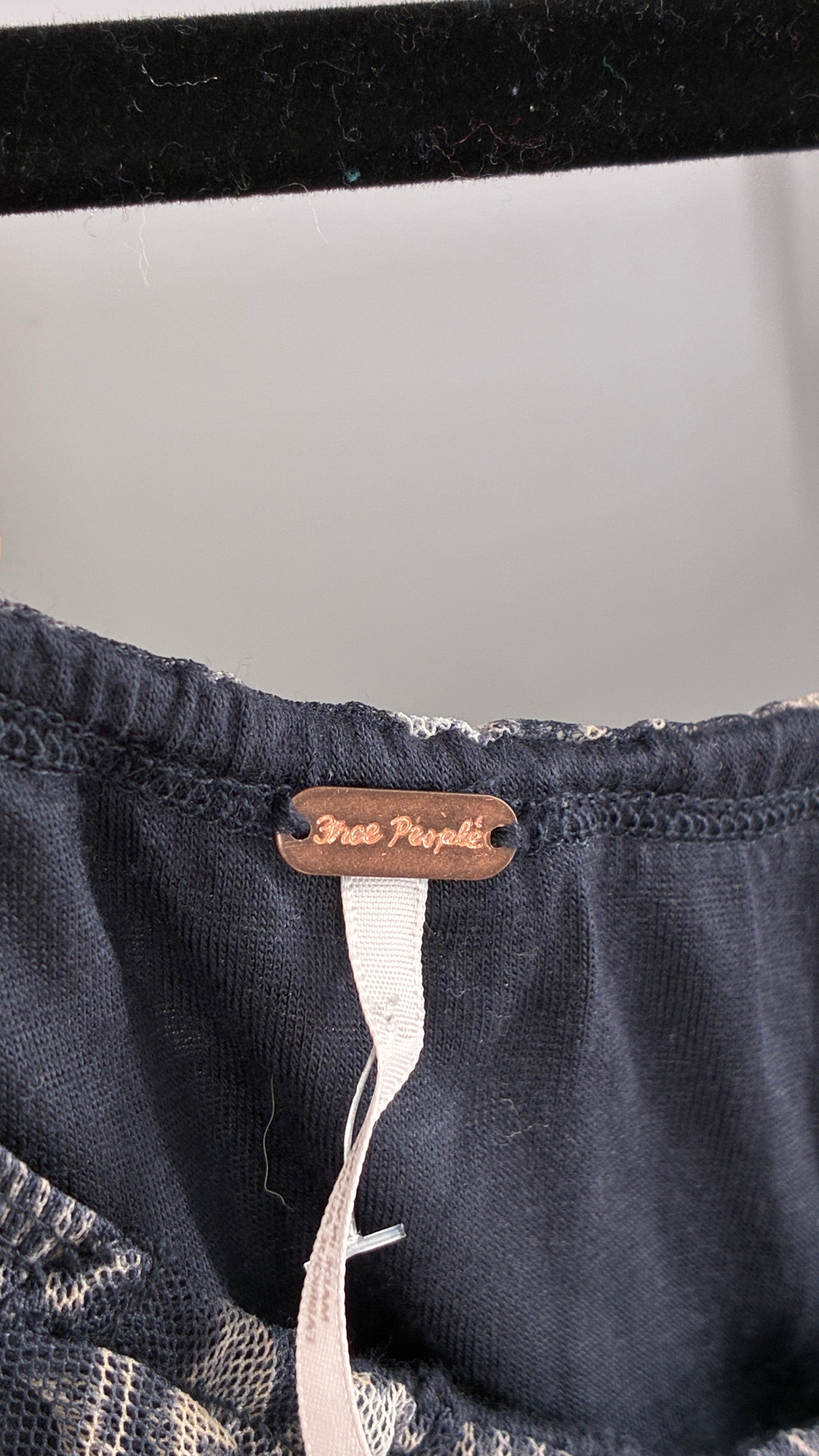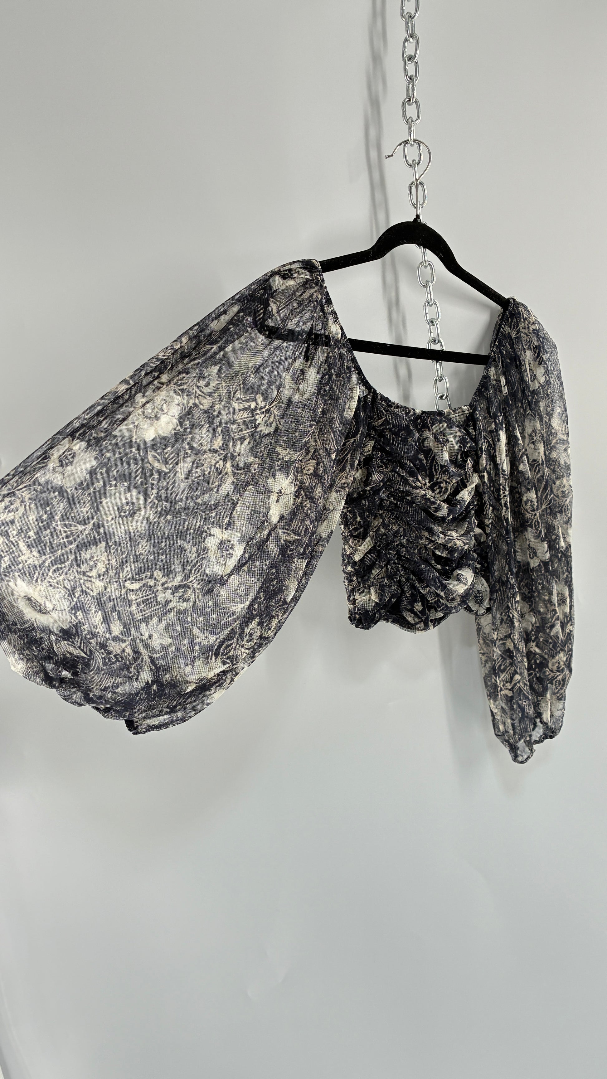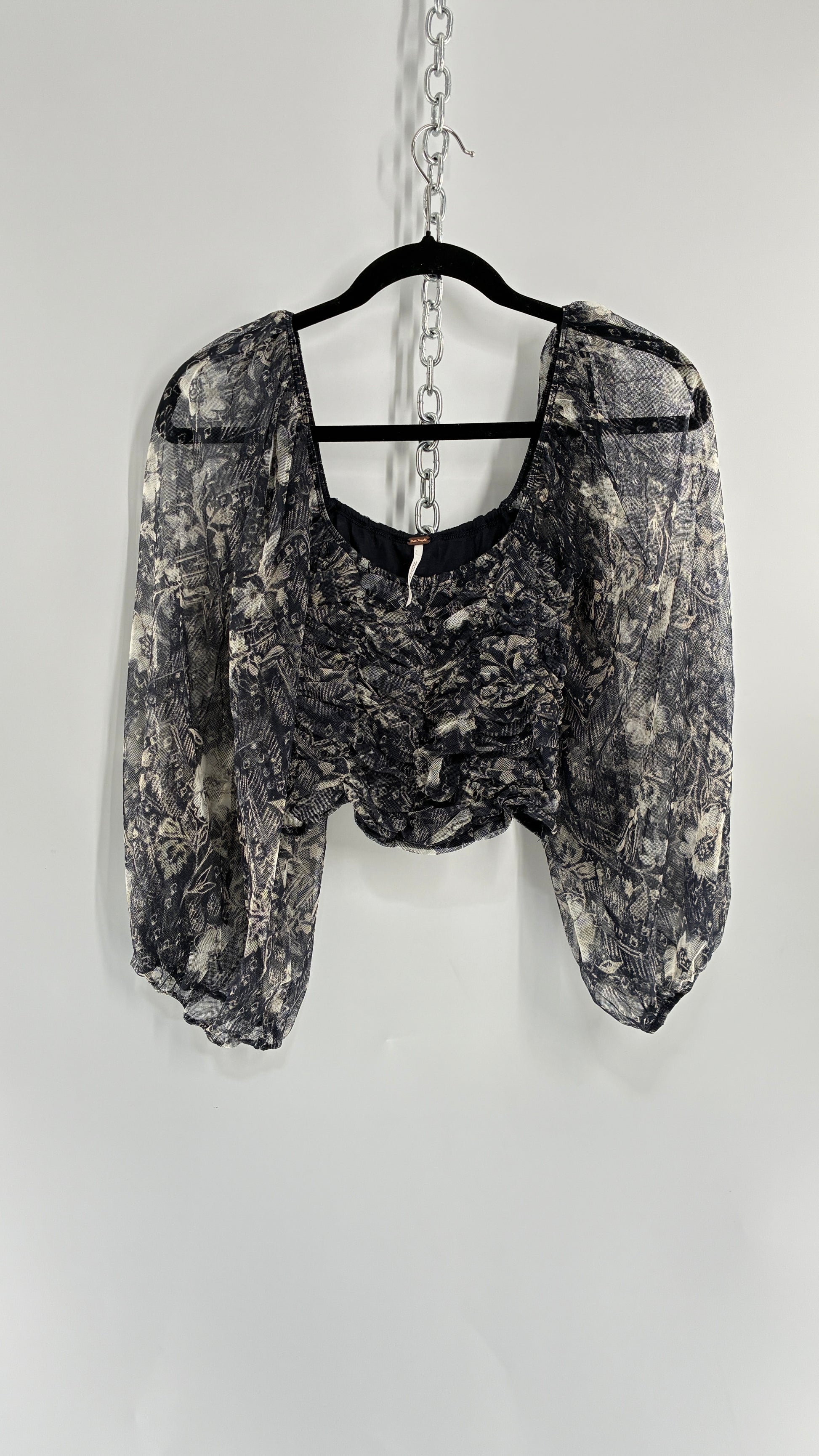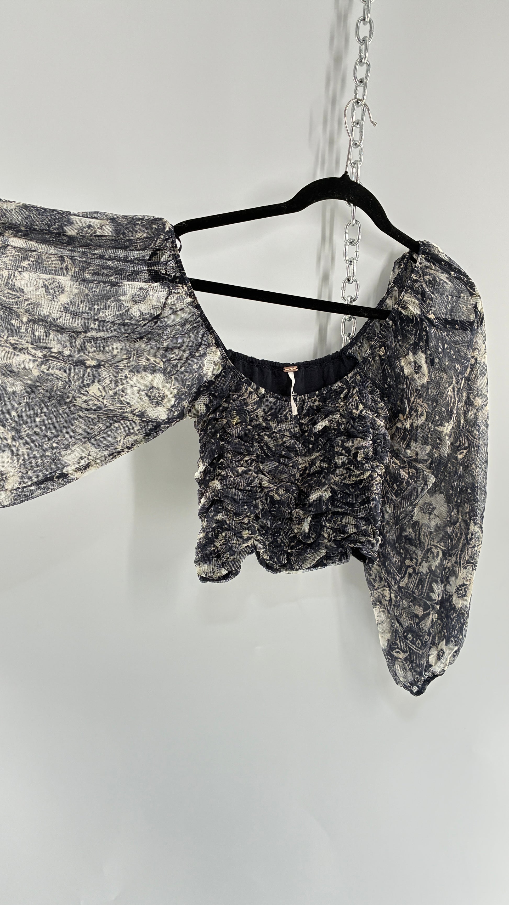 Free People Denim Blue Balloon Sleeve Mesh Ruched Blouse (Medium)
