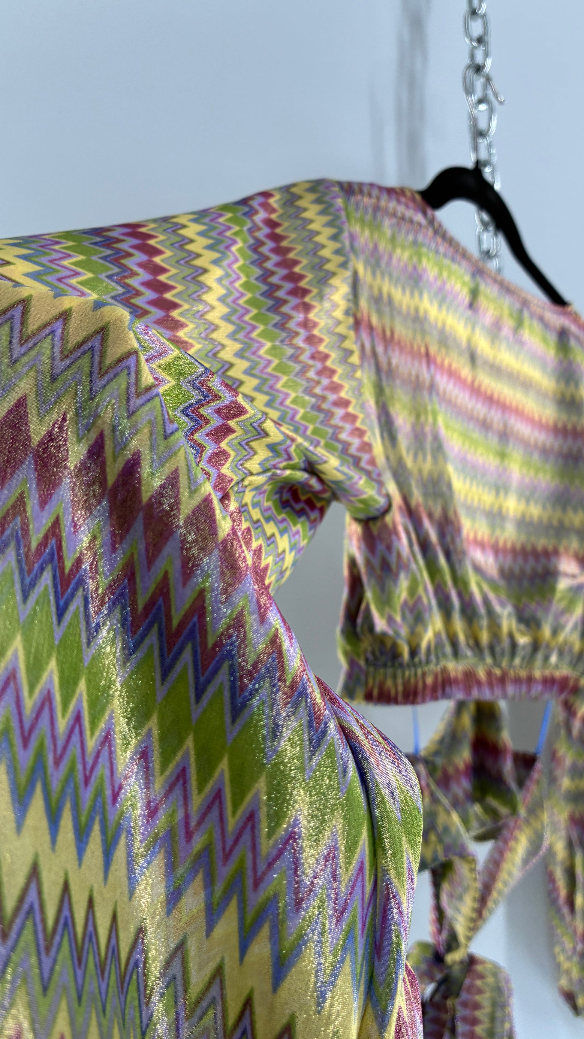 Urban Outfitters Green Open Side Tie Around, Balloon Sleeve Sparkle Top (Small)