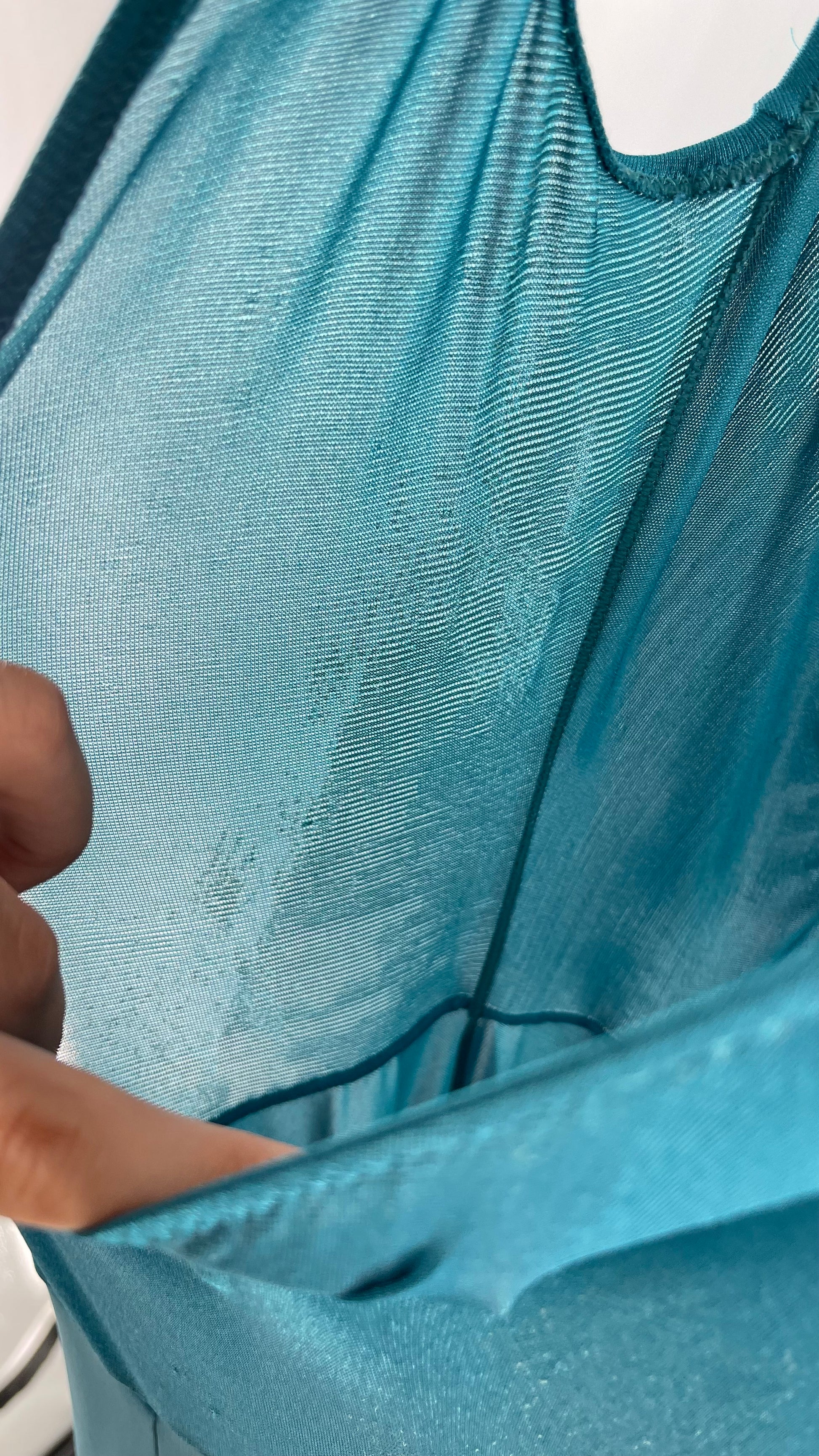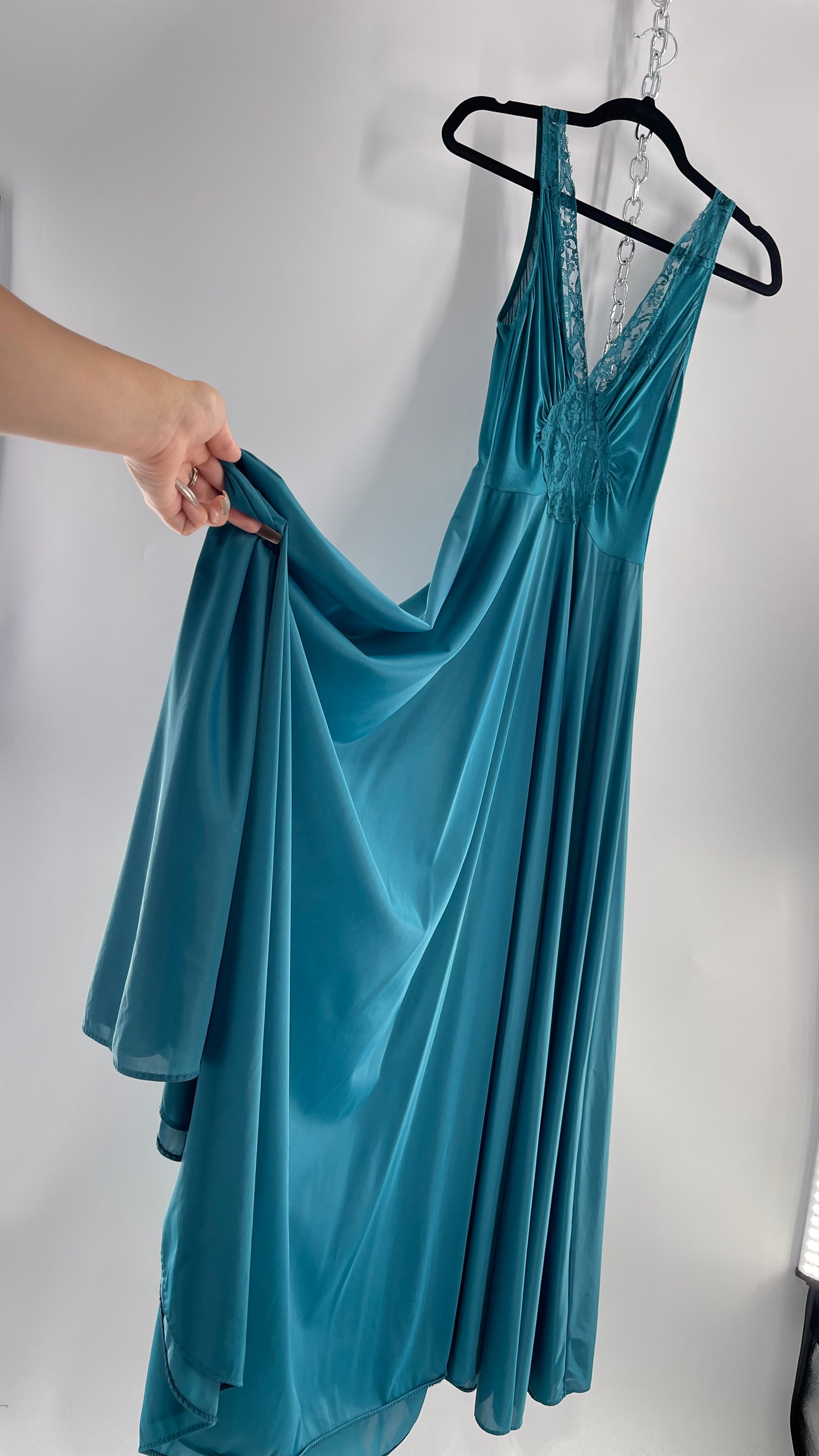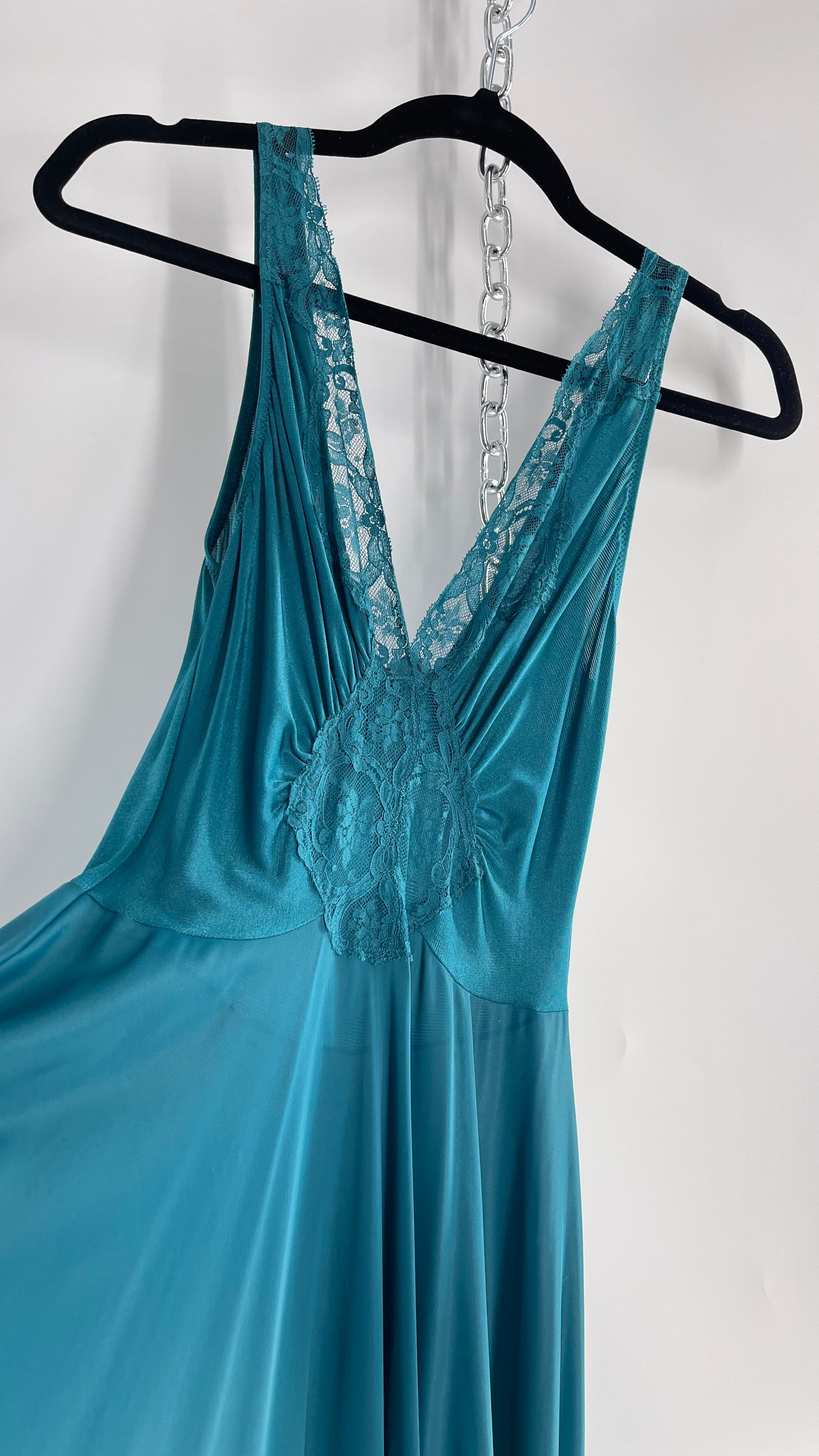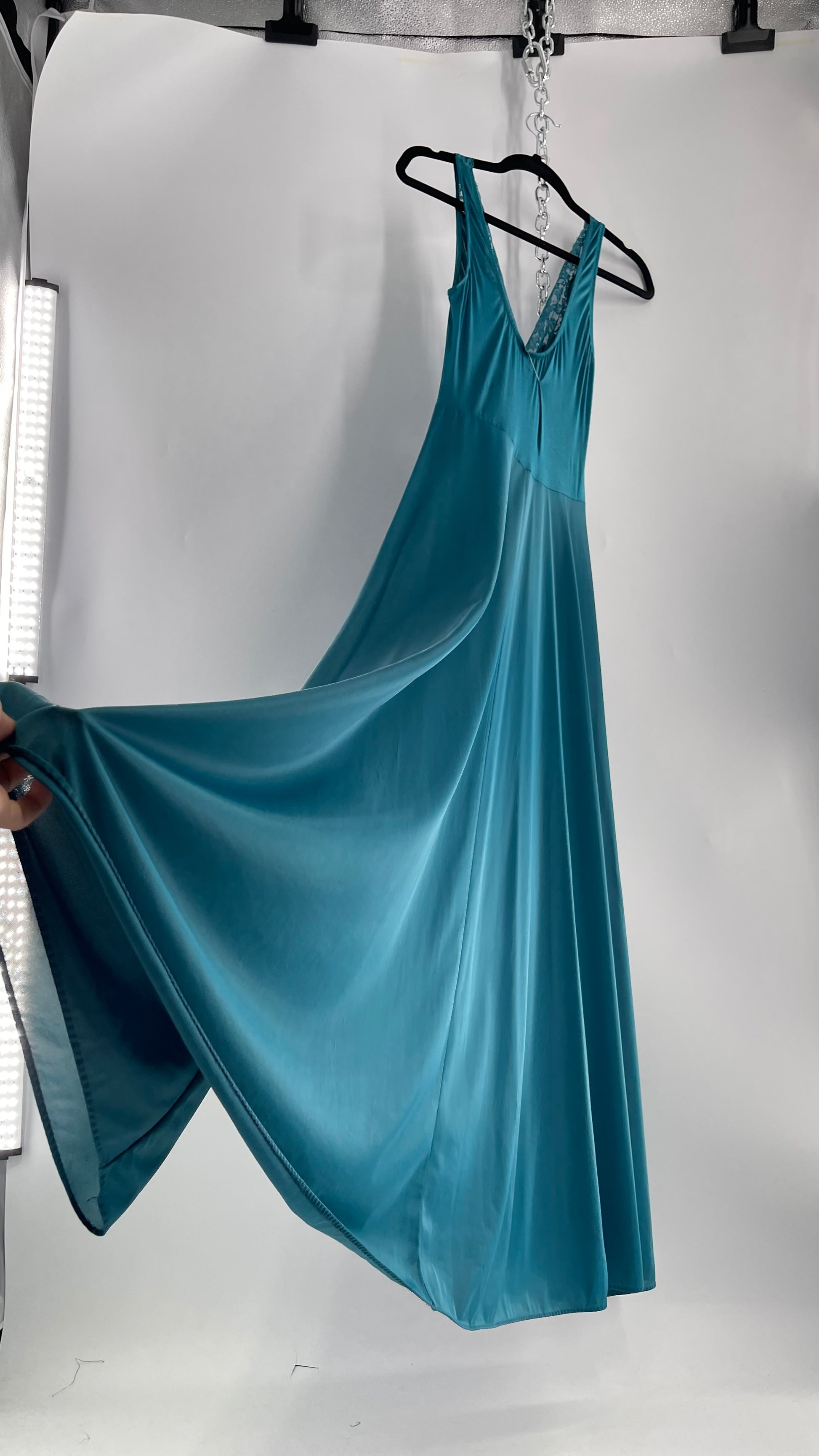 Vintage Olga Intimates Floor Length Voluminous Blue Jewel Toned Maxi Dress/Night Gown with Lace Bust (Small)