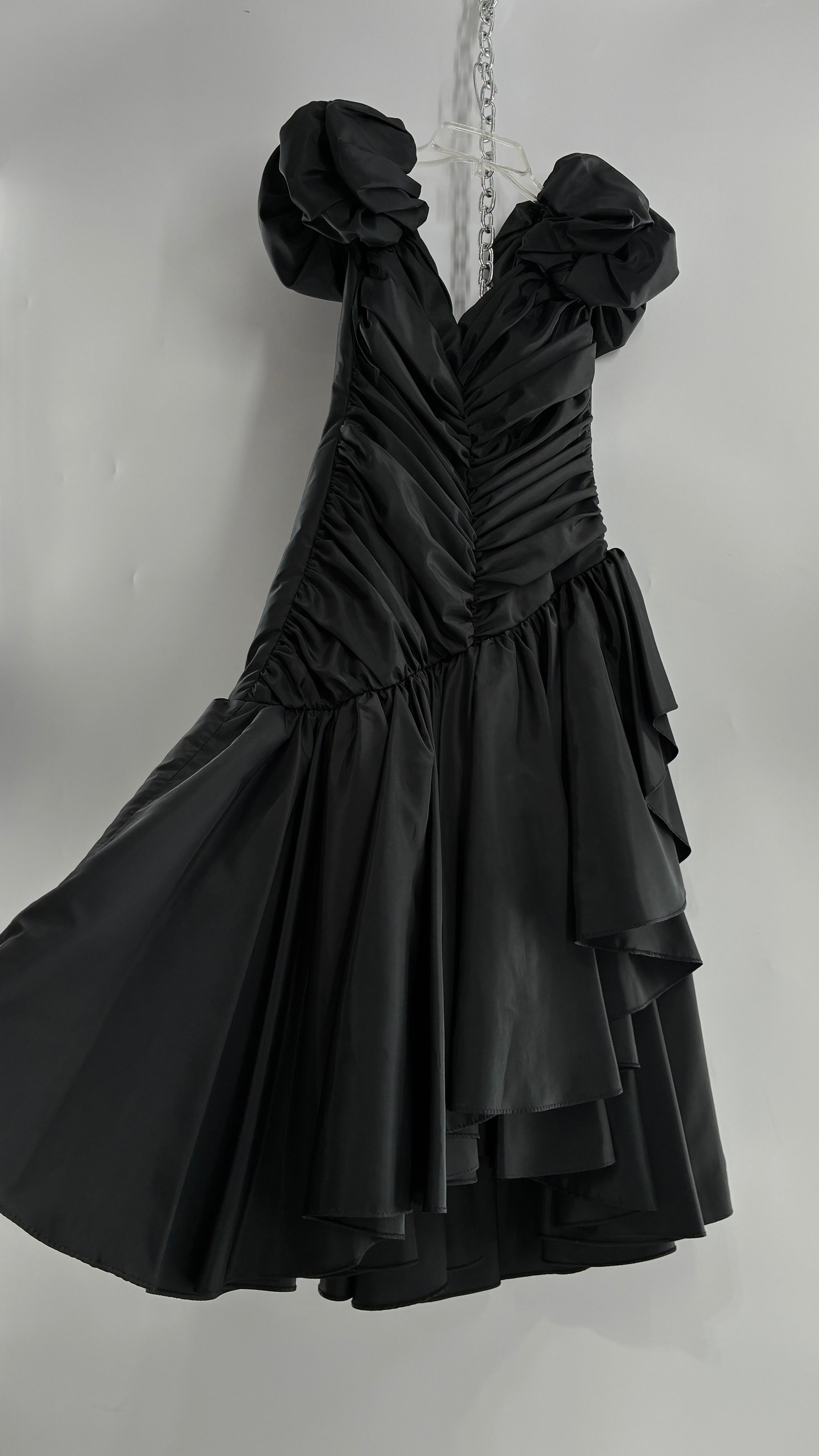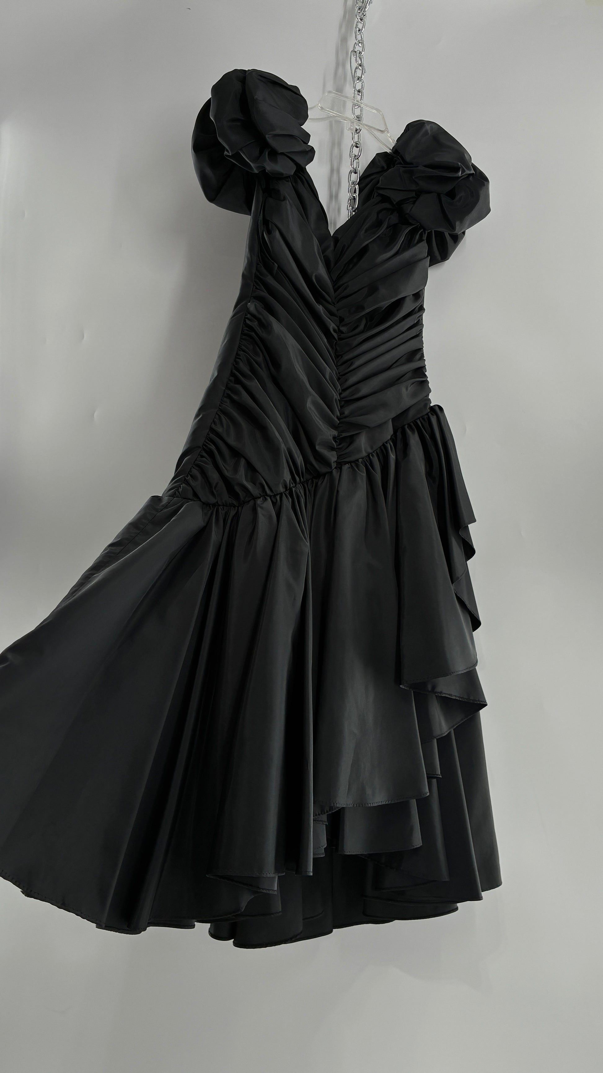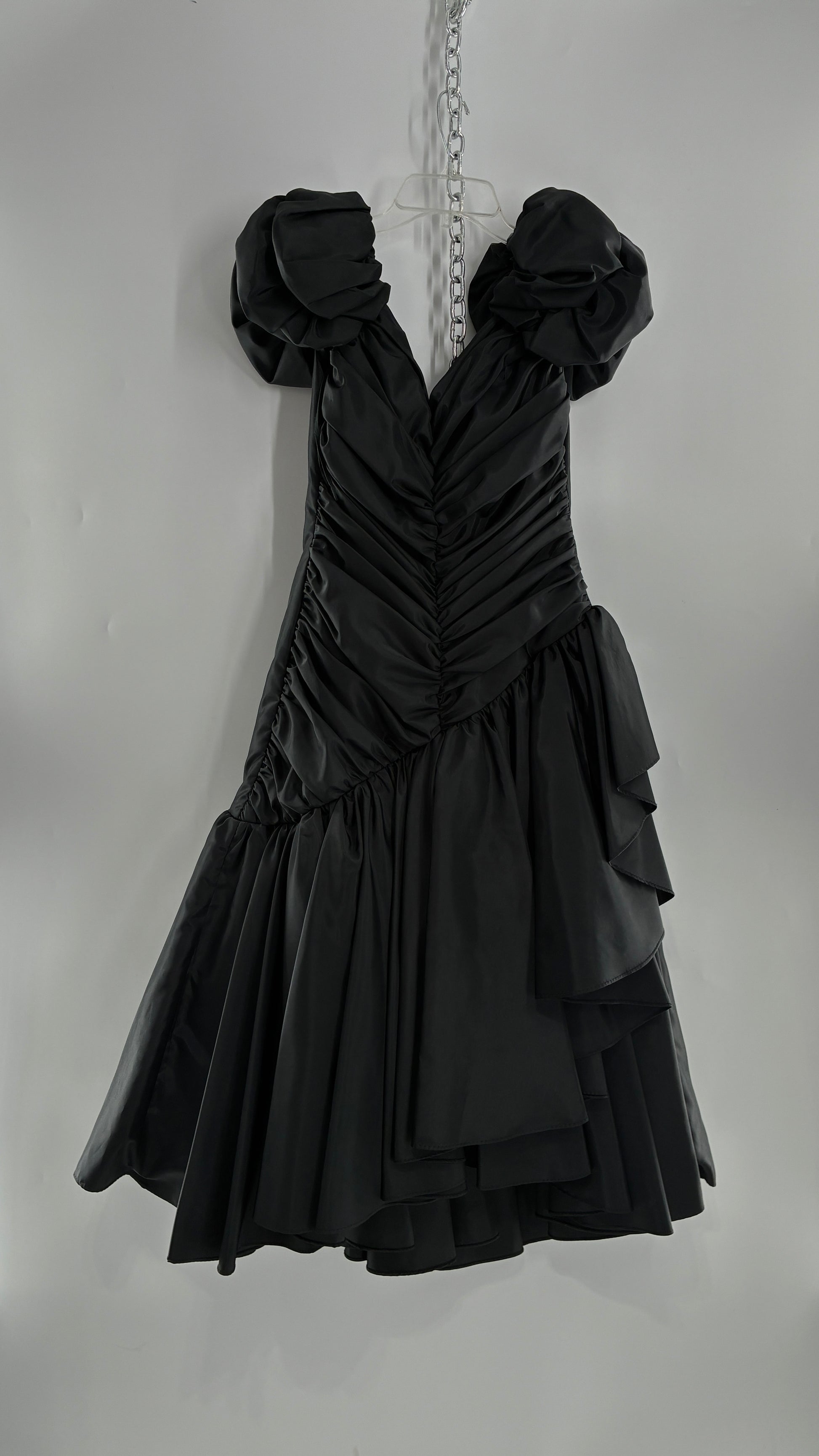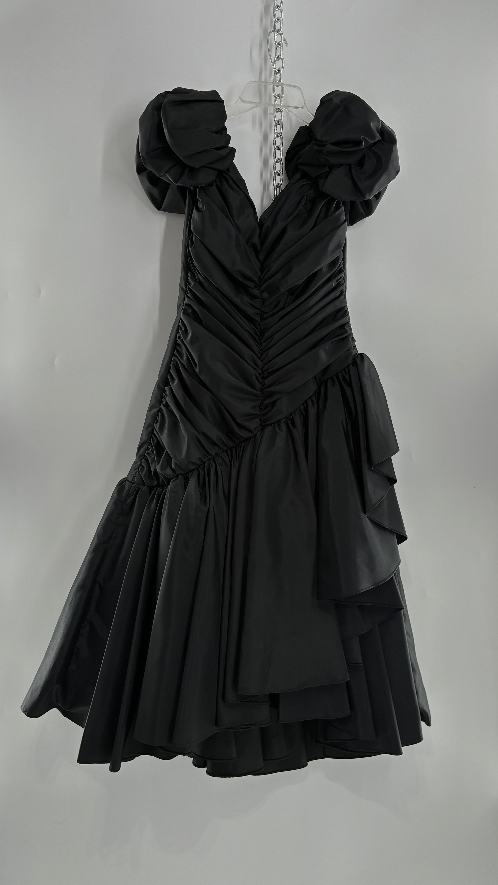 Vintage 1980s Black Gown with Ruched Bodice, Exaggerated Puff Sleeves, and Tiered Skirt (Measured)