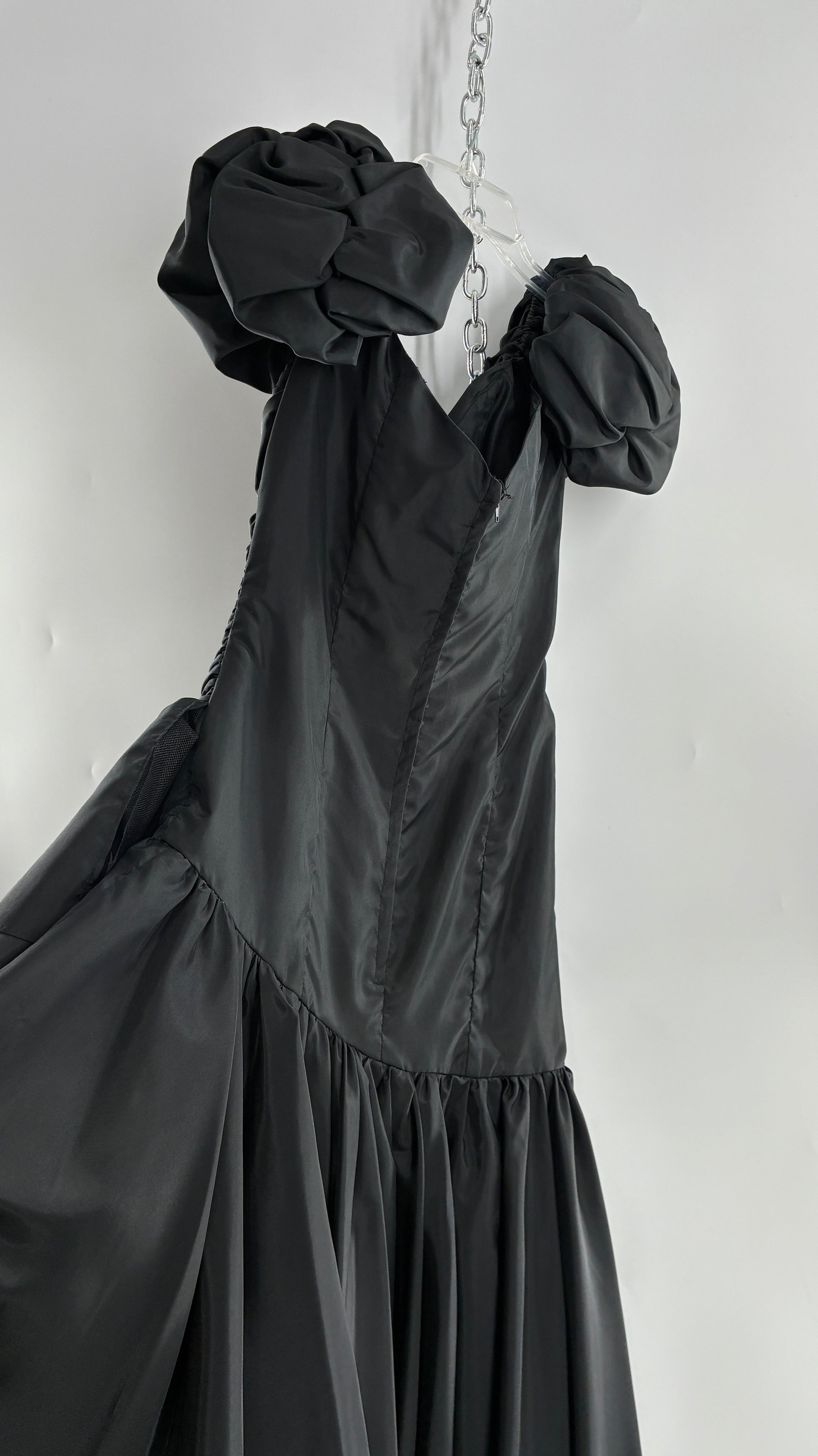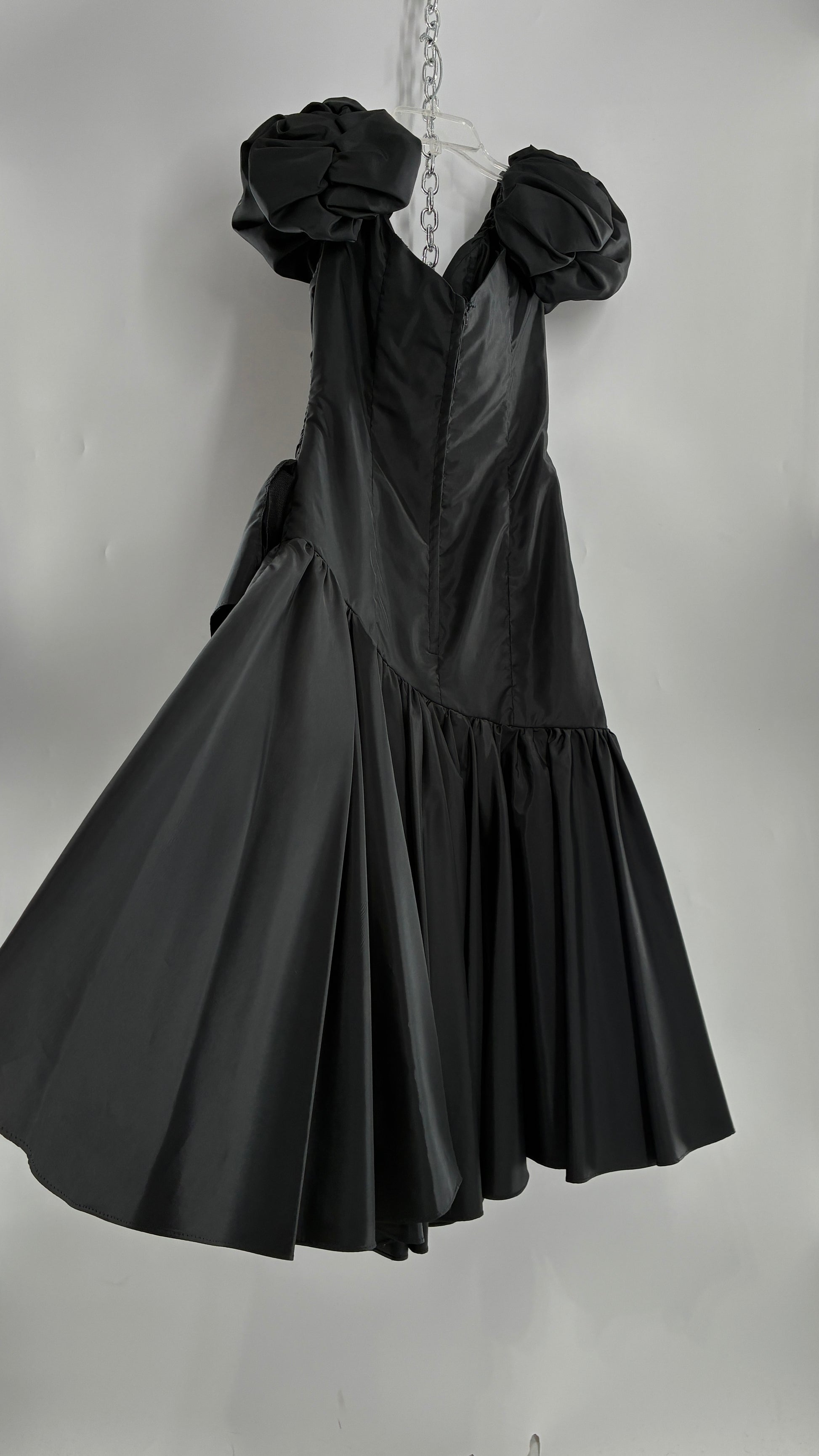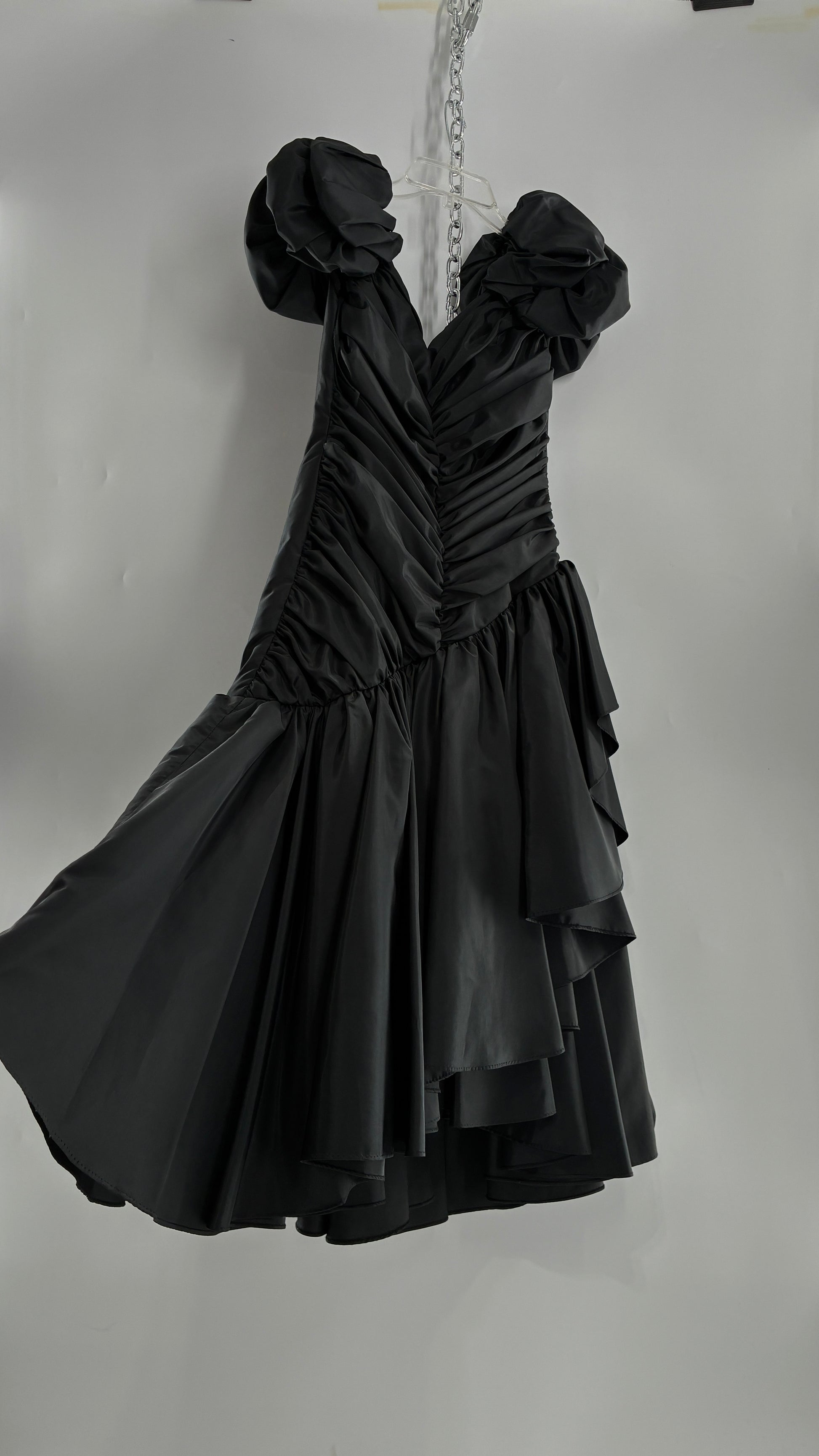 Vintage 1980s Black Gown with Ruched Bodice, Exaggerated Puff Sleeves, and Tiered Skirt (Measured)