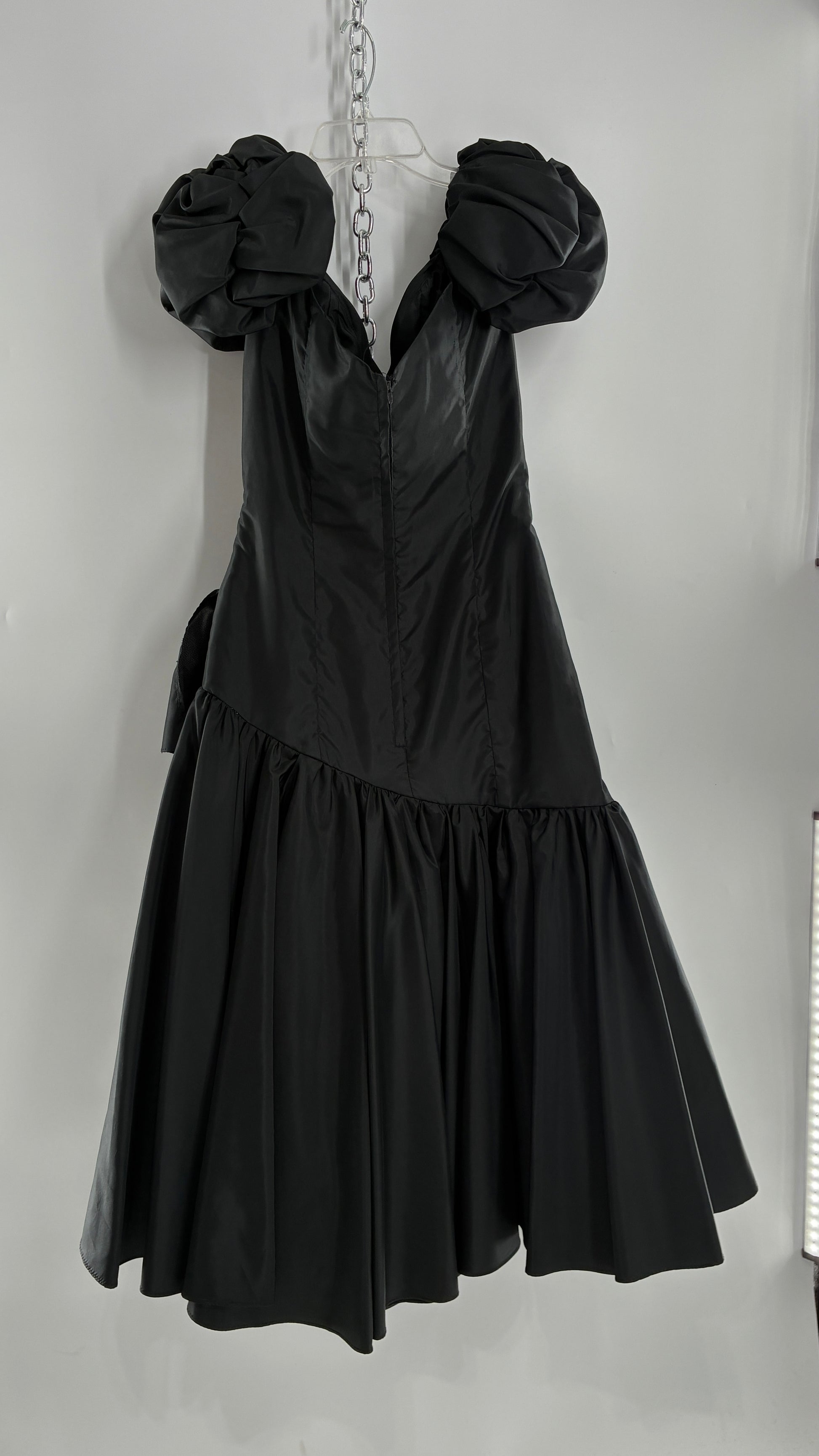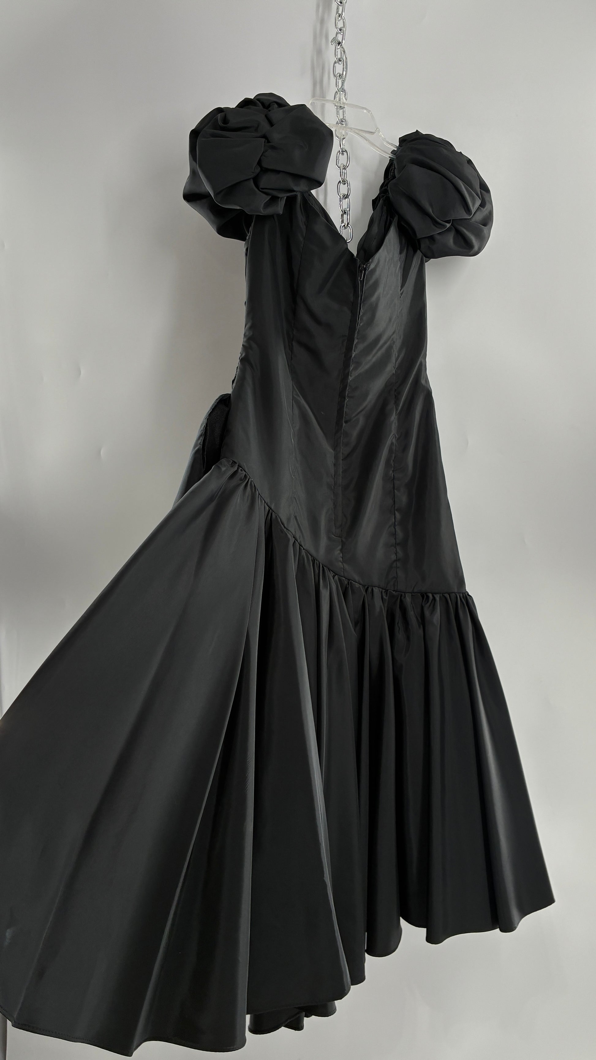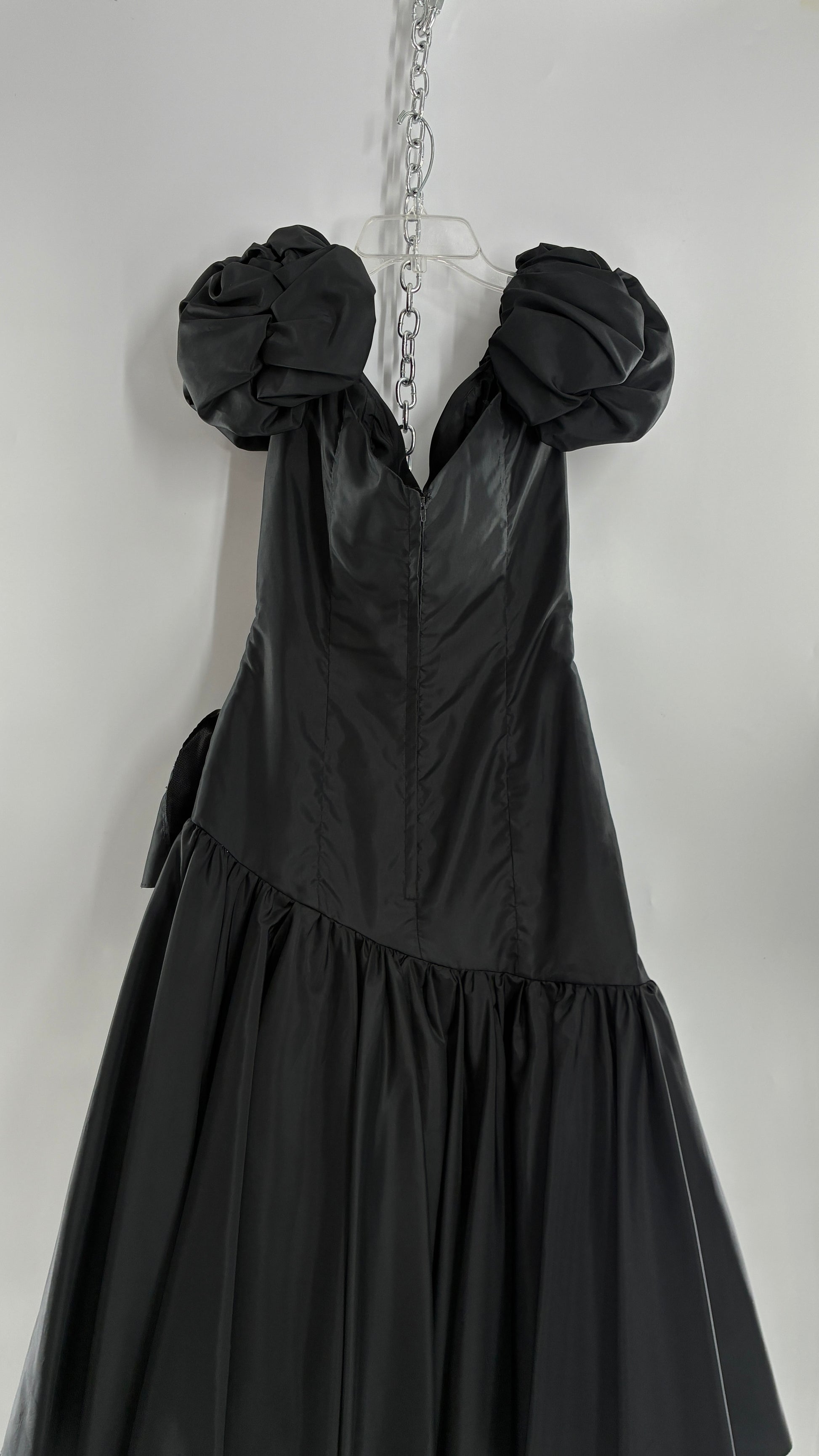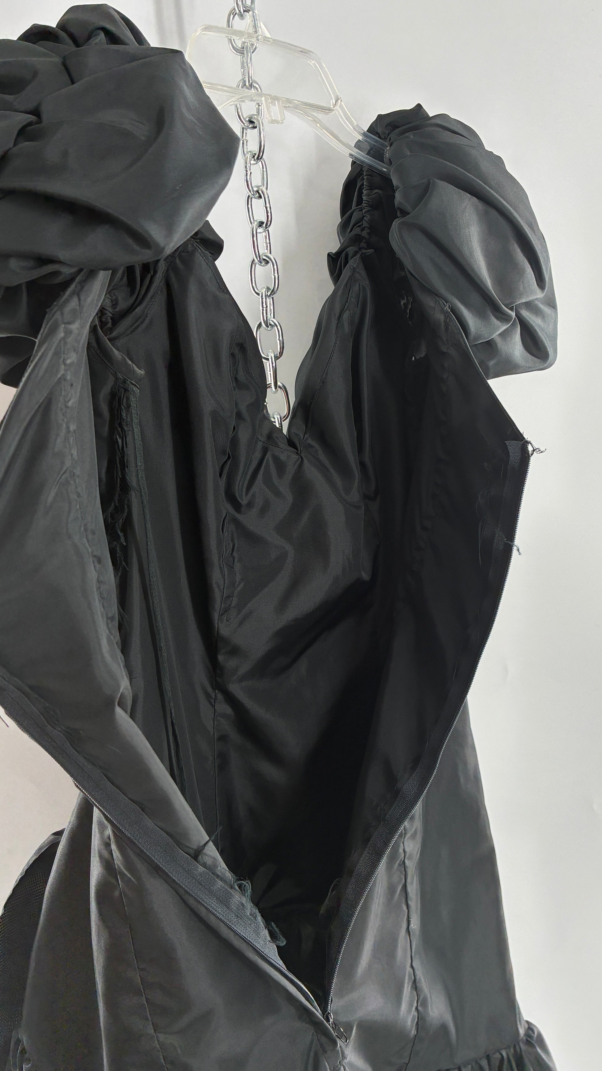 Vintage 1980s Black Gown with Ruched Bodice, Exaggerated Puff Sleeves, and Tiered Skirt (Measured)