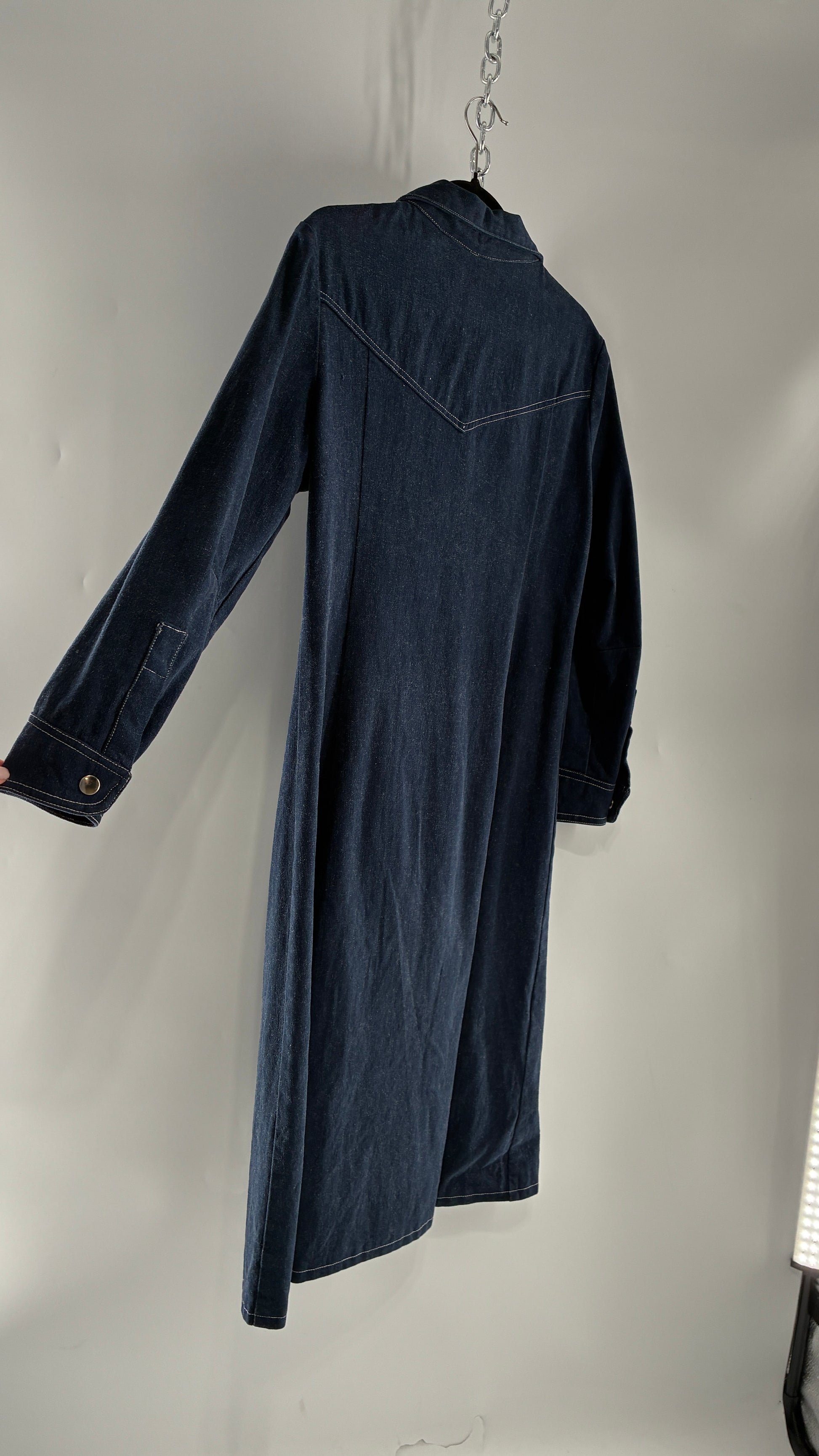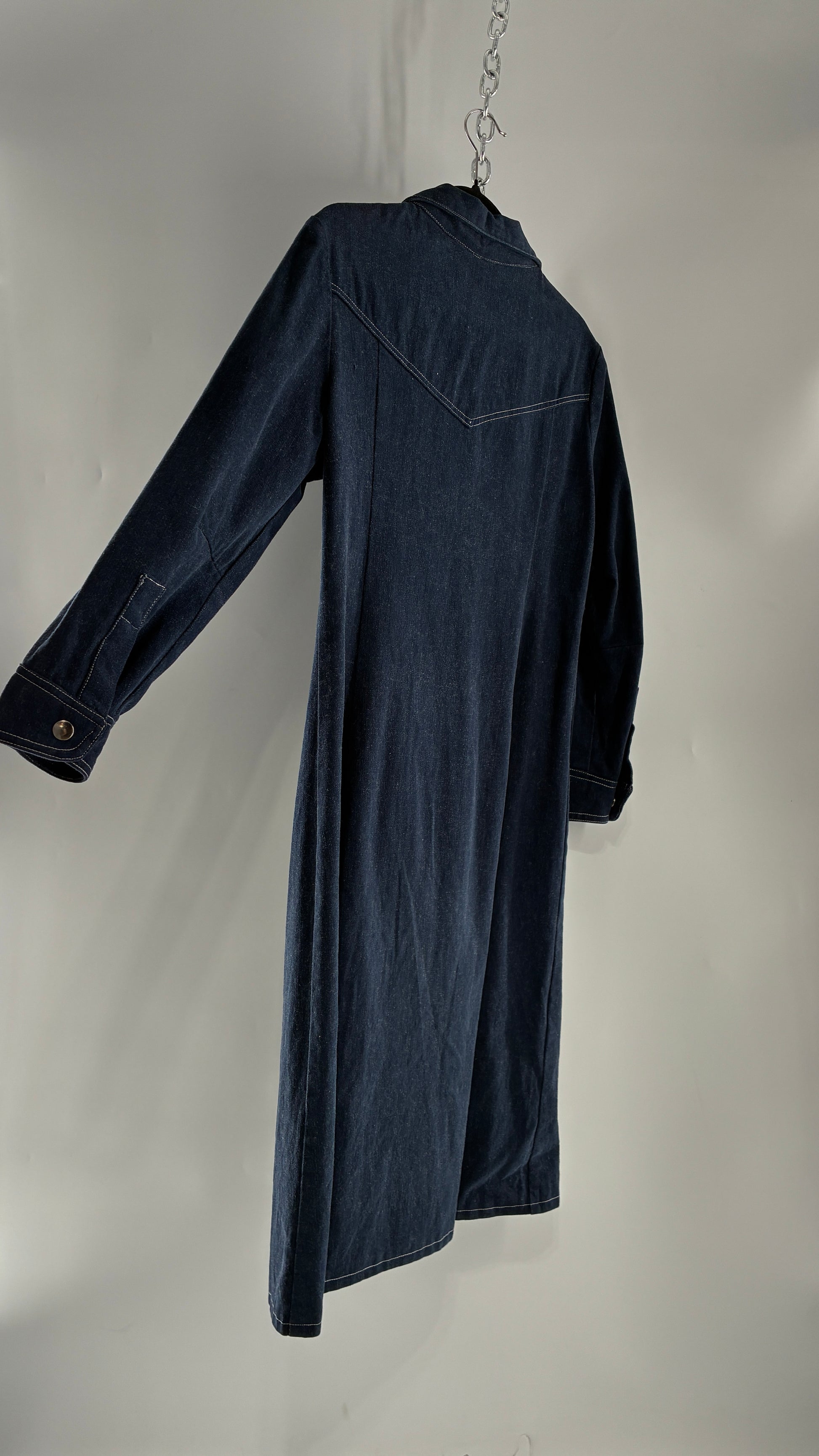 Vintage Dark Wash Denim Long Sleeve Collared Midi Dress with Contrast White Stitching (M/L)