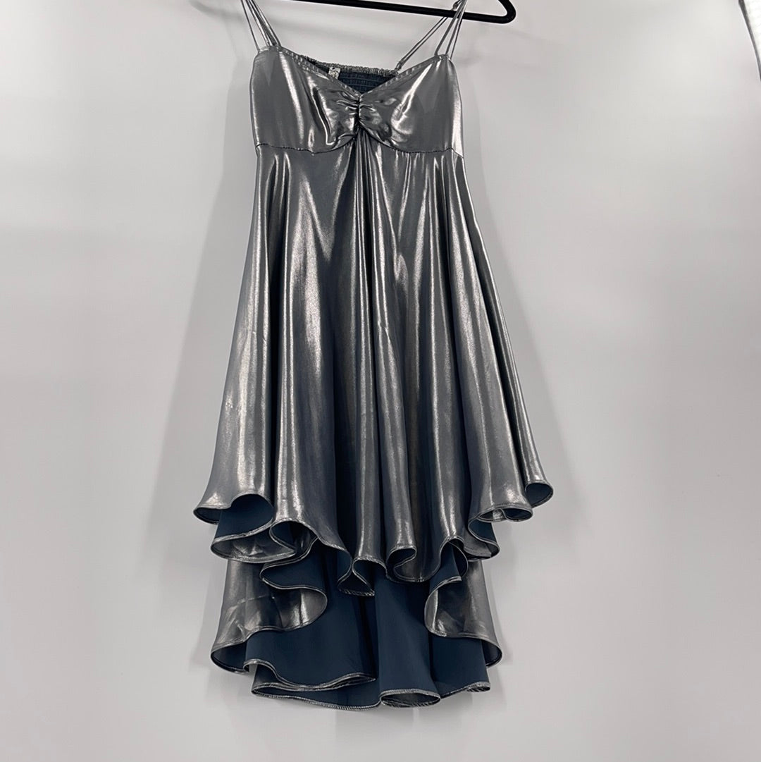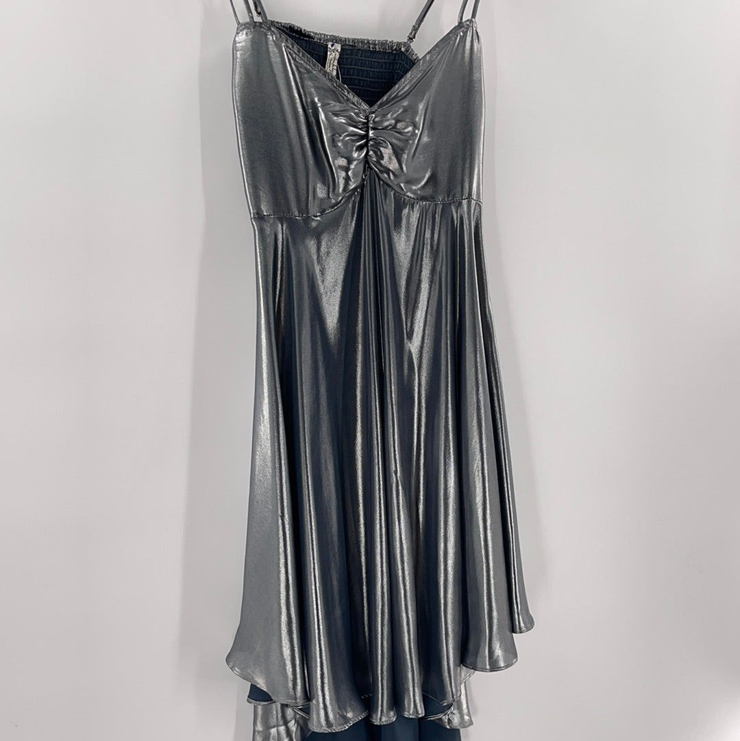 Intimately Free People Silver/Platinum molten/liquid metal dress with open back and ruched bust