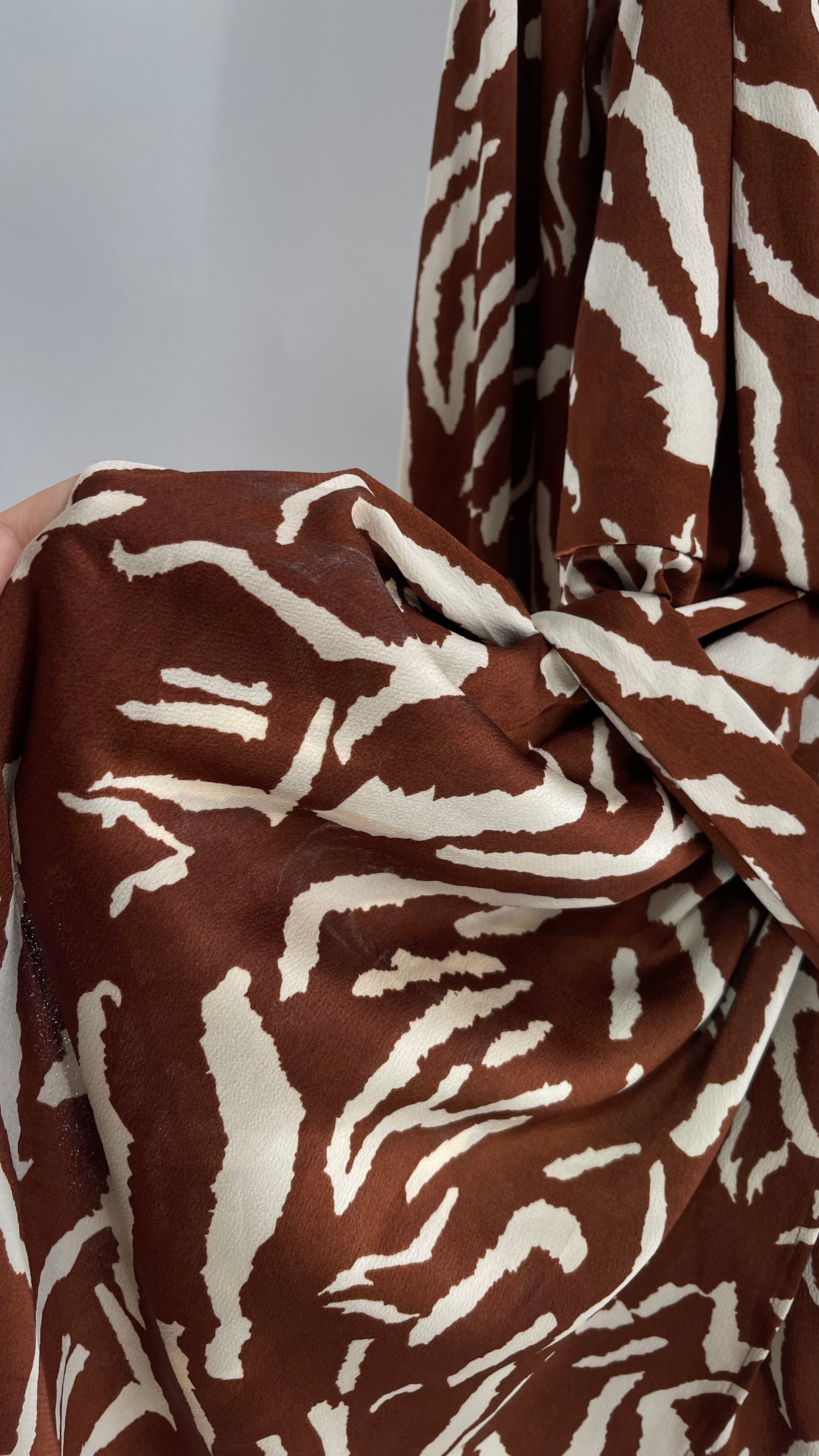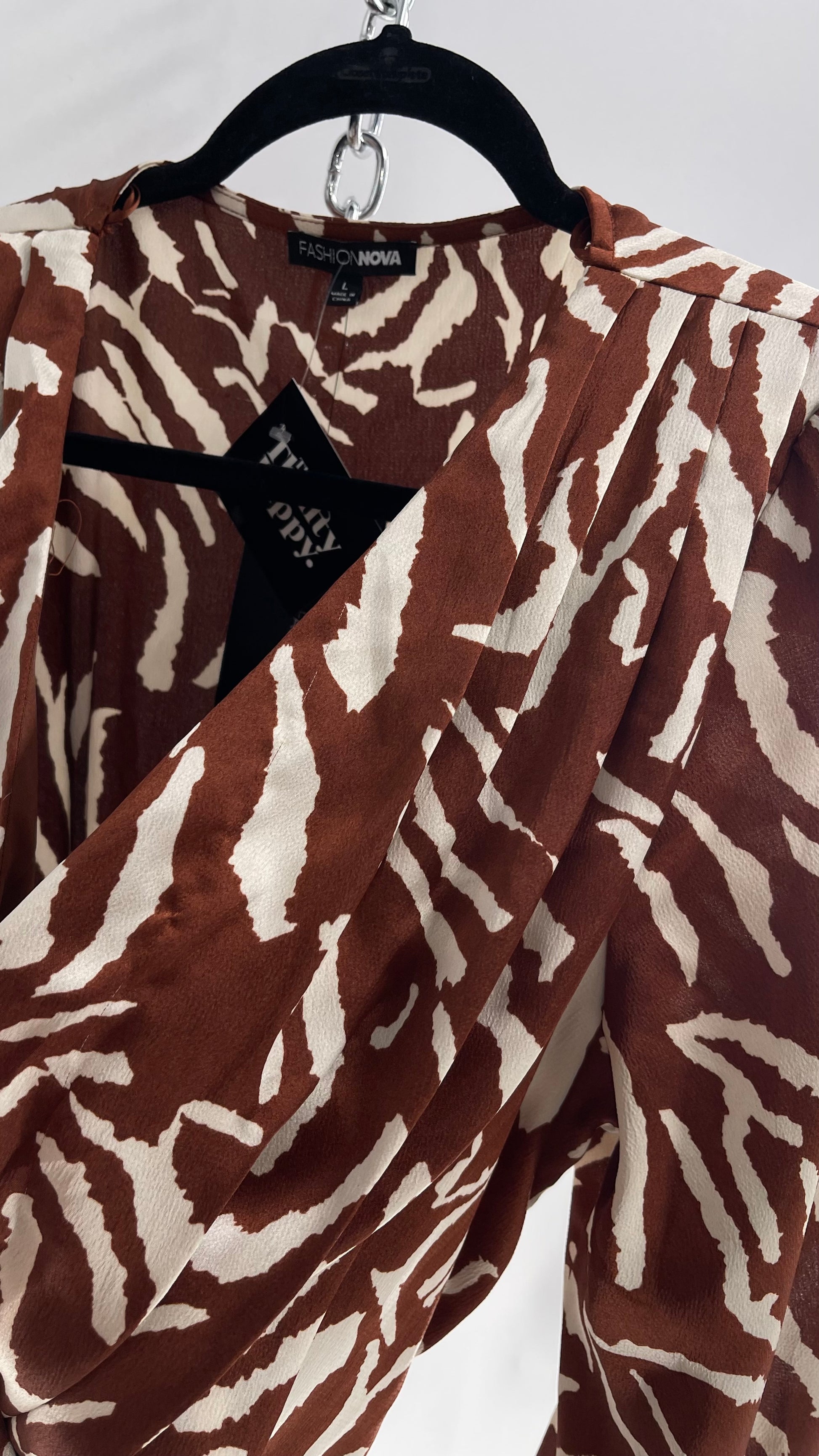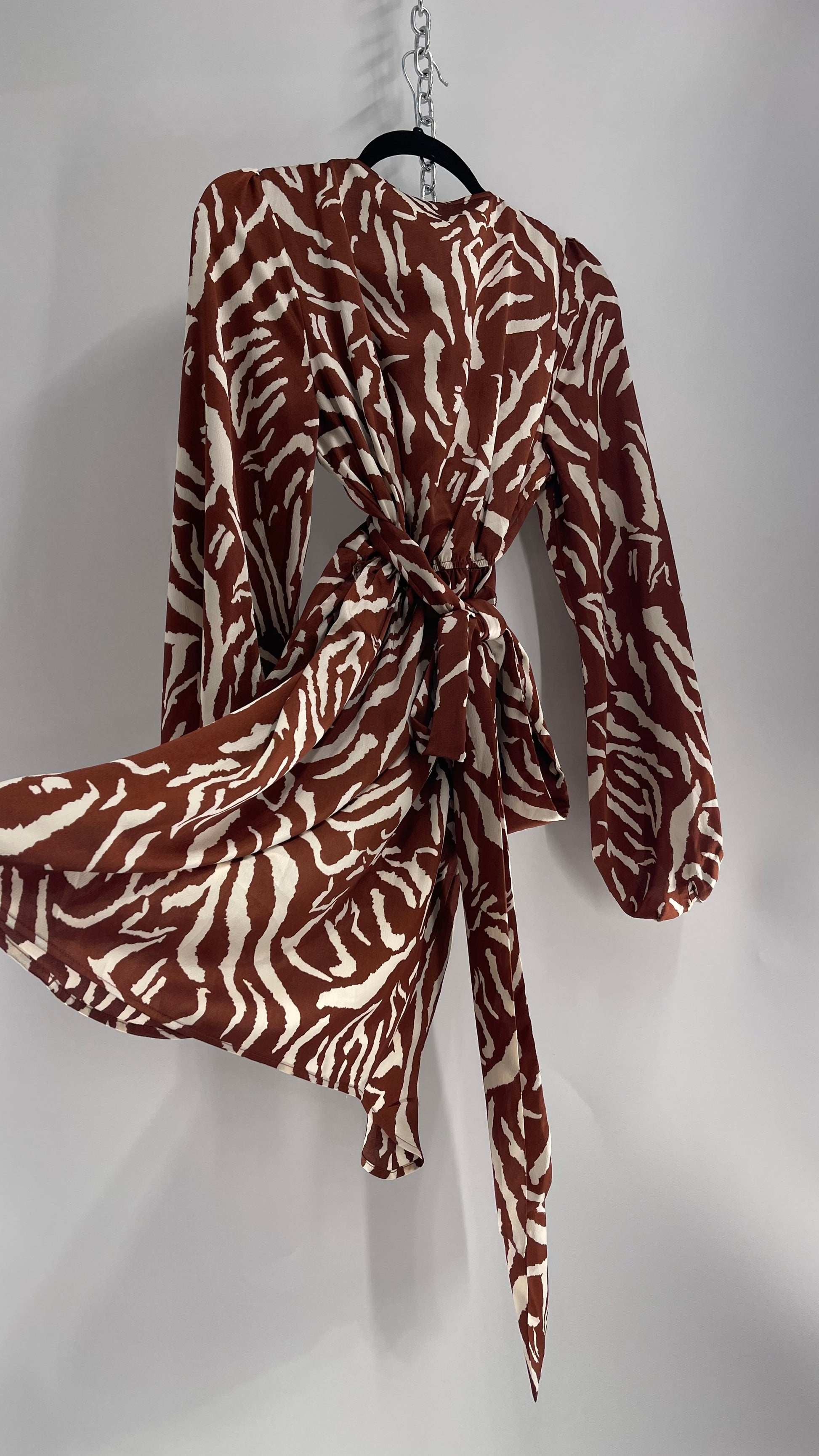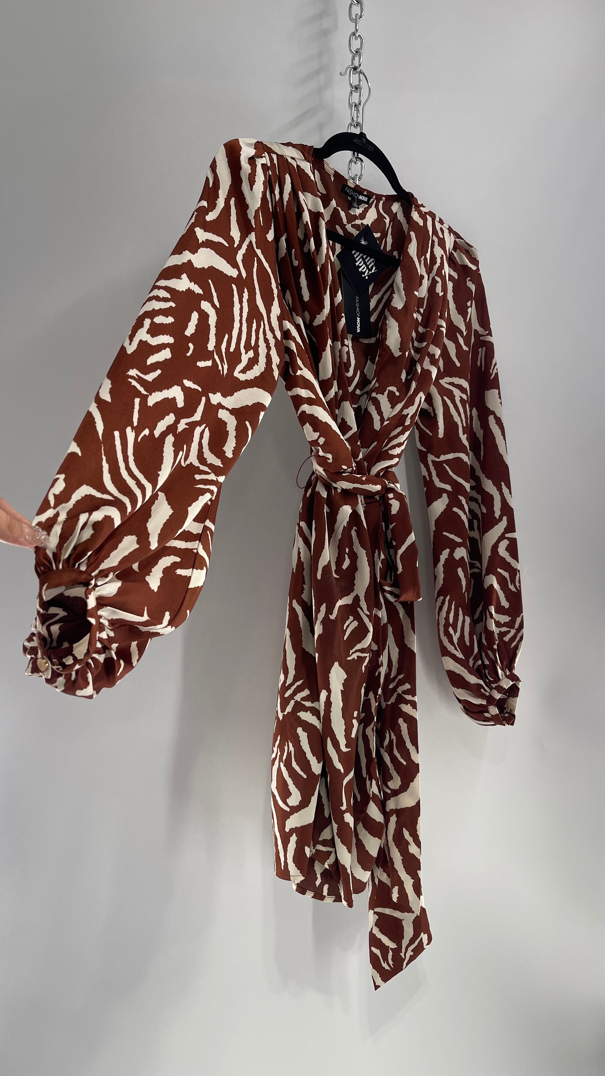 FASHIONNOVA Brown White Bubble Sleeve Zebra Waist Tie Dress with Tags Attached (Large)