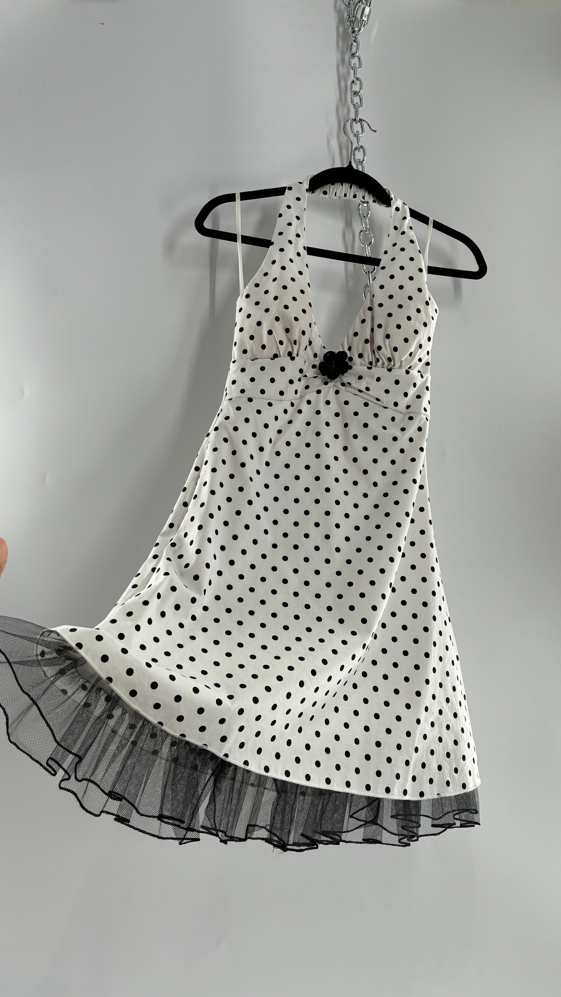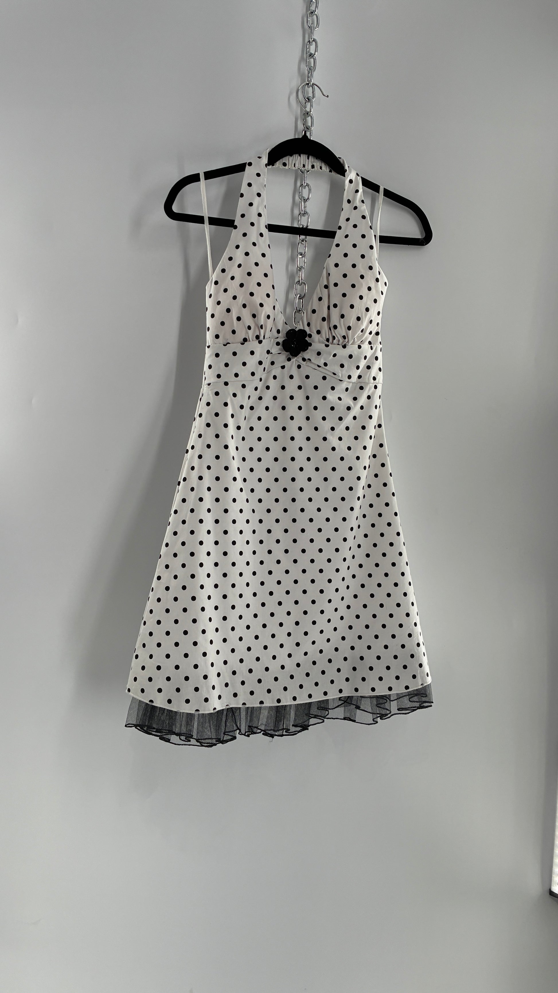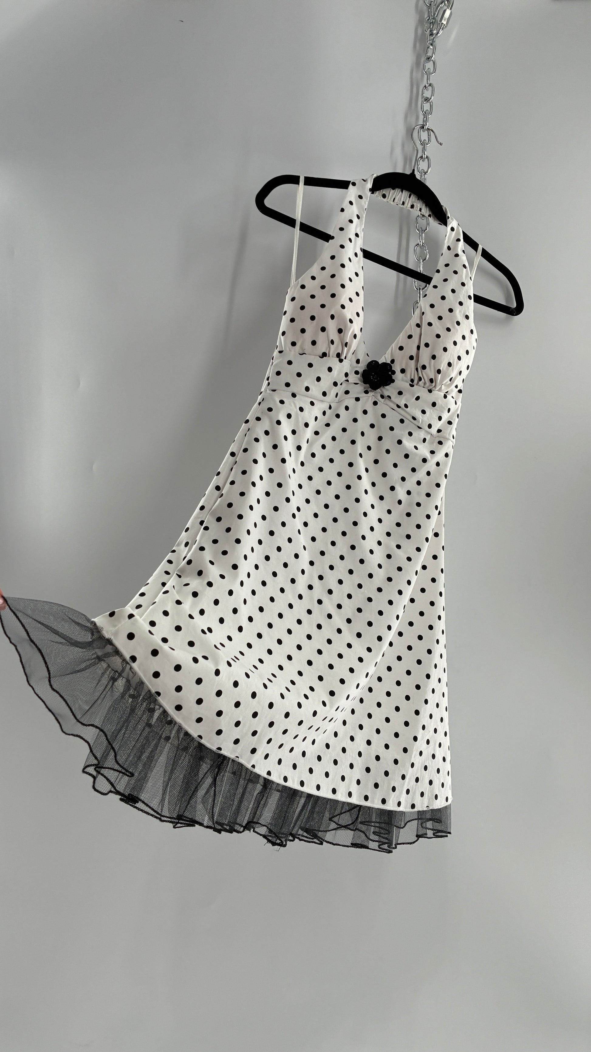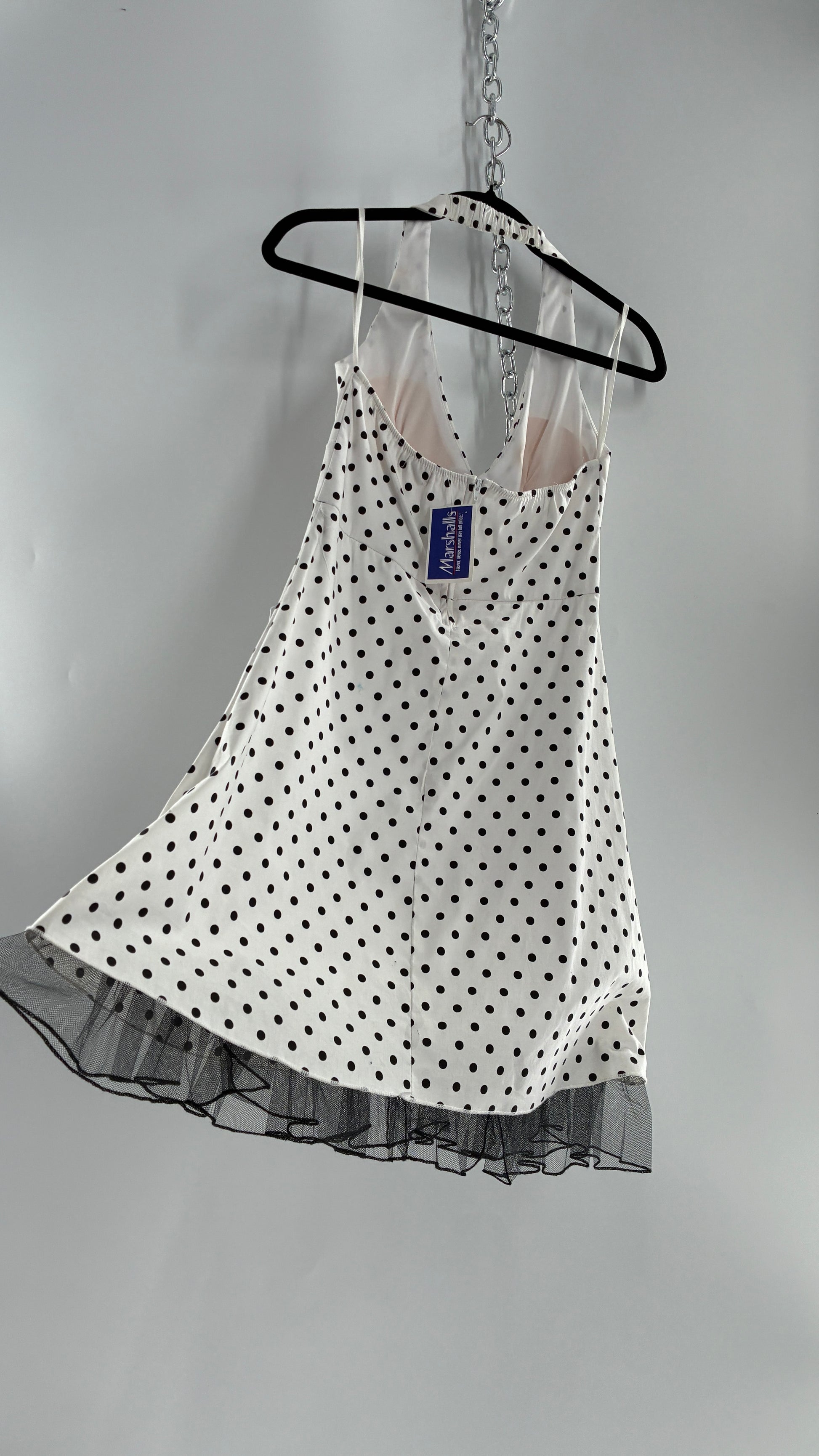 Deadstock Vintage Ruby Rox Retro Style White and Black Polka Dotted Mini Dress with Tulle Trim (7)