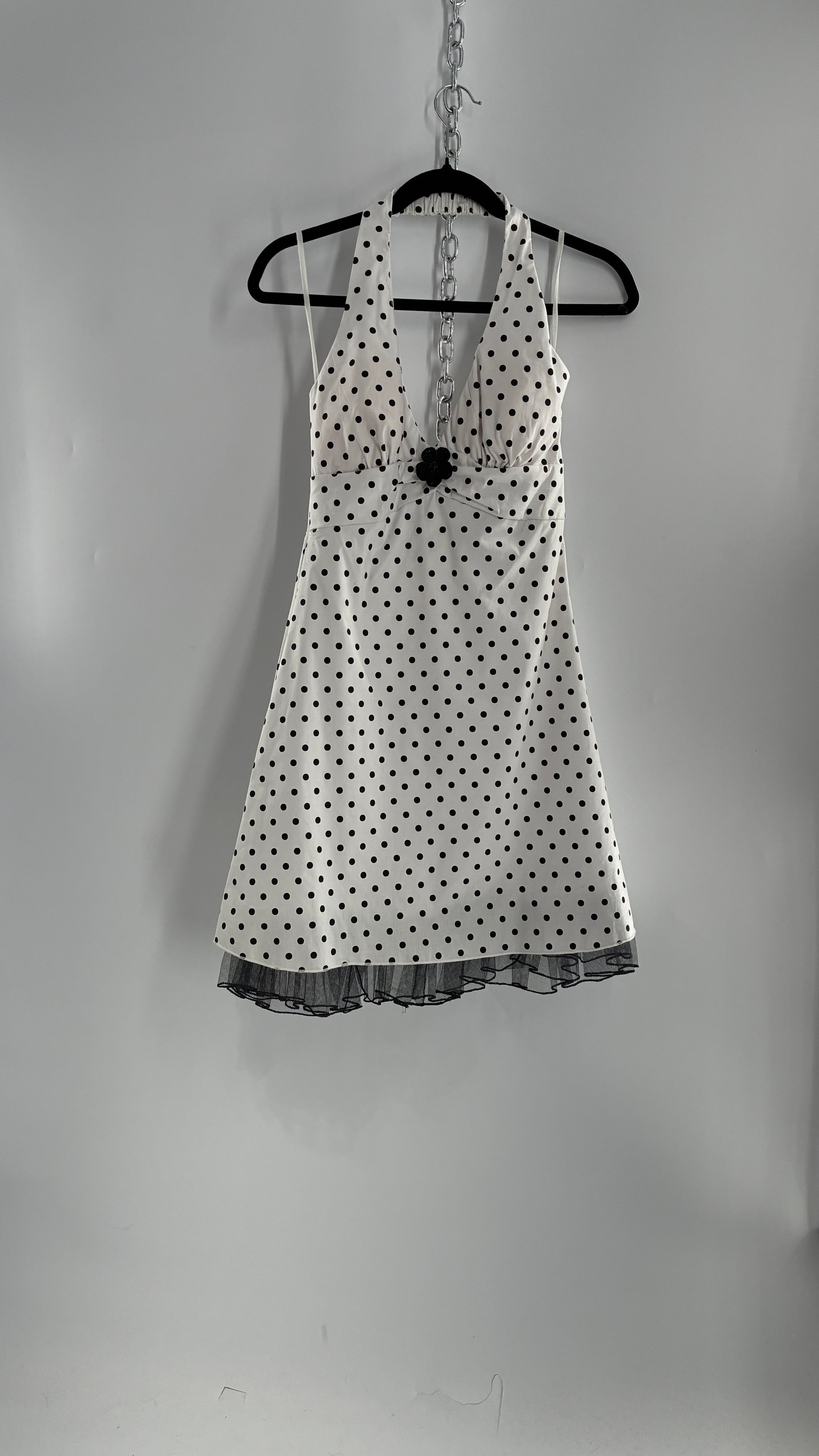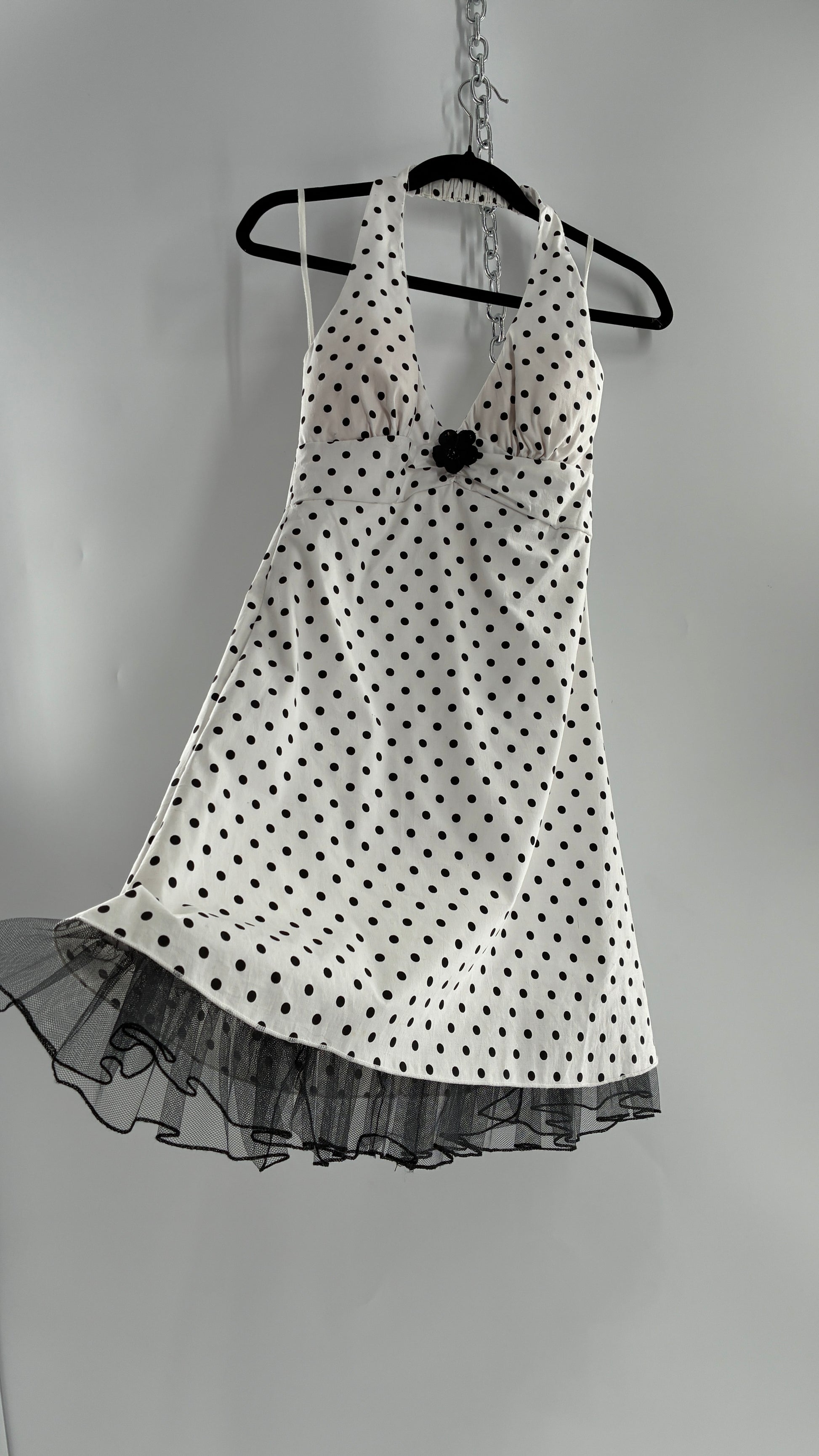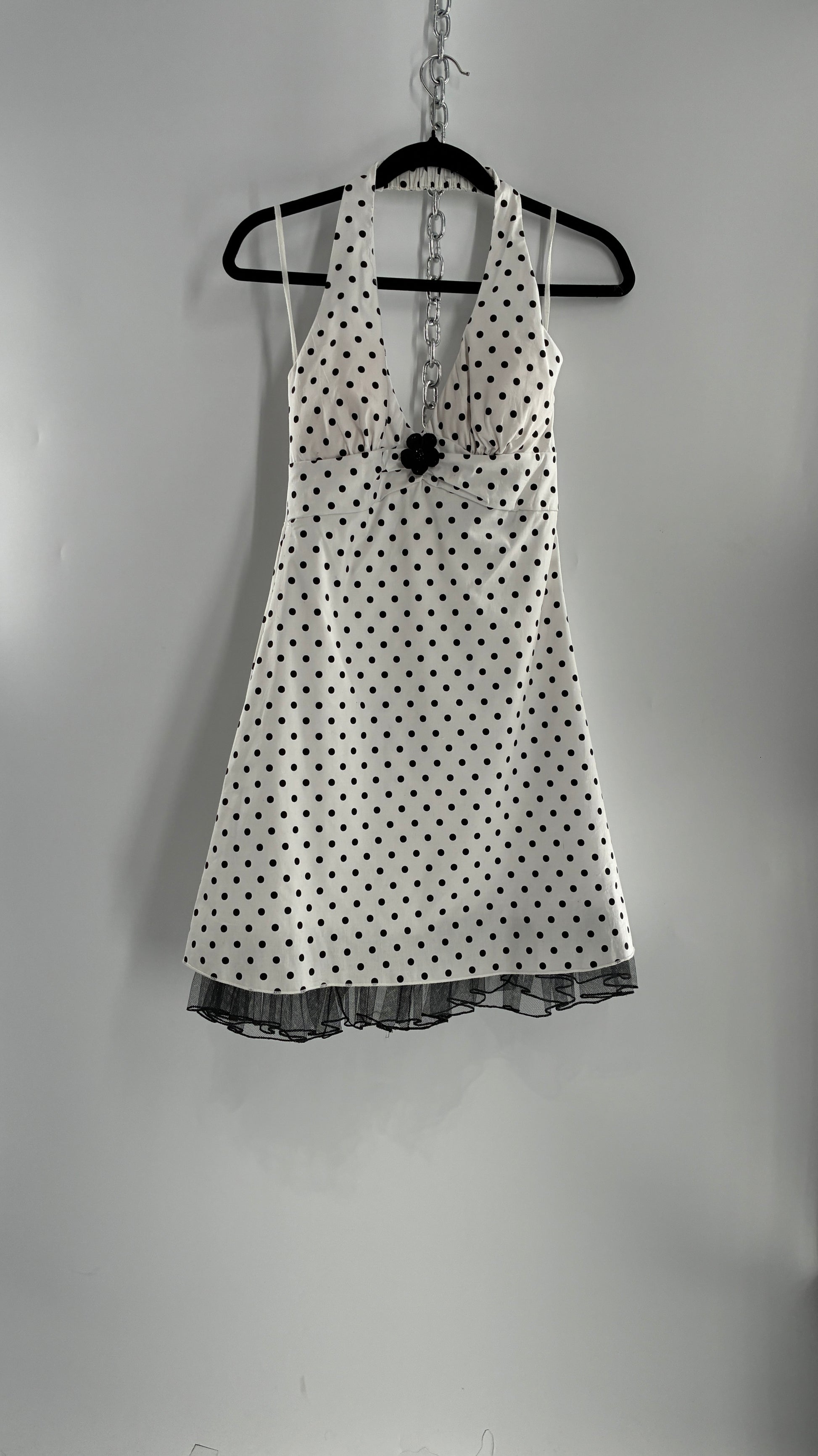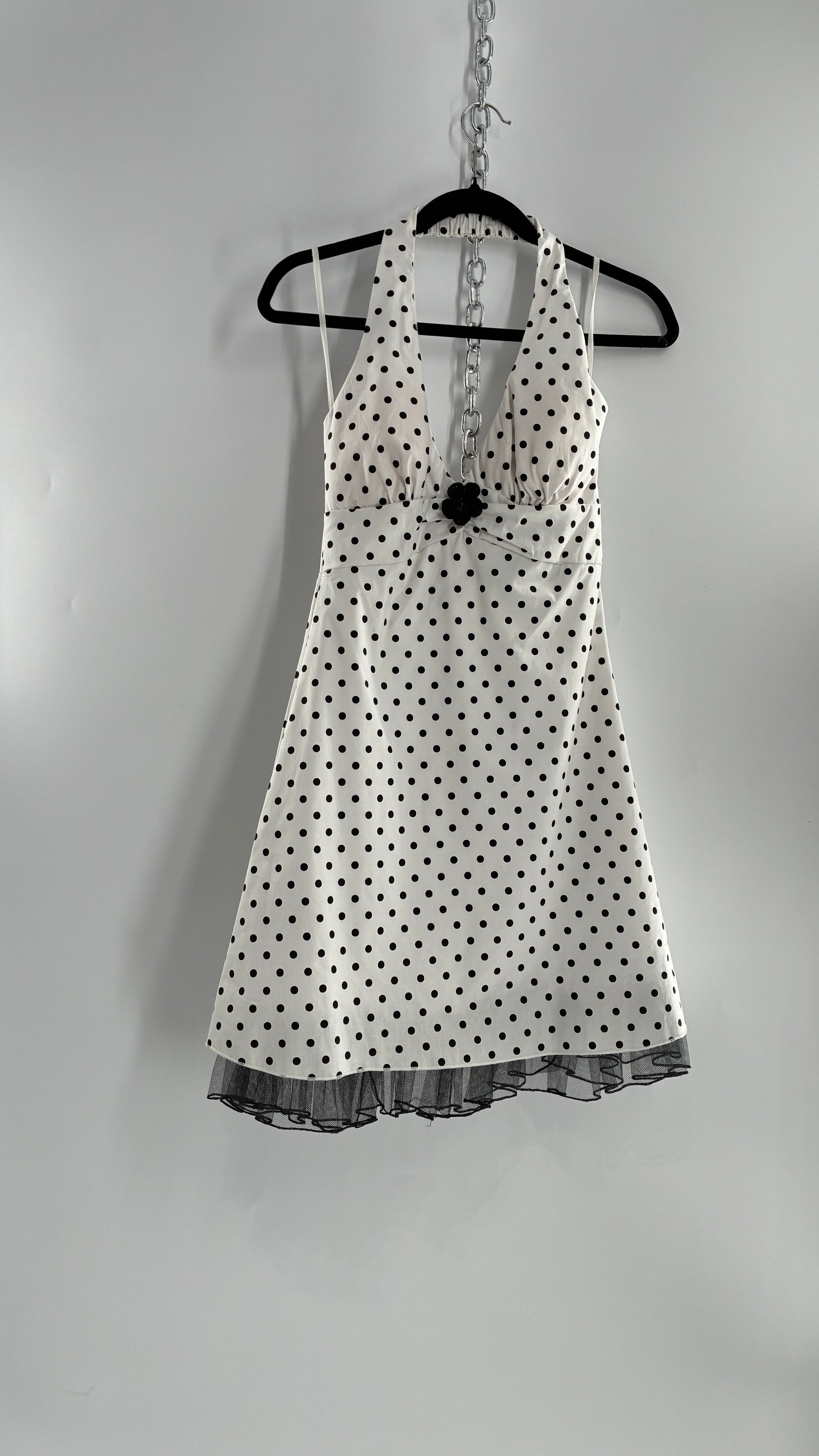 Deadstock Vintage Ruby Rox Retro Style White and Black Polka Dotted Mini Dress with Tulle Trim (7)