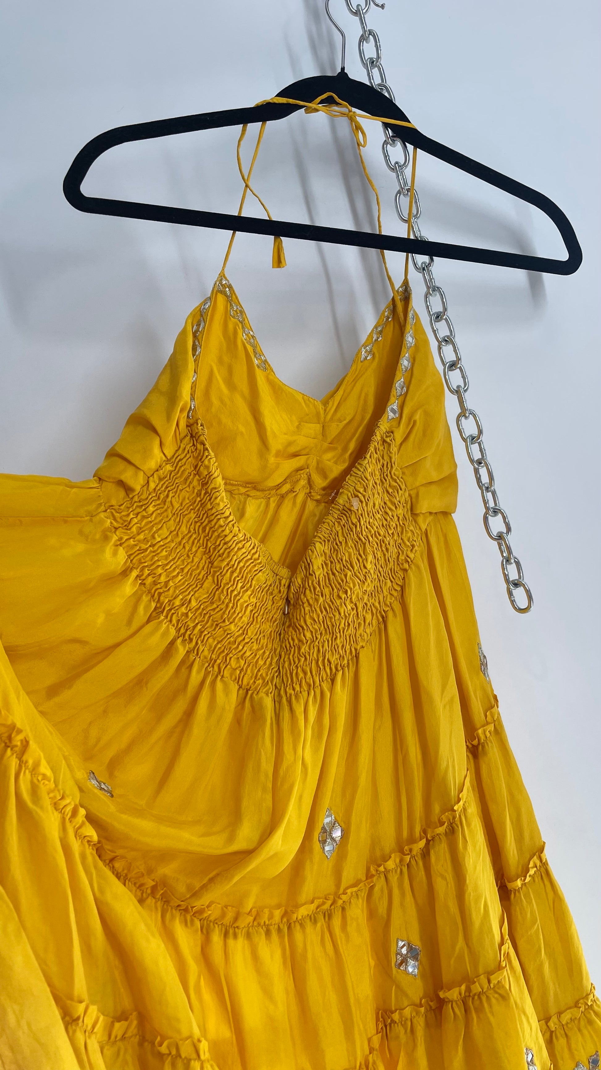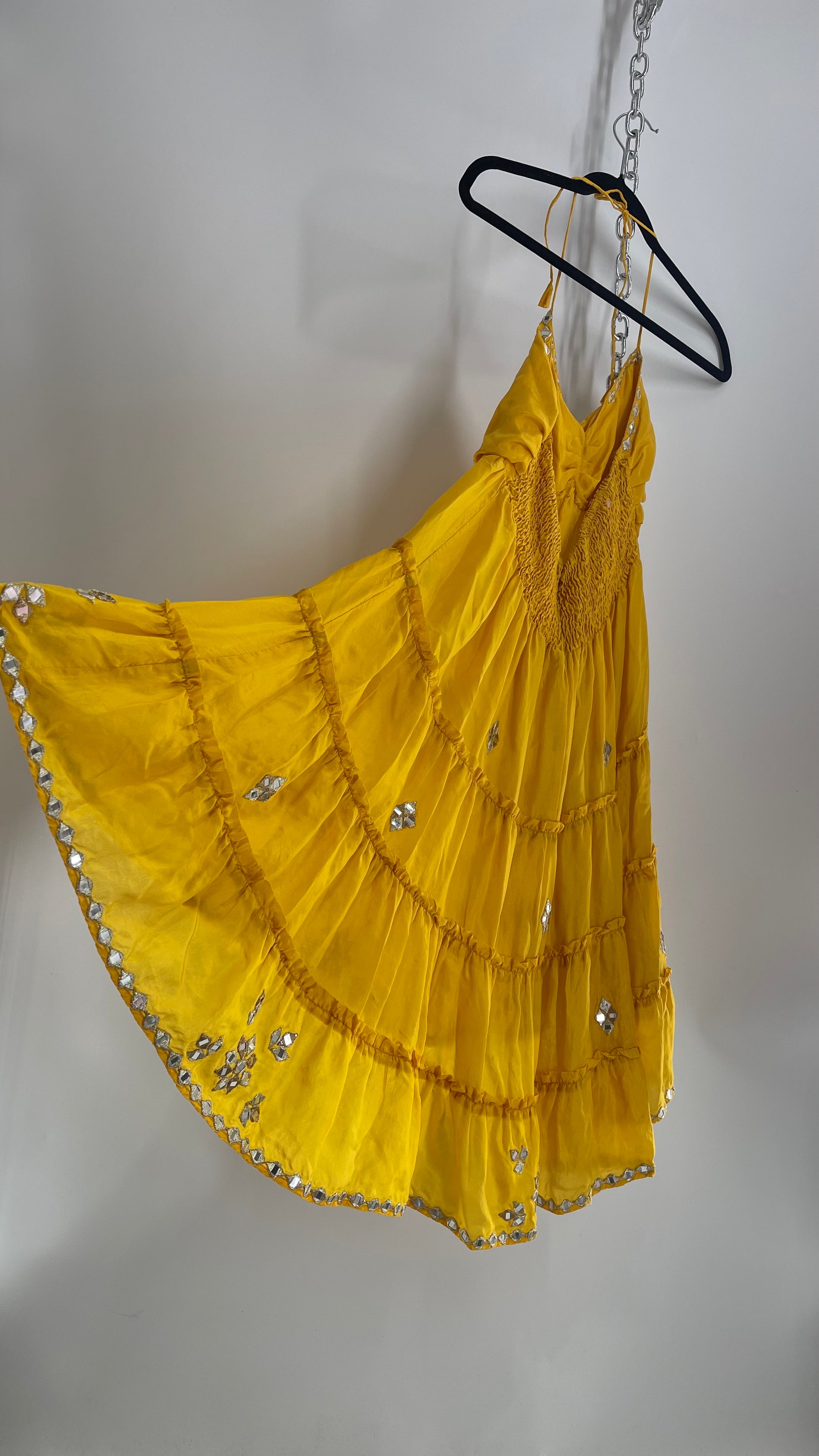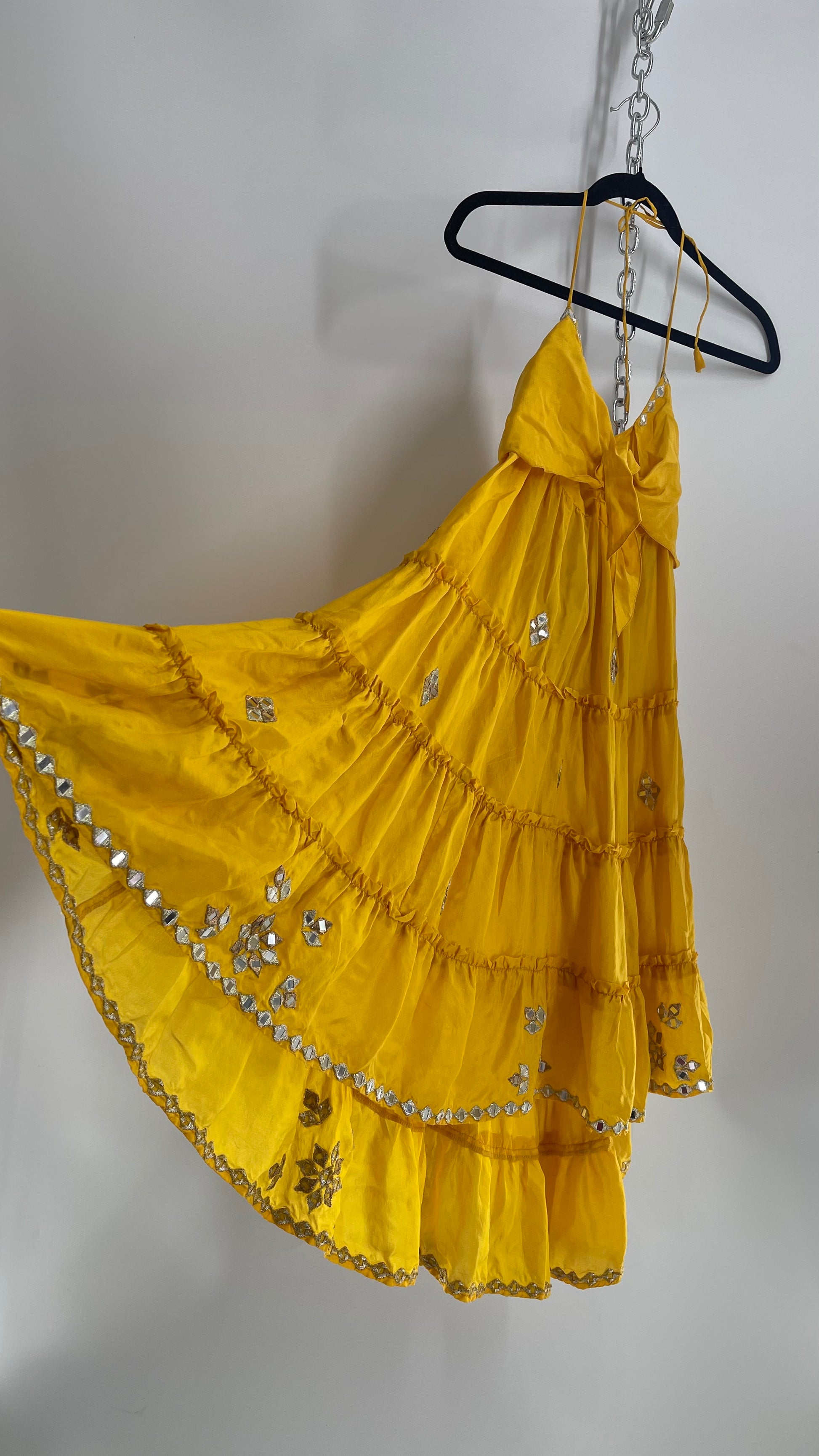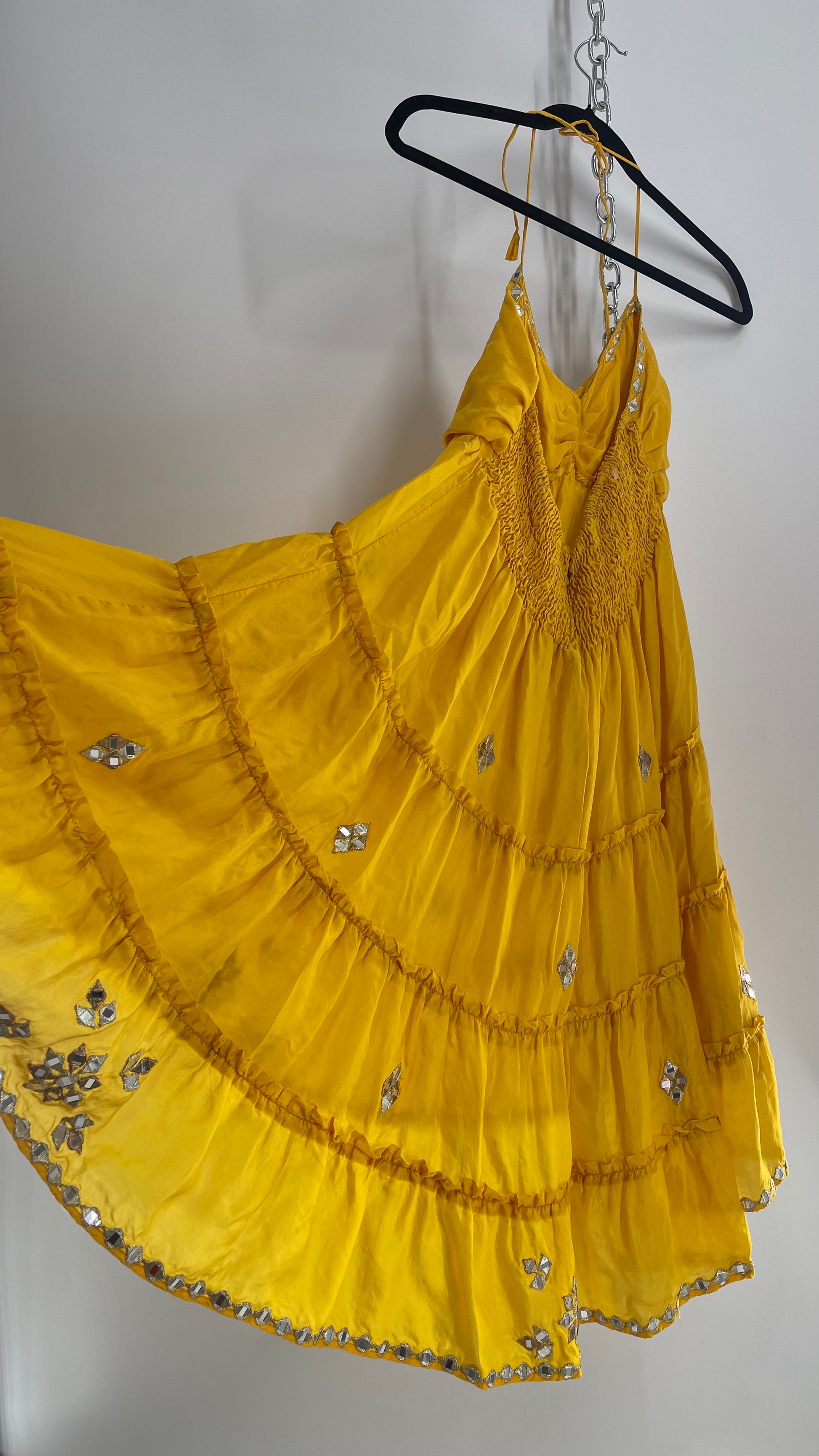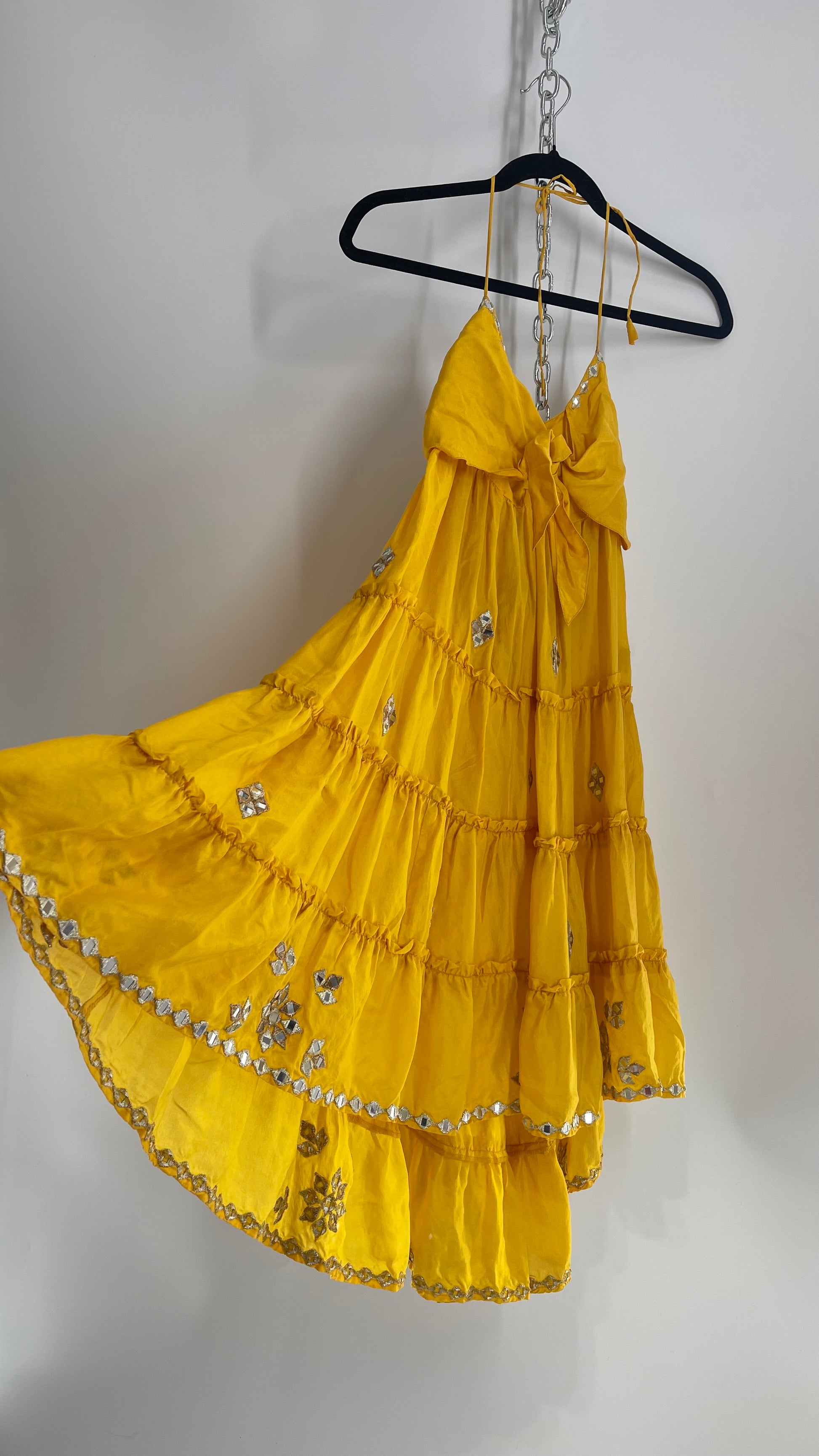 Vintage Juliet Dun Silky Yellow Tiered Dress with Mirror Details (2)