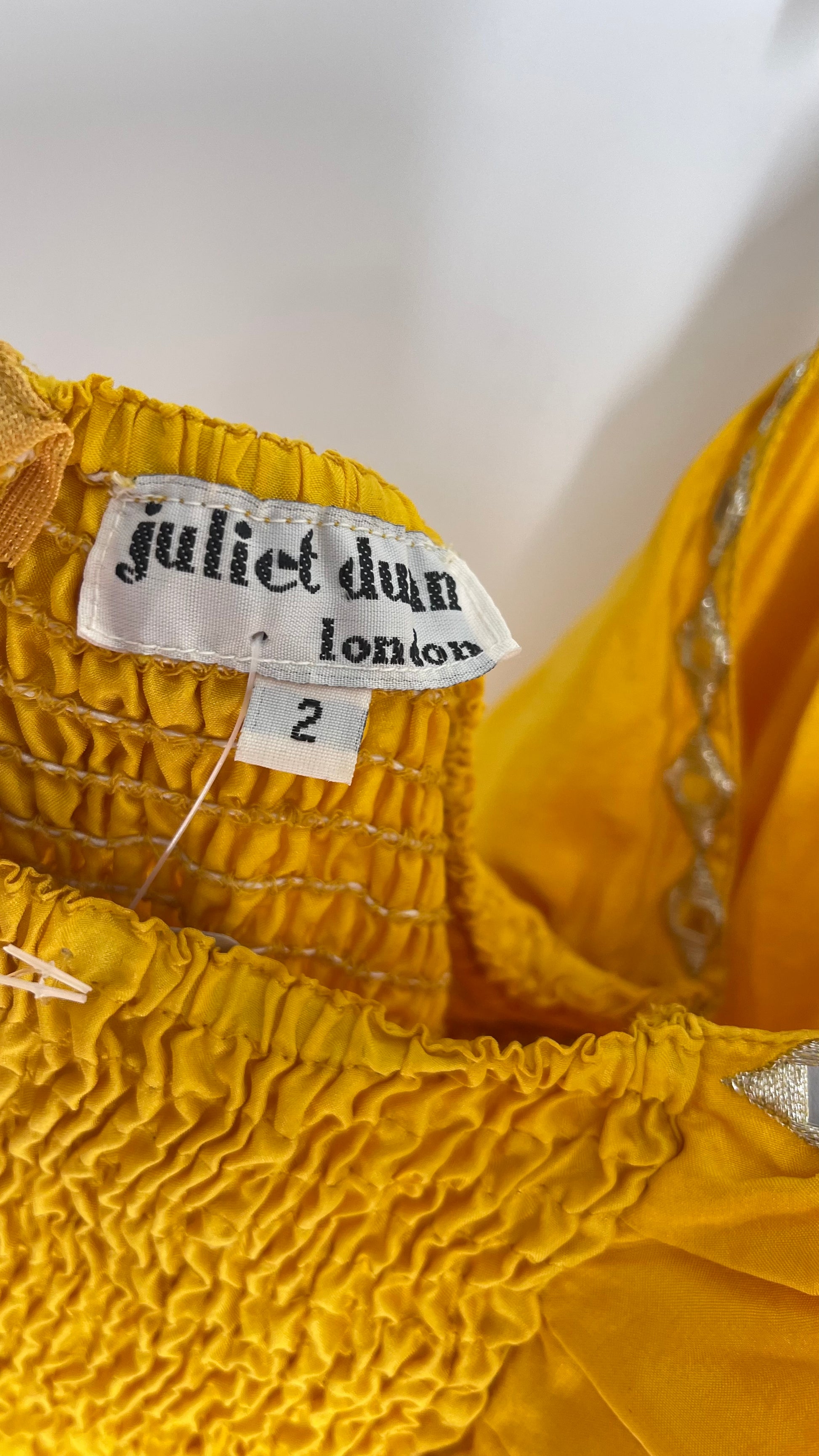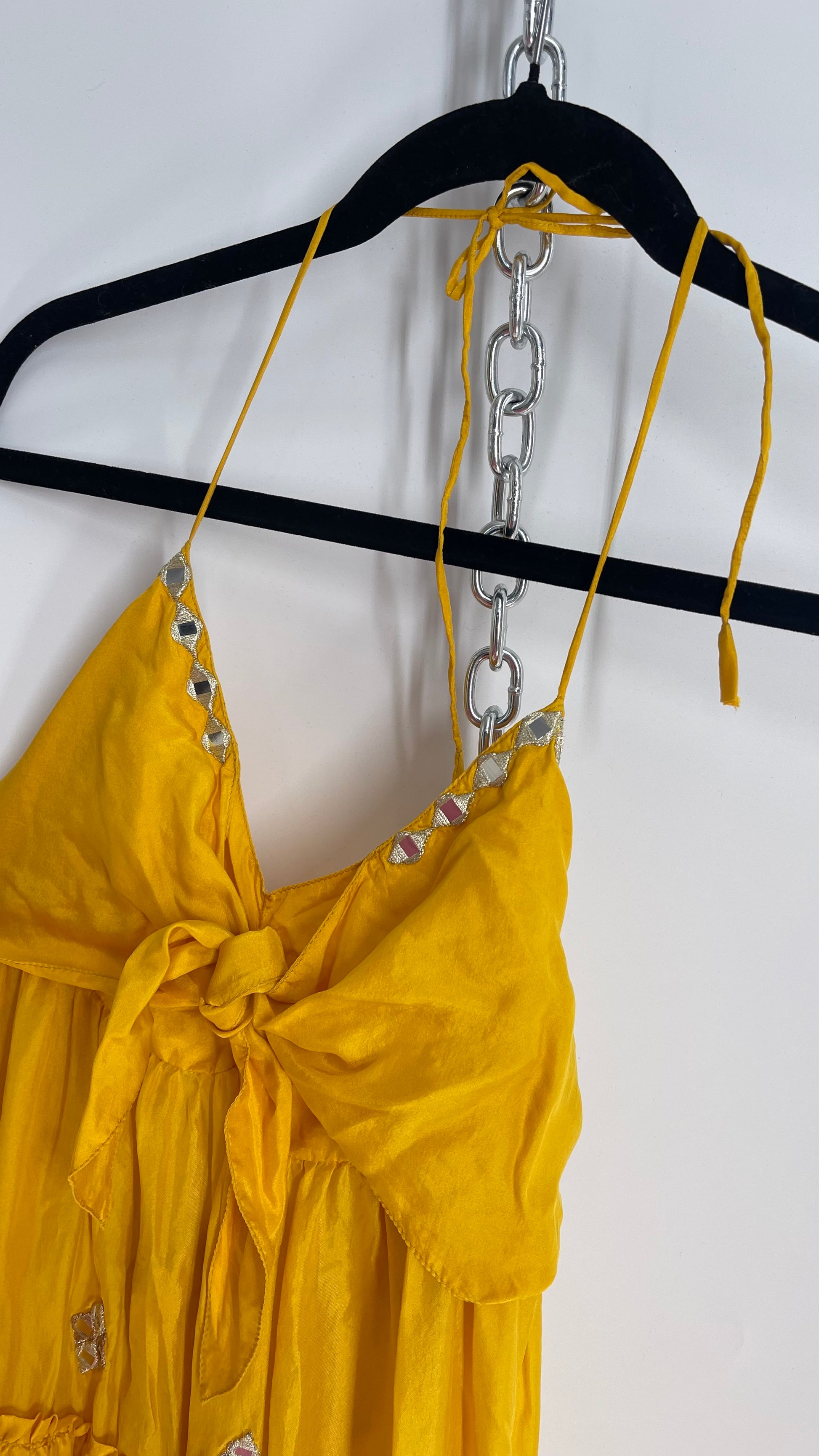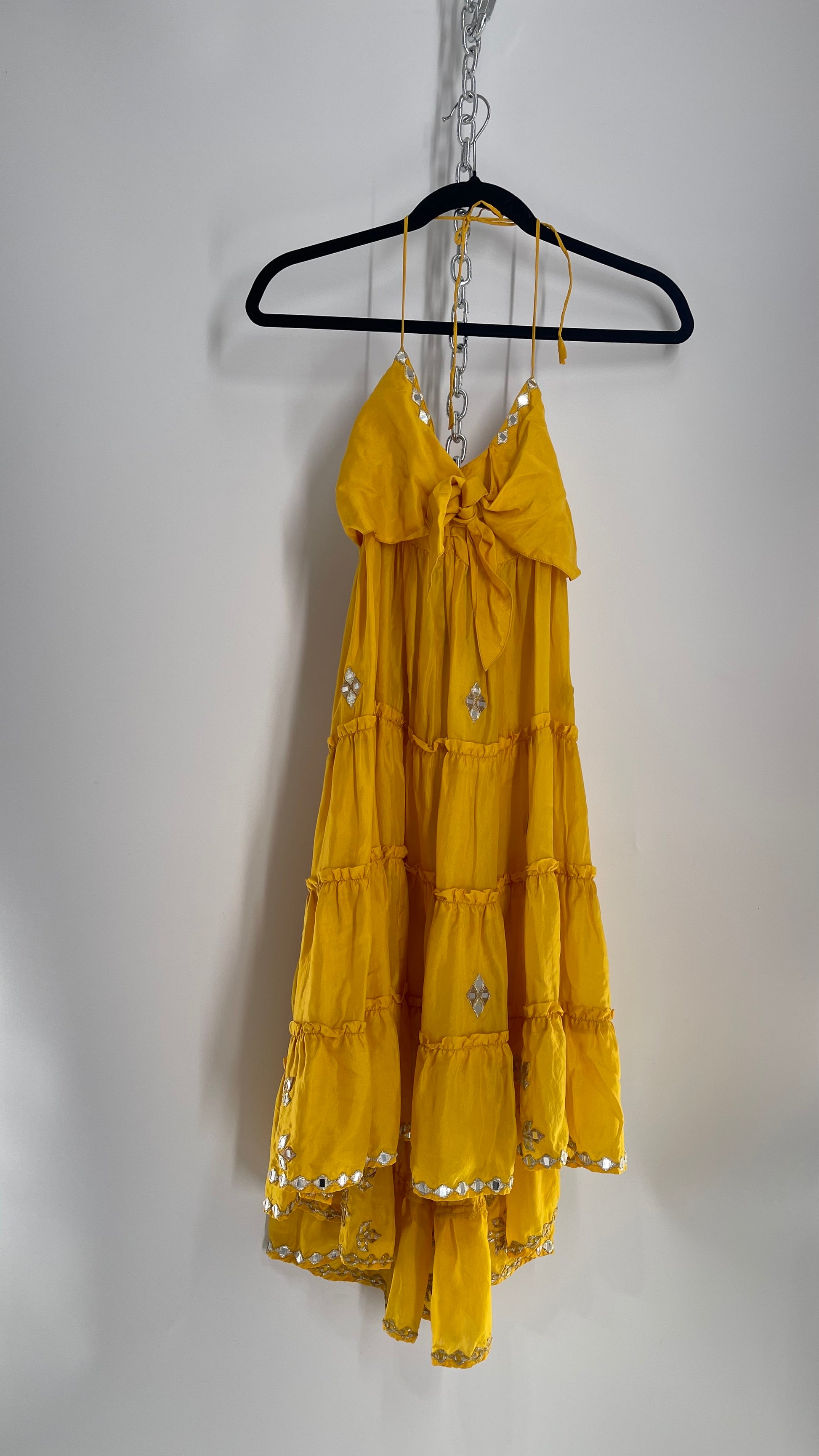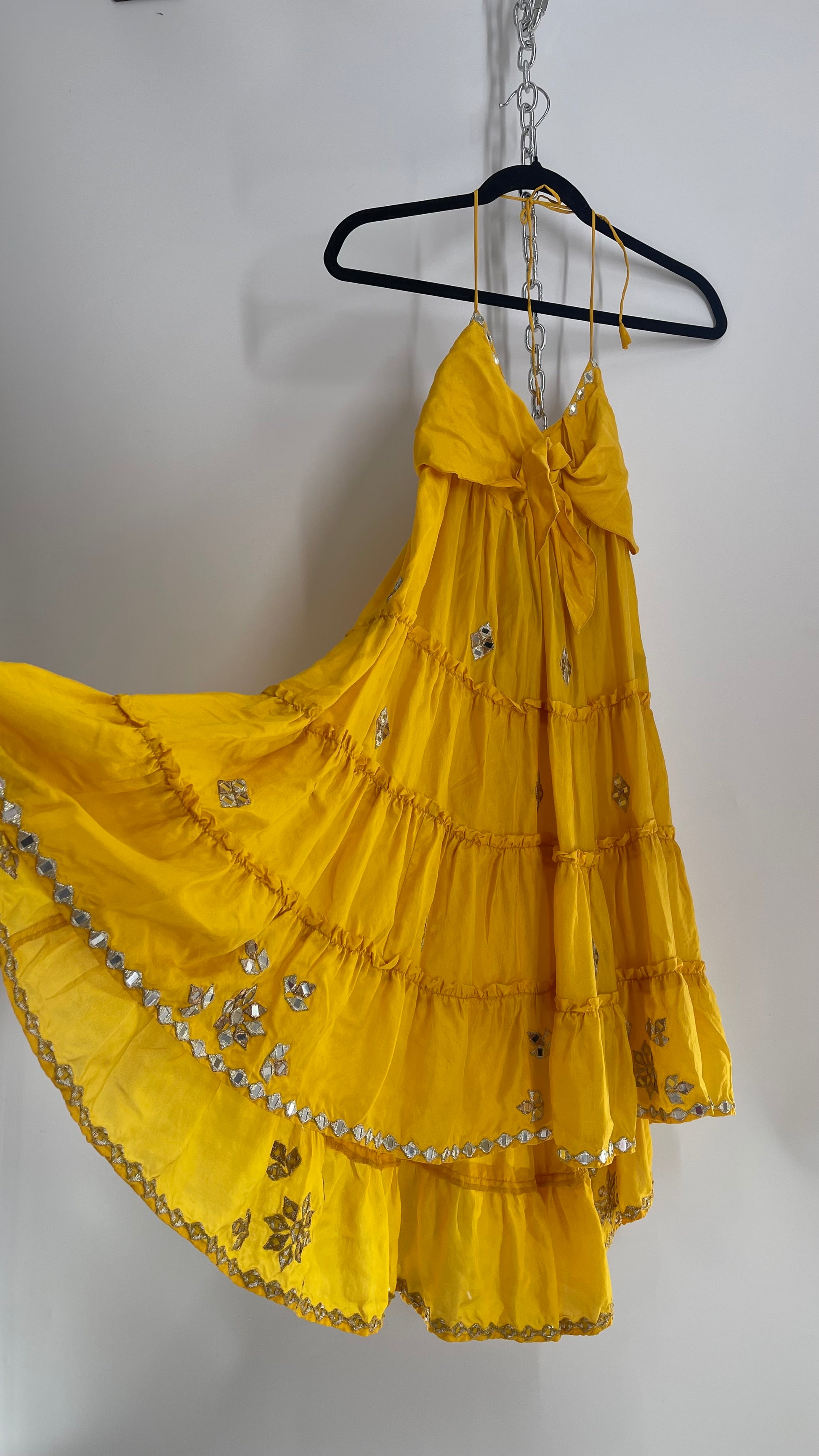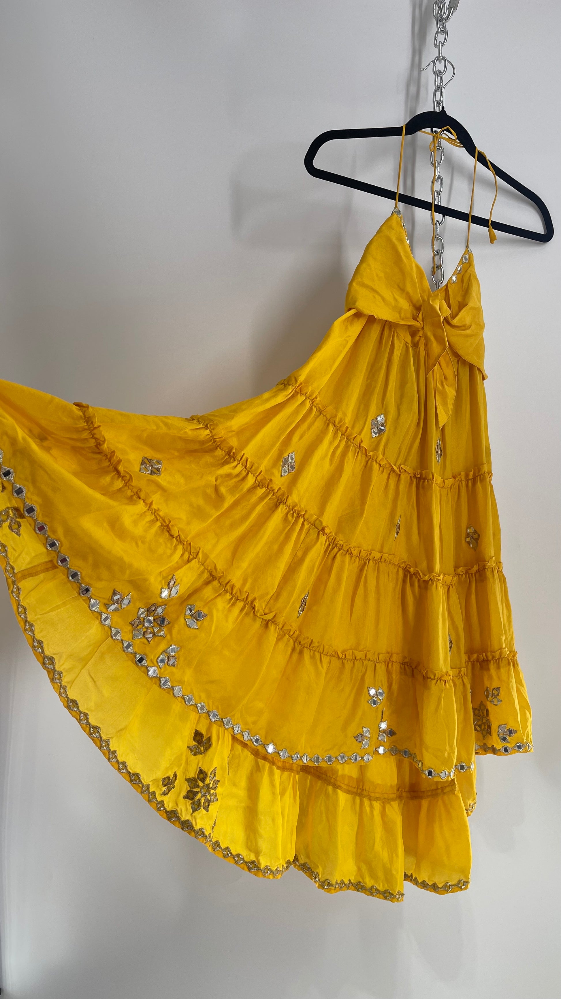 Vintage Juliet Dun Silky Yellow Tiered Dress with Mirror Details (2)