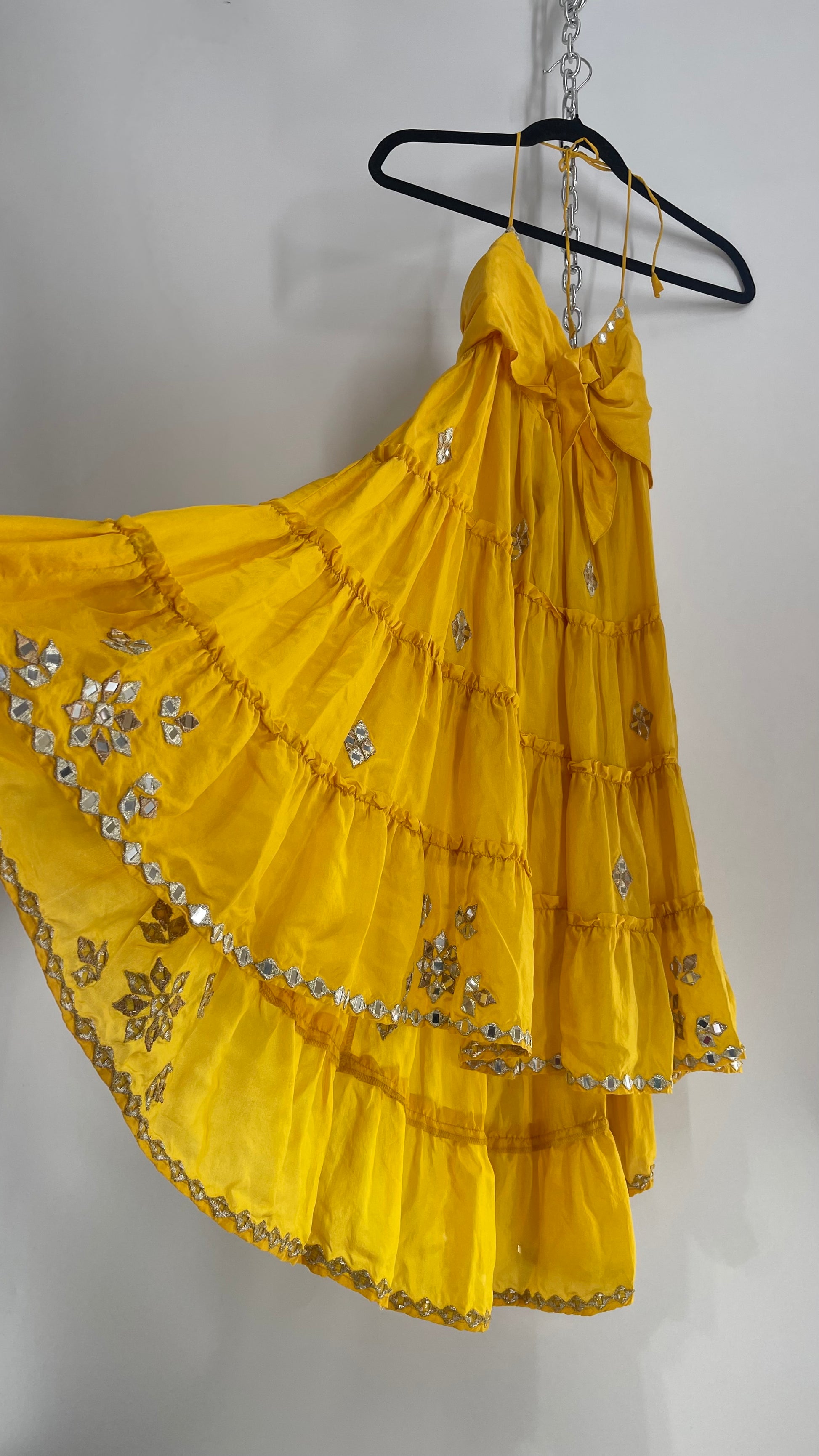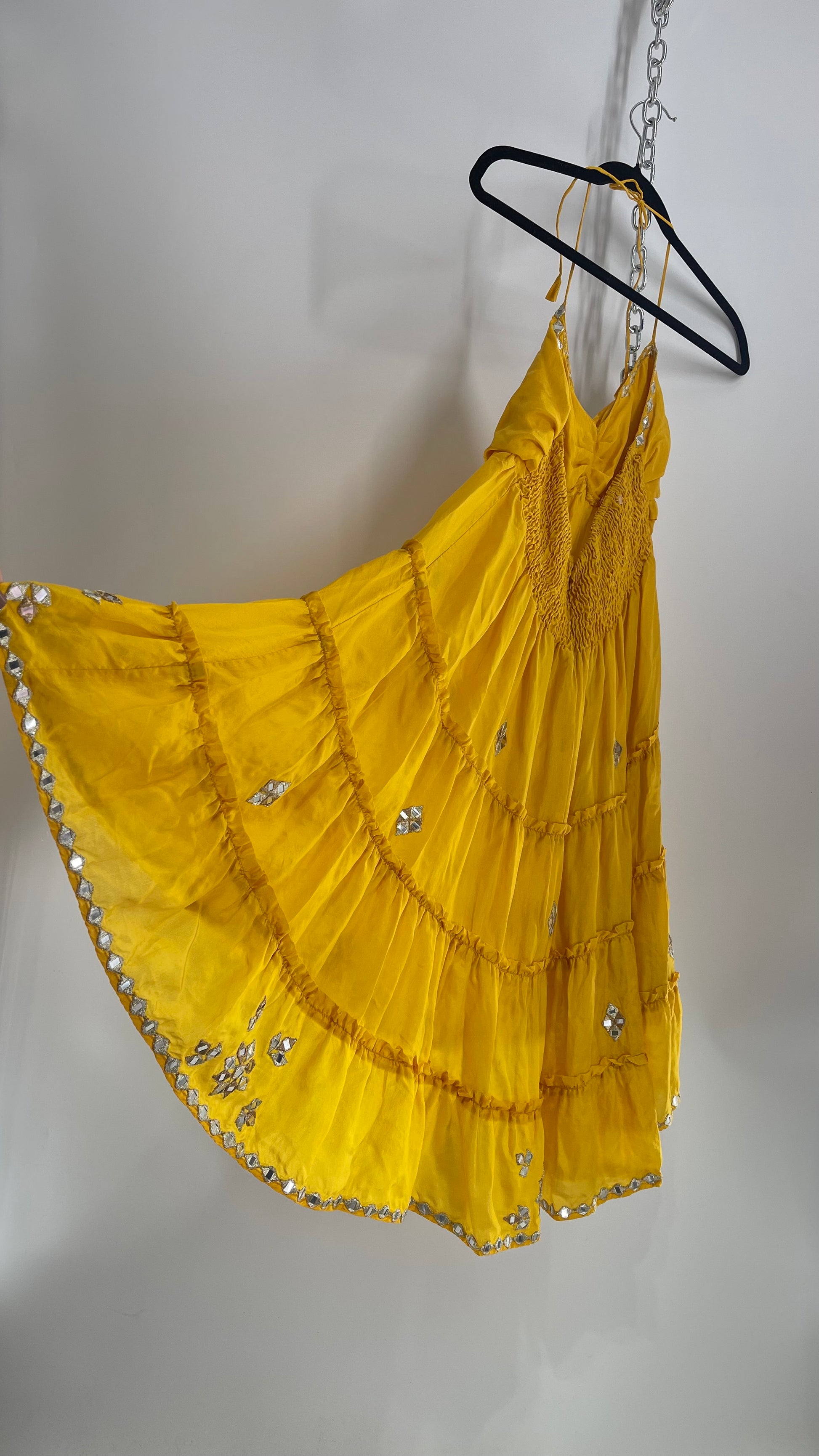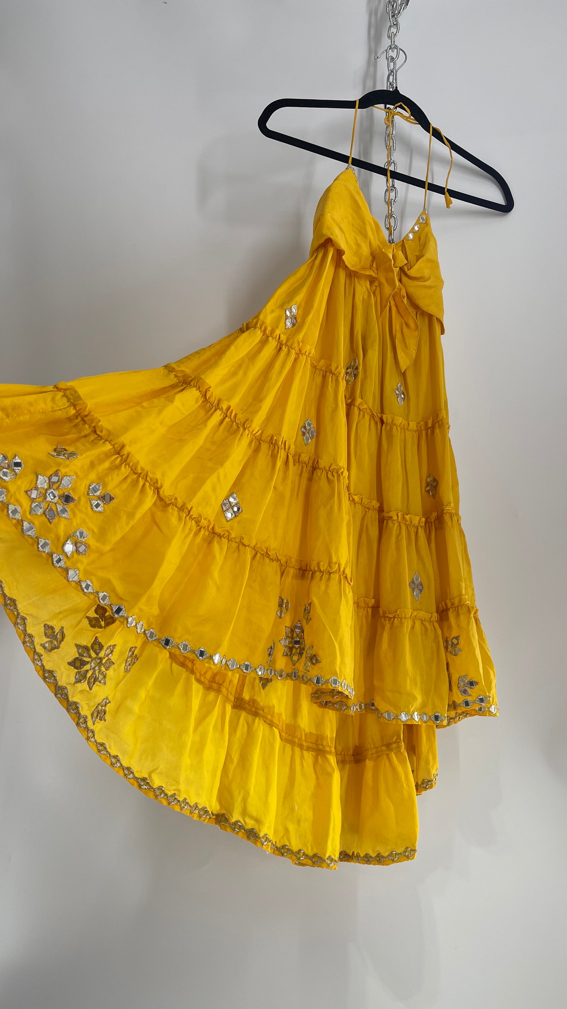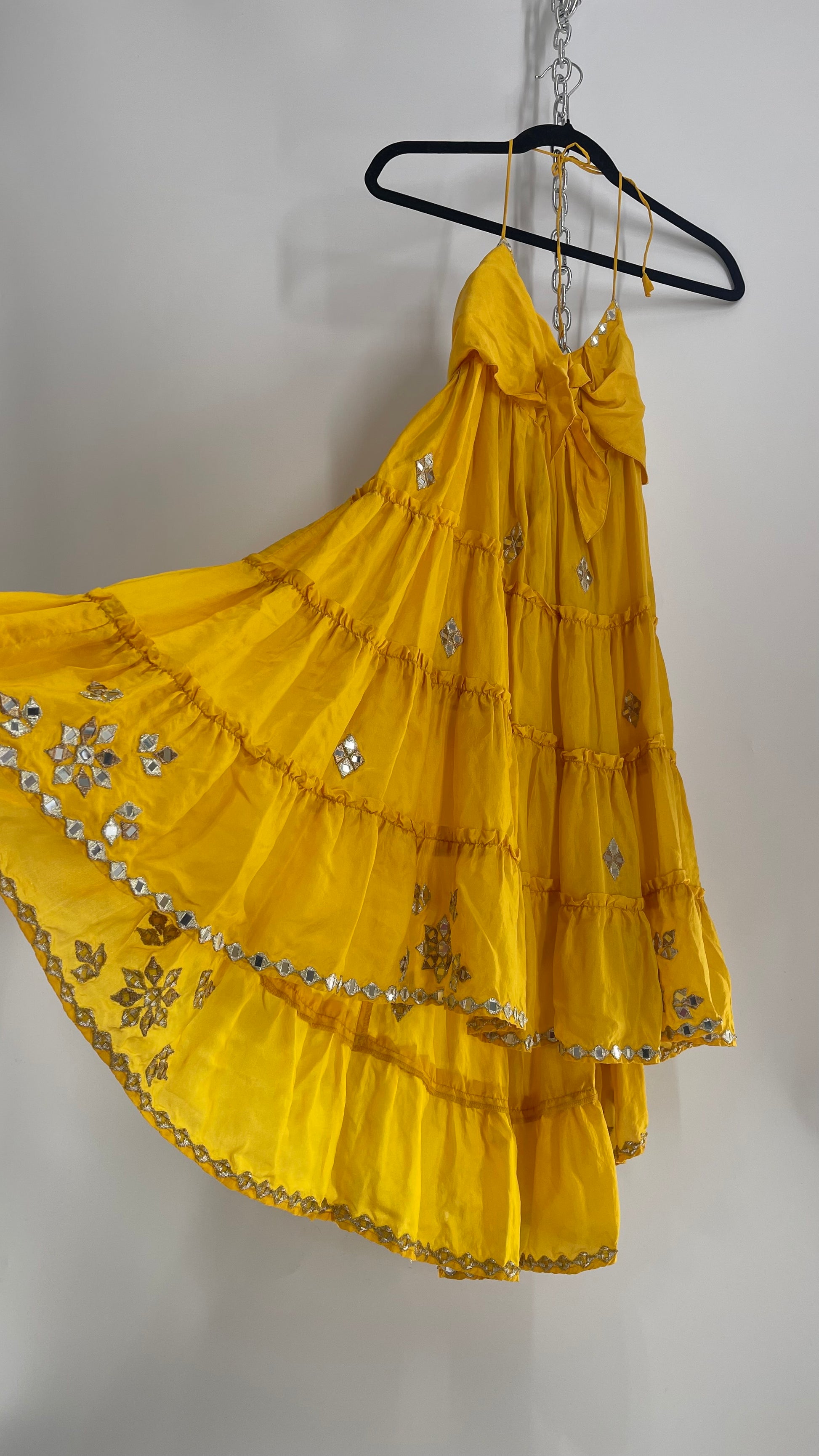 Vintage Juliet Dun Silky Yellow Tiered Dress with Mirror Details