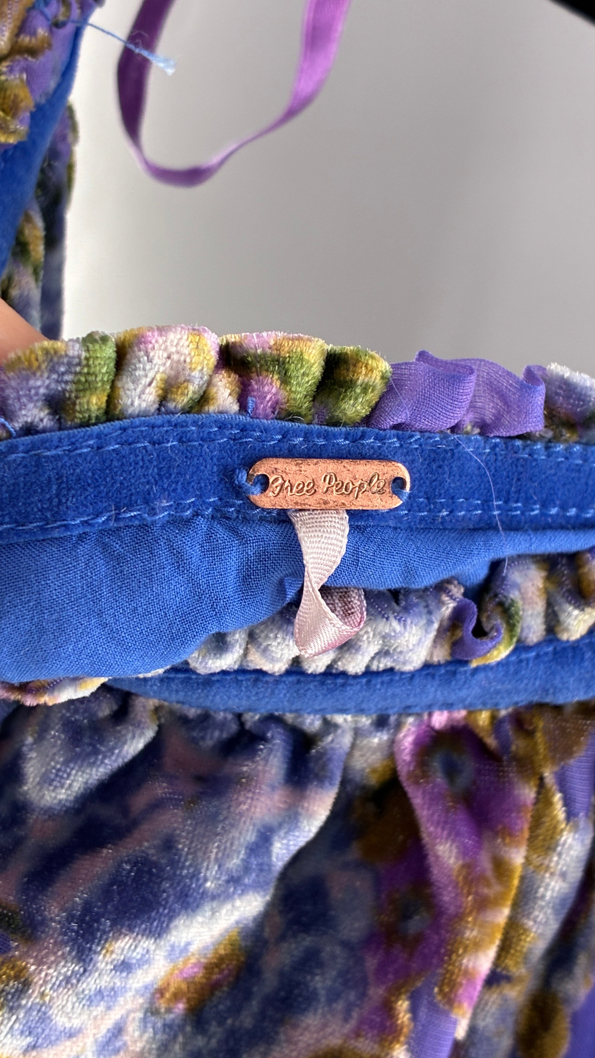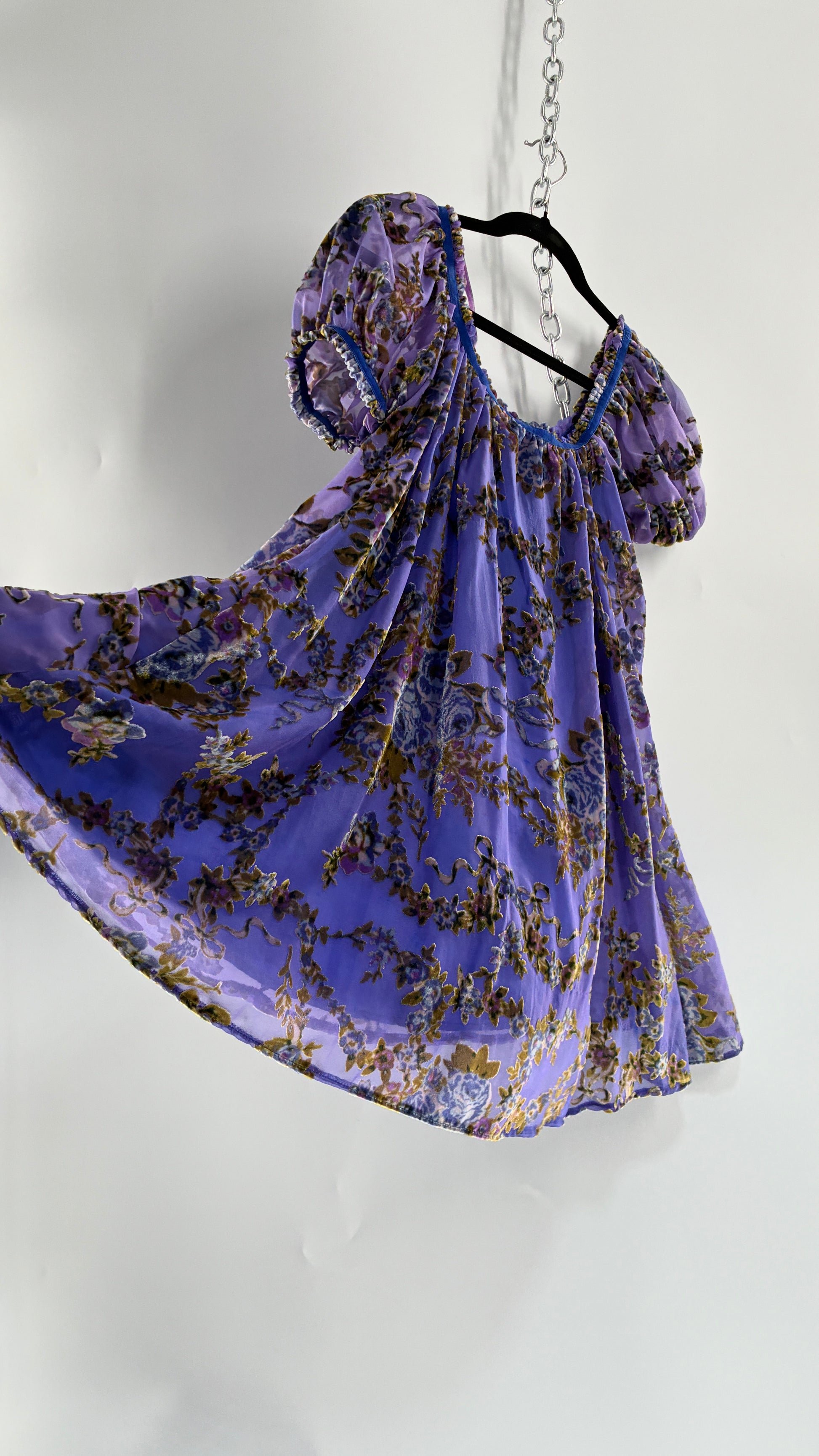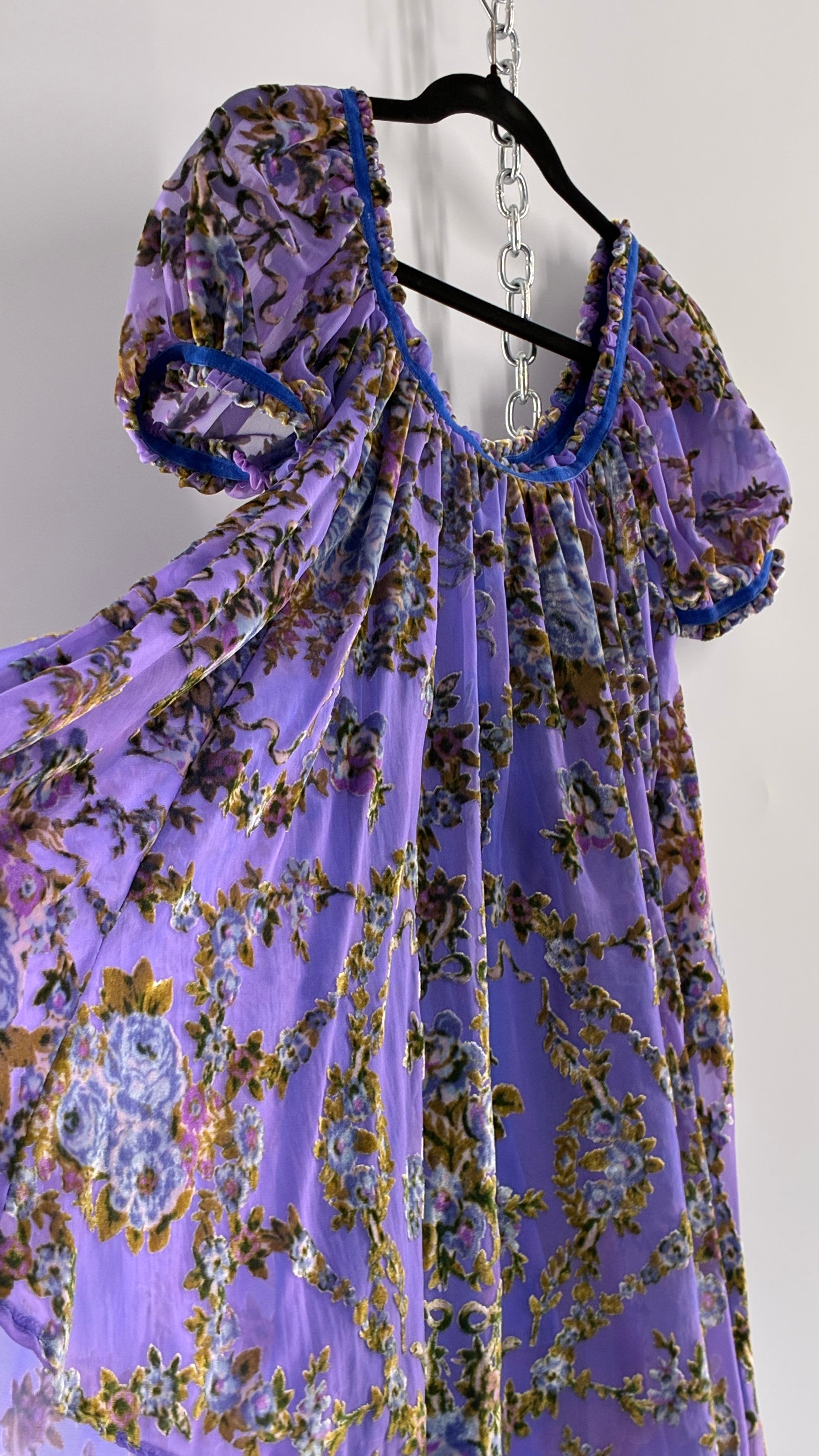 Free People Royal Blue Velour Floral and Bow Puff Sleeve Babydoll Mini Dress (XS)