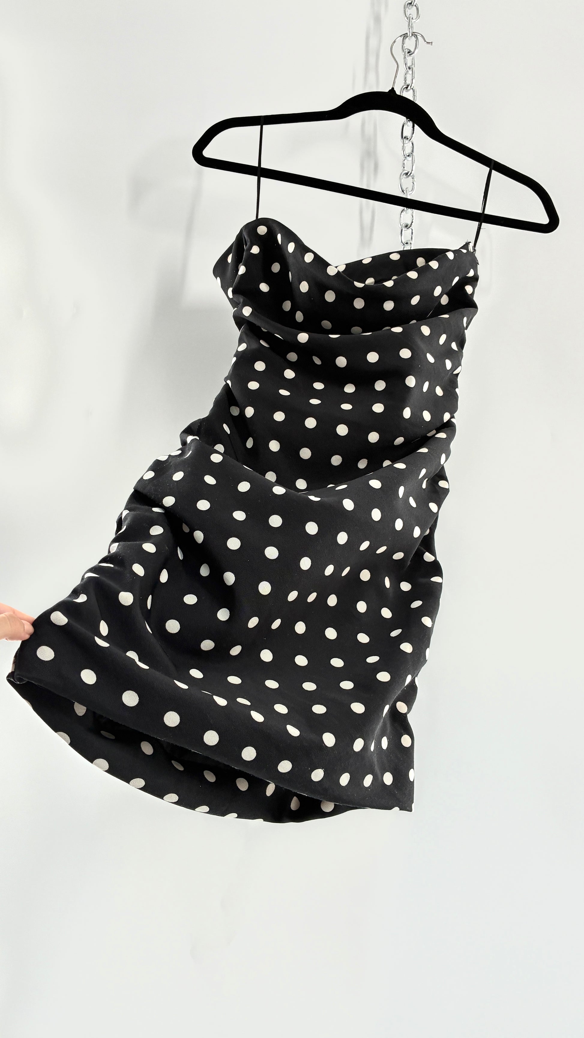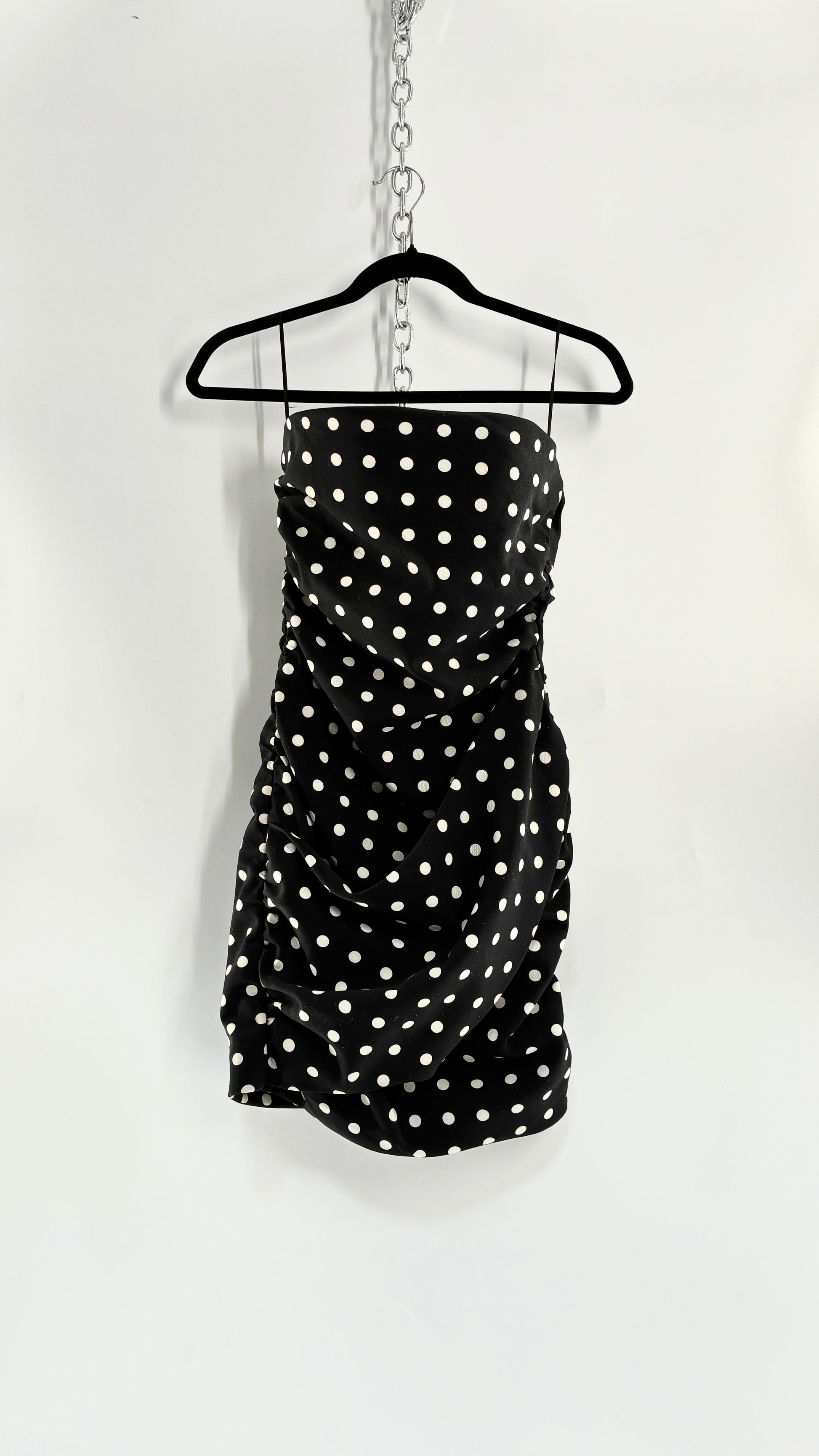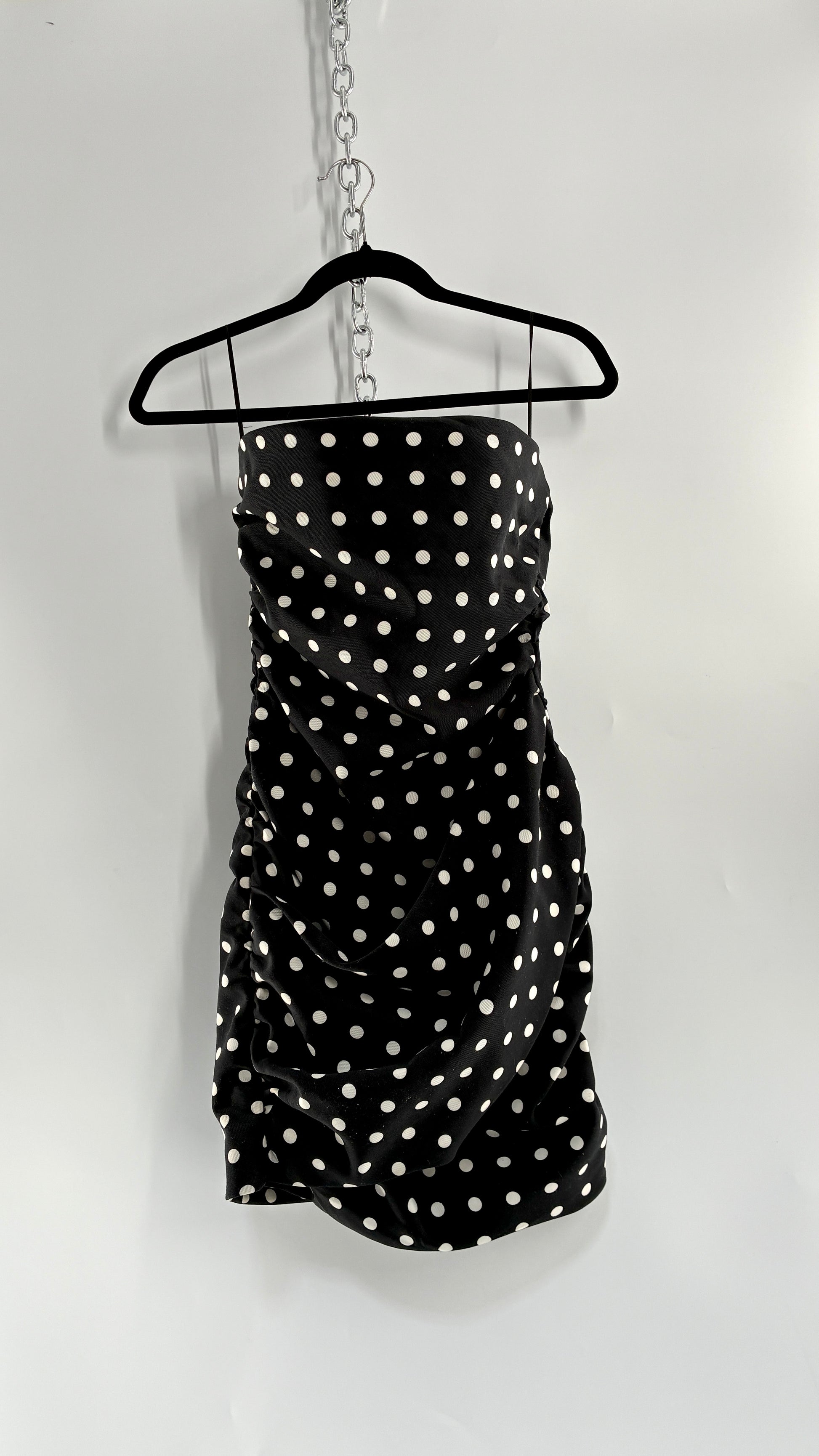 LIONESS Black and White Polka Dot Bodycon Ruched Mini Dress (Small)