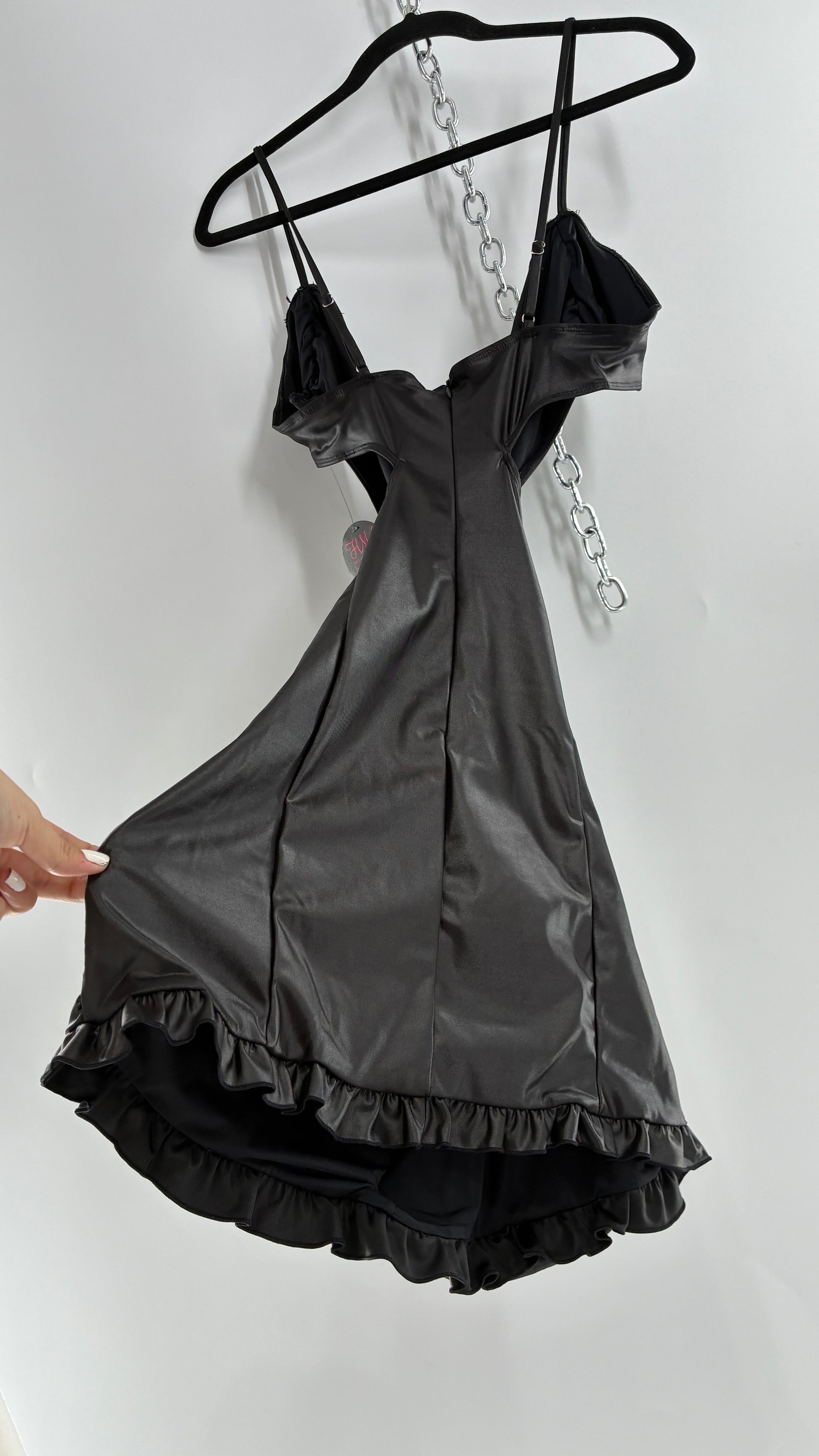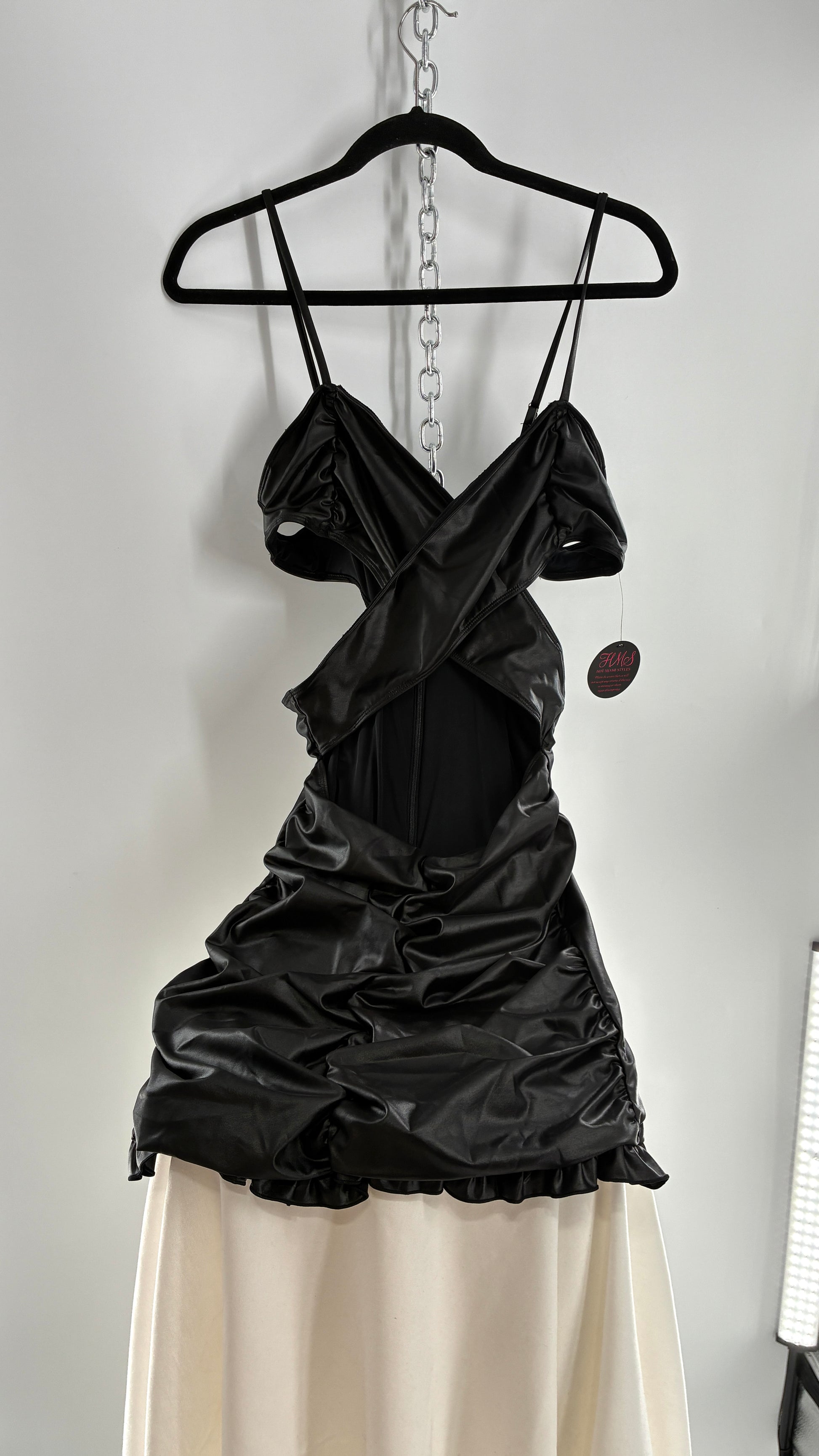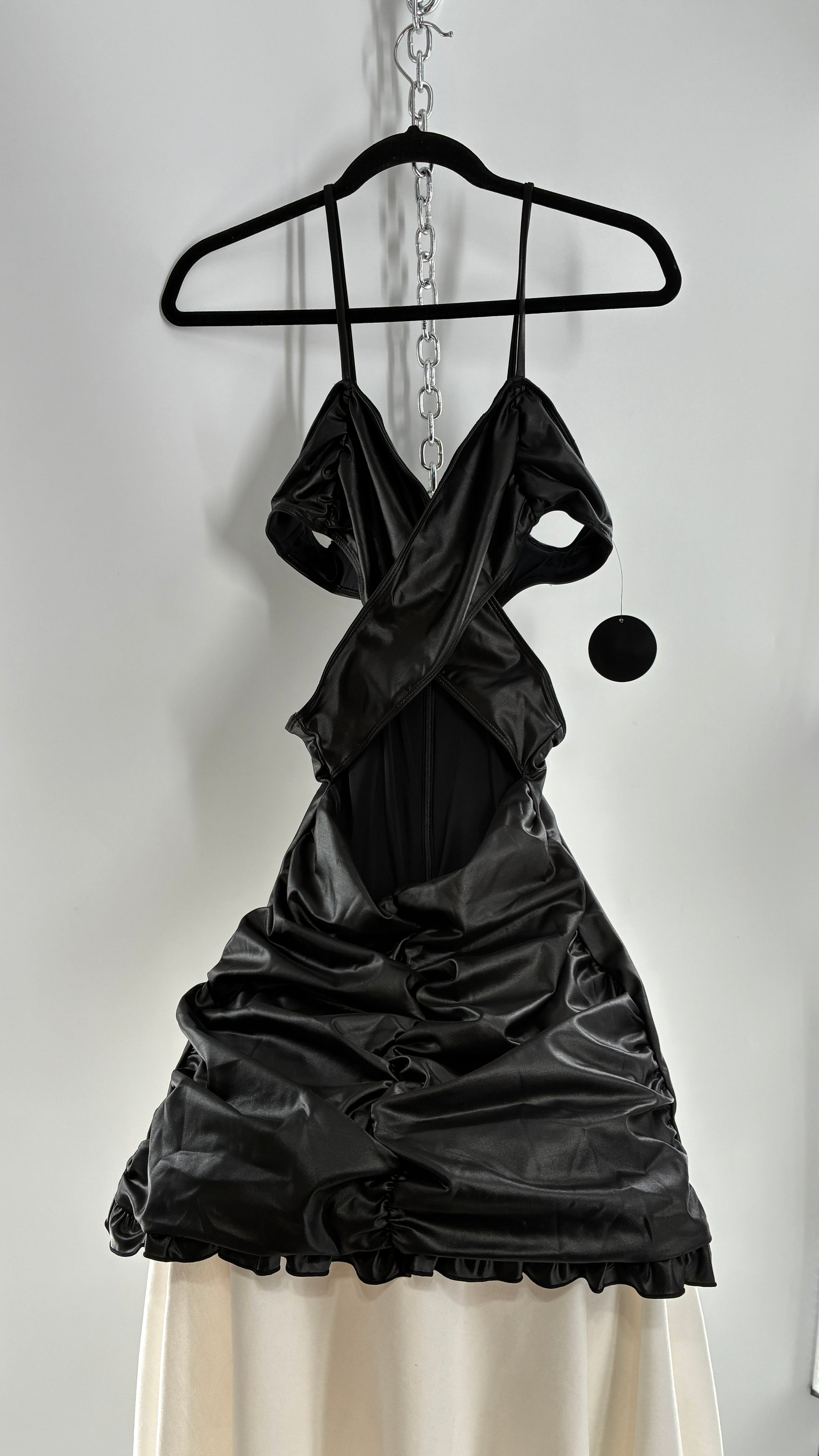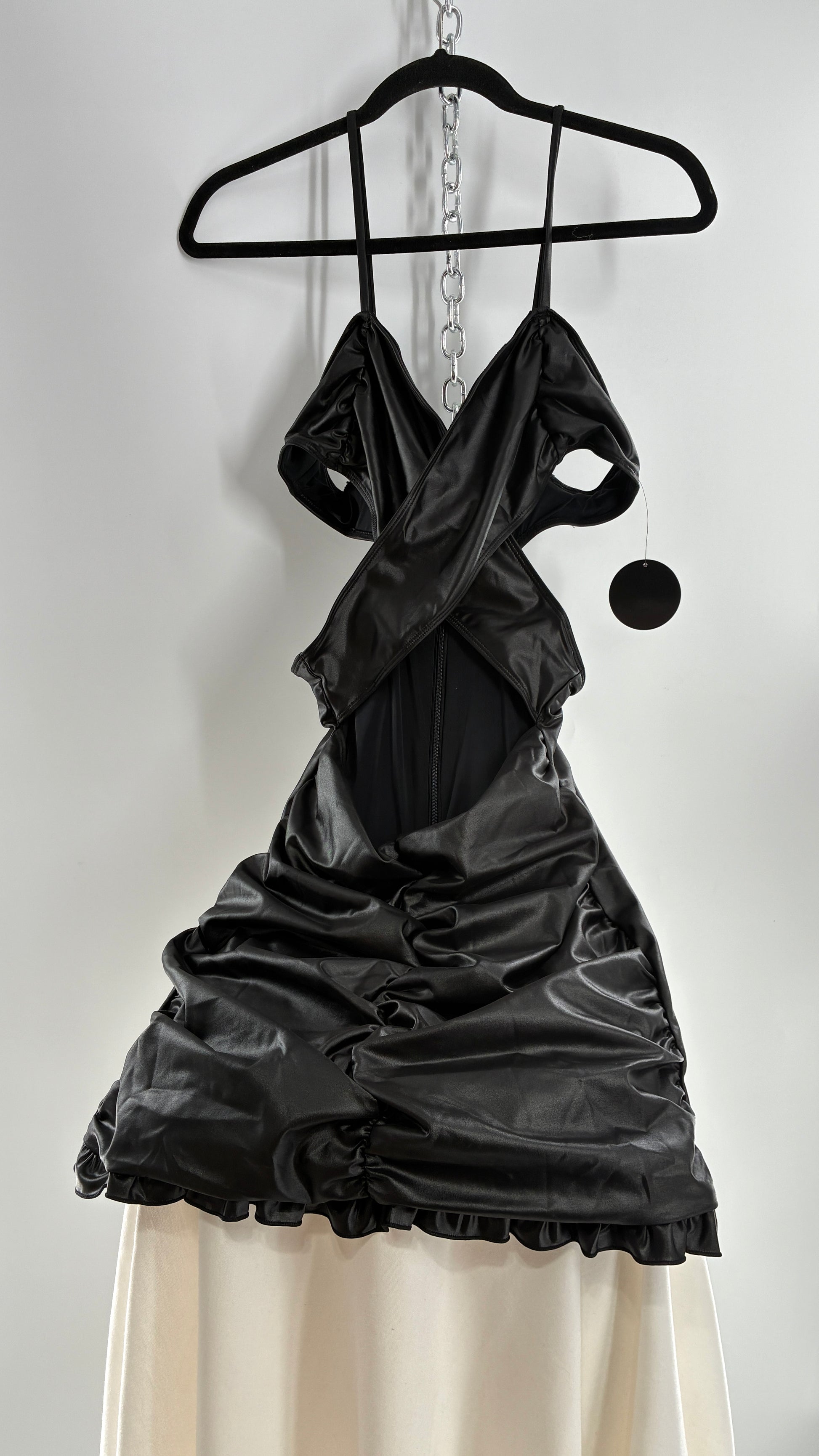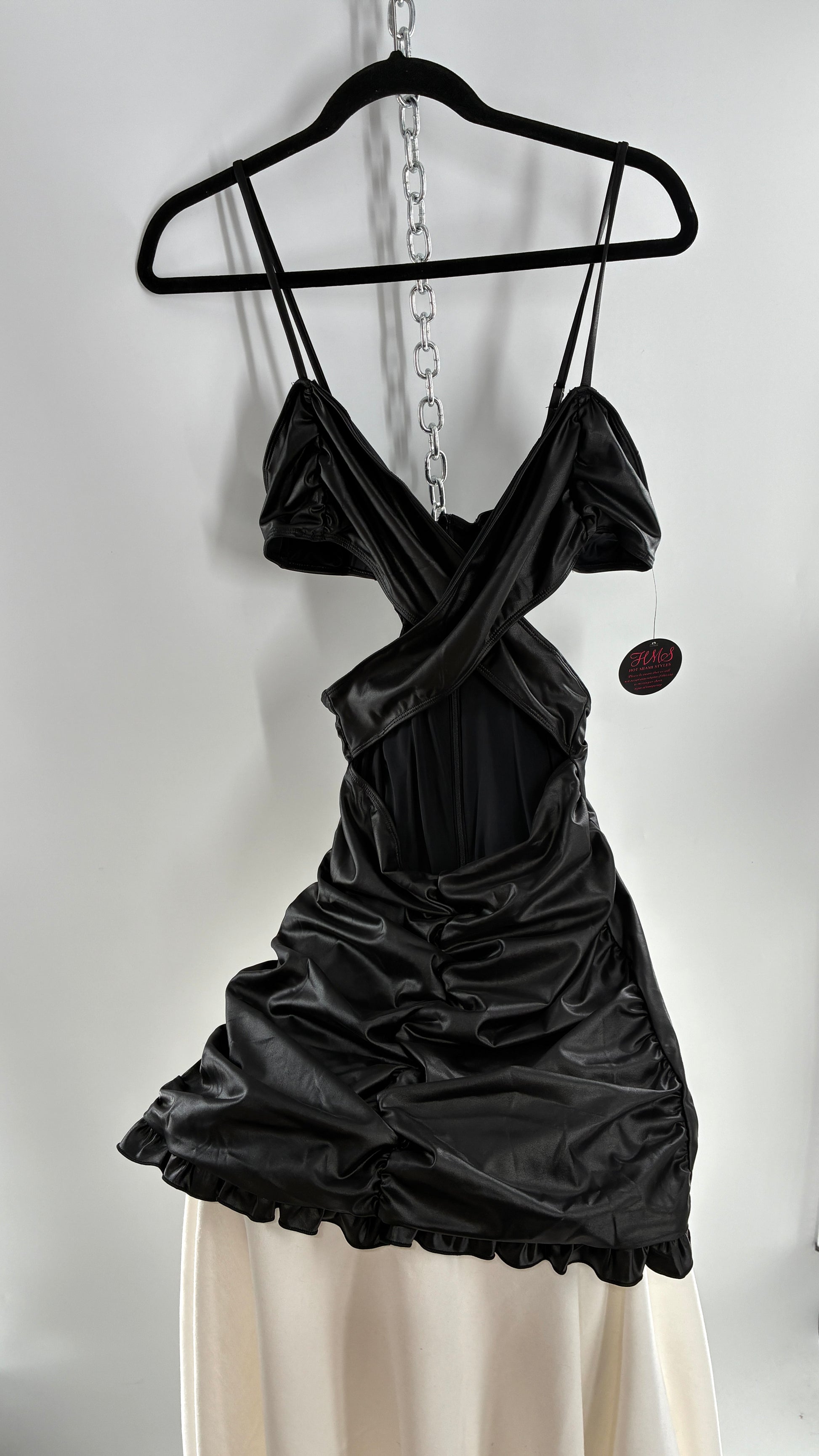 Deadstock Vintage HOT MIAMI STYLES Black Mini Dress with Ruffled Hem, Cut Out Design, and Ruched Body (Large)