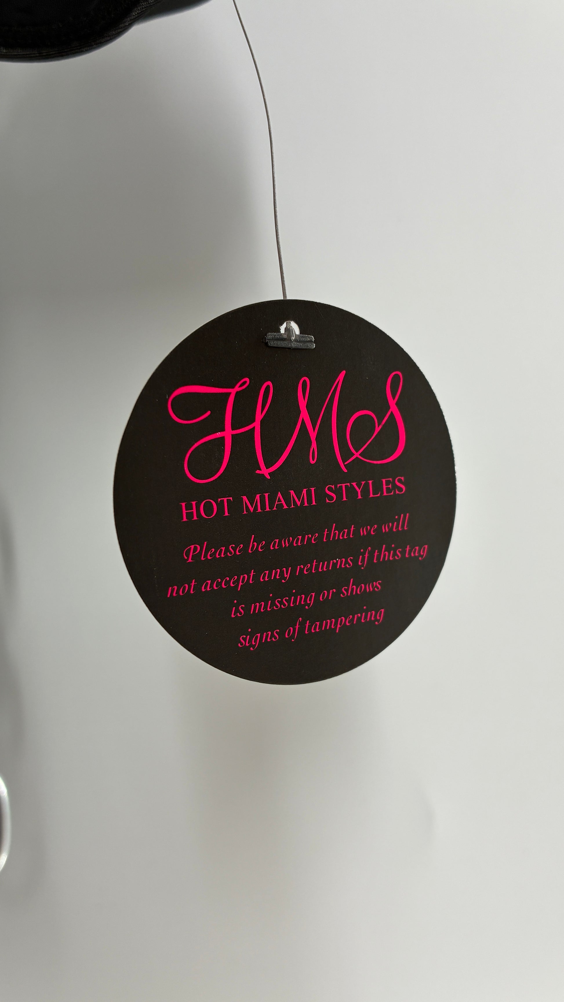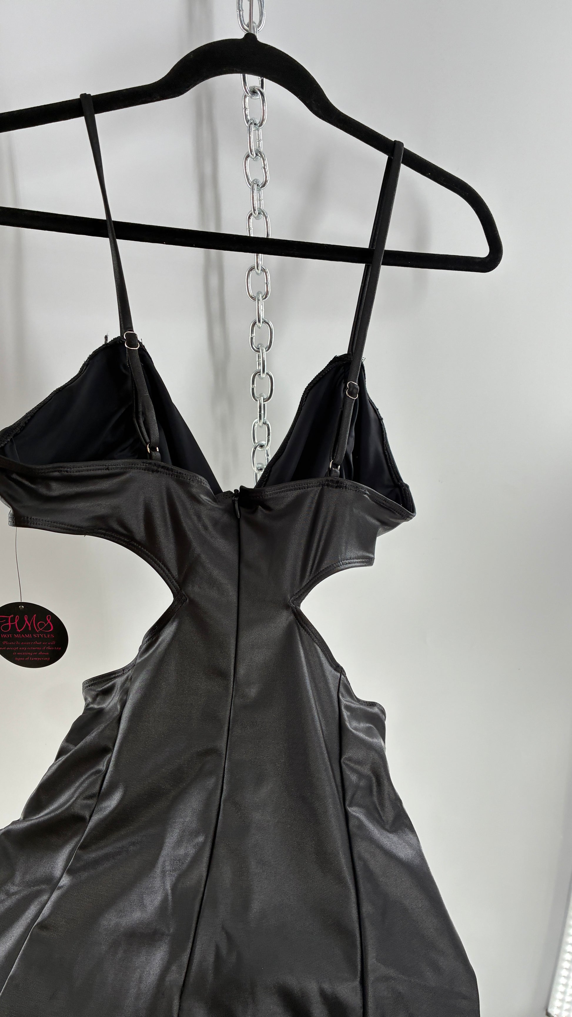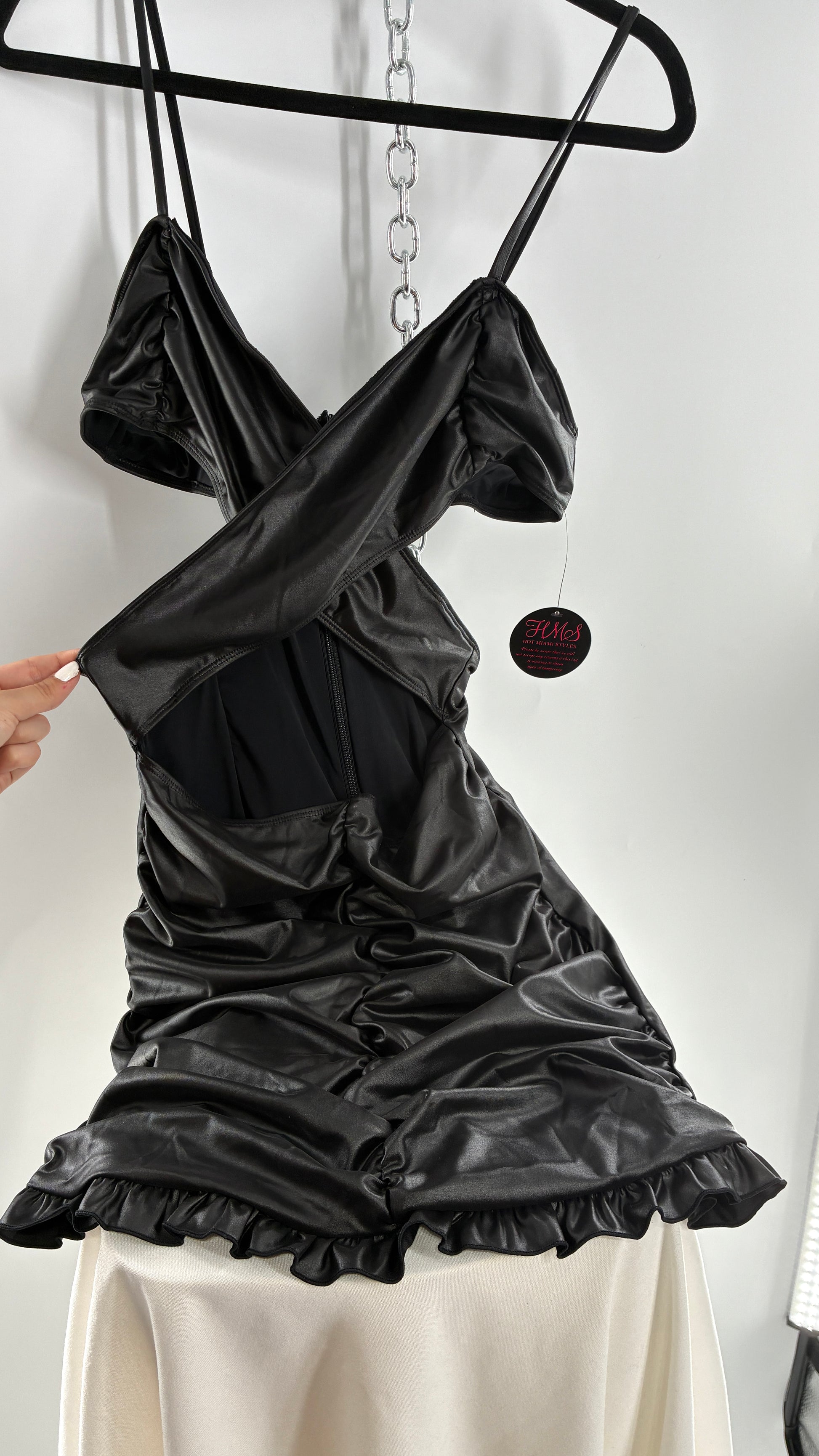 Deadstock Vintage HOT MIAMI STYLES Black Mini Dress with Ruffled Hem, Cut Out Design, and Ruched Body