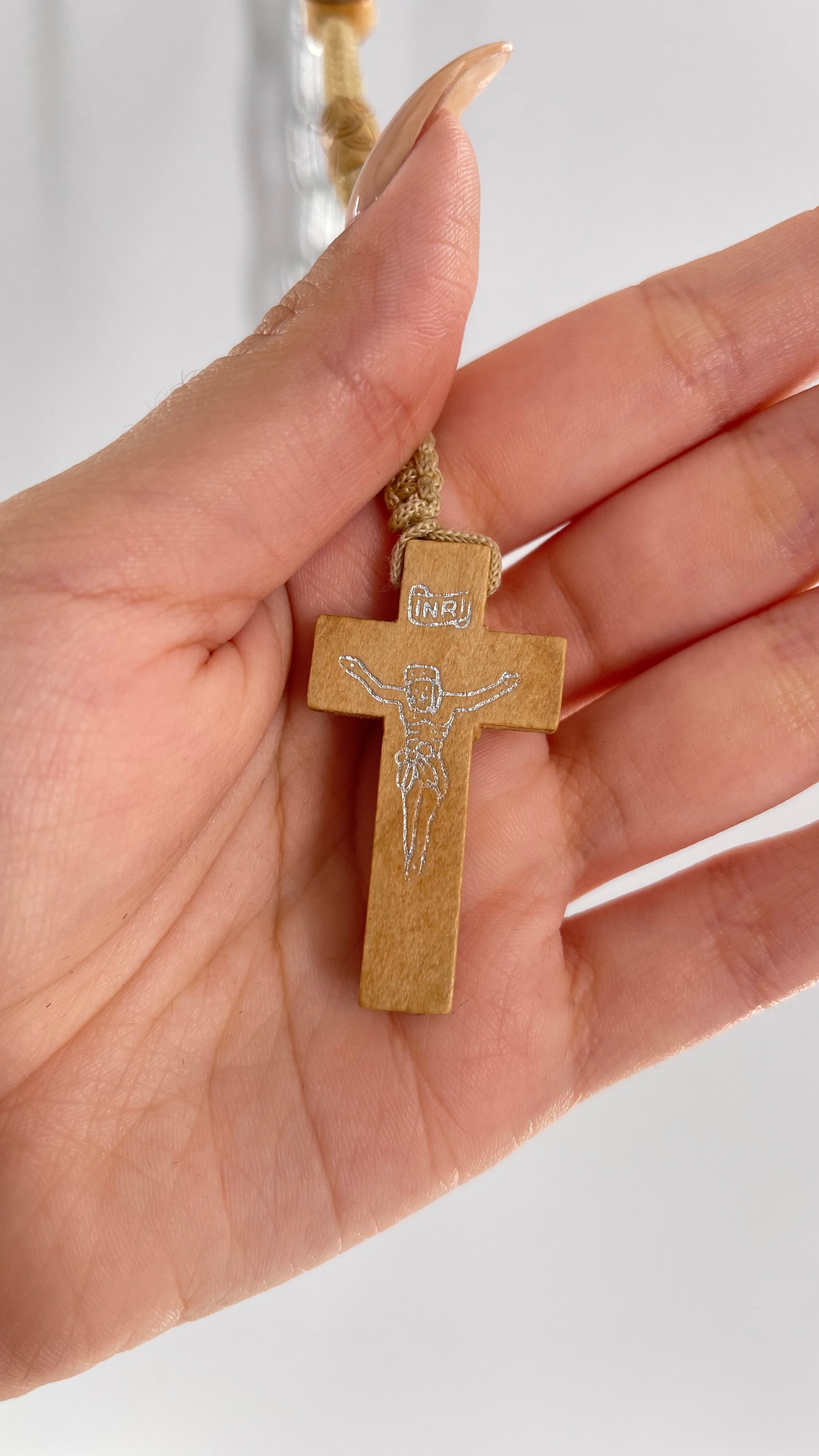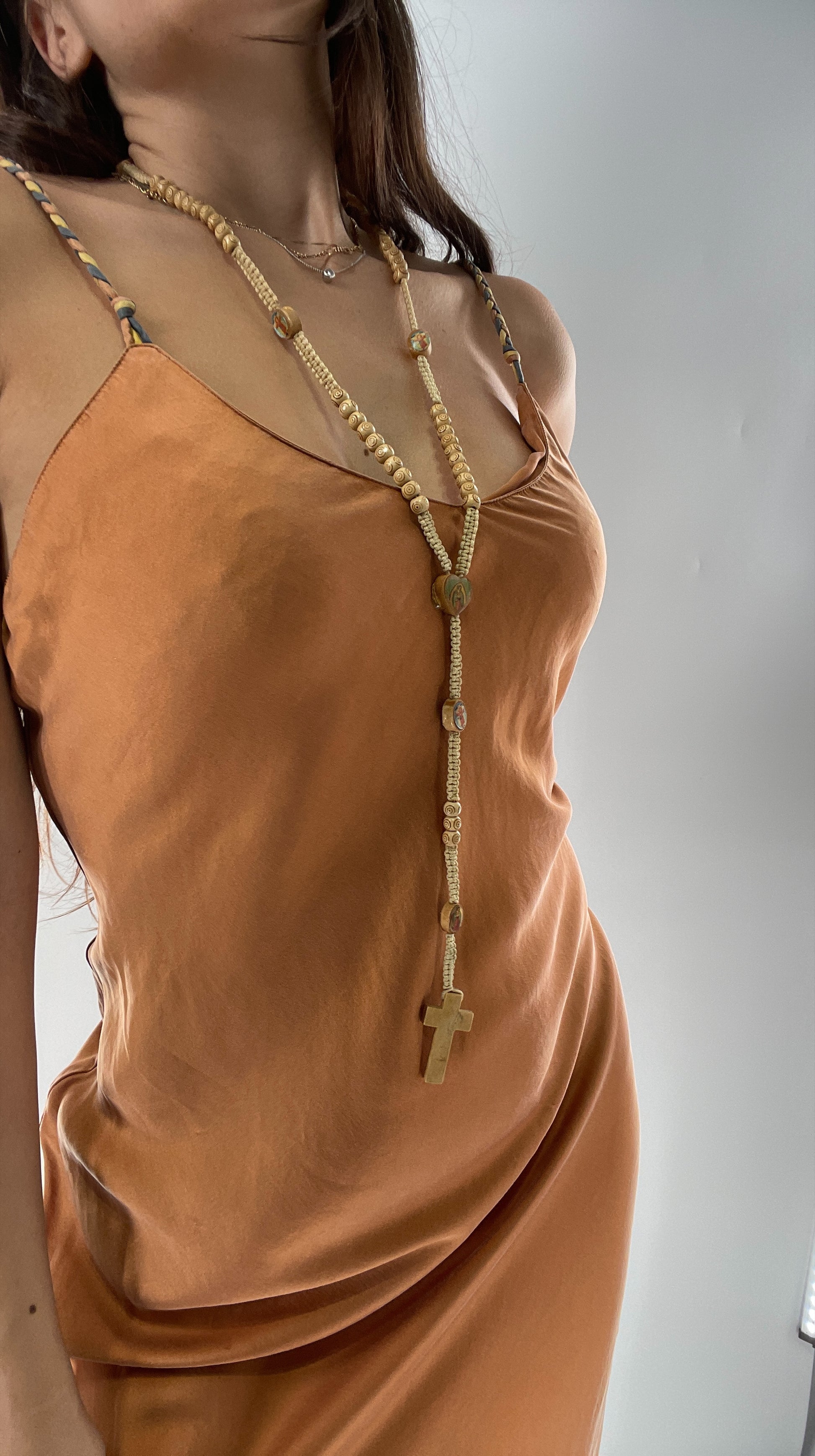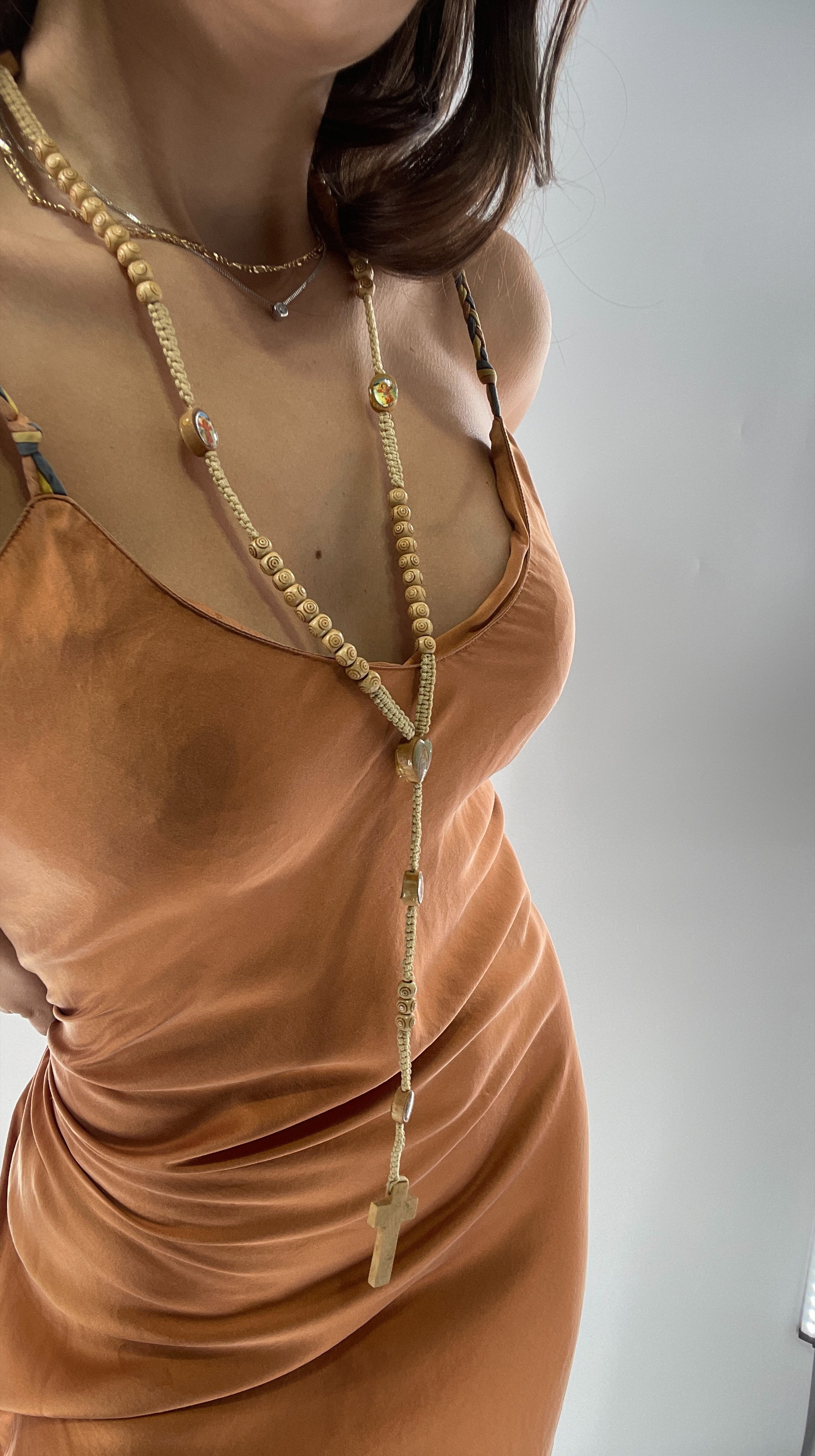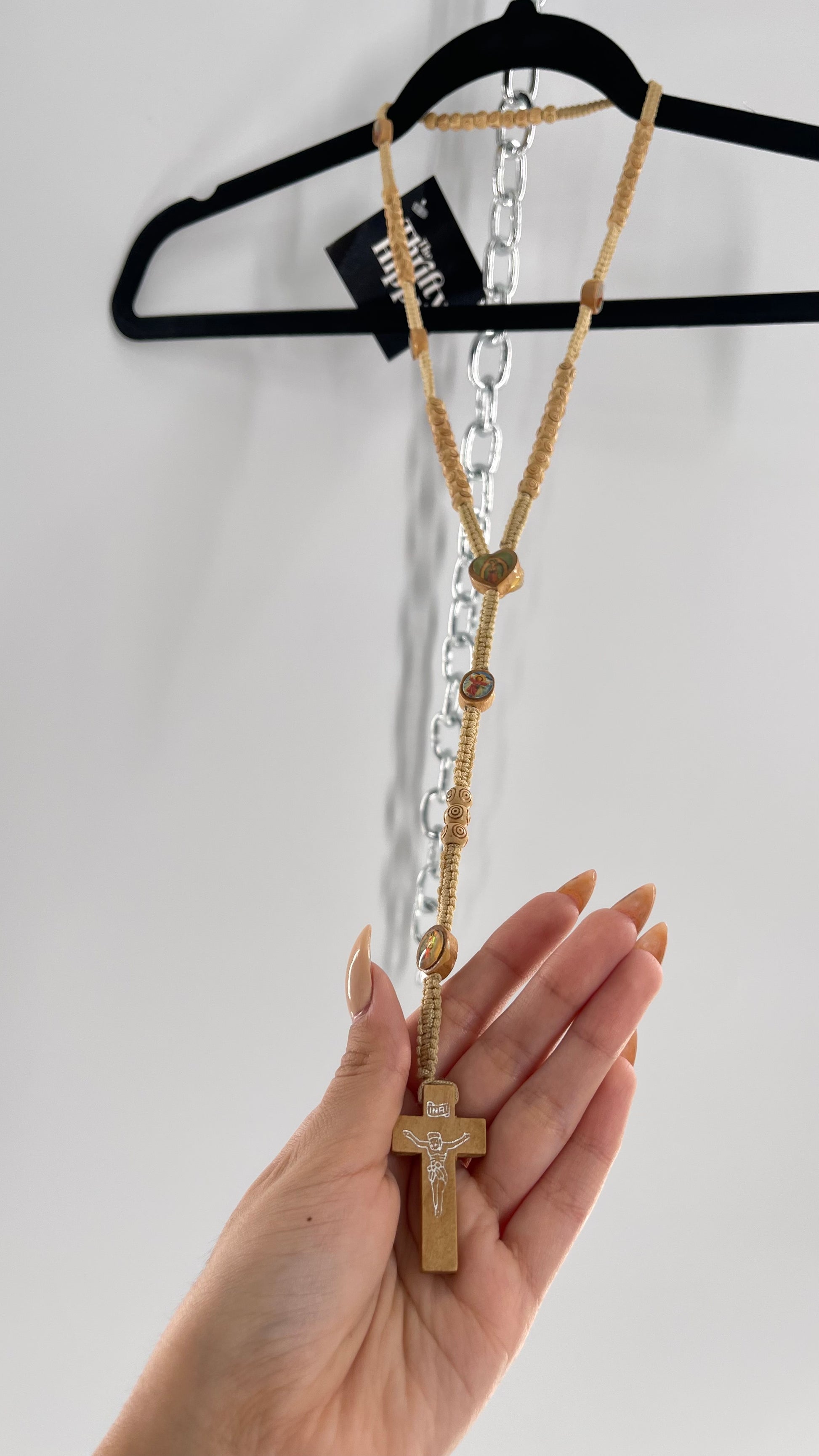 Vintage Beige Toned Rope Rosary Necklace Prayer Beads