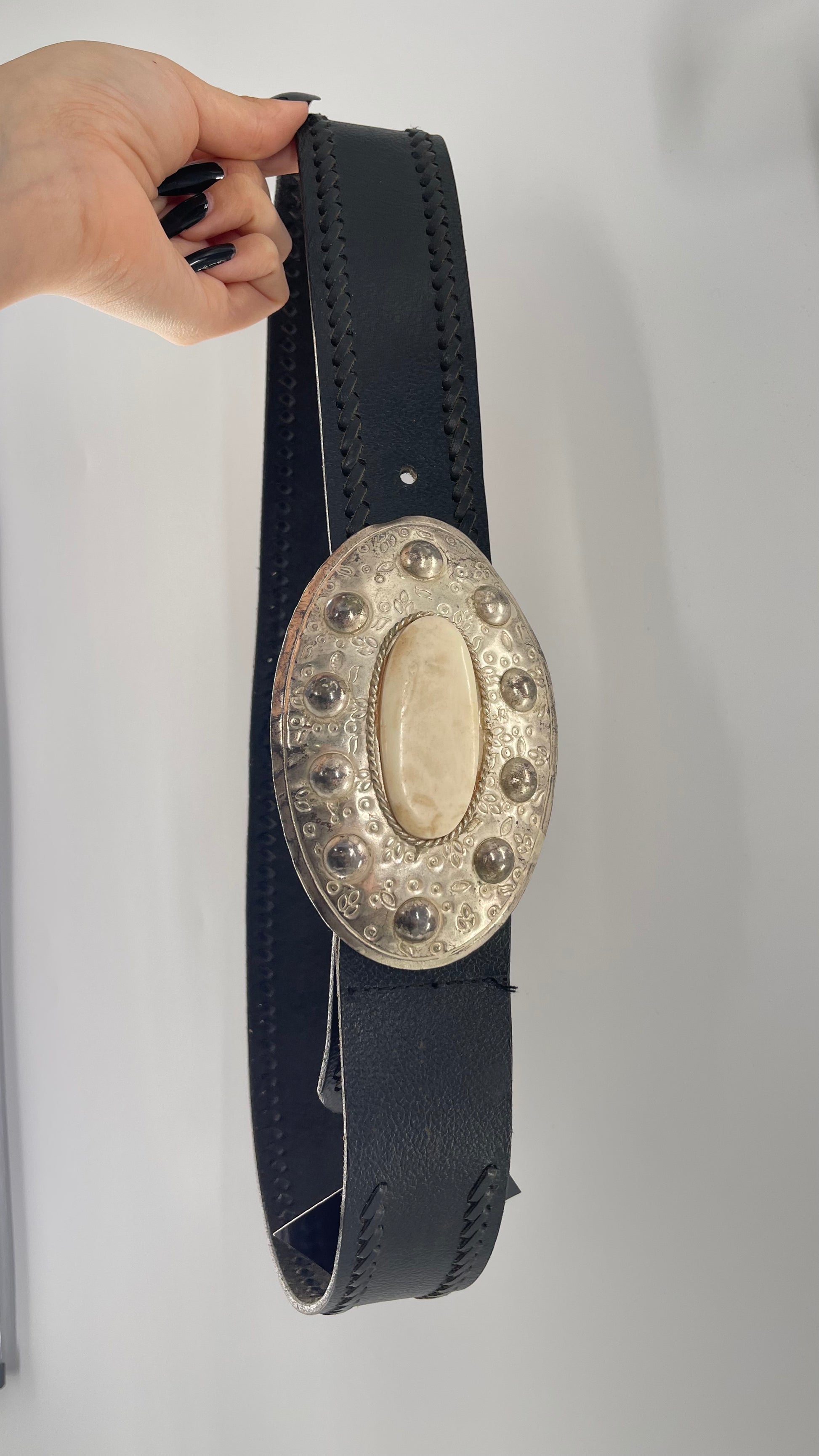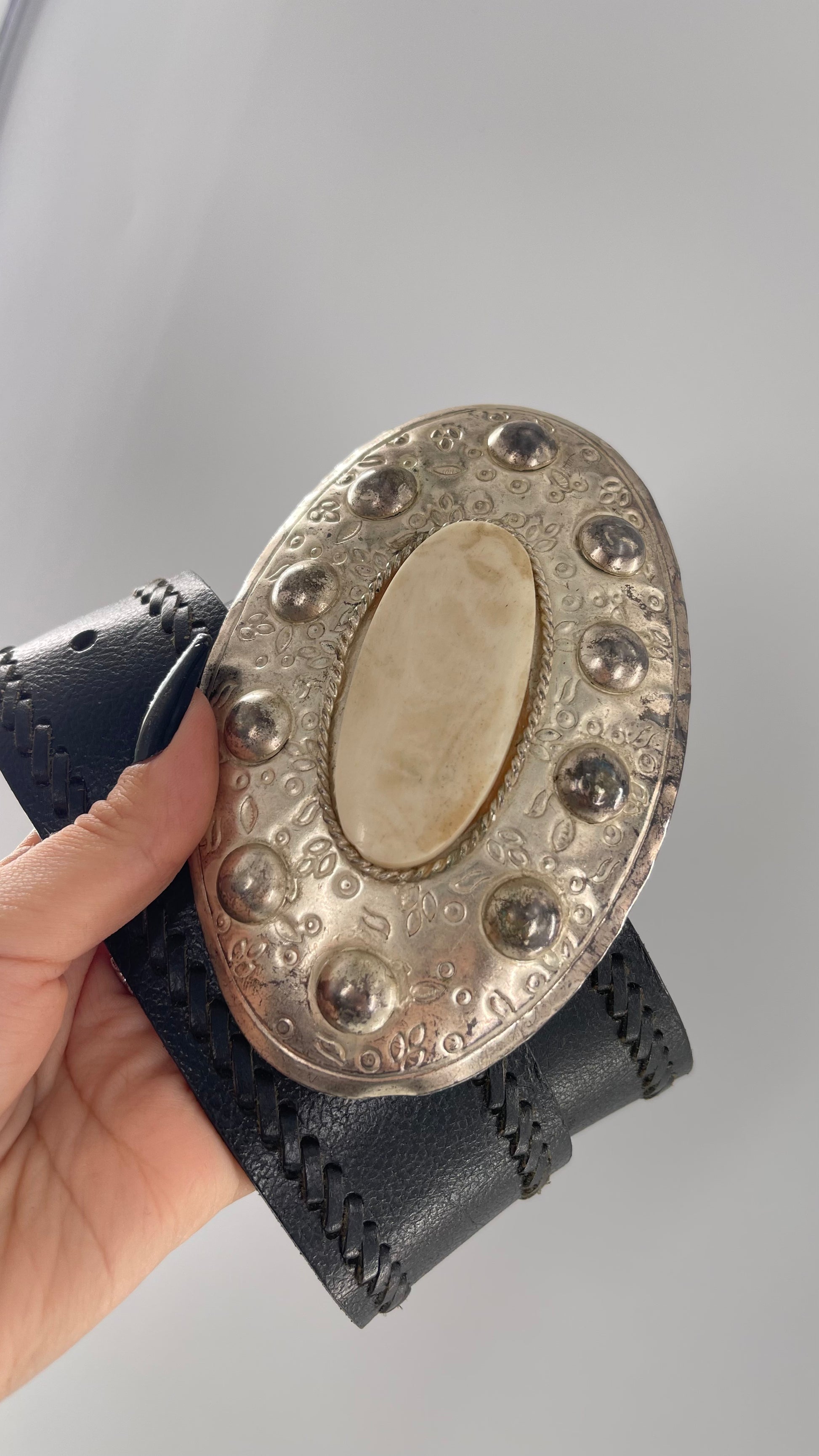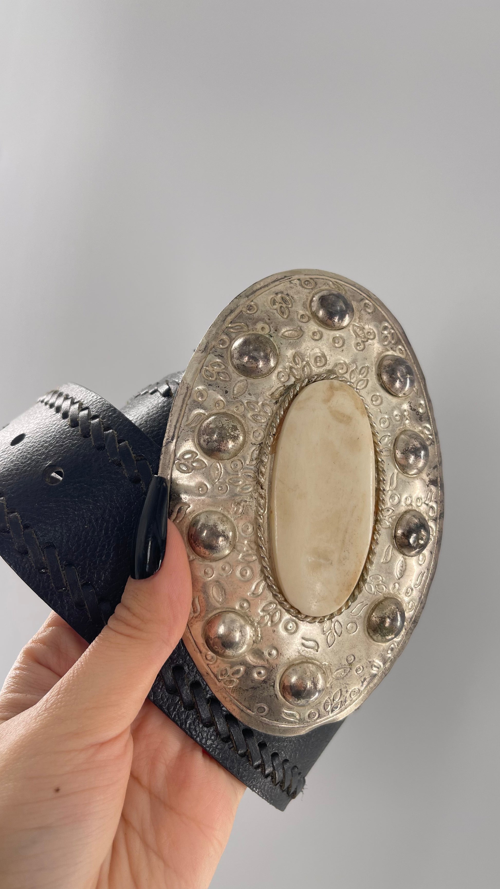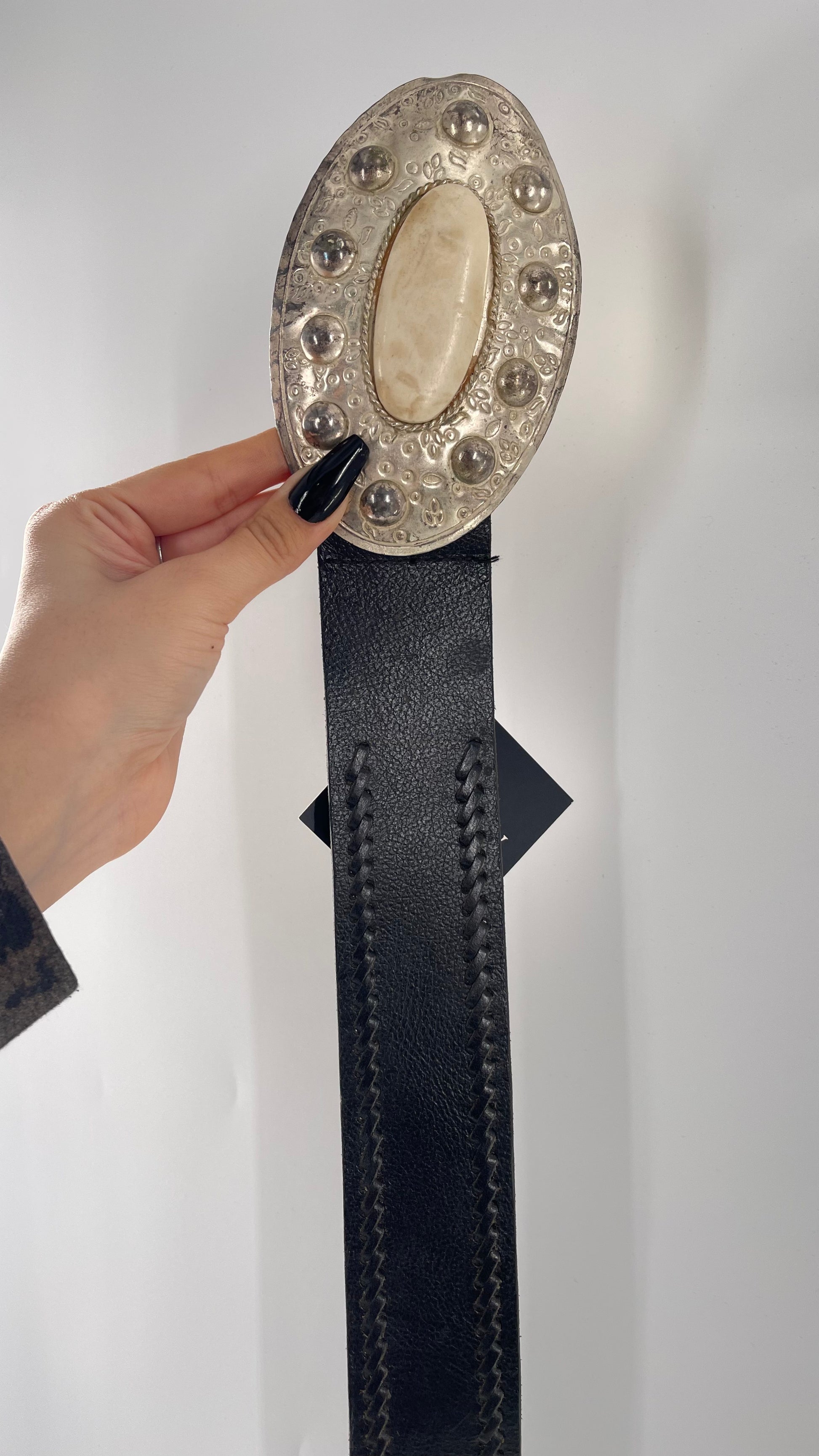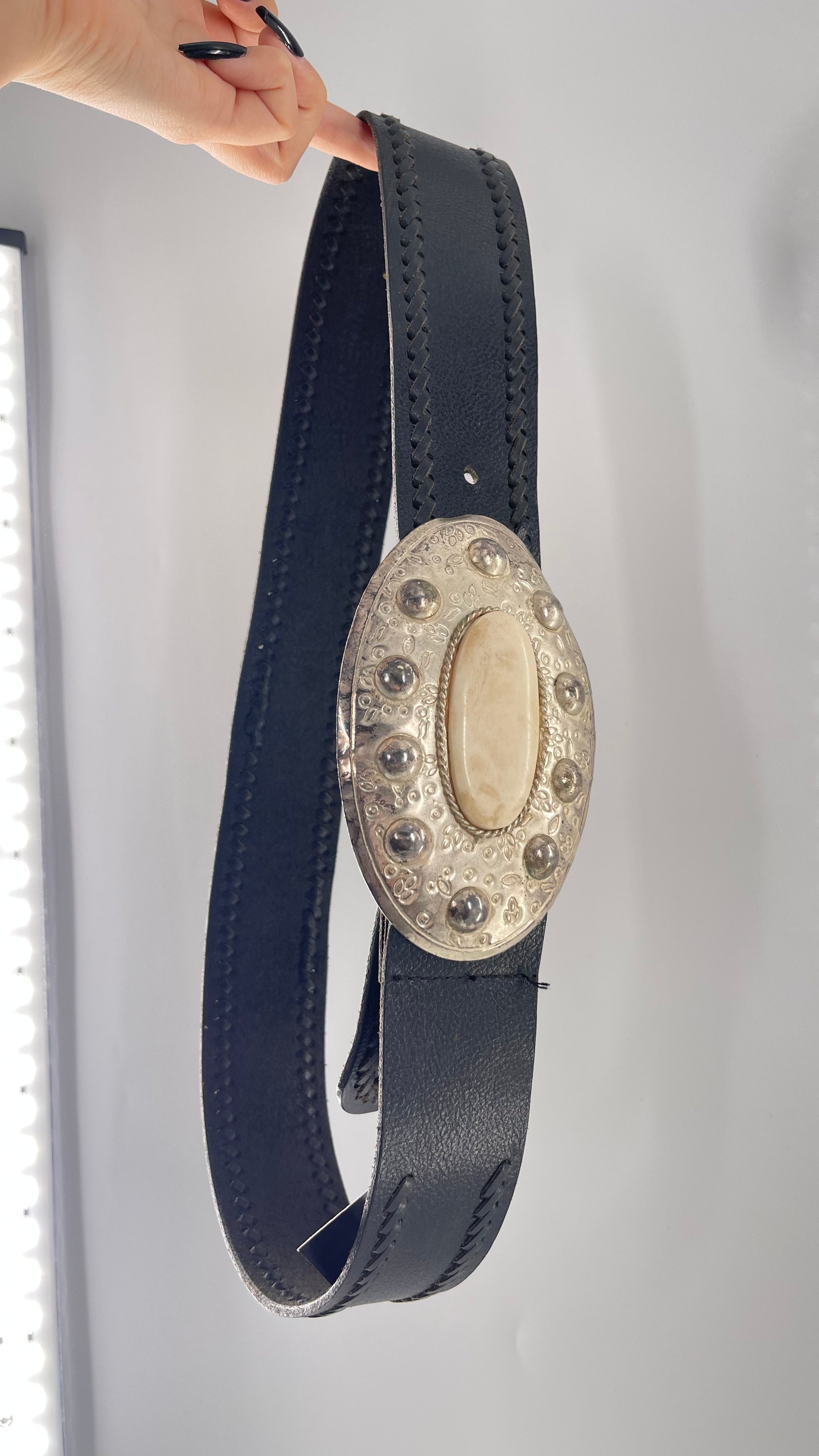 Vintage Black Leather Belt with Silver Metal Buckle with ‘Stone’ Detail (M/L)