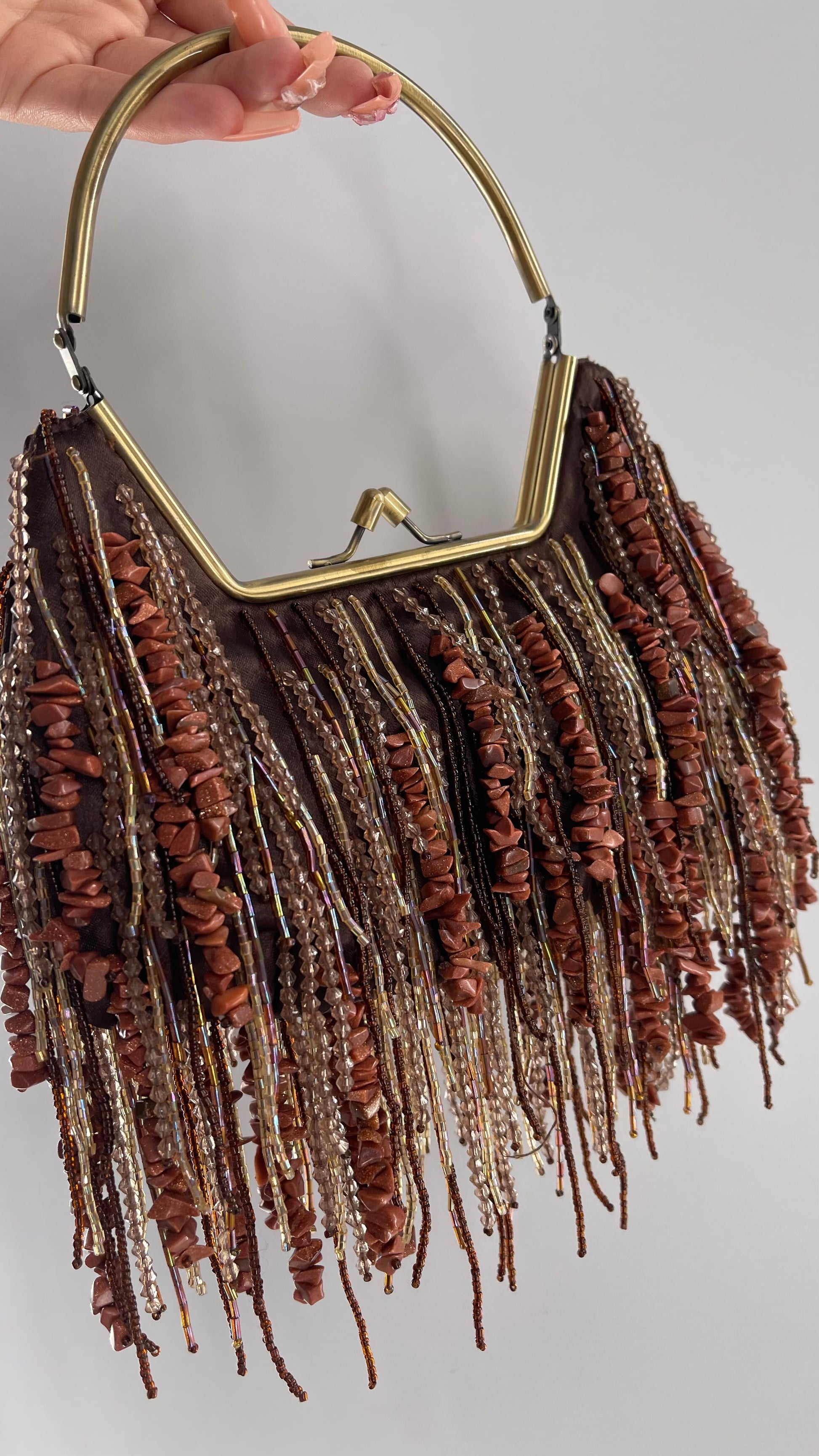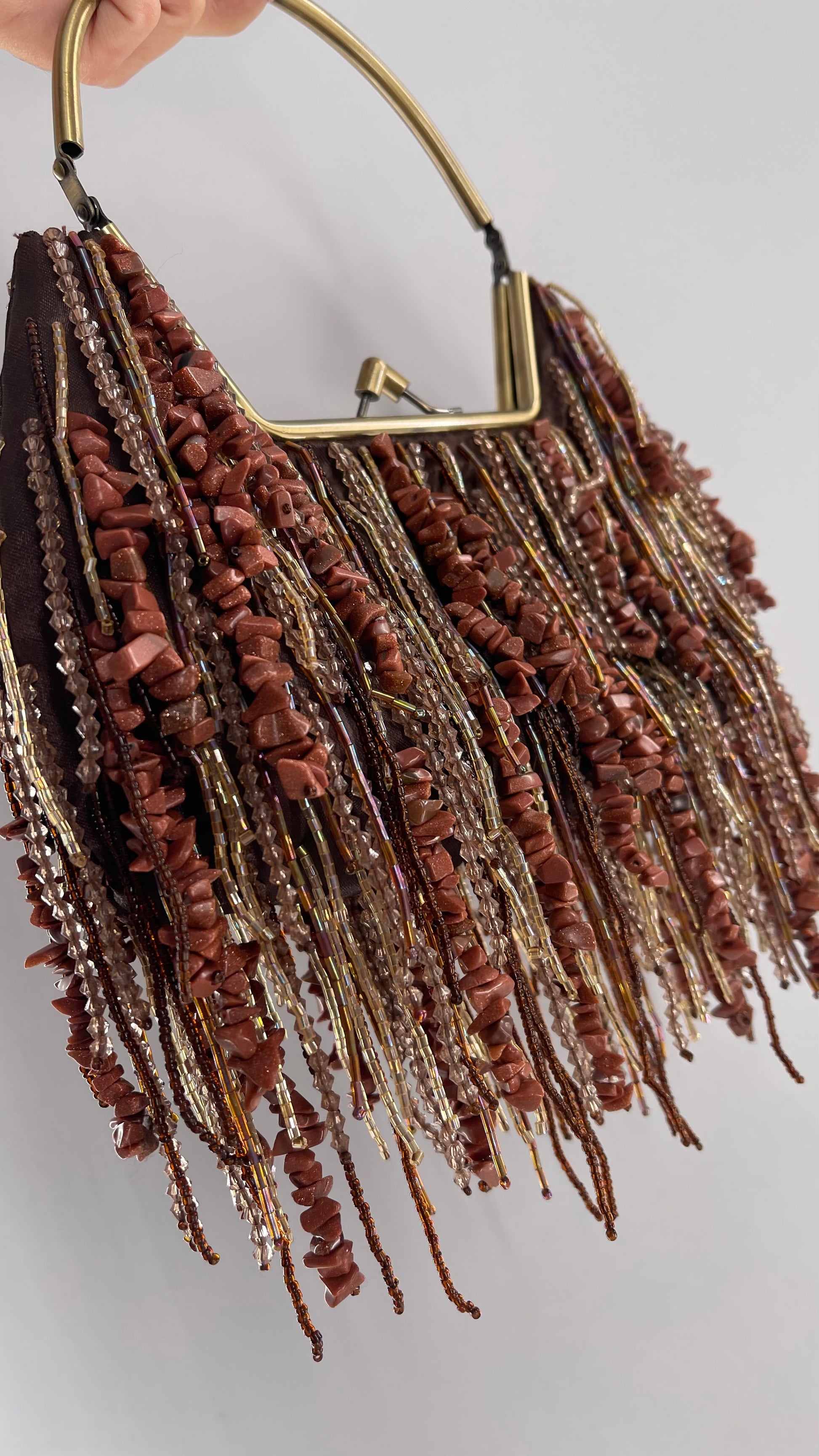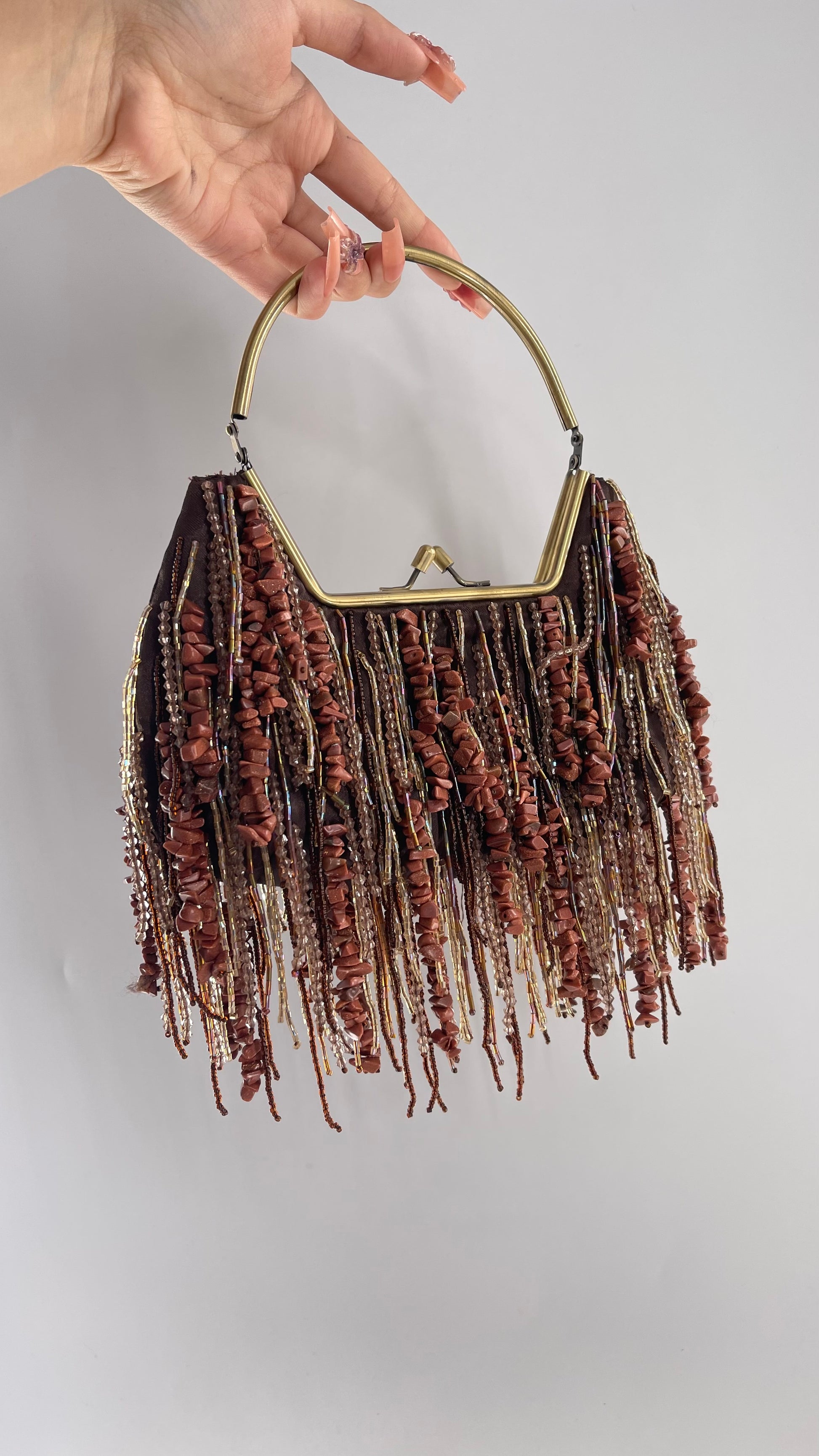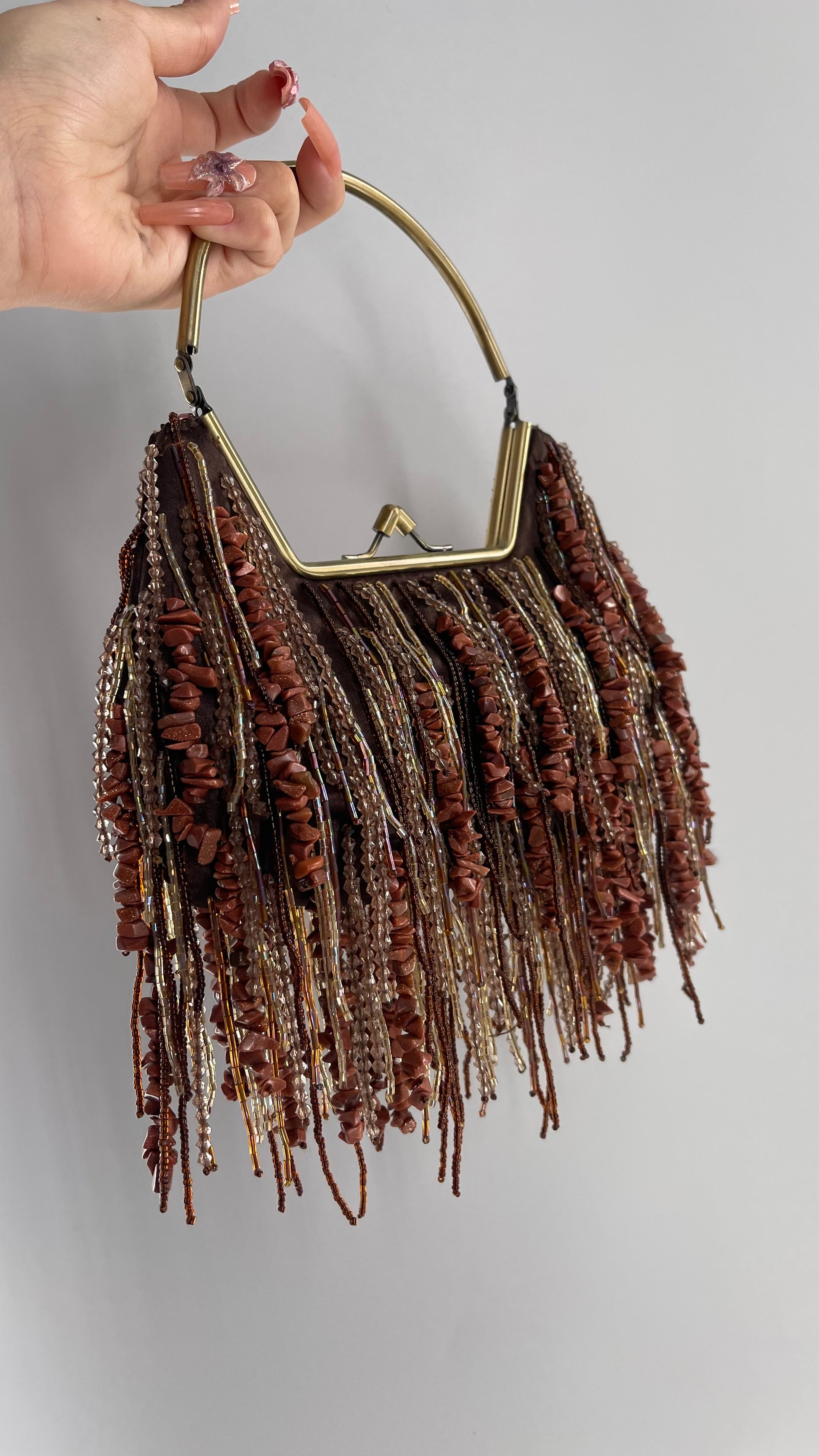 Vintage Purse Covered in Strands of Brown Beads and Reflective Stone Tassels